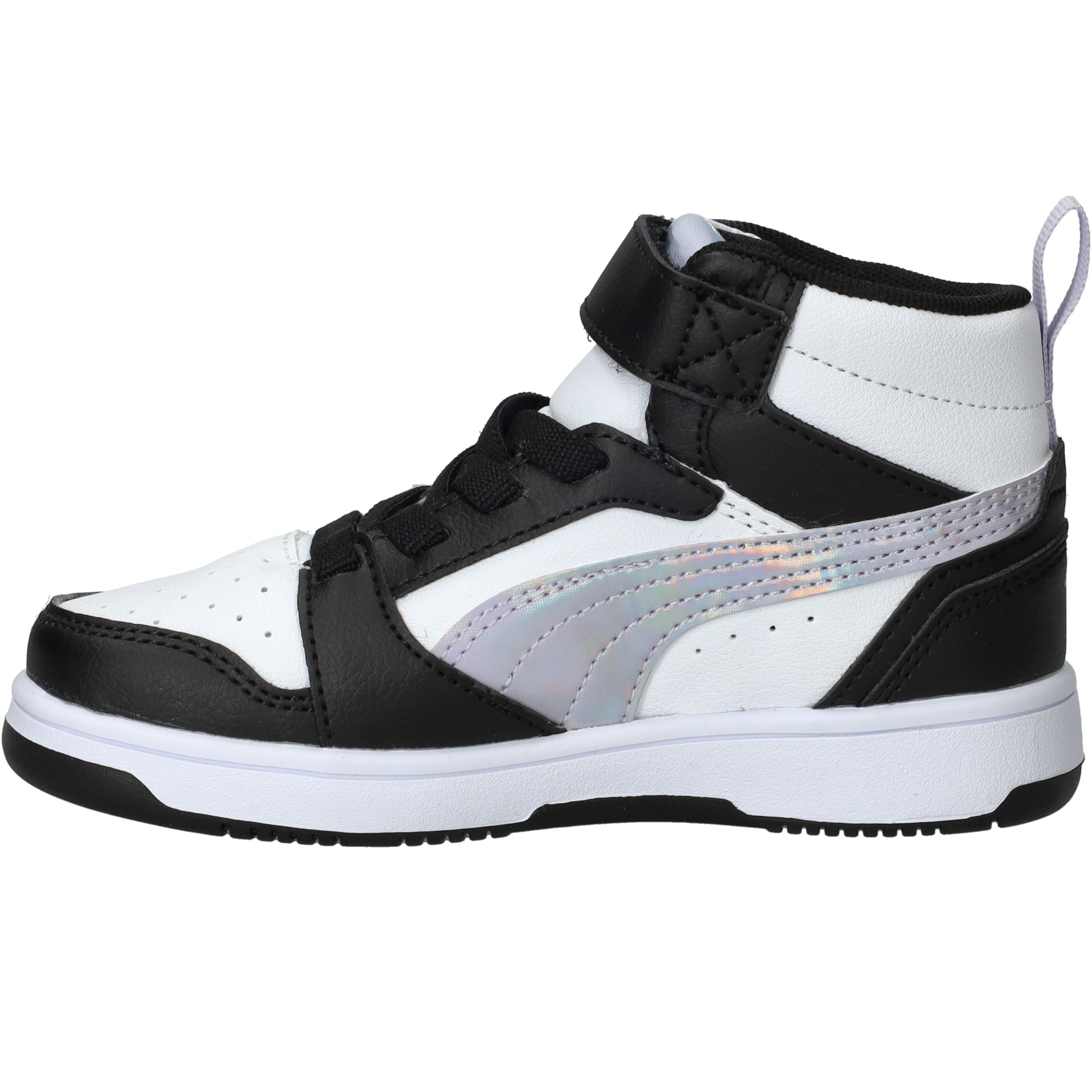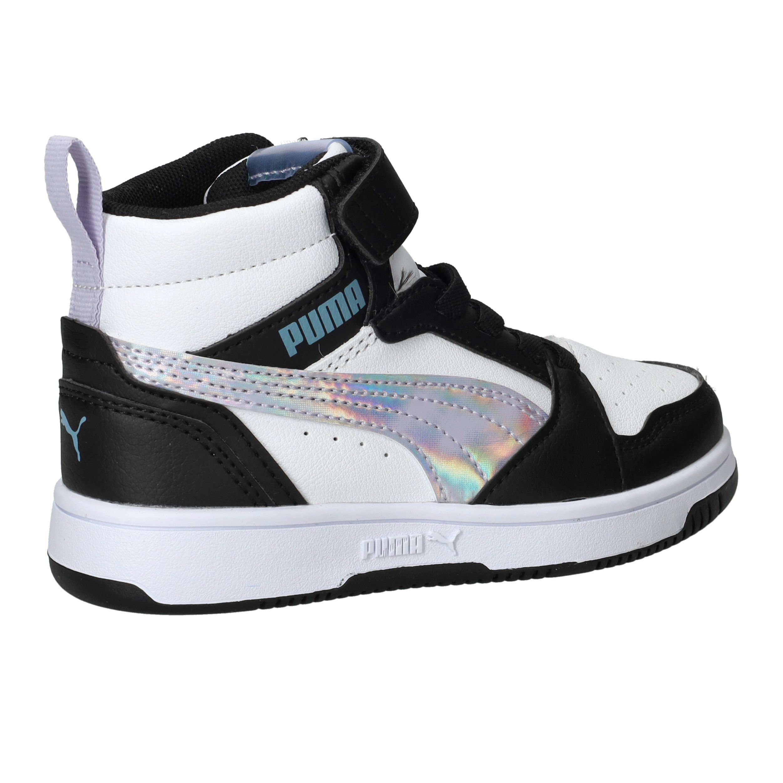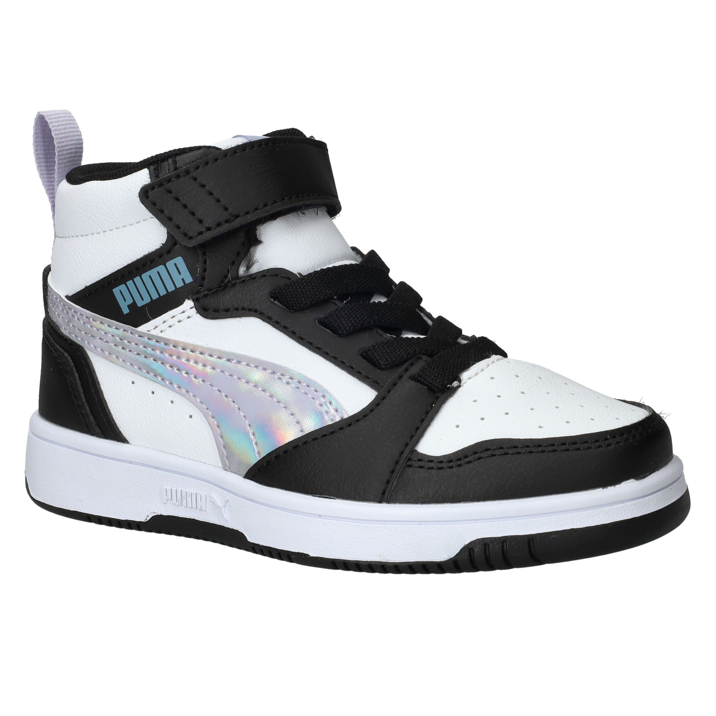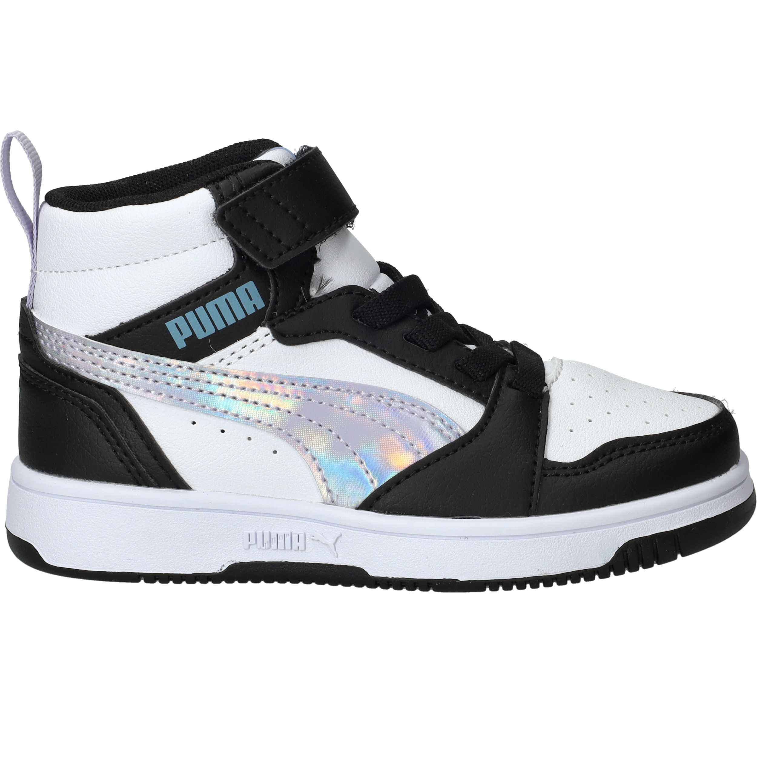 De meisjes sneakers Puma Rebound V6 Mid Space Belle zijn een perfecte mix van stijl, gemak en speelsheid. De opvallende holografische streep, gecombineerd met zwart-witte kleuren en een stevige klittenbandsluiting, zorgt voor een coole en praktische sneaker. Dankzij de halfhoge schacht en normale voetbreedte G zit deze sneaker stevig en comfortabel.