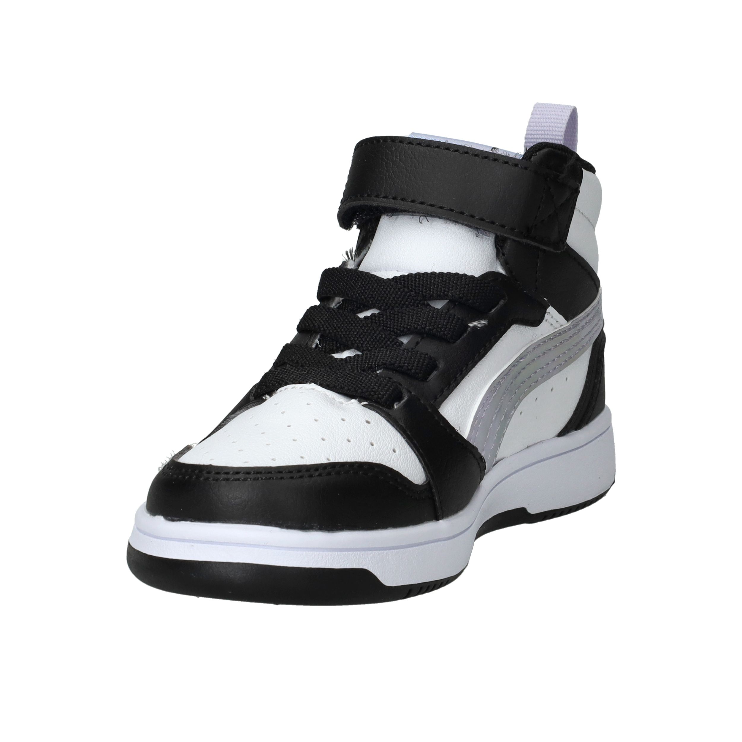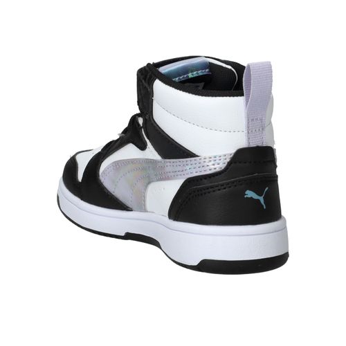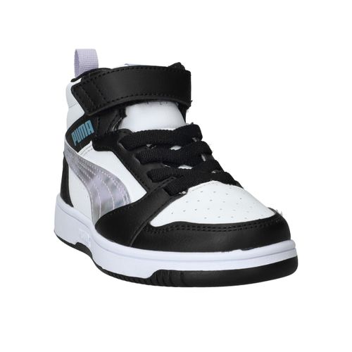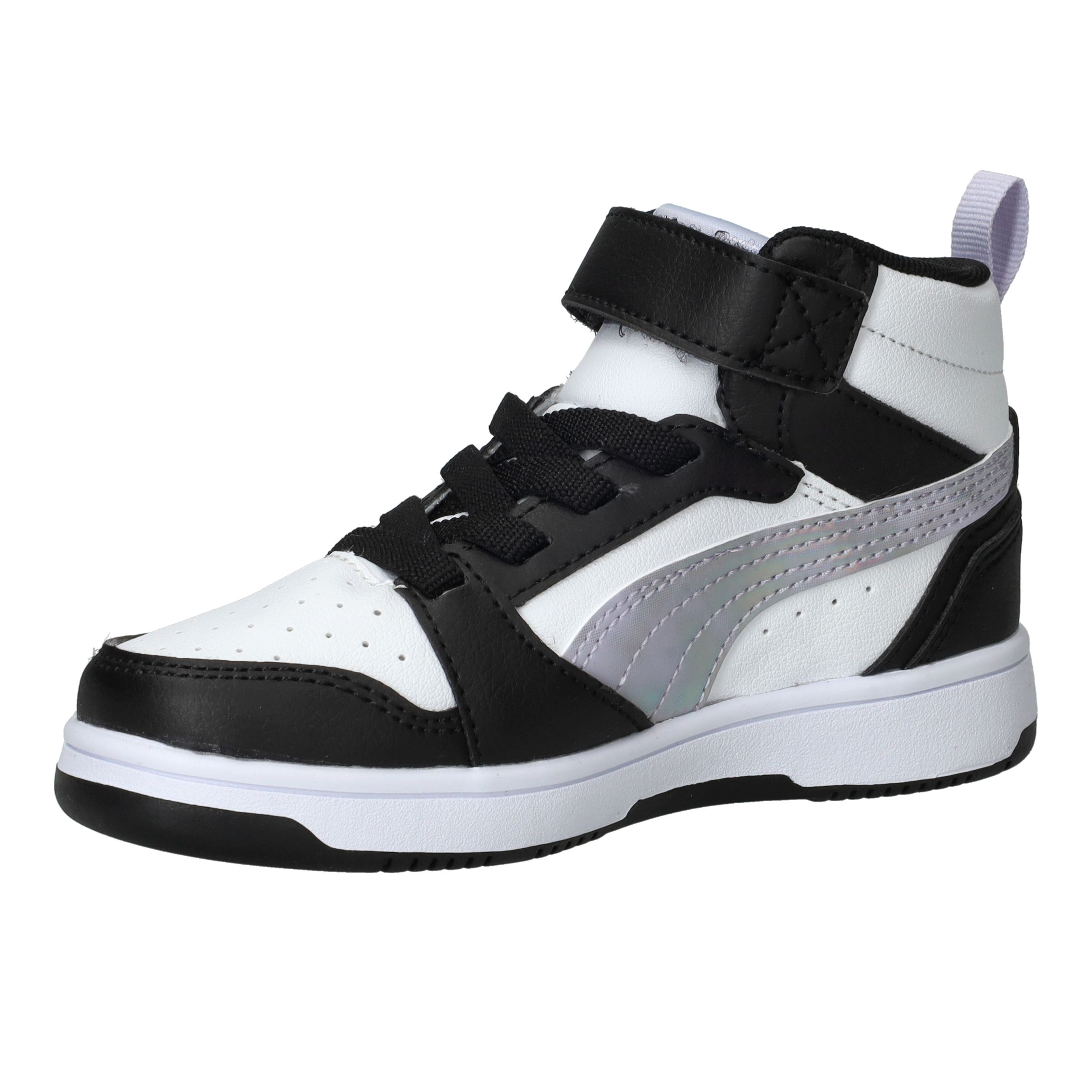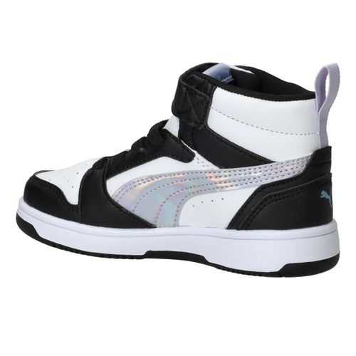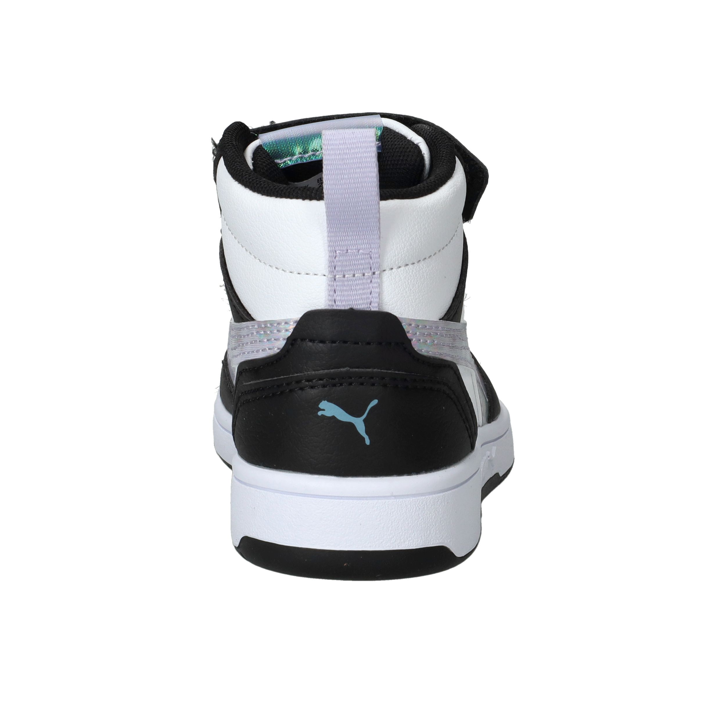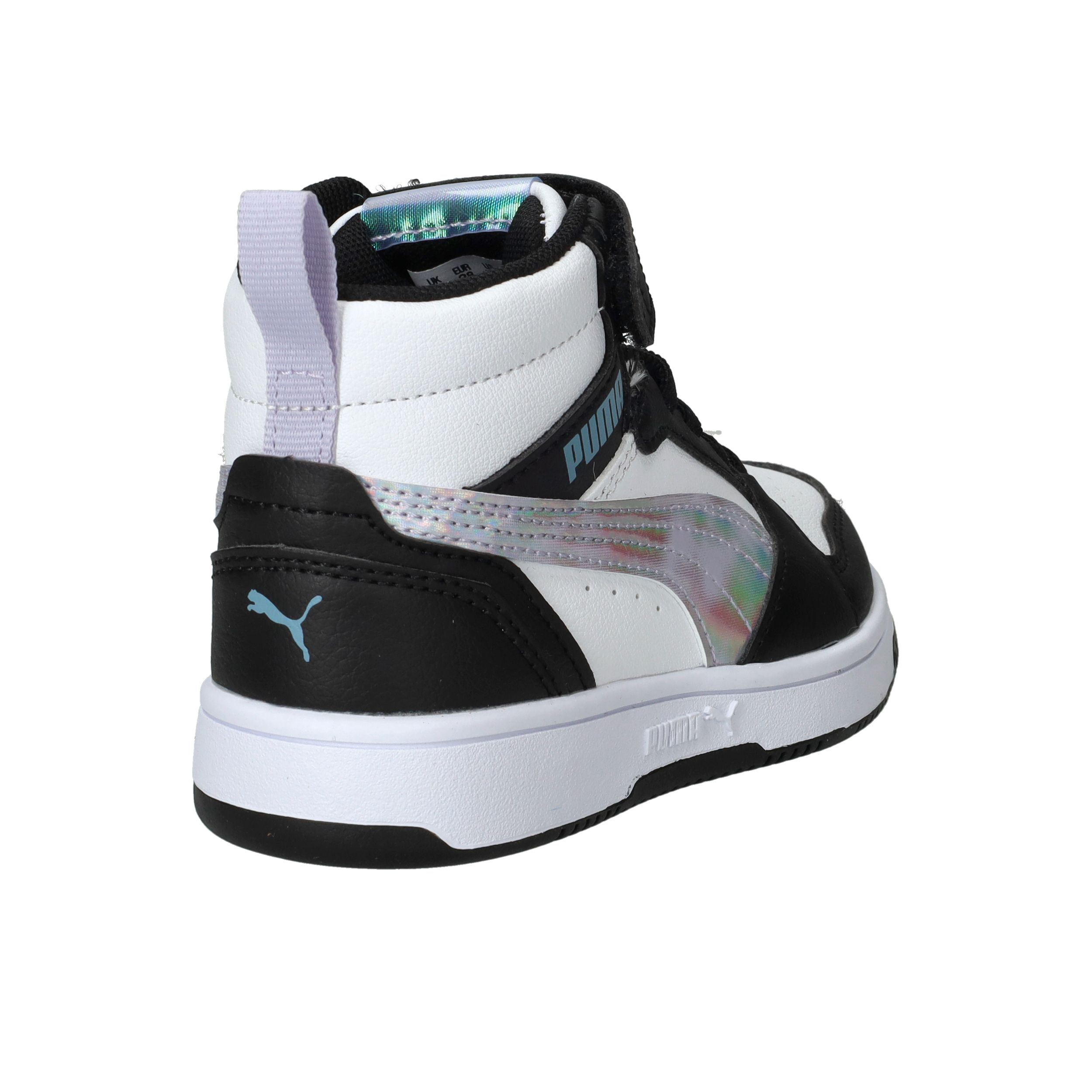 De meisjes sneakers Puma Rebound V6 Mid Space Belle zijn een perfecte mix van stijl, gemak en speelsheid. De opvallende holografische streep, gecombineerd met zwart-witte kleuren en een stevige klittenbandsluiting, zorgt voor een coole en praktische sneaker. Dankzij de halfhoge schacht en normale voetbreedte G zit deze sneaker stevig en comfortabel.