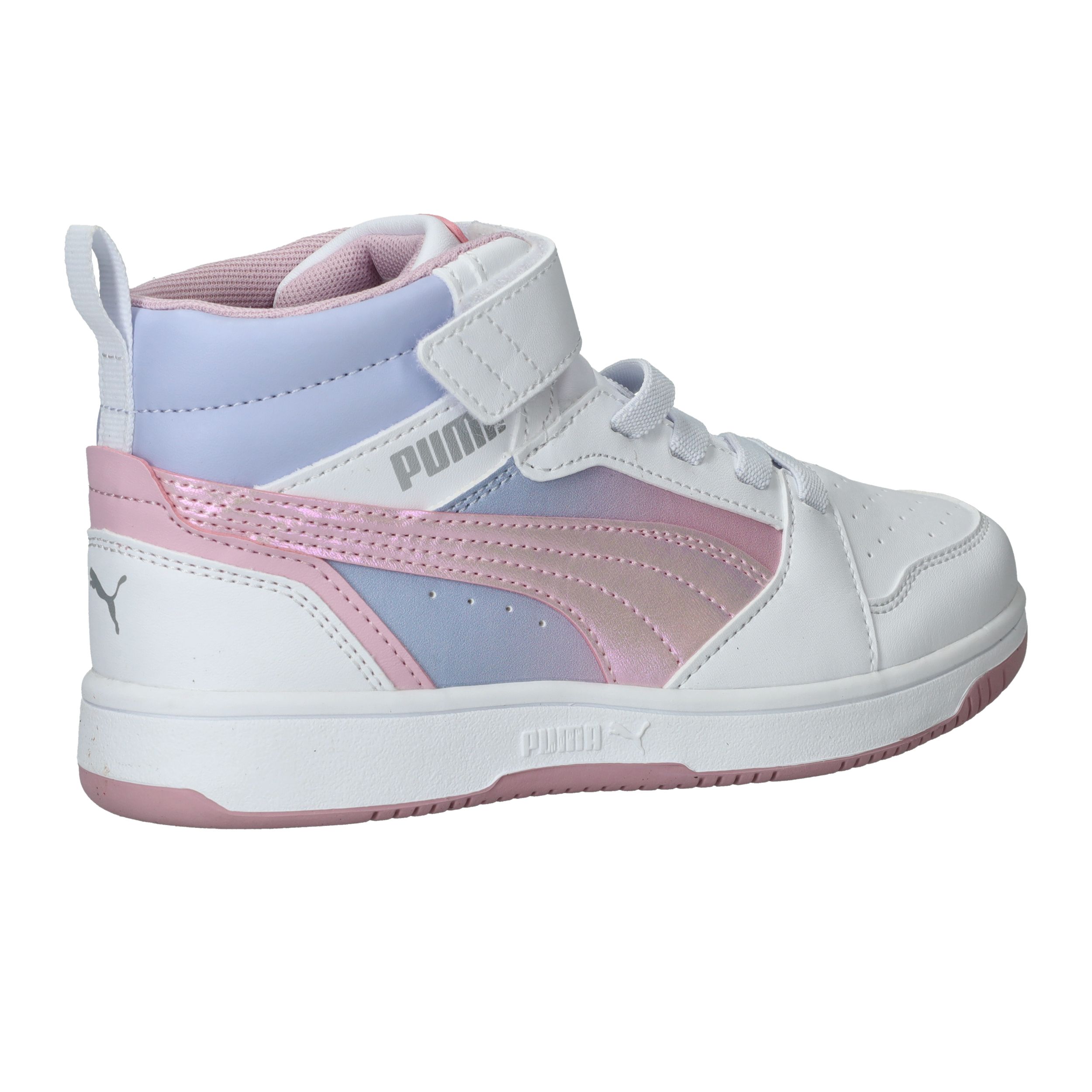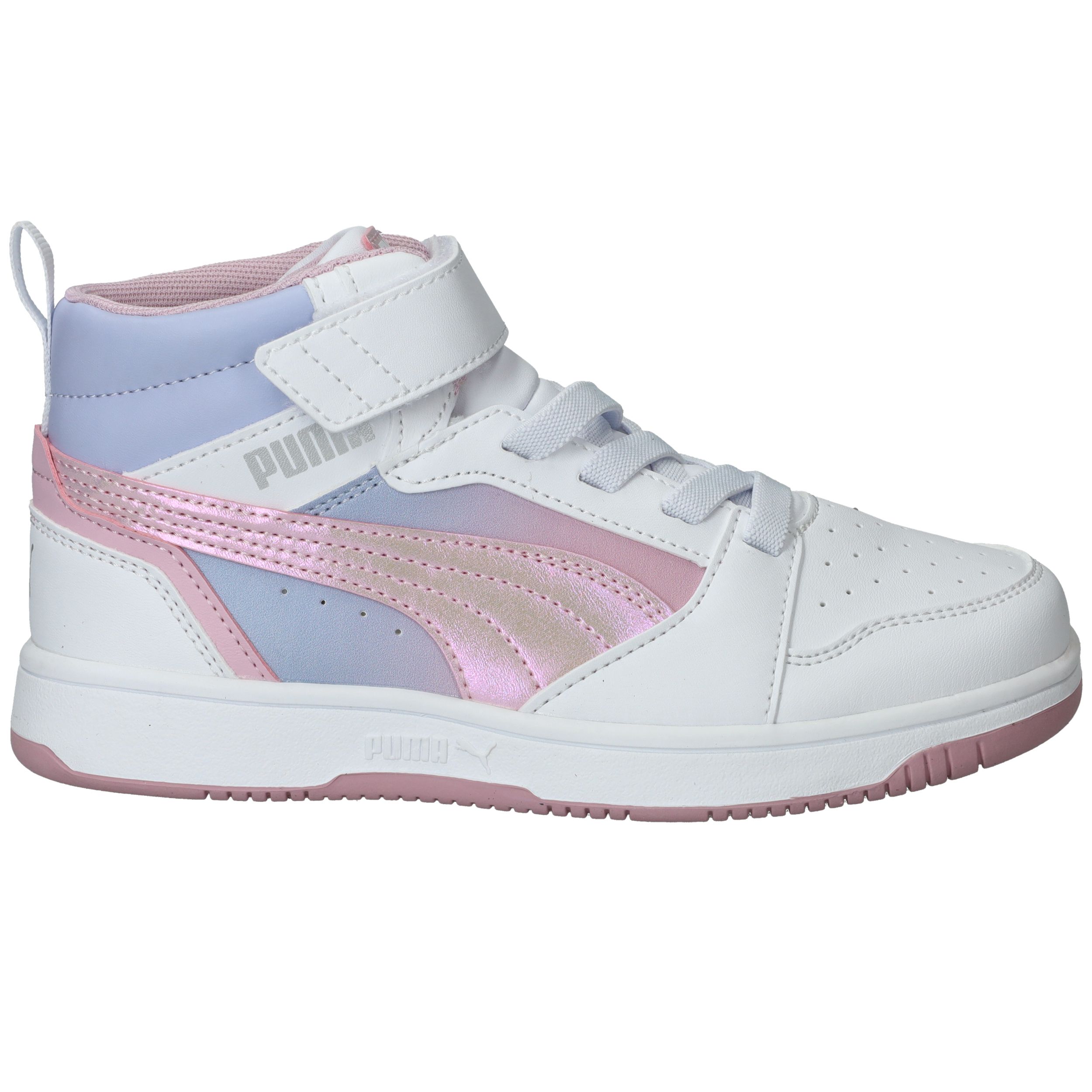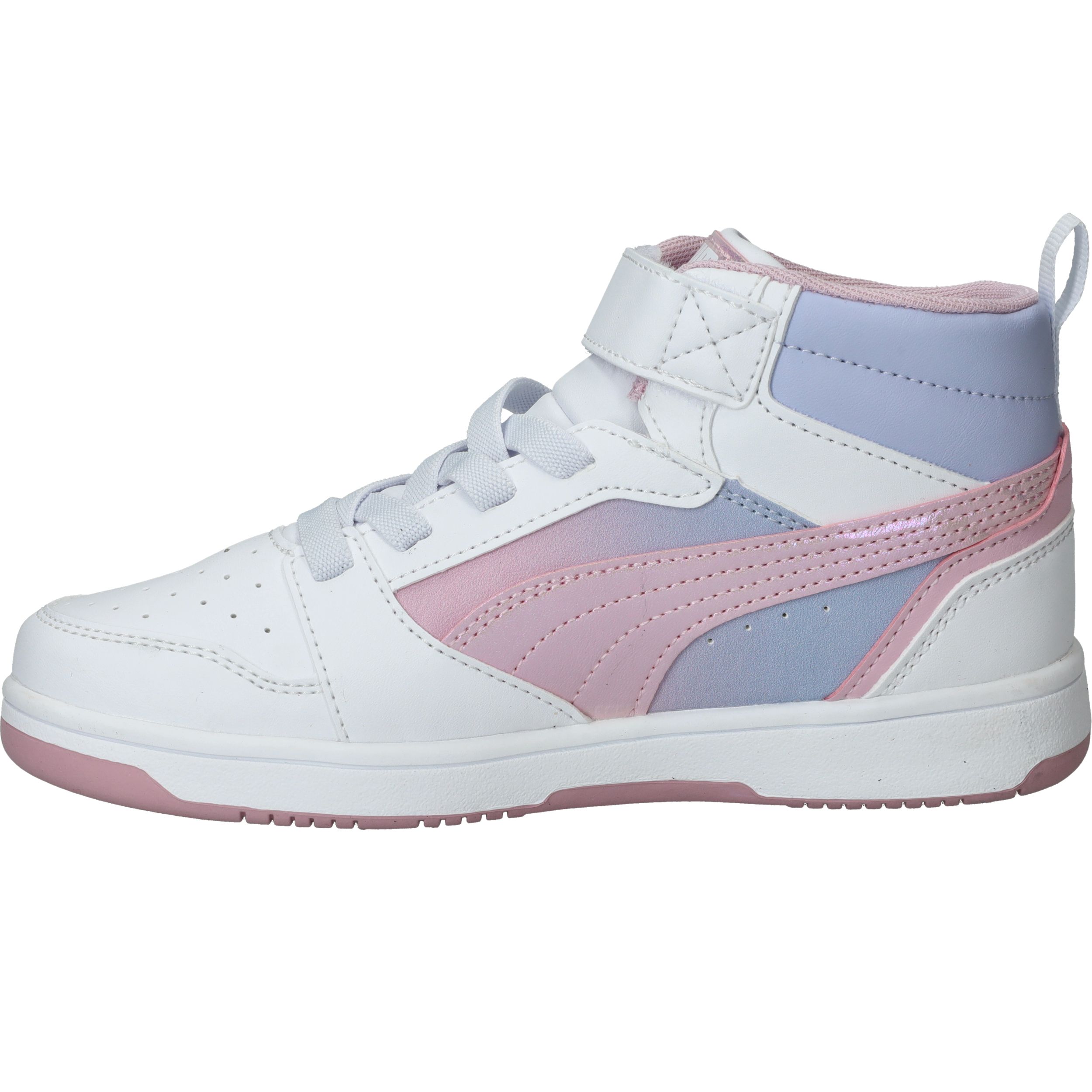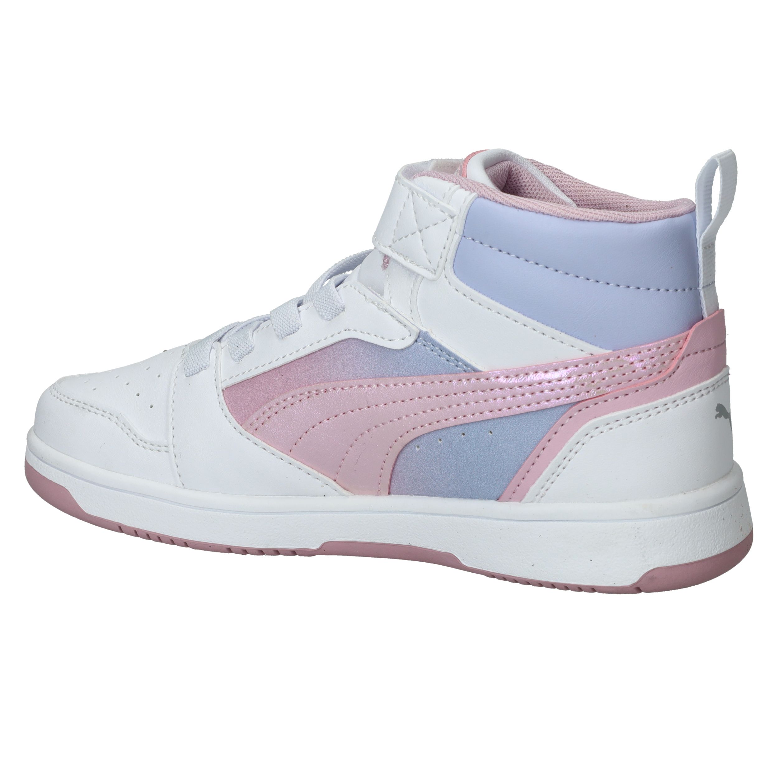 Hoe tof is deze Puma Rebound V8 Mid Blurry PS halfhoge sneaker met roze kleurverloop! De meidensneaker heeft metallic accenten en een roze zool.