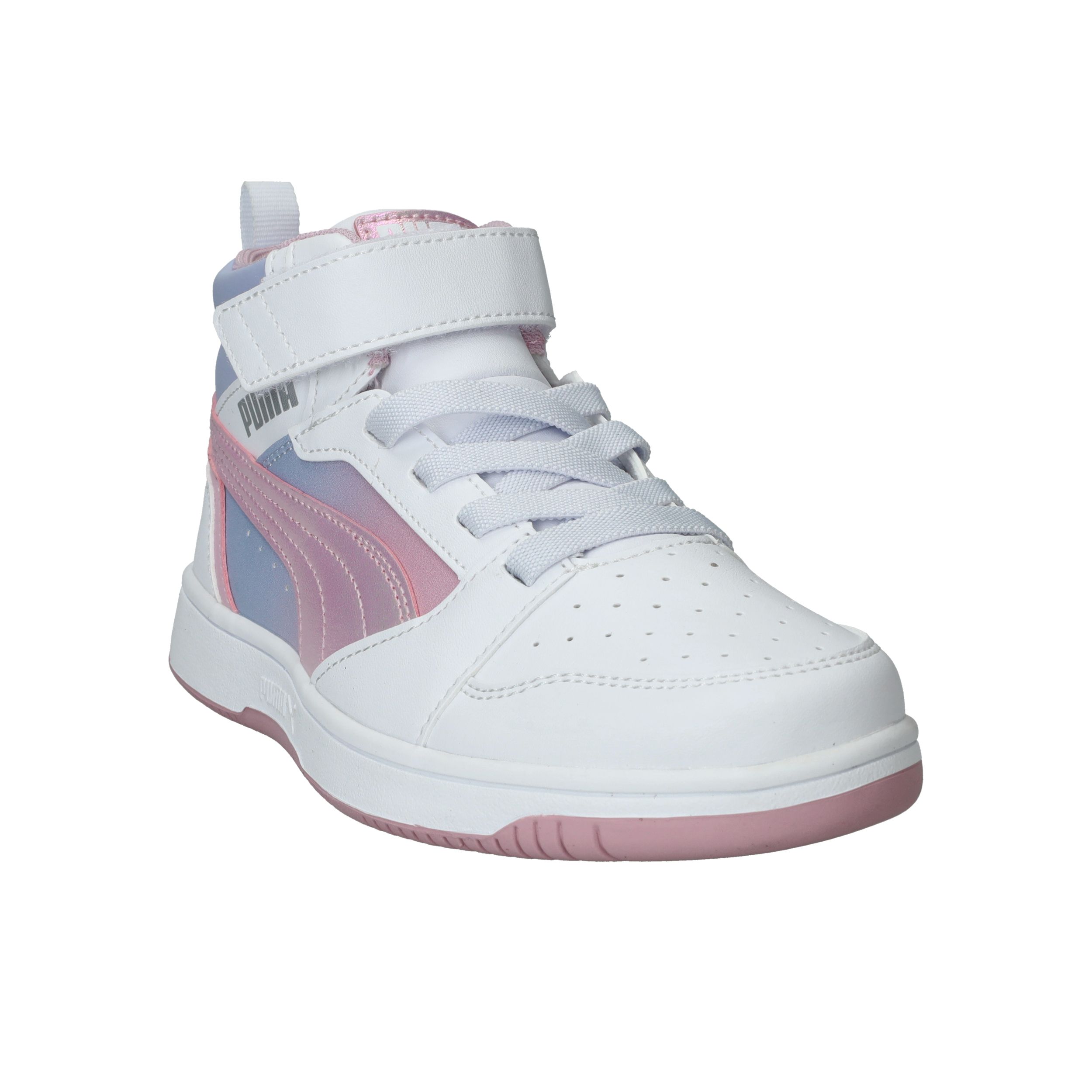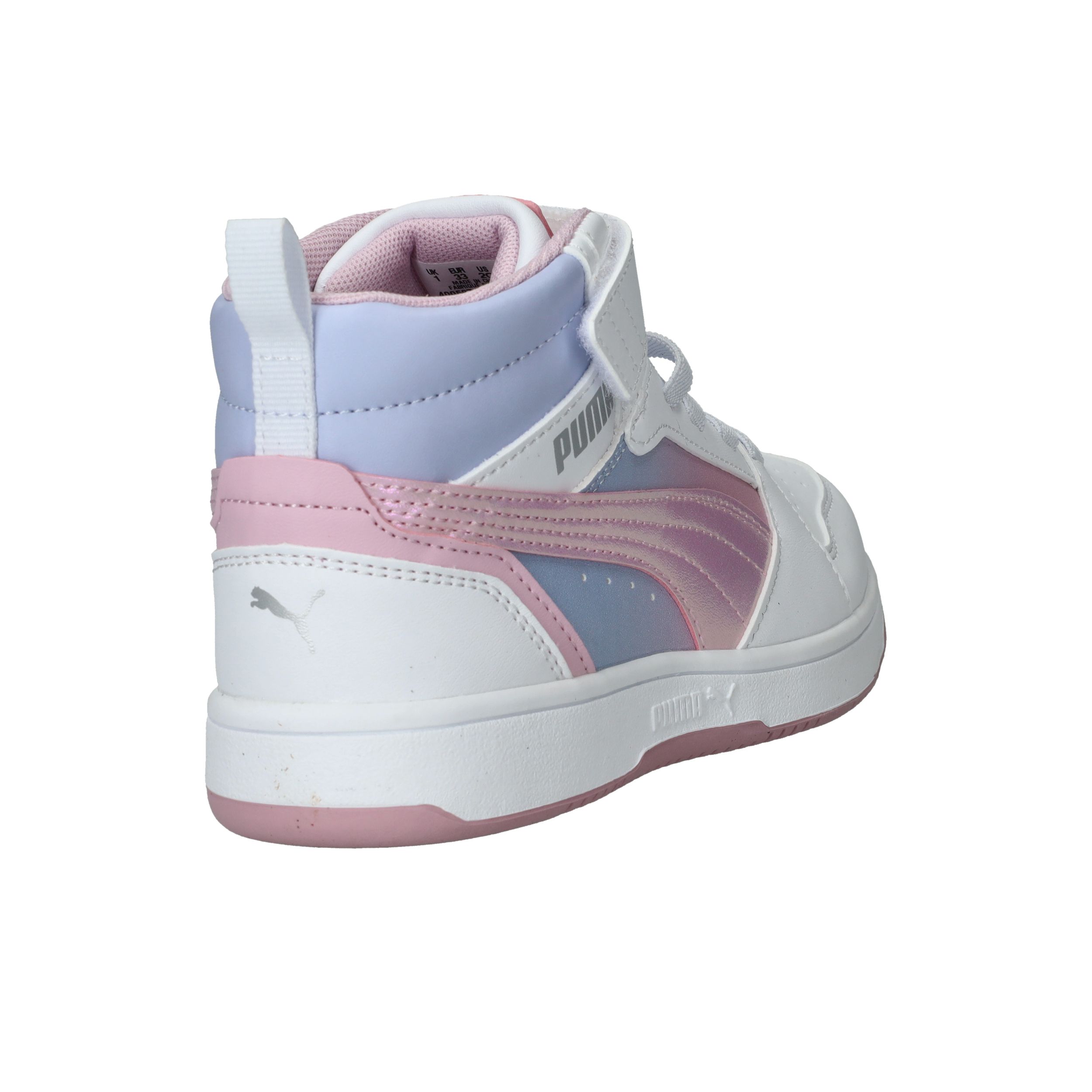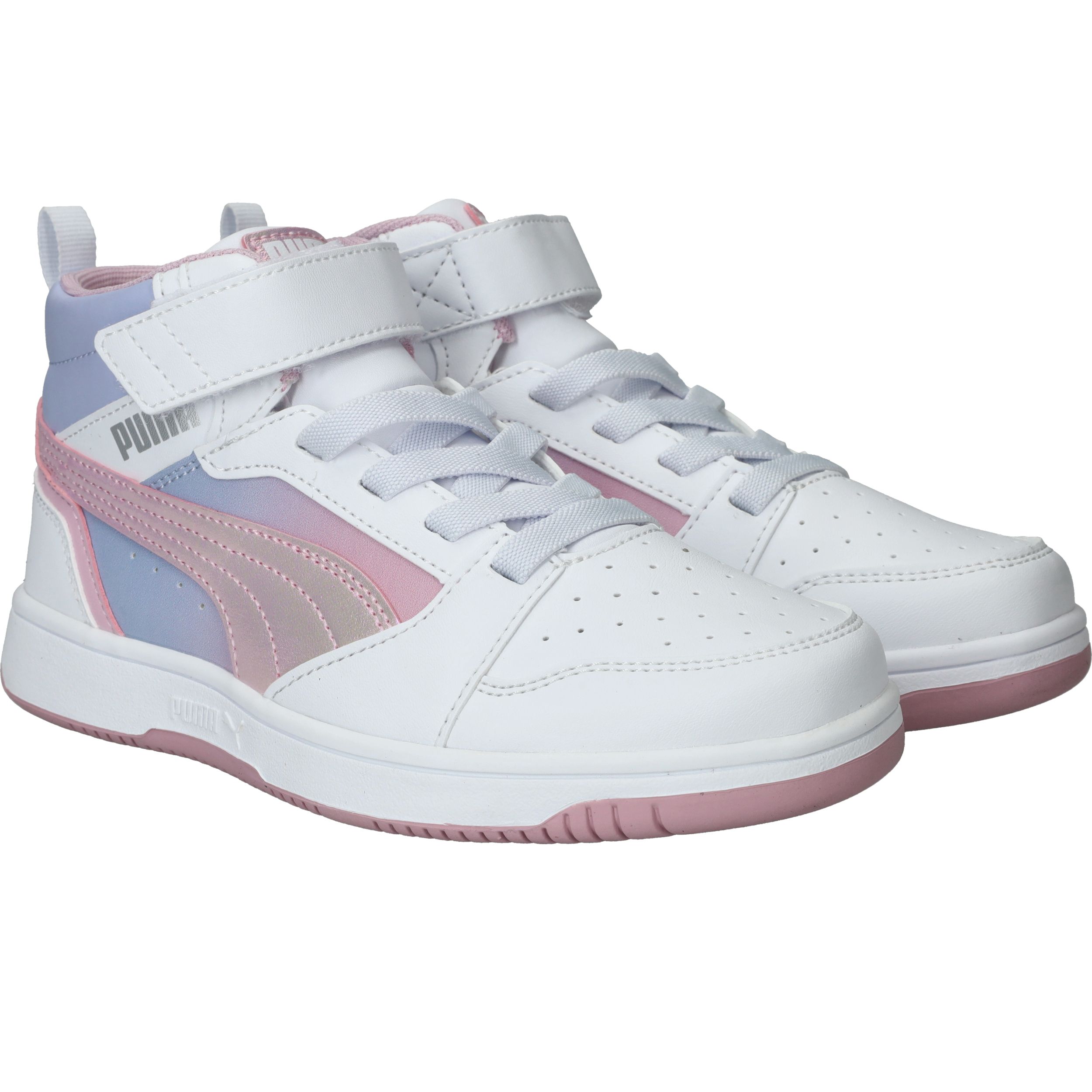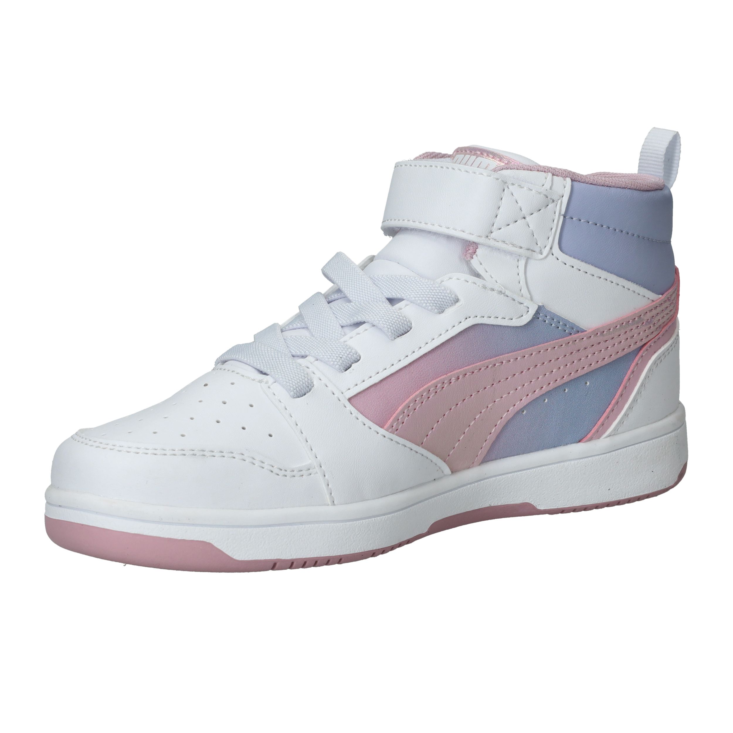 Hoe tof is deze Puma Rebound V8 Mid Blurry PS halfhoge sneaker met roze kleurverloop! De meidensneaker heeft metallic accenten en een roze zool.