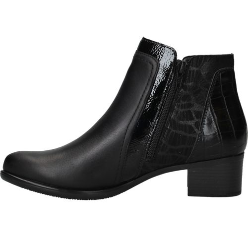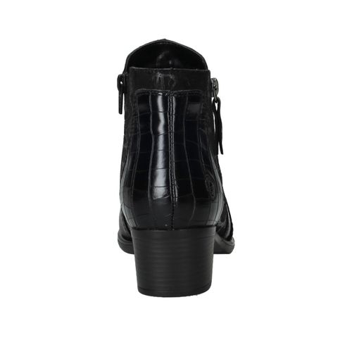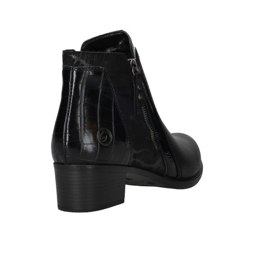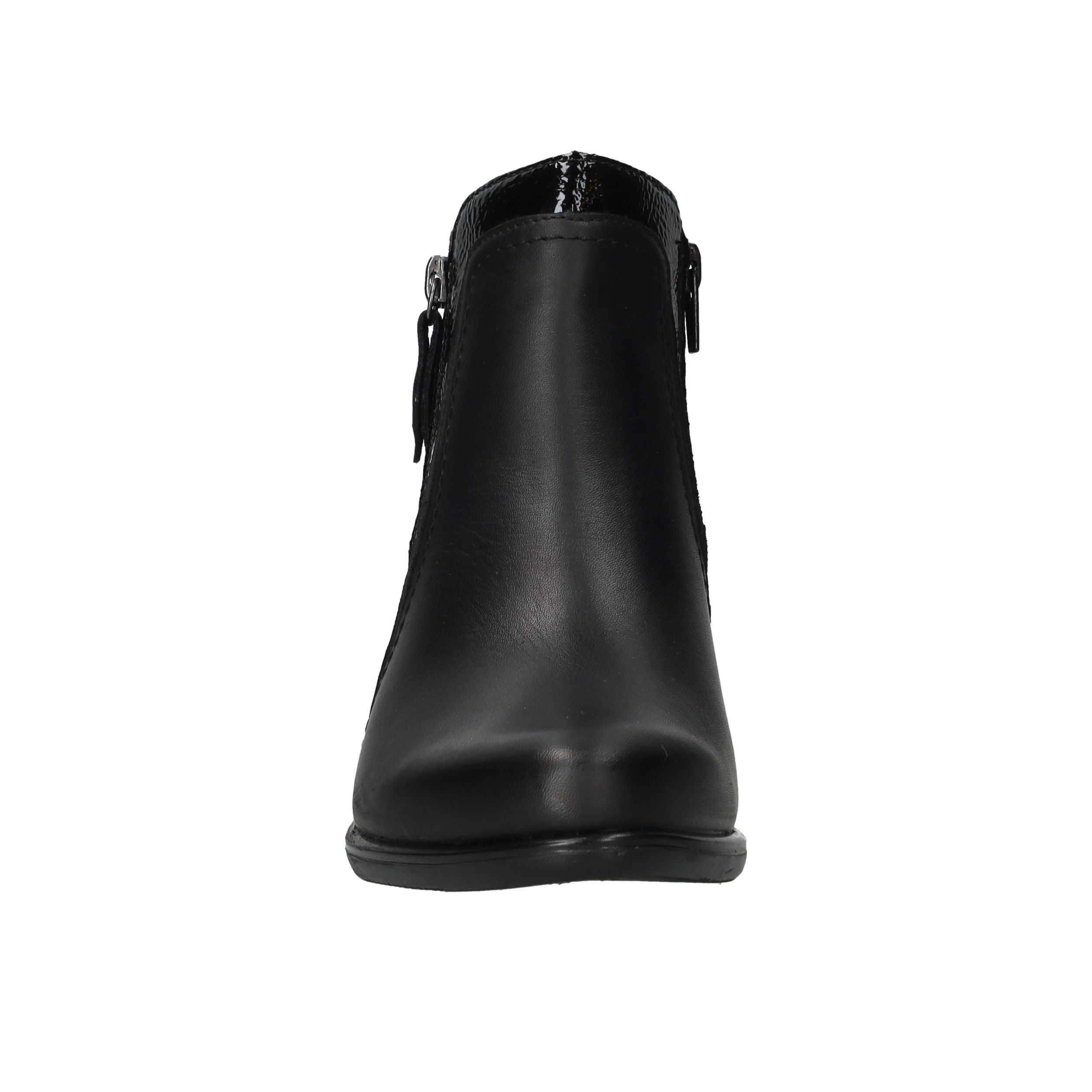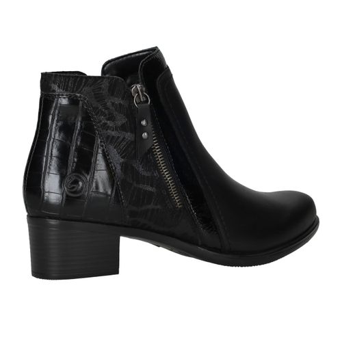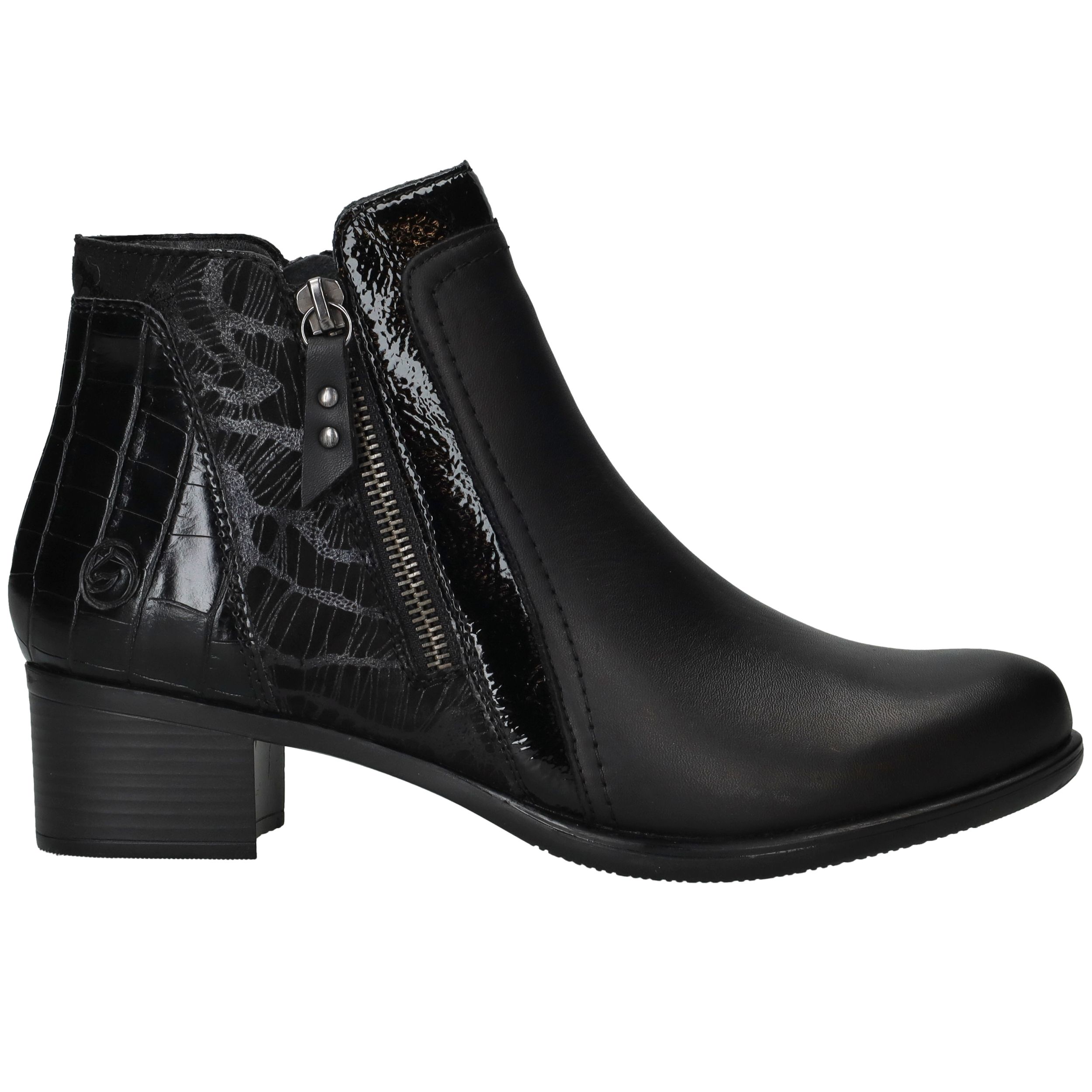 Deze elegante Remonte enkellaarsjes in zwart leer en textiel zijn een veelzijdige en stijlvolle keuze. Het subtiele contrast tussen het gladde leer en het textiele detail geeft de laarsjes een unieke en moderne uitstraling. De stevige hak biedt stabiliteit en comfort, terwijl de comfortabele voetbreedte G zorgt voor een fijne pasvorm. Perfect voor dames die mode en praktisch gemak willen combineren.