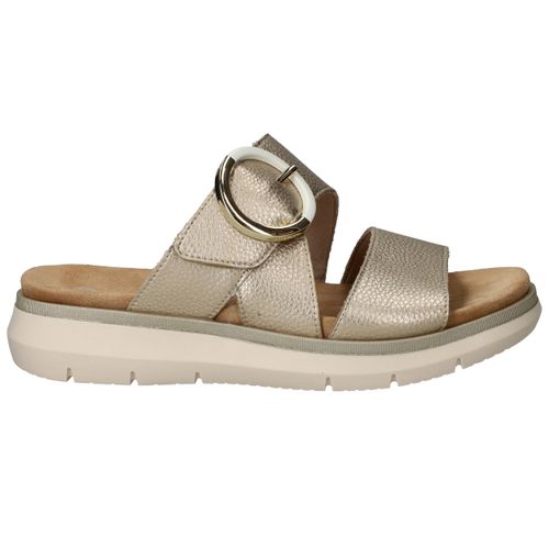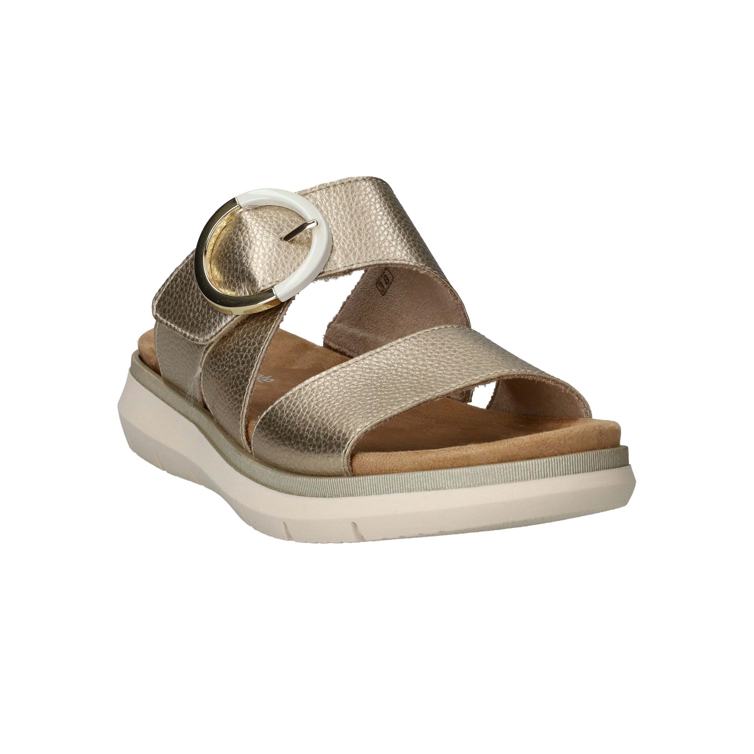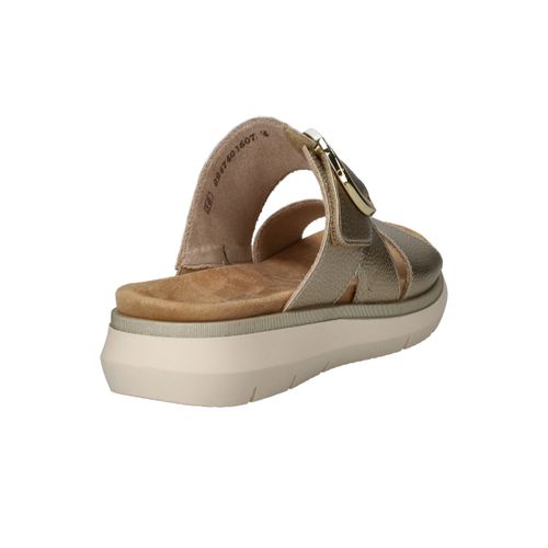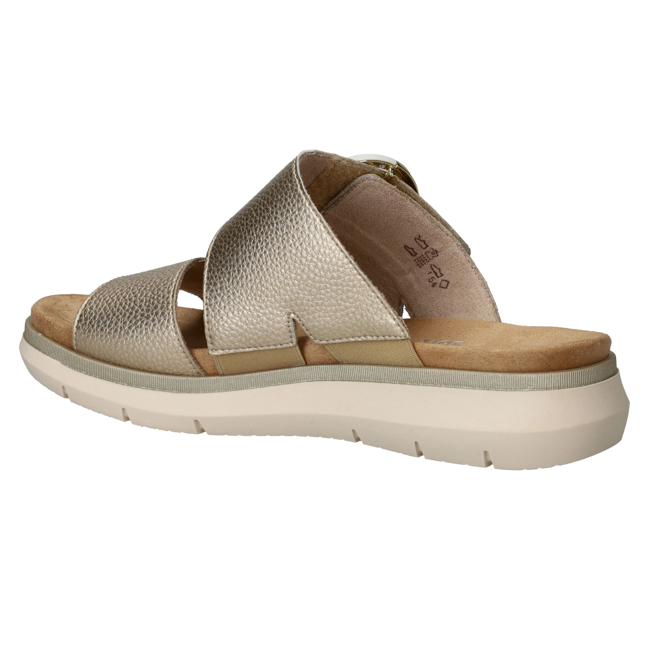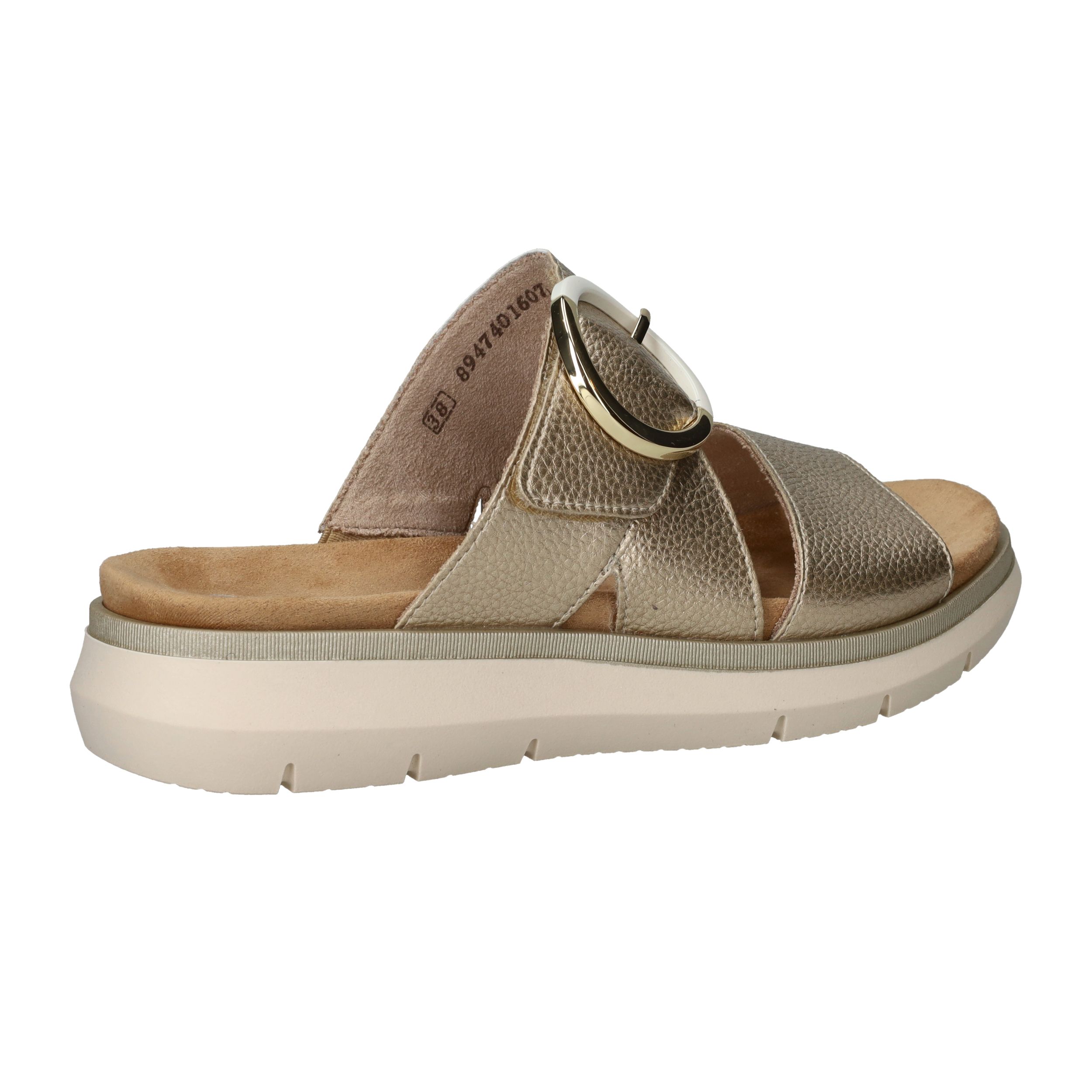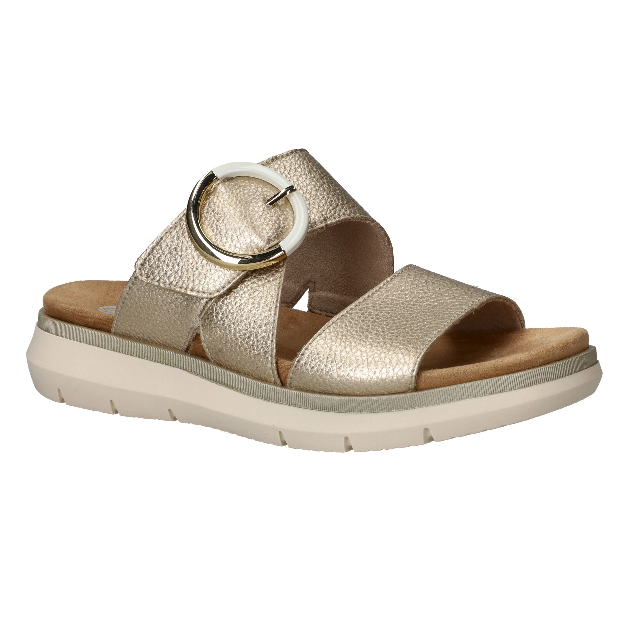 Deze elegante slipper van Remonte is ideaal voor wie comfort en stijl wil combineren tijdens warme dagen. Het model is uitgevoerd in goudkleurig leer en afgewerkt met een sierlijke witte en gouden ring, wat zorgt voor een luxe en vrouwelijke uitstraling. Dankzij de Lite 'n Soft zool geniet je van een lichtgewicht en dempend loopgevoel. Perfect voor dagelijks gebruik of een zomerse vakantie!