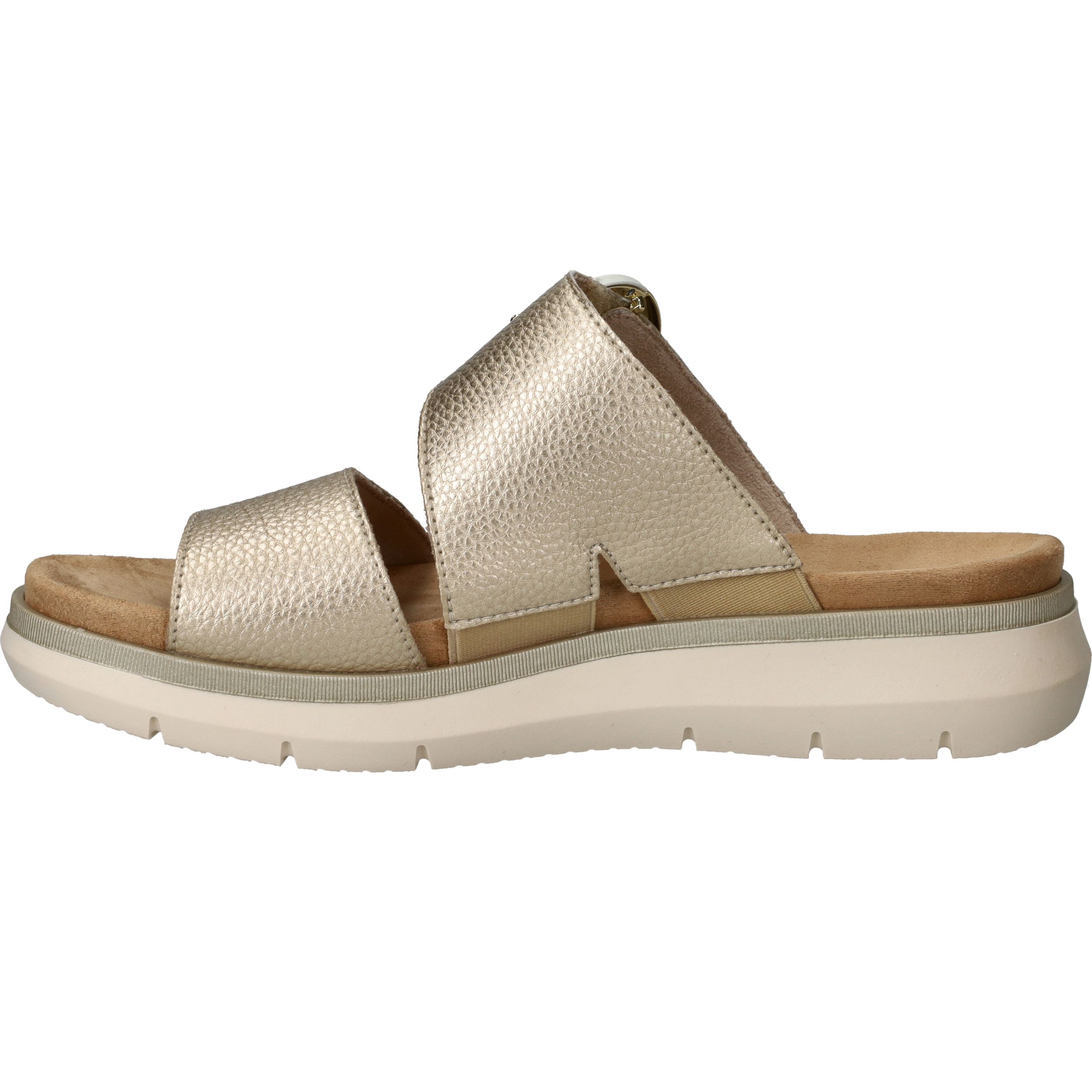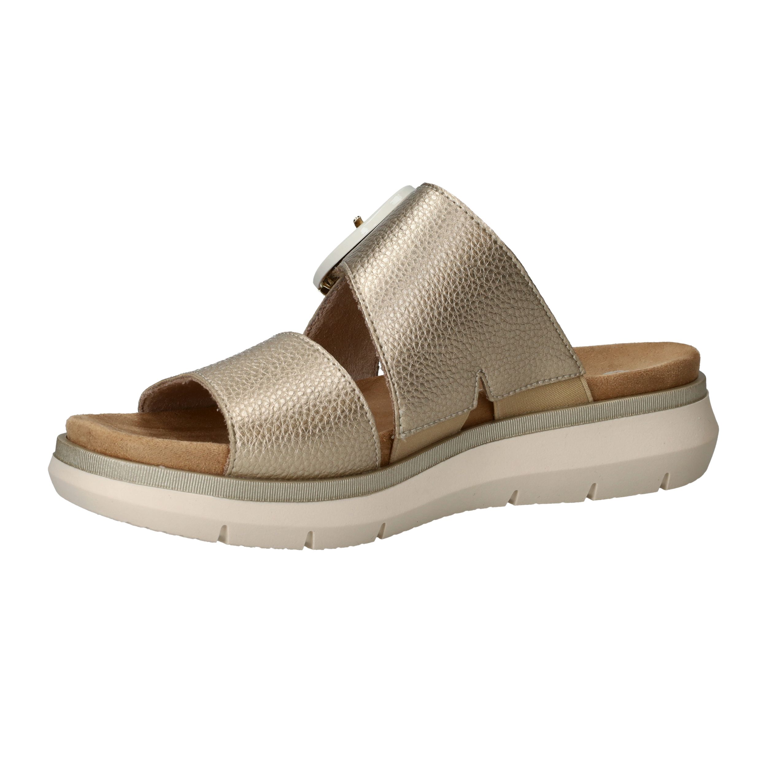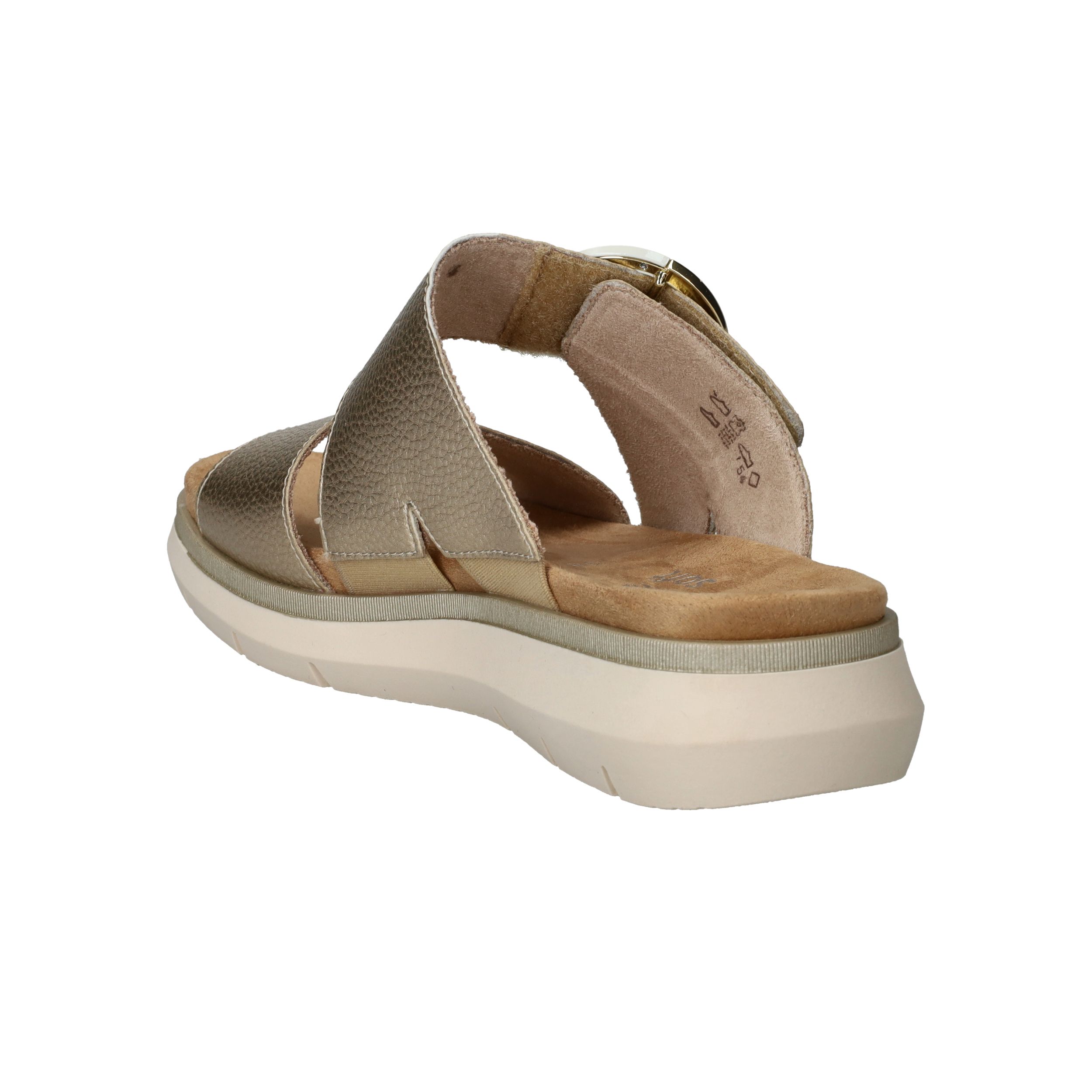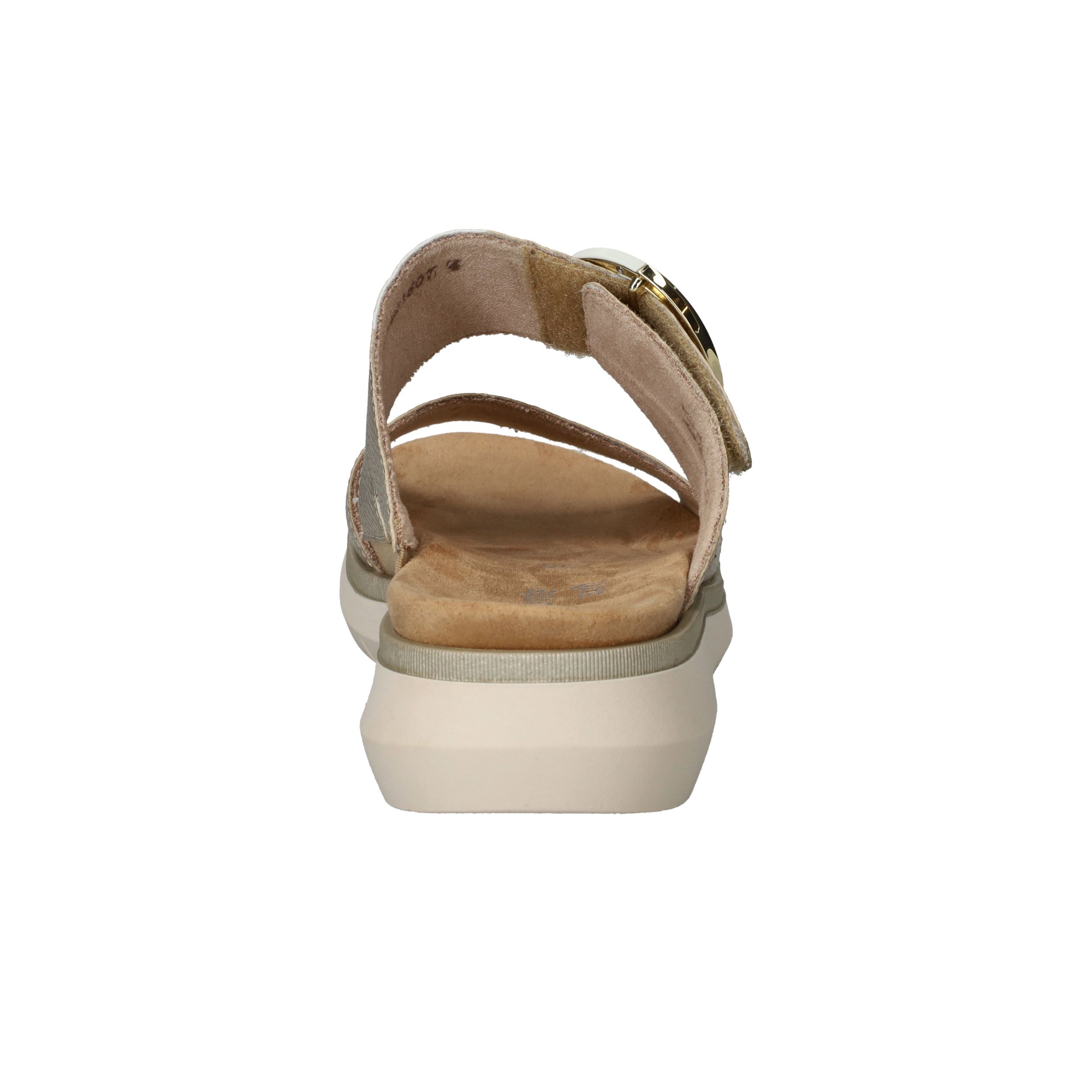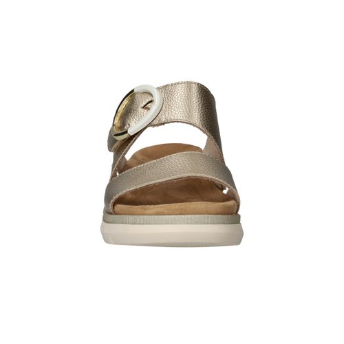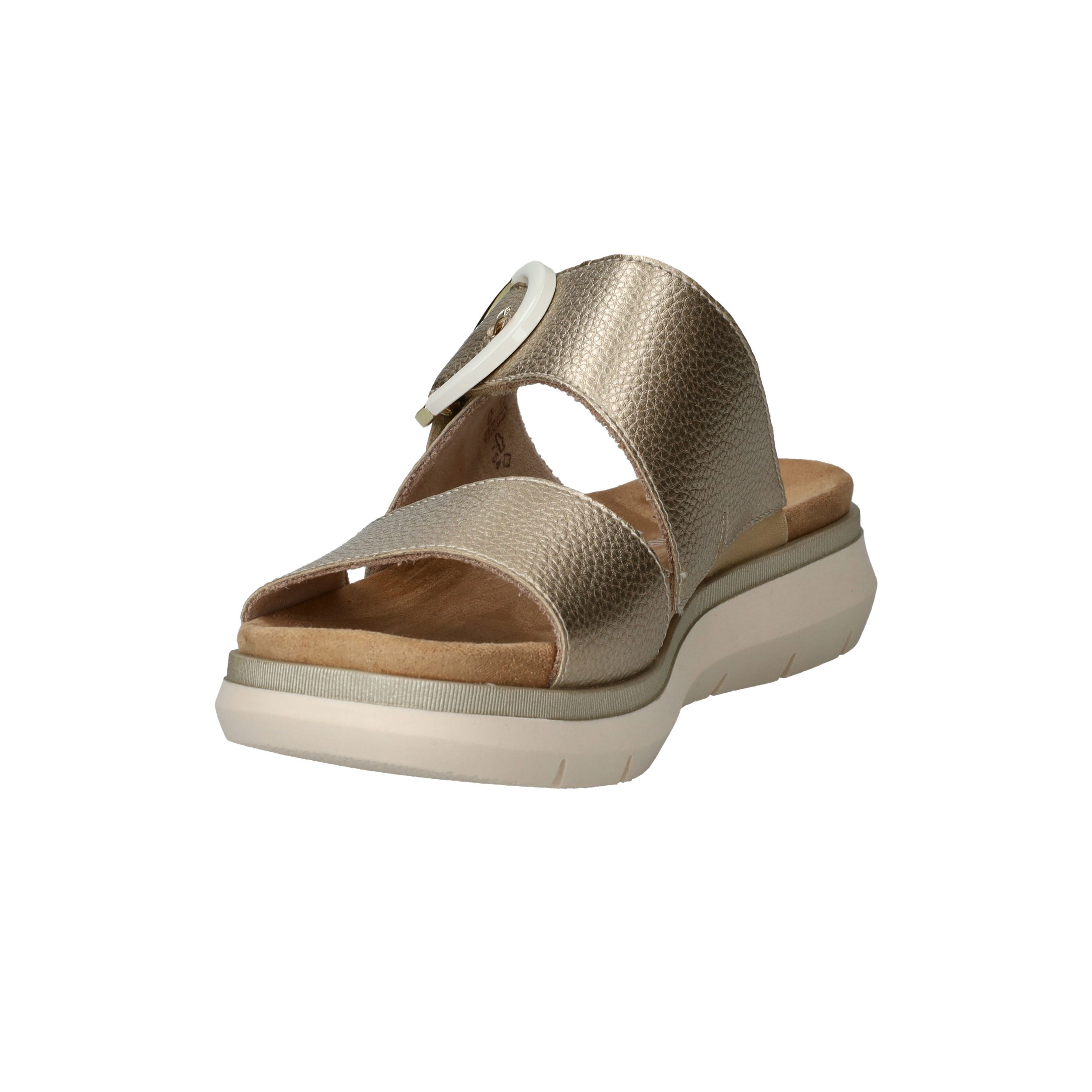 Deze elegante slipper van Remonte is ideaal voor wie comfort en stijl wil combineren tijdens warme dagen. Het model is uitgevoerd in goudkleurig leer en afgewerkt met een sierlijke witte en gouden ring, wat zorgt voor een luxe en vrouwelijke uitstraling. Dankzij de Lite 'n Soft zool geniet je van een lichtgewicht en dempend loopgevoel. Perfect voor dagelijks gebruik of een zomerse vakantie!