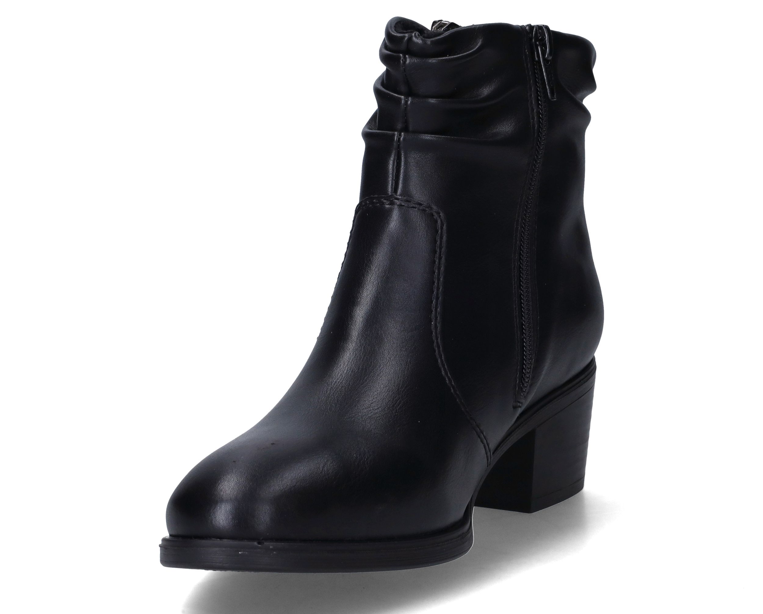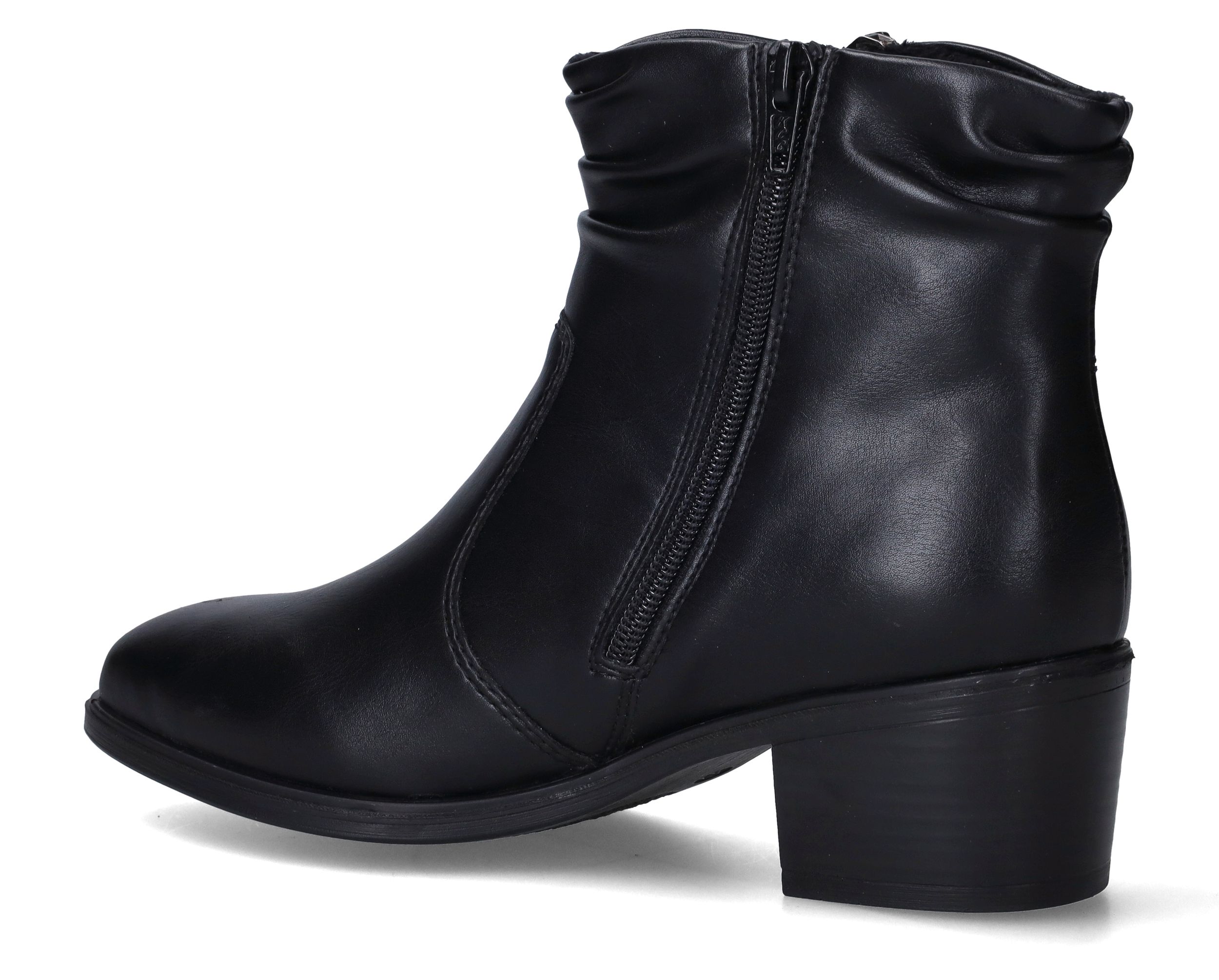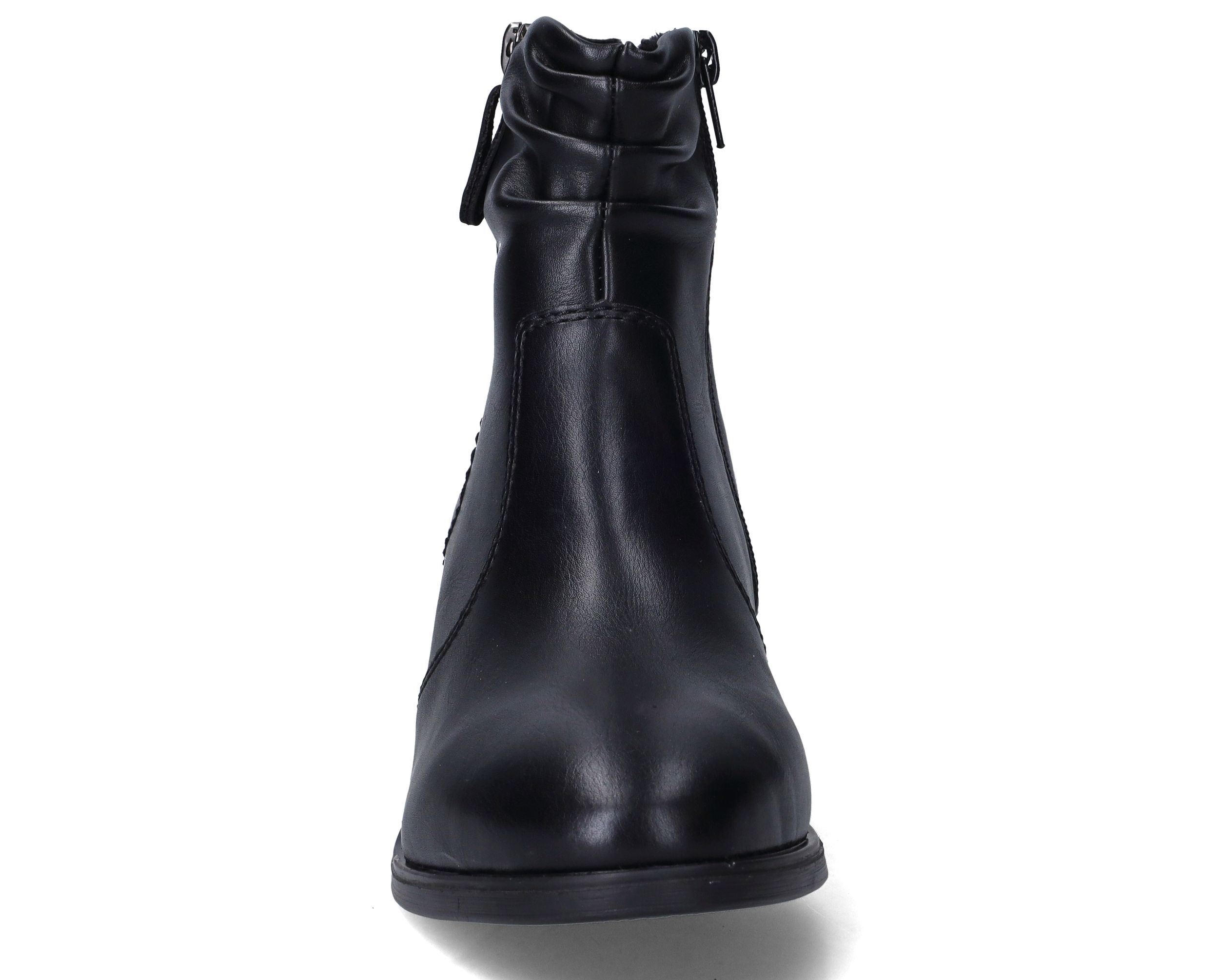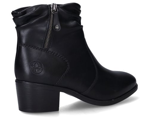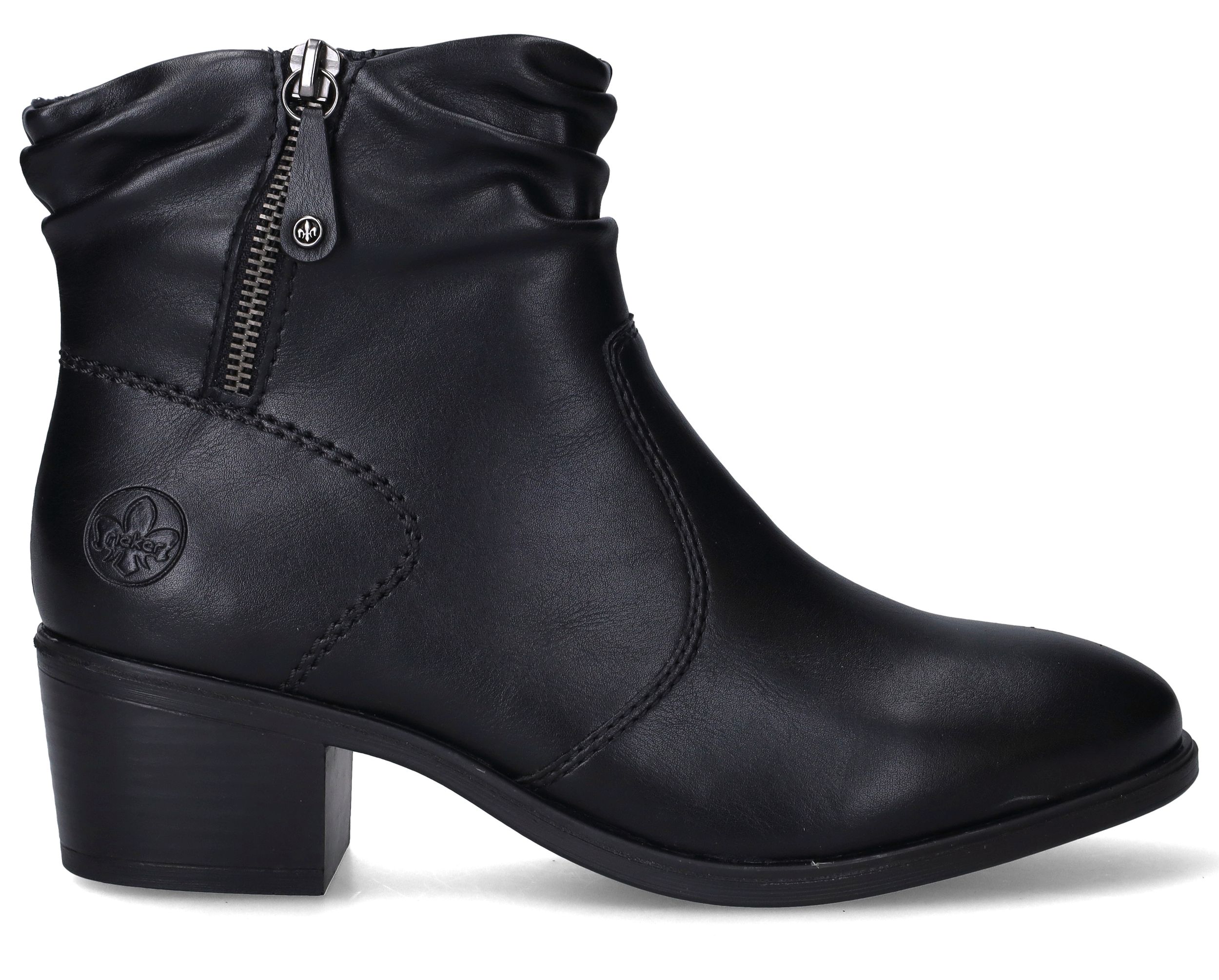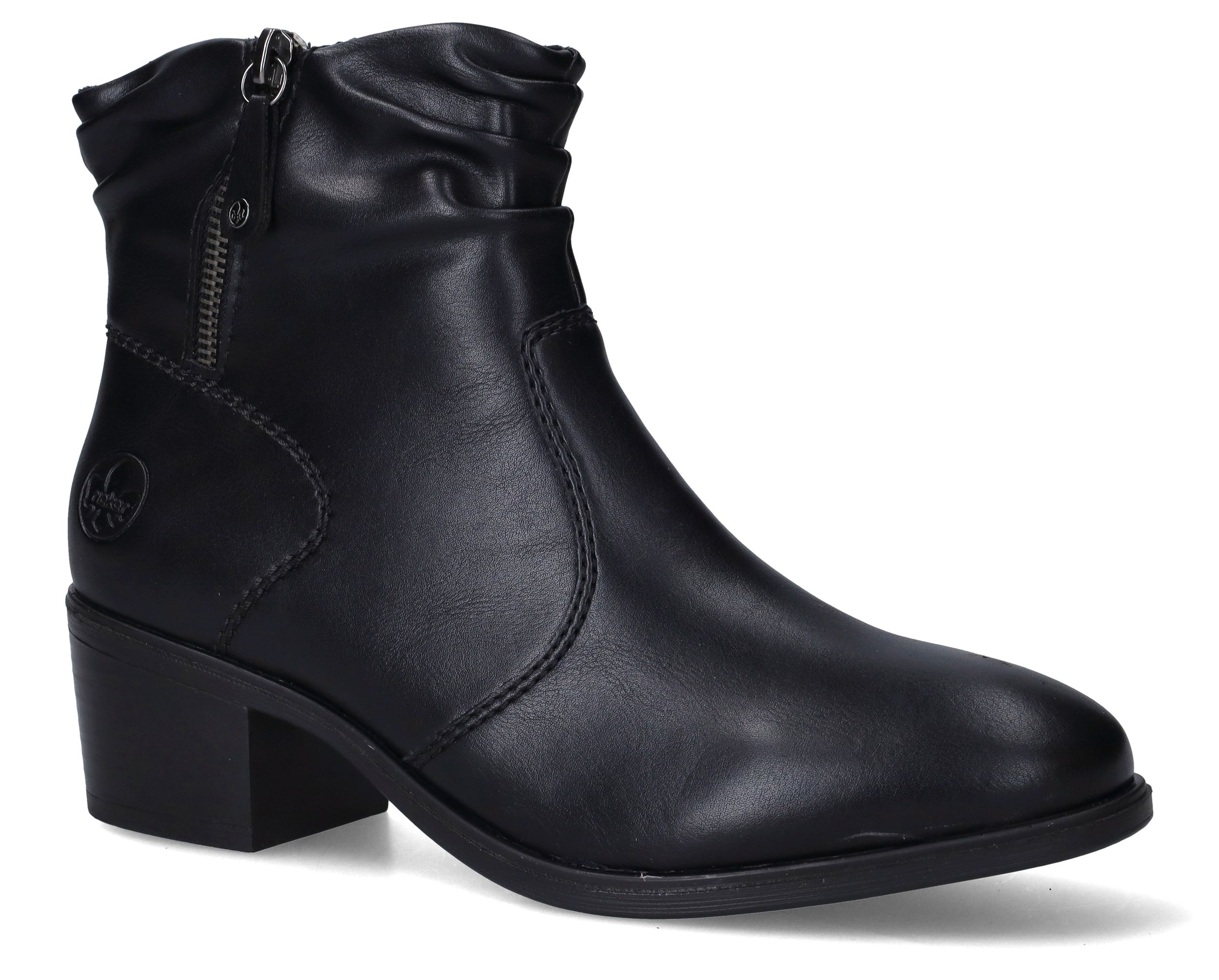 Deze elegante zwarte Rieker enkellaarsjes van hoogwaardig kunstleer combineren stijl, comfort en gemak. Met voetbreedte F1/2 bieden ze iets extra ruimte, waardoor ze de hele dag door comfortabel zitten. De lage blokhak en subtiele rimpeling in het bovenwerk geven deze schoenen een tijdloze uitstraling die bij elke outfit past.