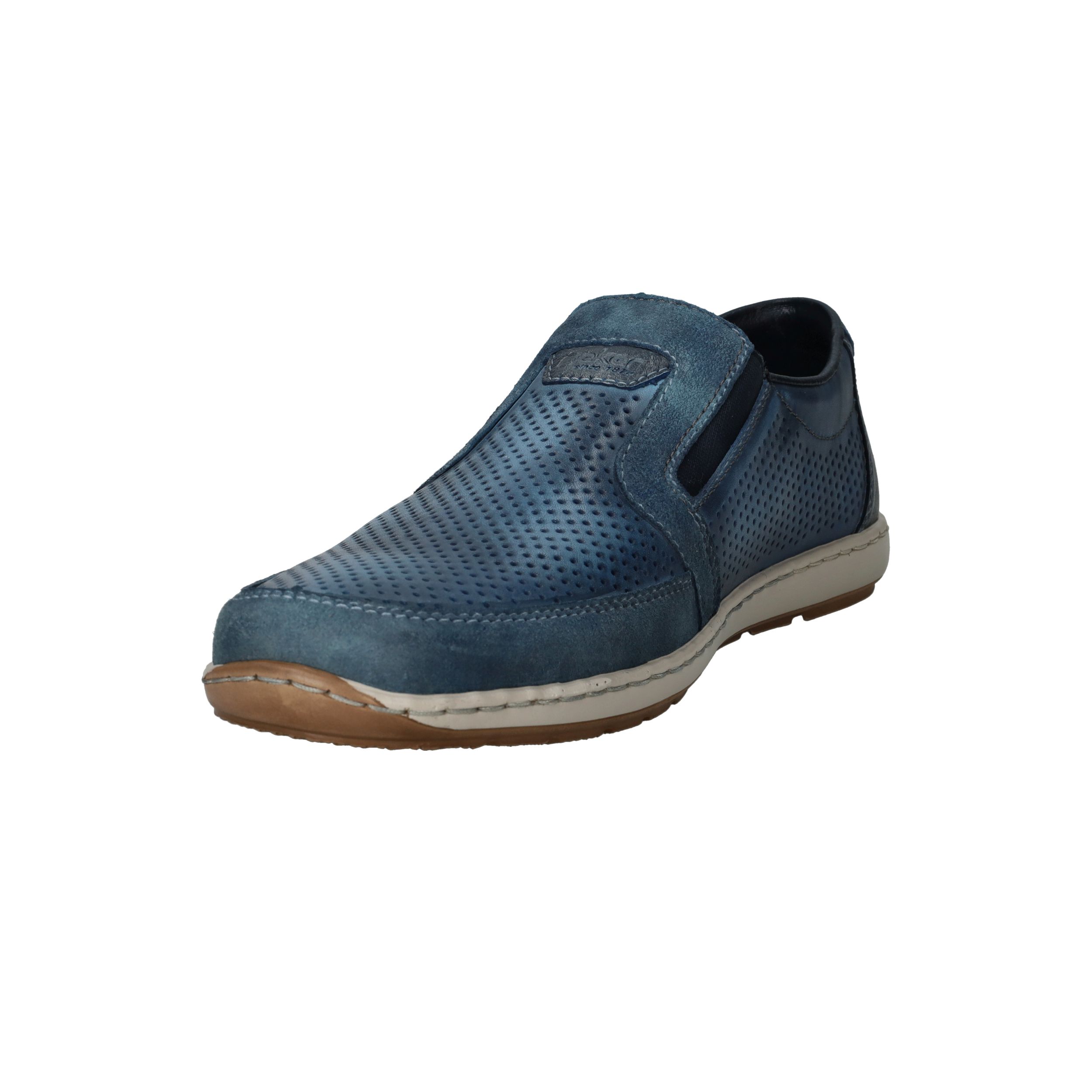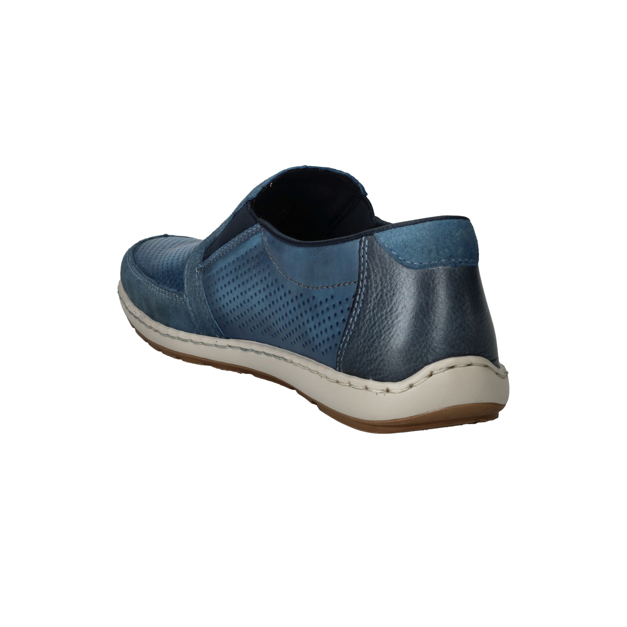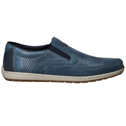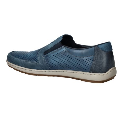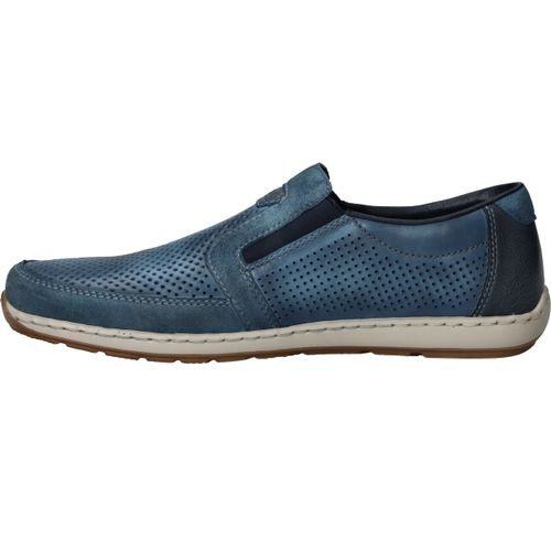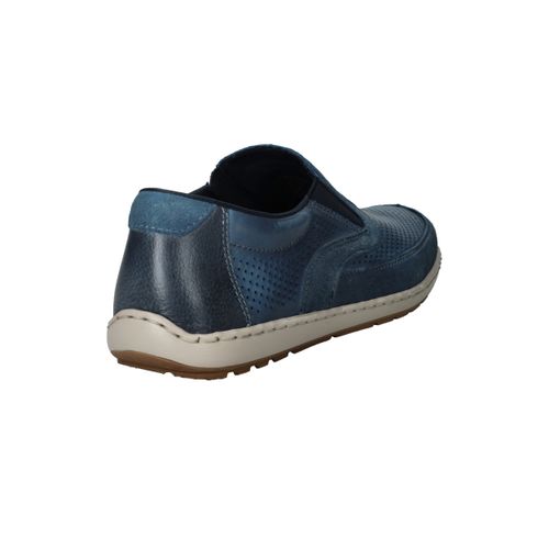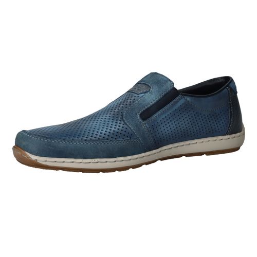Op zoek naar stijlvolle en luchtige heren mocassins voor warme dagen? Deze blauwe Rieker mocassins combineren moeiteloos comfort en elegantie. Dankzij het zachte leer en de perforaties aan de wreef en zijkanten zijn deze mocassins ademend en ideaal voor zomerse uitstapjes. Met hun flexibele zool en makkelijke instap ben je verzekerd van comfort bij elke stap.