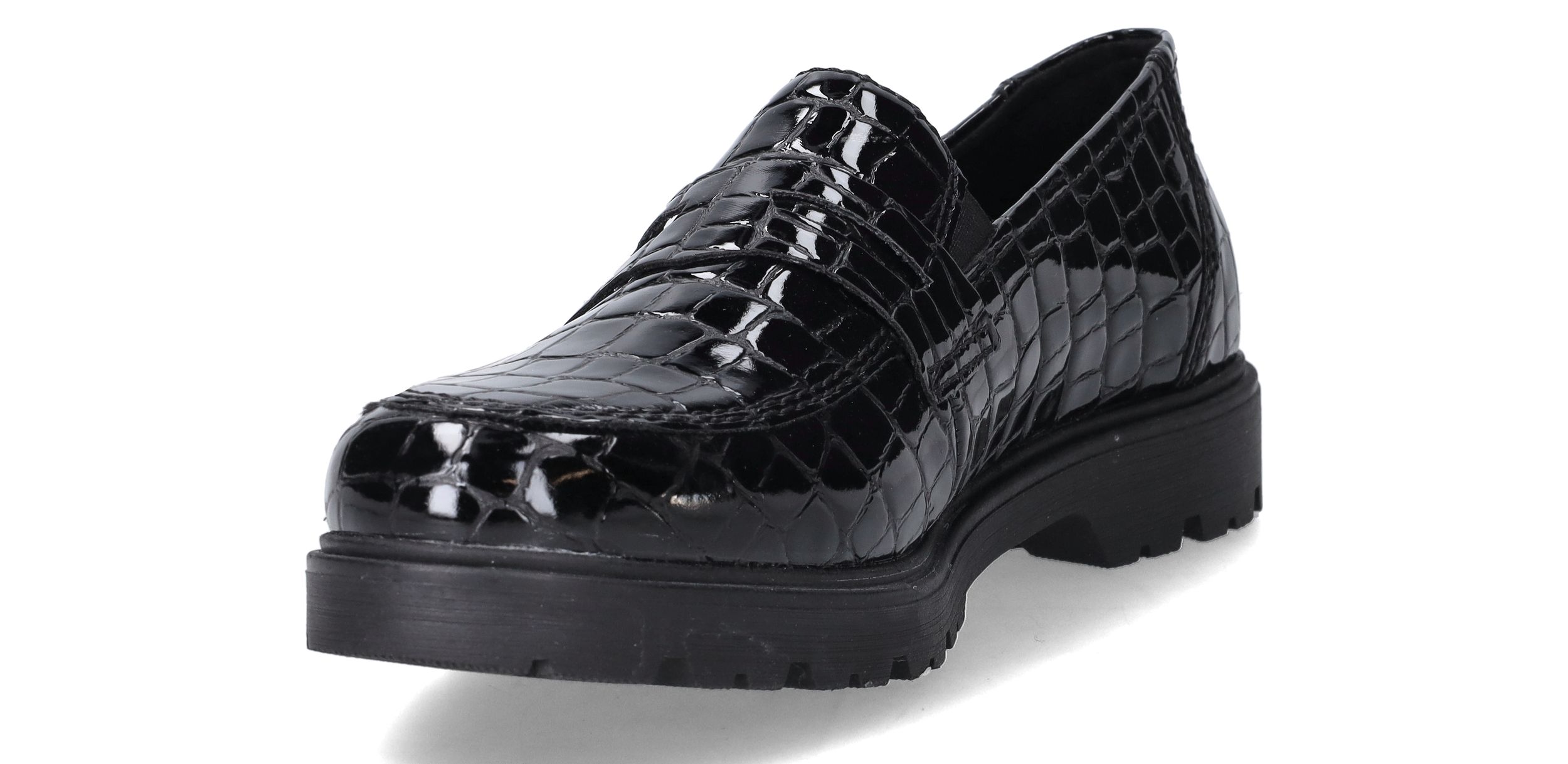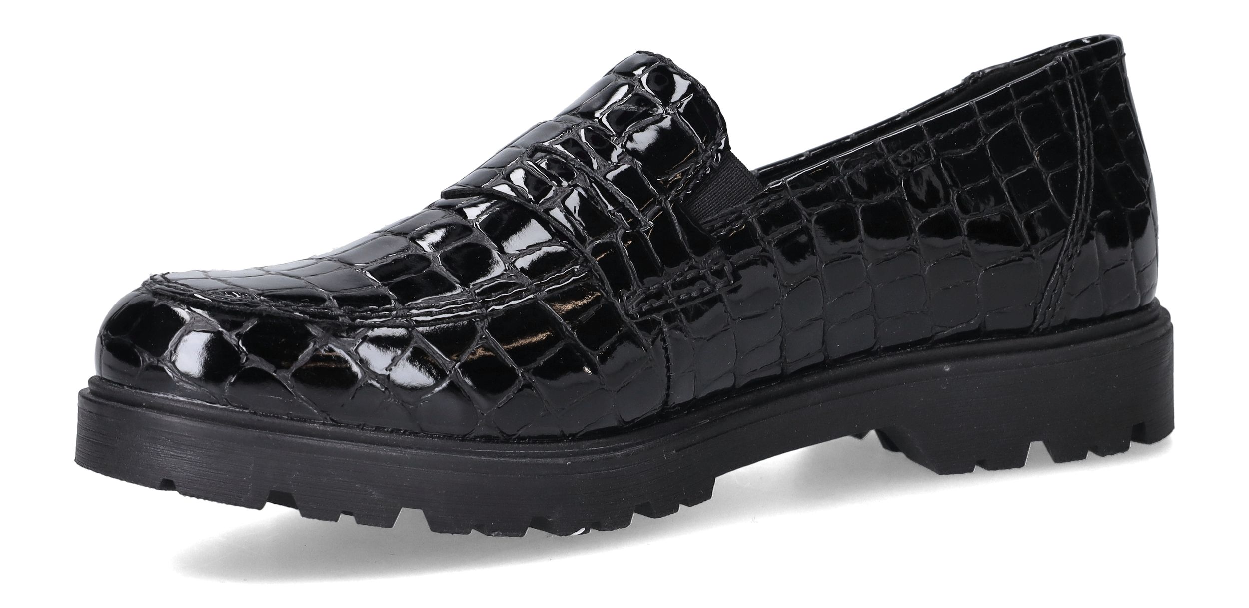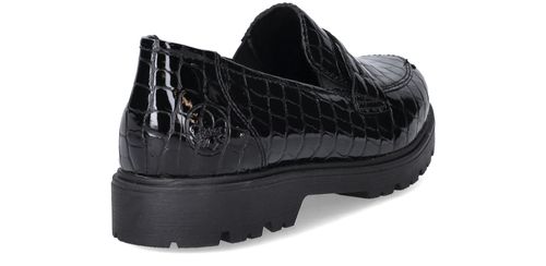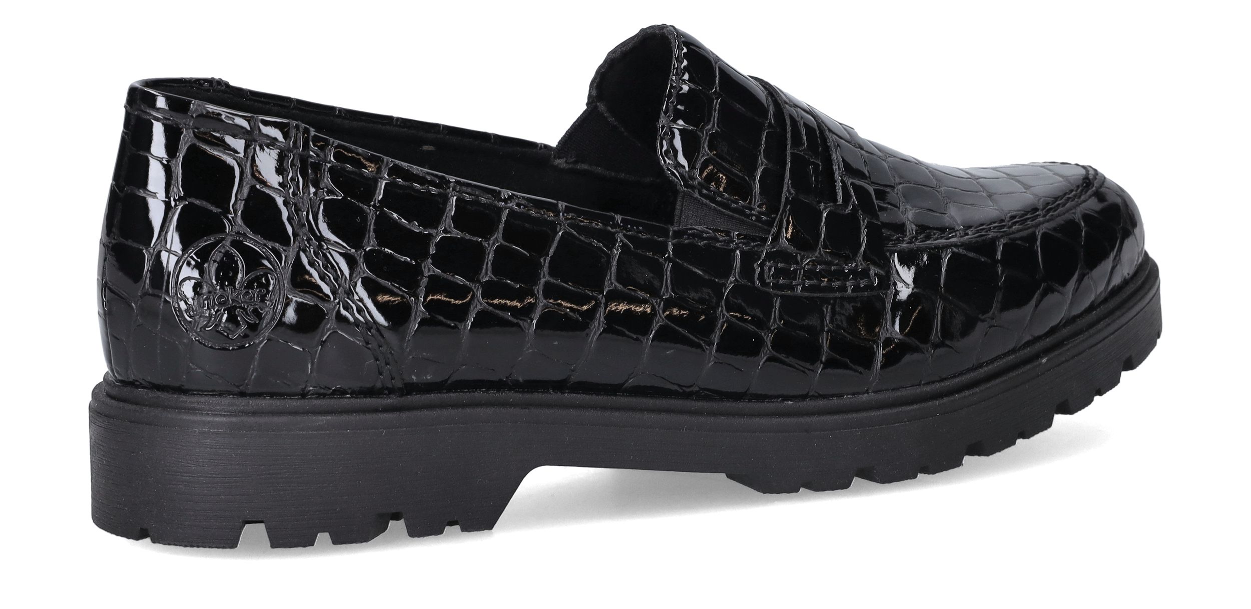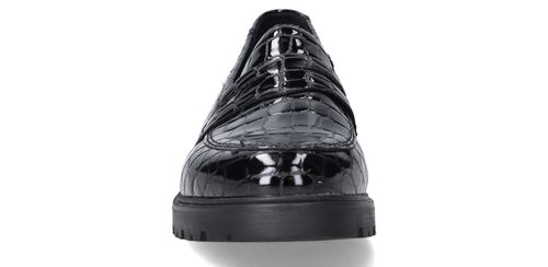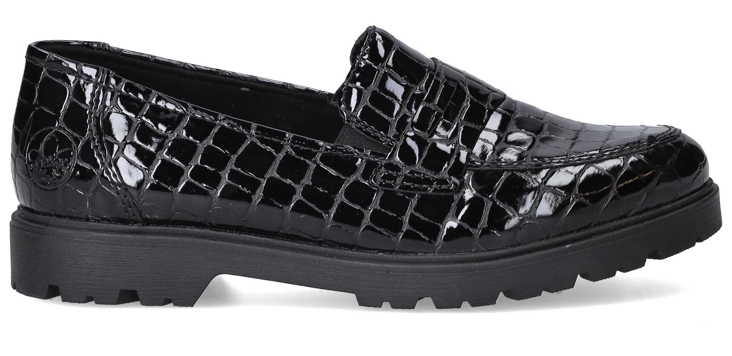Op zoek naar een elegante instapper die direct opvalt? Deze zwarte loafers van Rieker combineren klasse met comfort. De glanzende krokolook in lak-kunstleer maakt elke outfit stijlvol, of je ze nu draagt naar kantoor of een etentje. Perfect voor dames met een smallere voetbreedte F die niet willen inleveren op modegevoel.