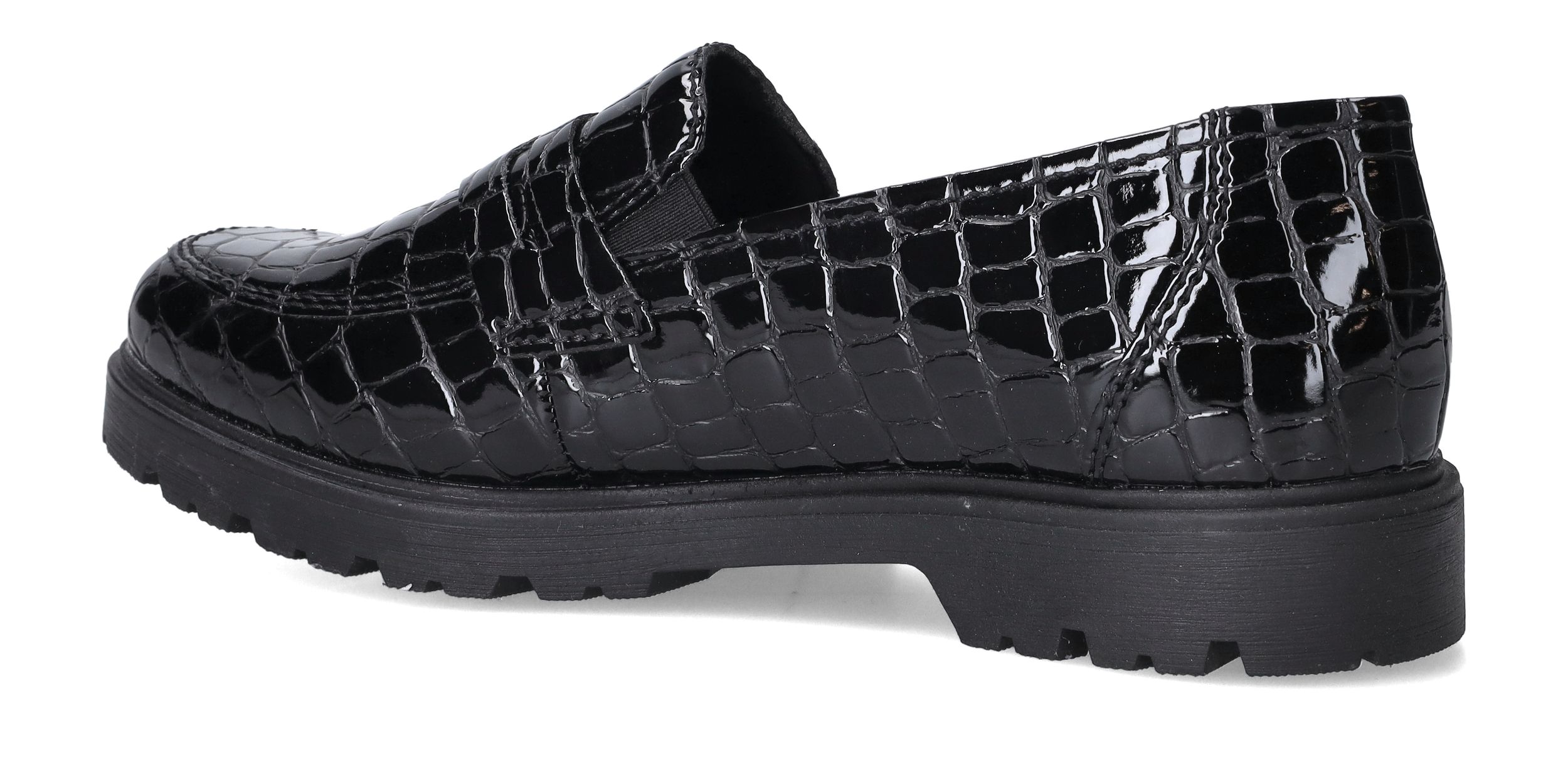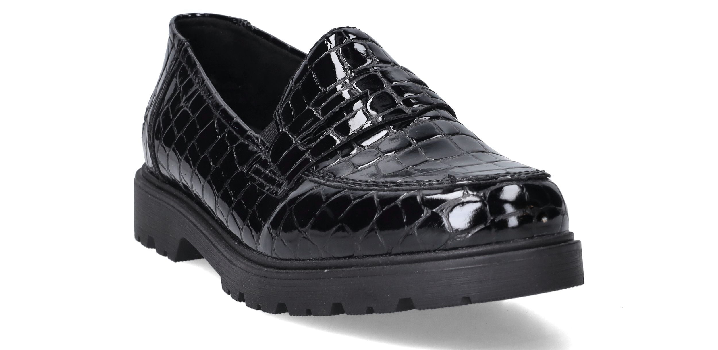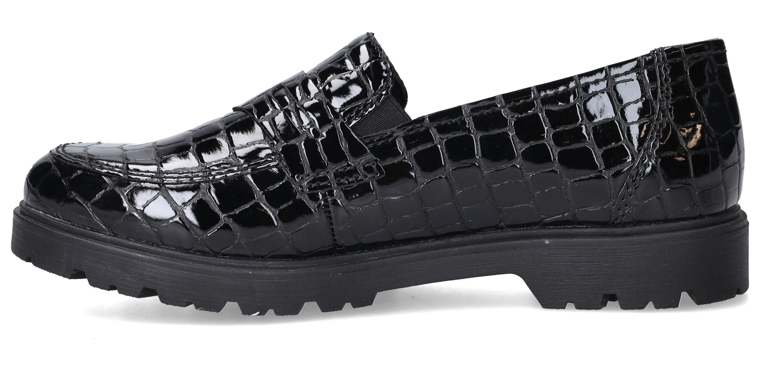 Op zoek naar een elegante instapper die direct opvalt? Deze zwarte loafers van Rieker combineren klasse met comfort. De glanzende krokolook in lak-kunstleer maakt elke outfit stijlvol, of je ze nu draagt naar kantoor of een etentje. Perfect voor dames met een smallere voetbreedte F die niet willen inleveren op modegevoel.