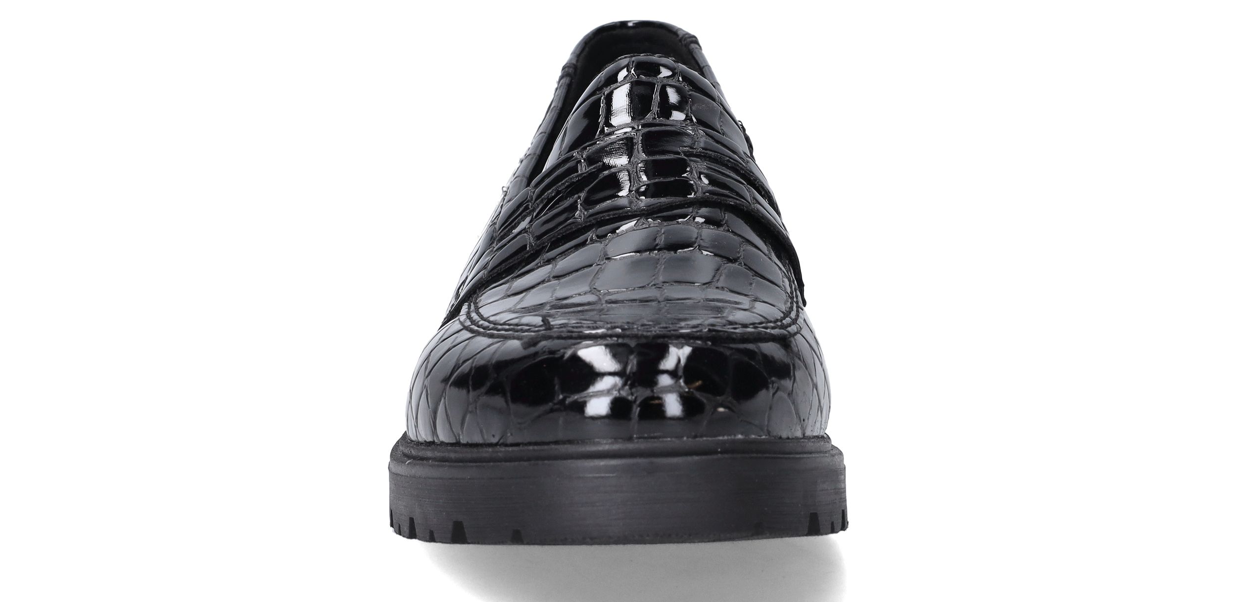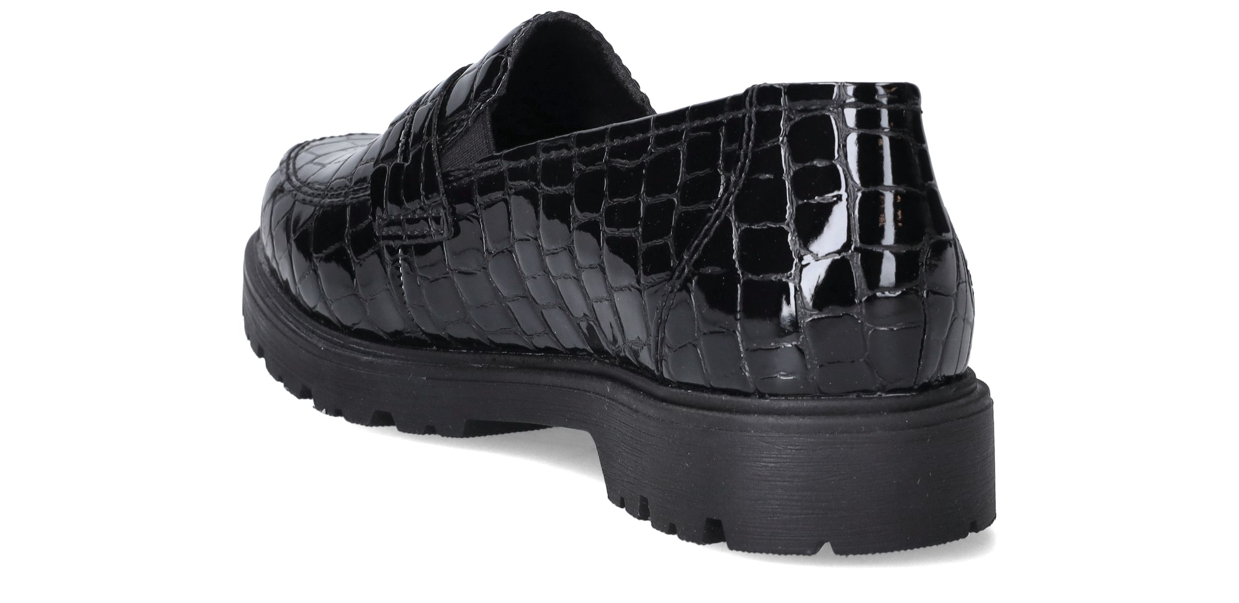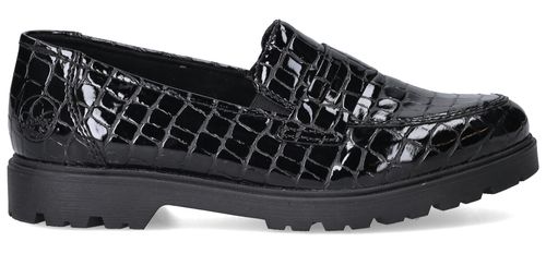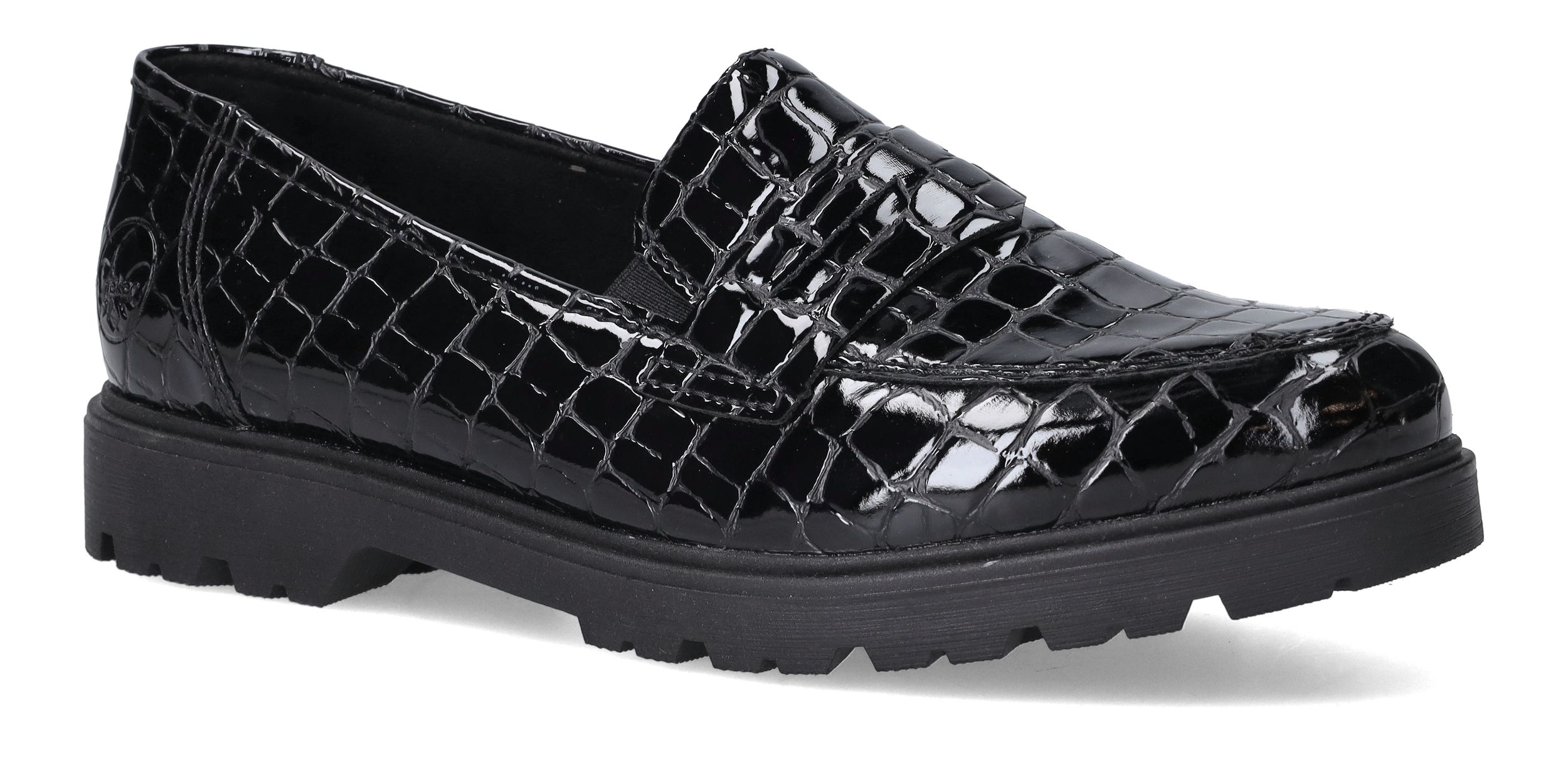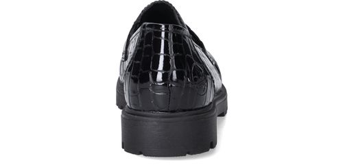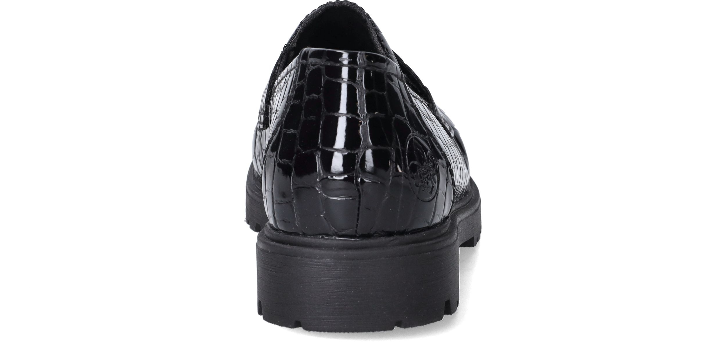 Op zoek naar een elegante instapper die direct opvalt? Deze zwarte loafers van Rieker combineren klasse met comfort. De glanzende krokolook in lak-kunstleer maakt elke outfit stijlvol, of je ze nu draagt naar kantoor of een etentje. Perfect voor dames met een smallere voetbreedte F die niet willen inleveren op modegevoel.