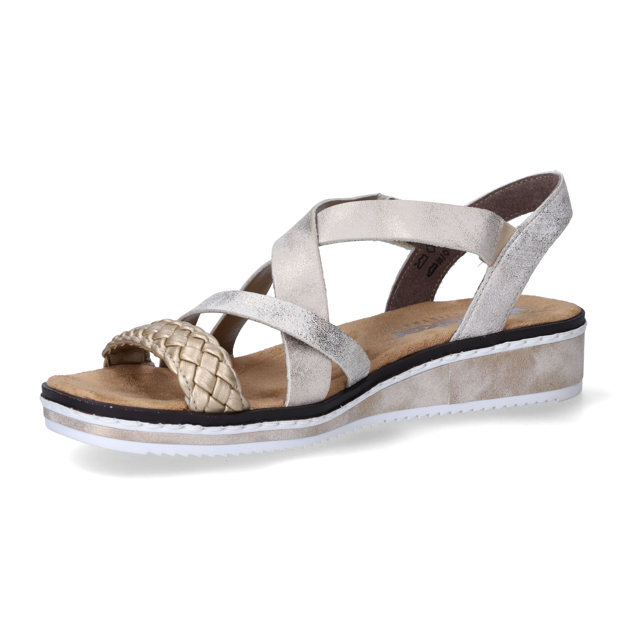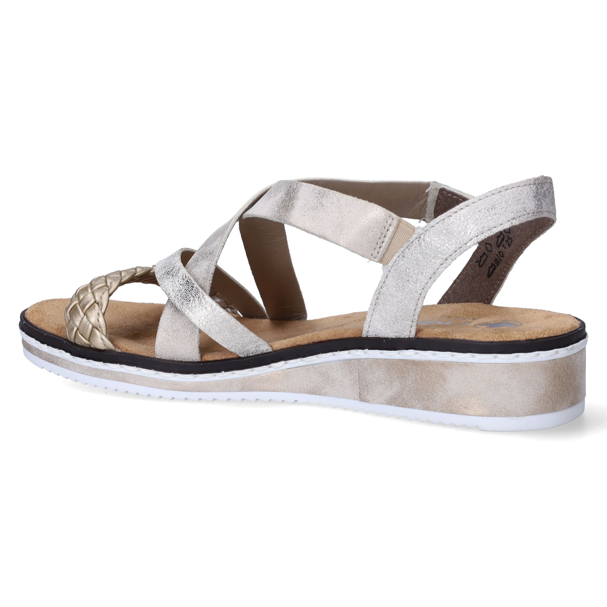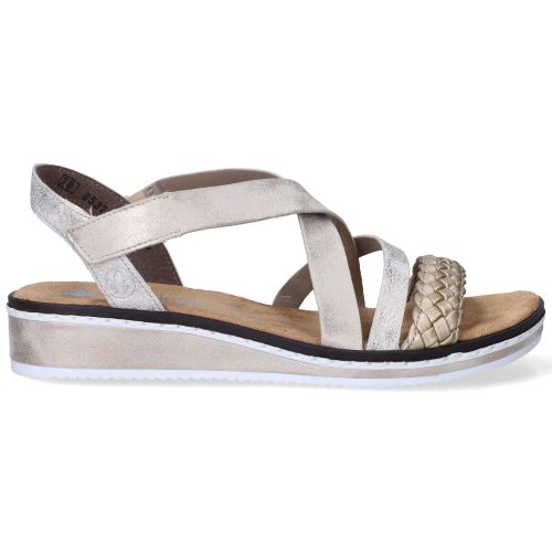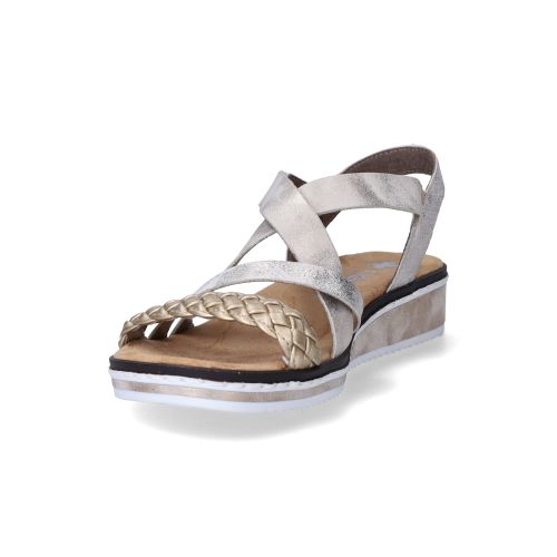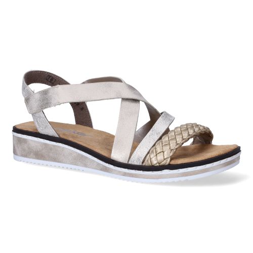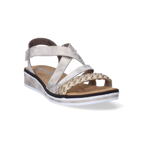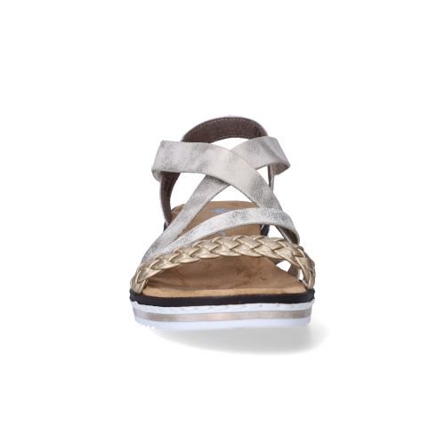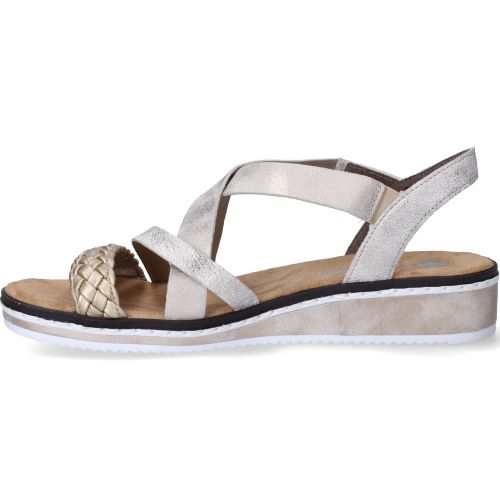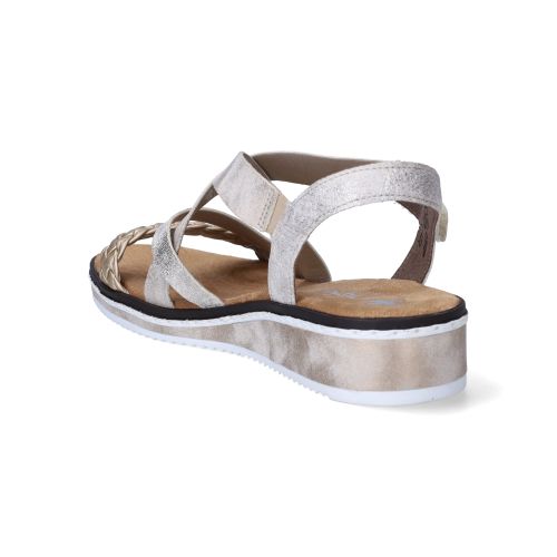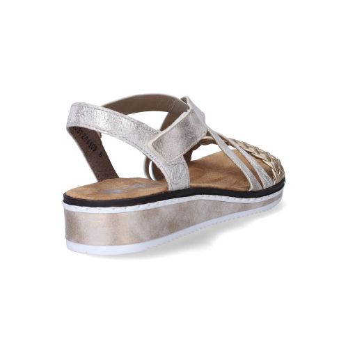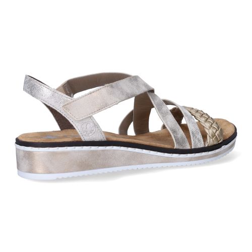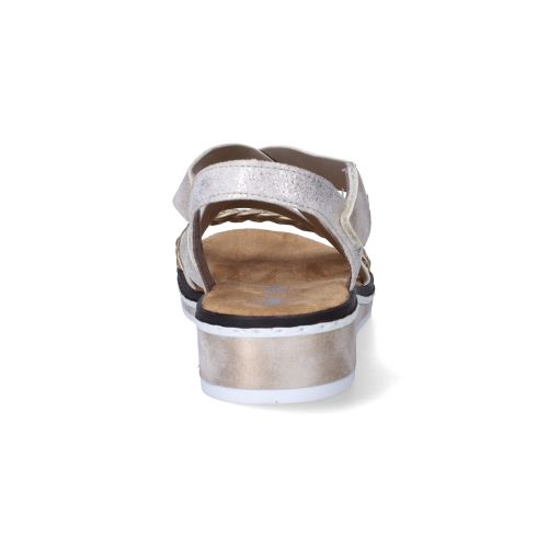 De gouden dames sandalen van Rieker zijn een prachtige aanvulling op elke zomergarderobe. De glanzende gouden kleur geeft deze sandalen een elegante uitstraling, perfect voor zowel een dagje uit als een feestelijke gelegenheid. De schoen is licht en luchtig, waardoor deze comfortabel aanvoelt aan de voet. De soepele materialen zorgen voor een fijne drukverdeling, wat bijdraagt aan een ontspannen loopgevoel gedurende de hele dag.- Deze sandalen zijn gemakkelijk te sluiten en aan te passen aan de voet, voor een stevige en prettige pasvorm.