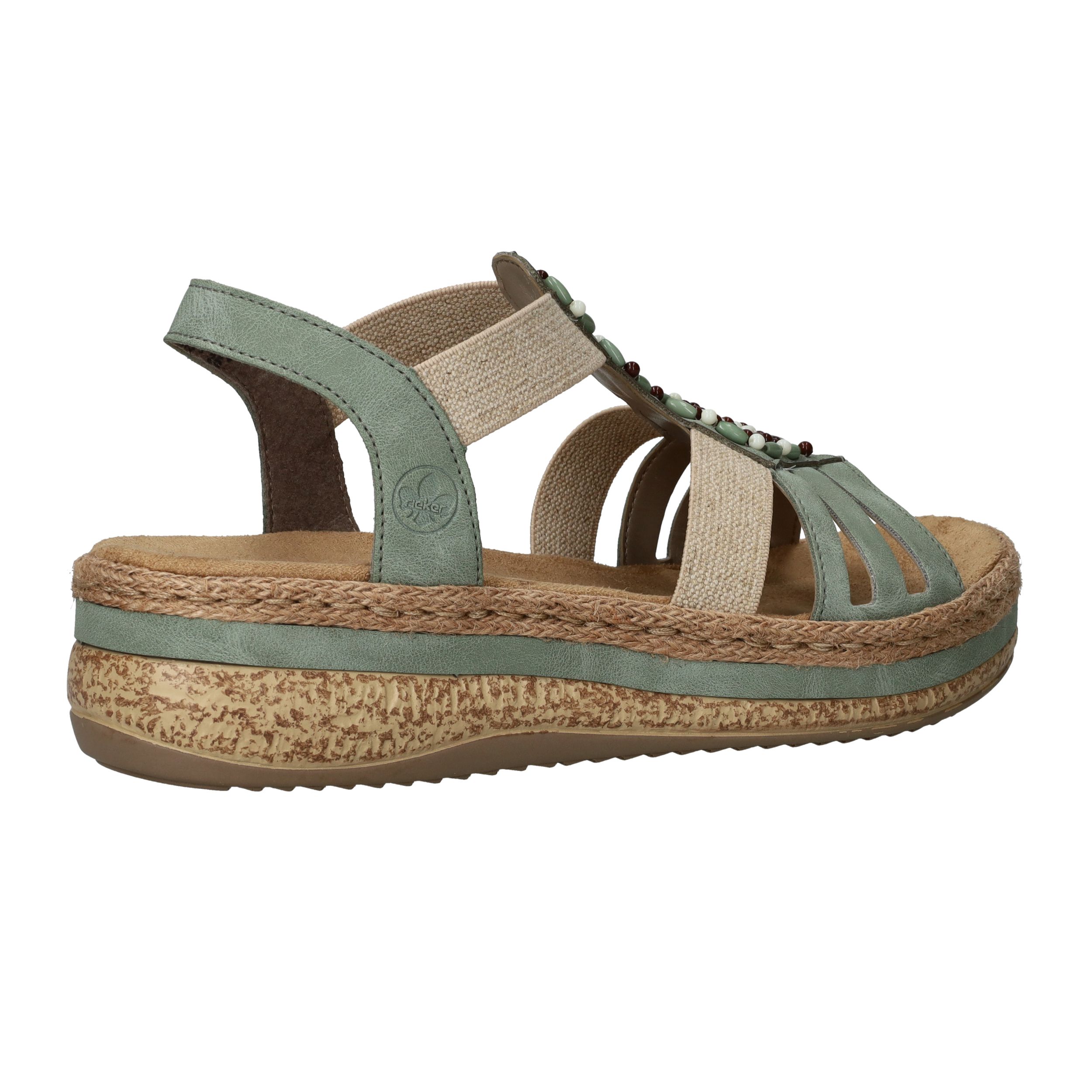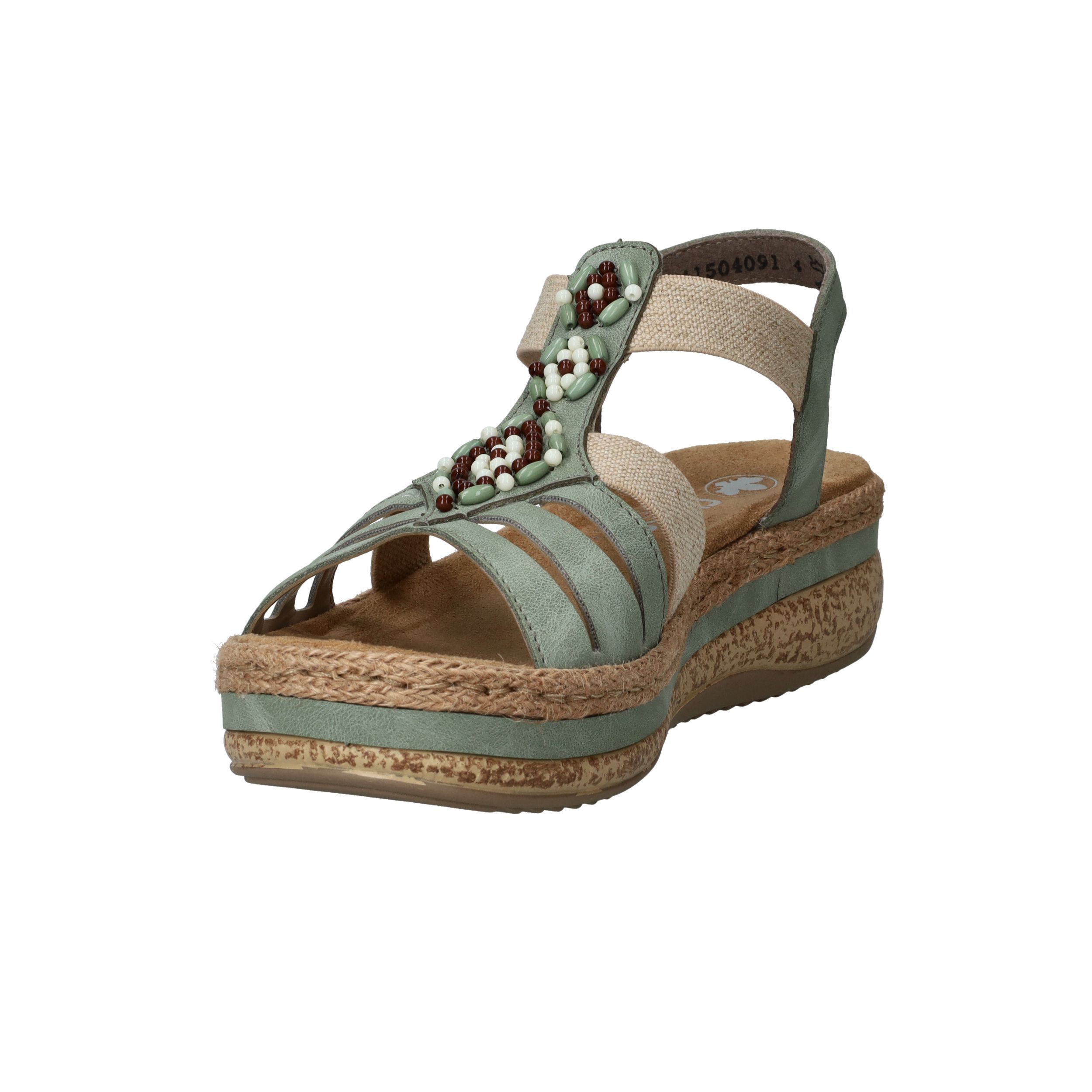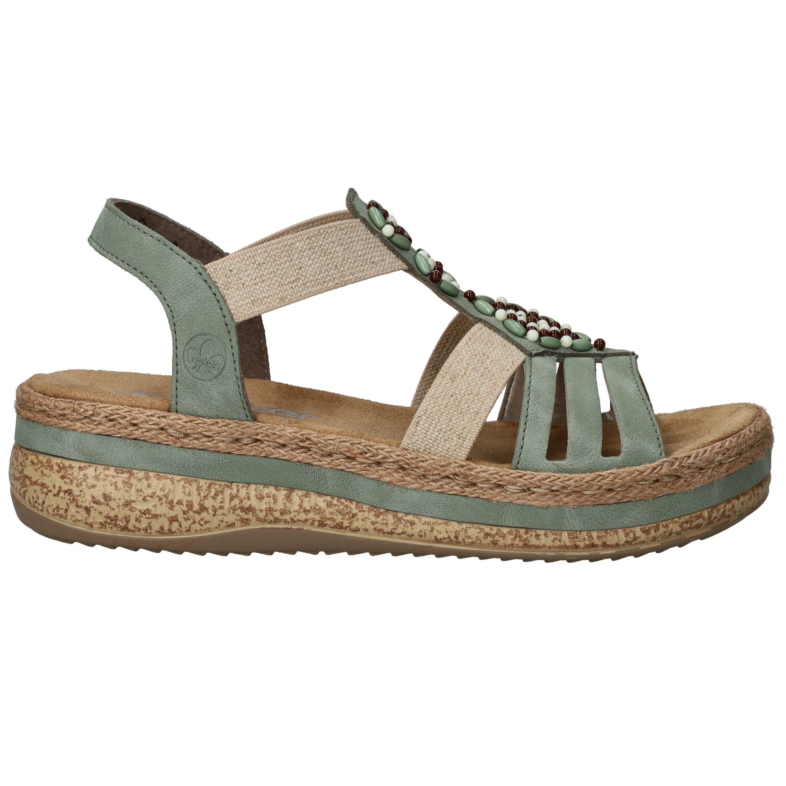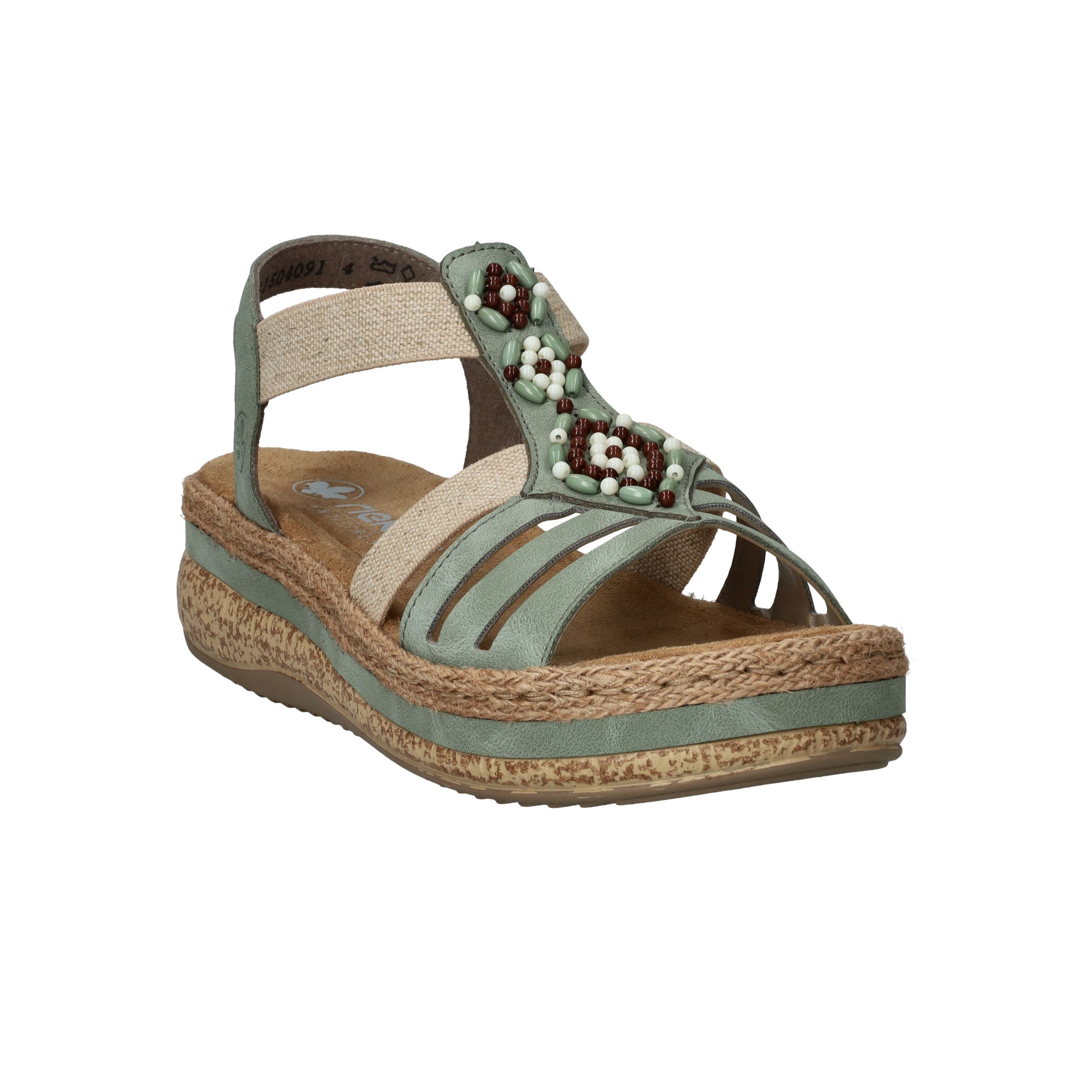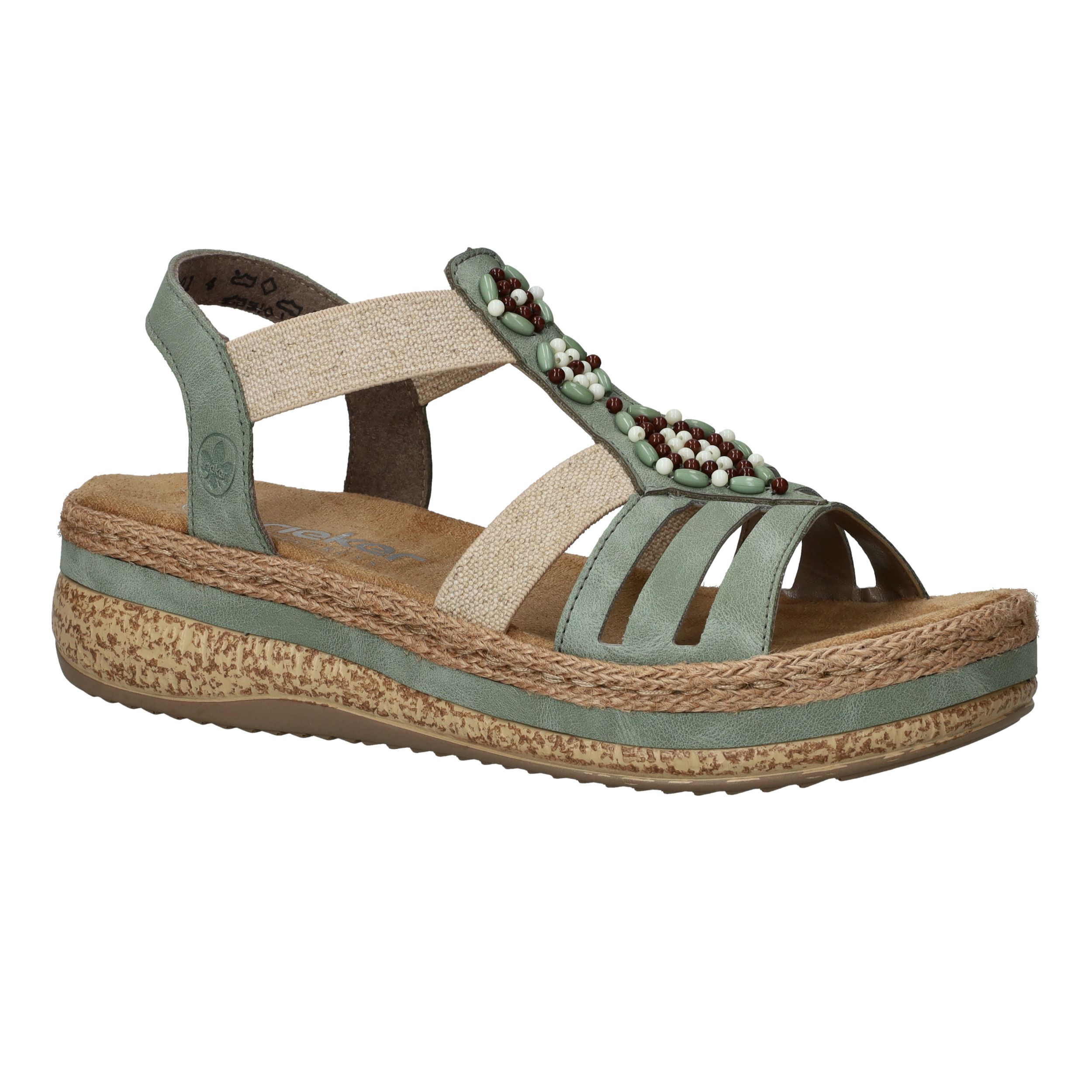 Trendy Rieker sandaal in een zachte mintgroene kleur. Door de kraaltjes krijgt deze damessandaal een zomerse uitstraling.