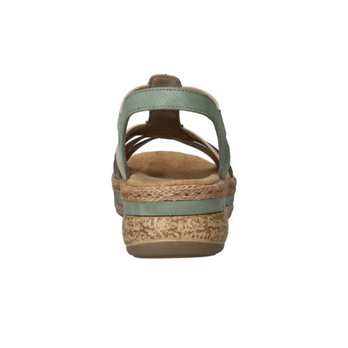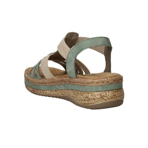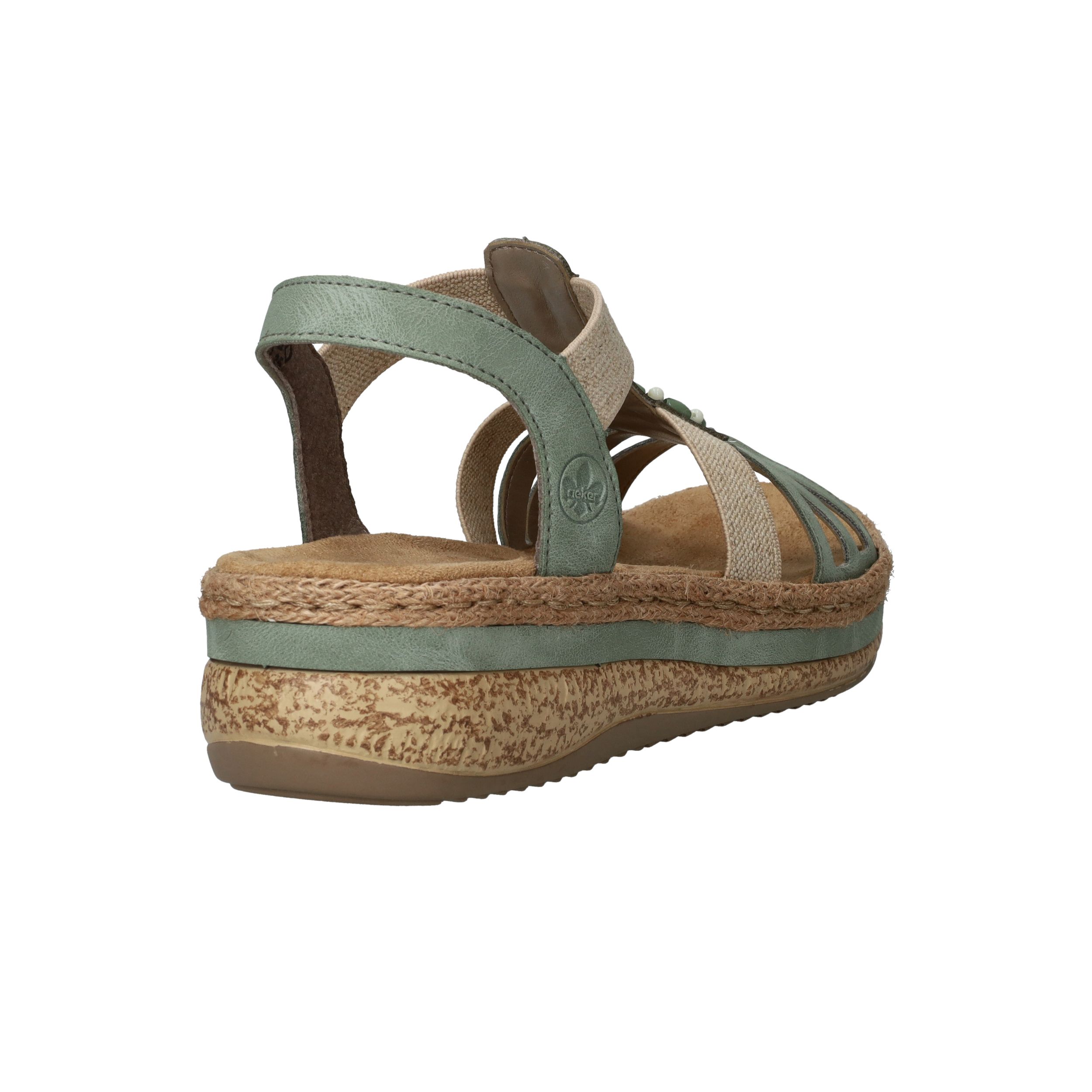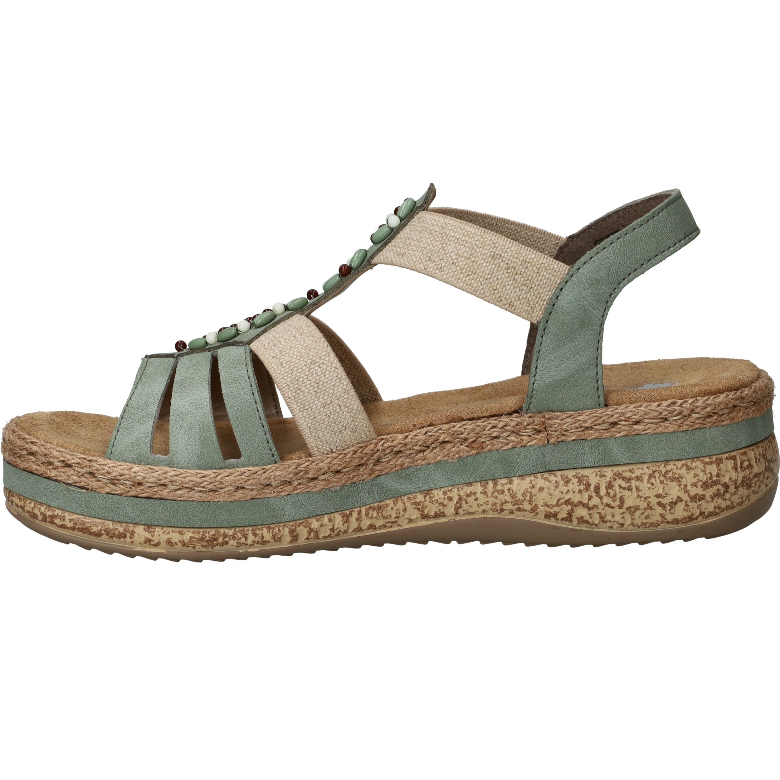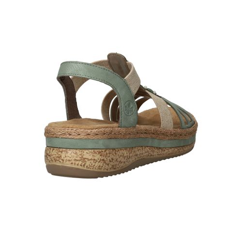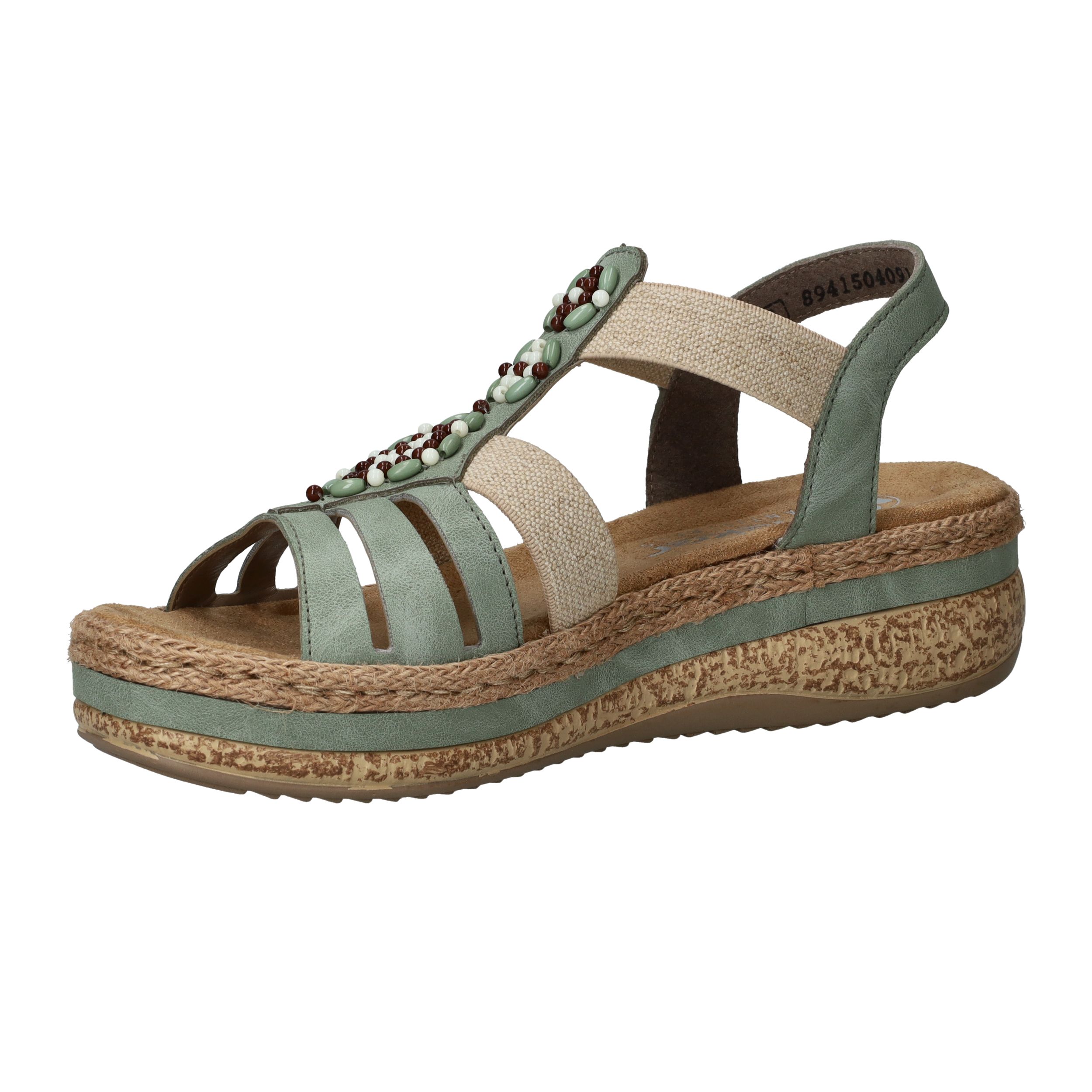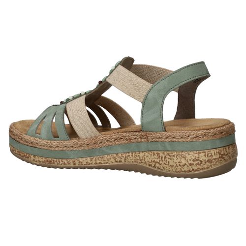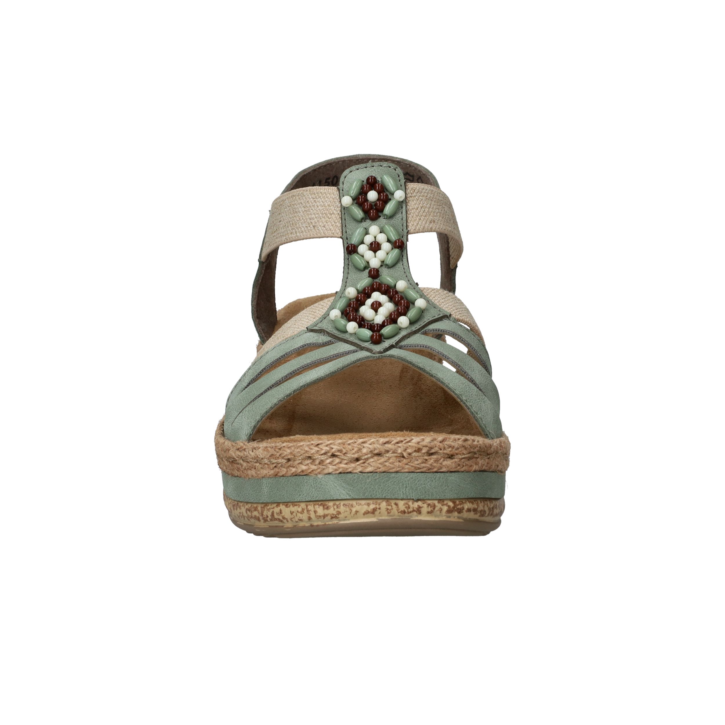 Trendy Rieker sandaal in een zachte mintgroene kleur. Door de kraaltjes krijgt deze damessandaal een zomerse uitstraling.