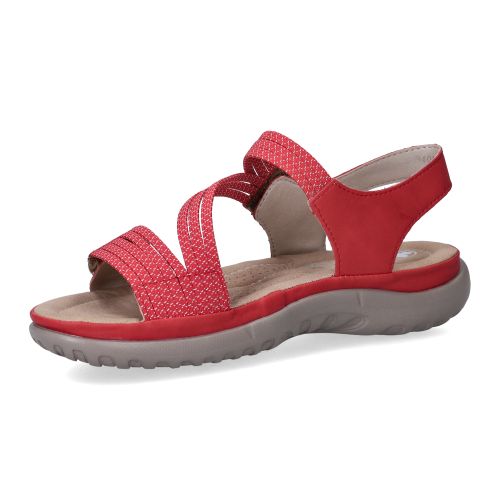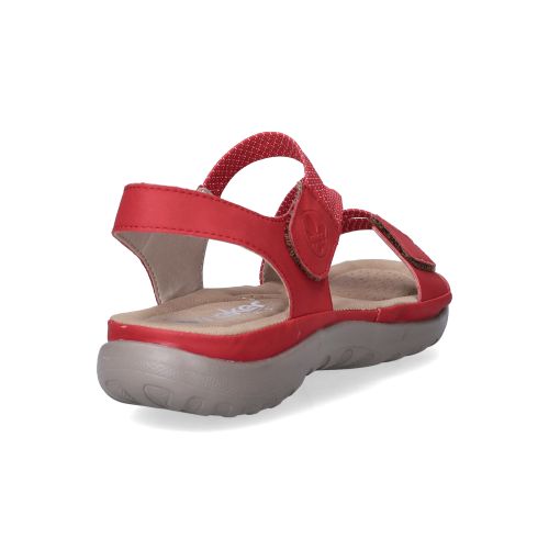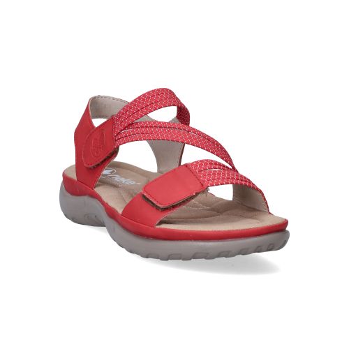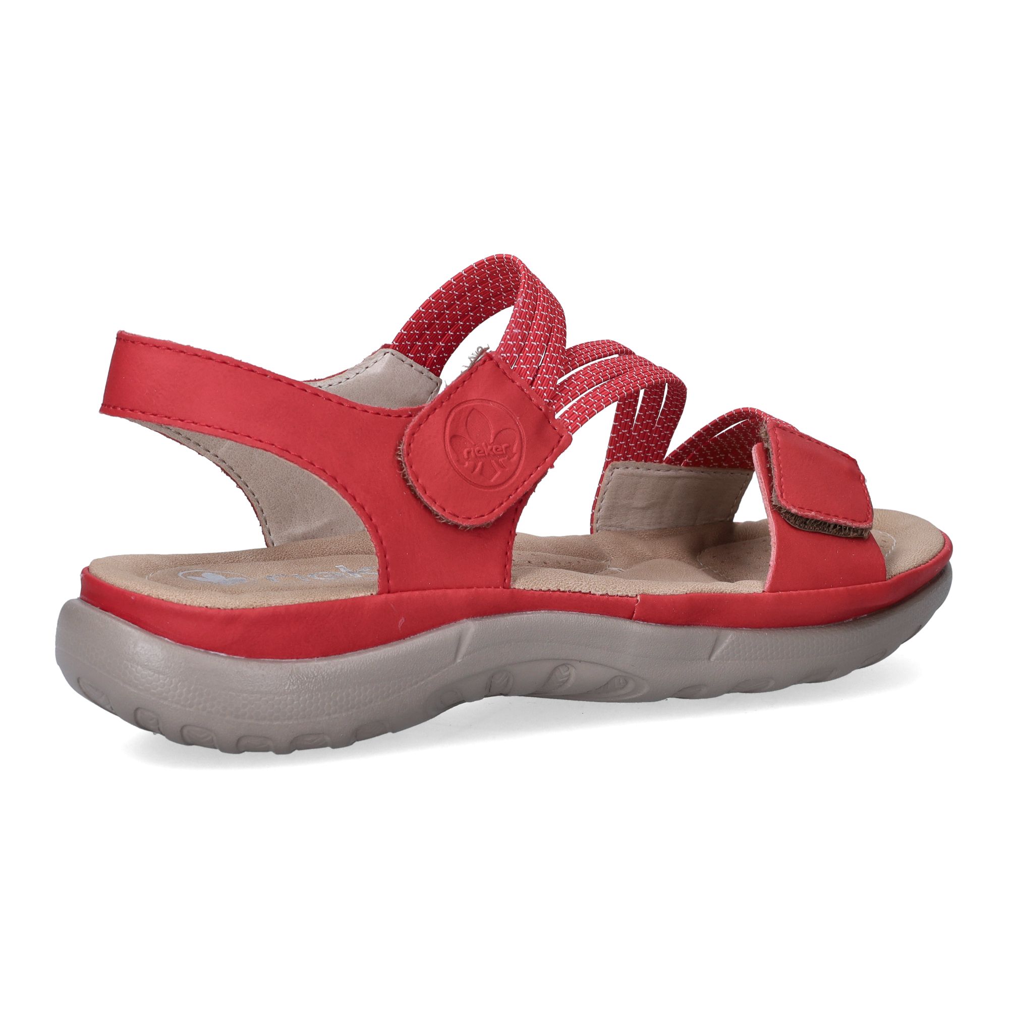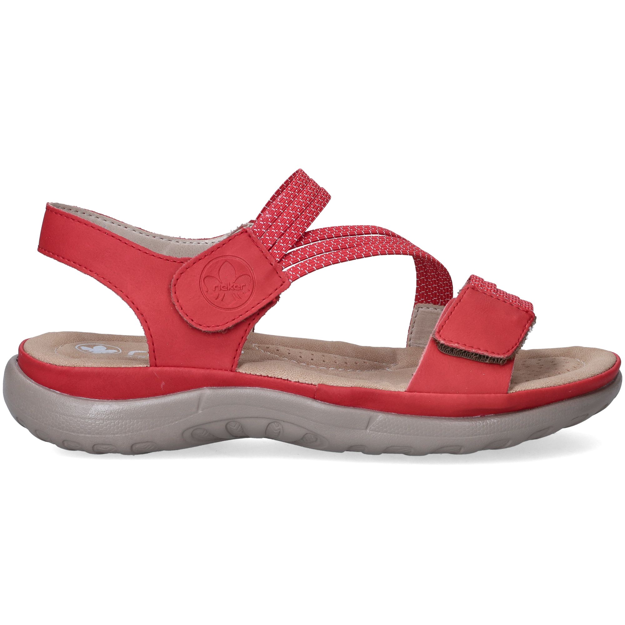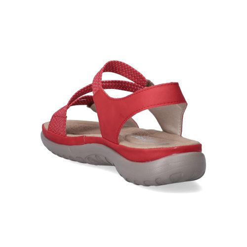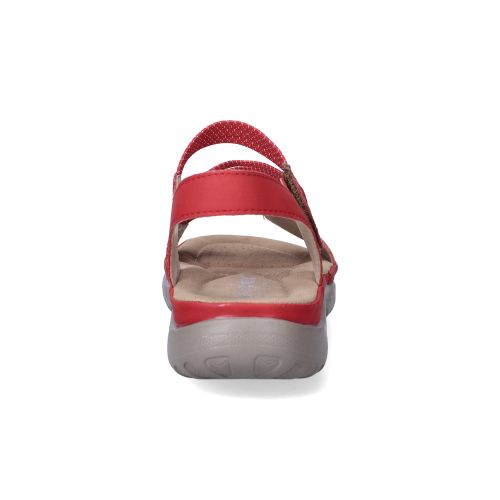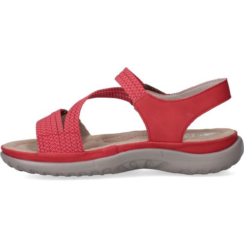 De dames sandalen van Rieker, uitgevoerd in een levendige rode kleur, zijn een prachtige aanvulling voor je zomergarderobe. Deze sandalen combineren een fris uiterlijk met een aangenaam draagcomfort. Het bovenwerk van kunstleer voelt zacht aan en de verschillende bandjes omsluiten de voet op een subtiele manier, waardoor je de hele dag door een stabiel en prettig loopgevoel ervaart. De lichte demping zorgt ervoor dat elke stap comfortabel is en de druk goed verdeeld wordt, ideaal voor een relaxte wandeling of een dagje winkelen.- Deze sandalen sluiten met klittenband, zodat je de pasvorm eenvoudig aanpast aan de breedte van je voet voor optimale ondersteuning.