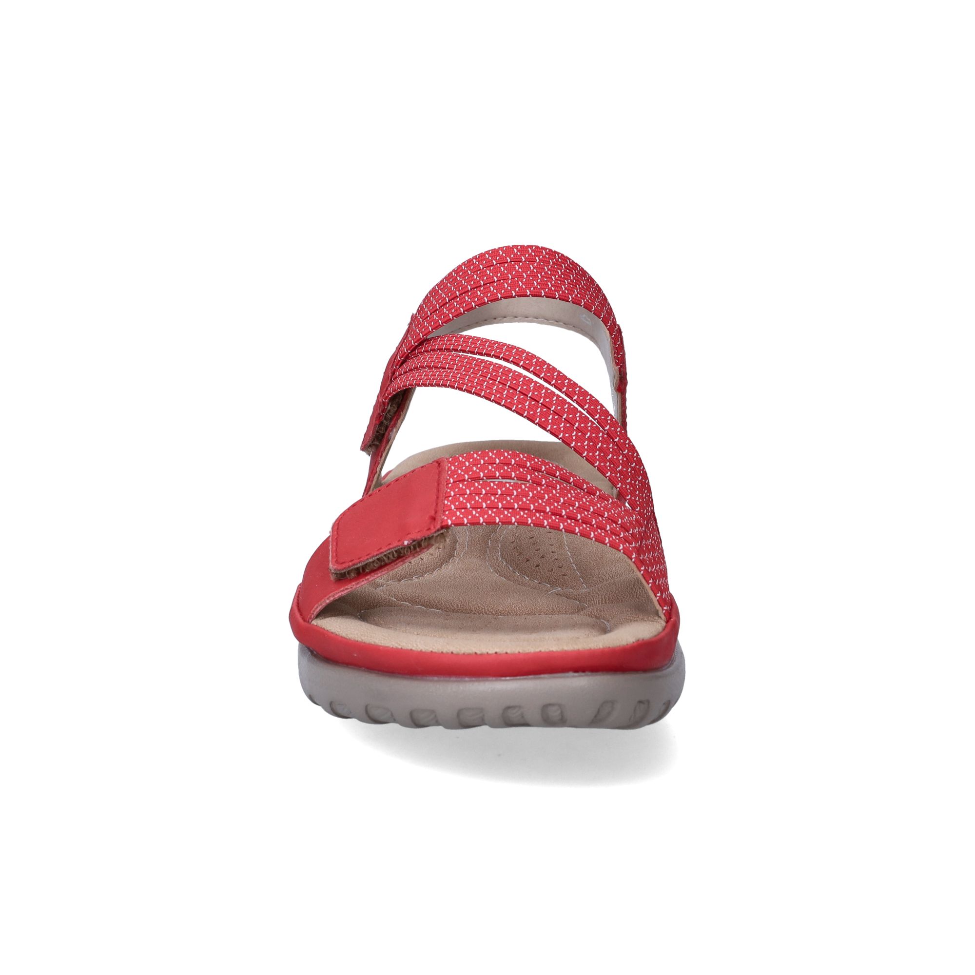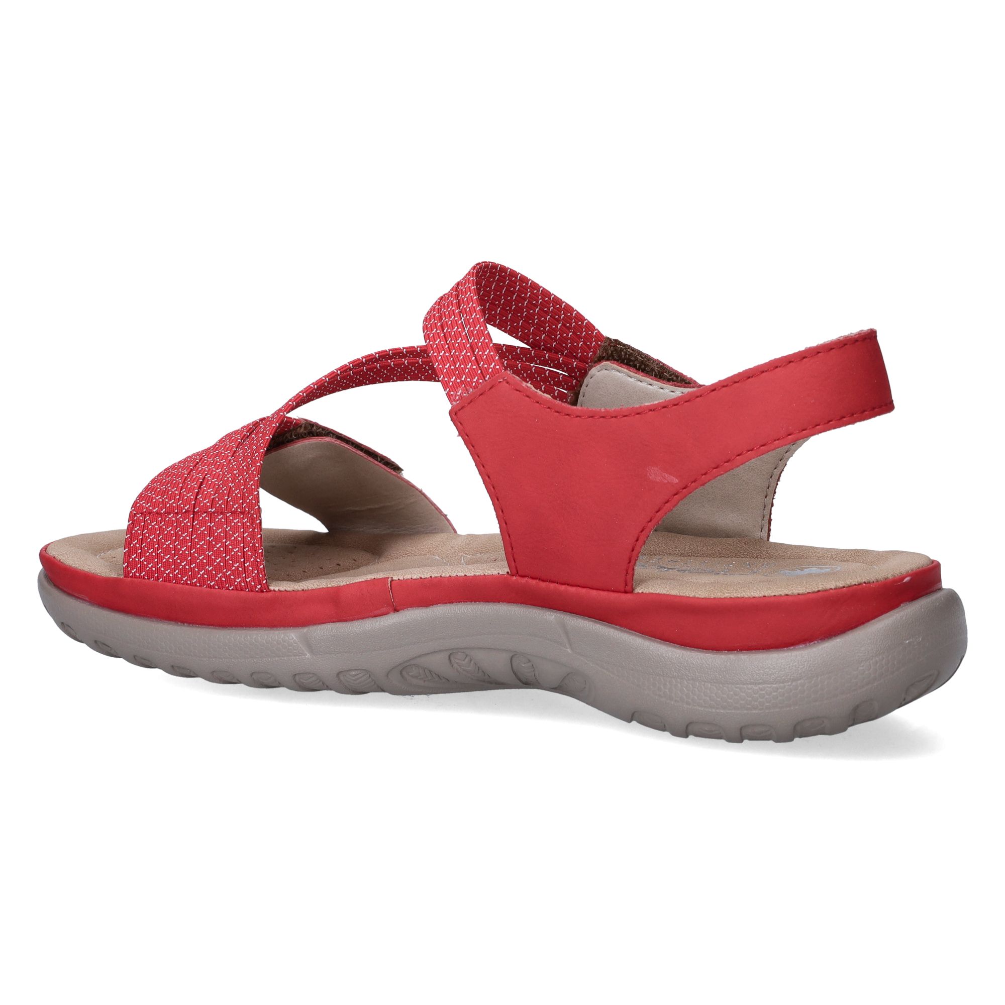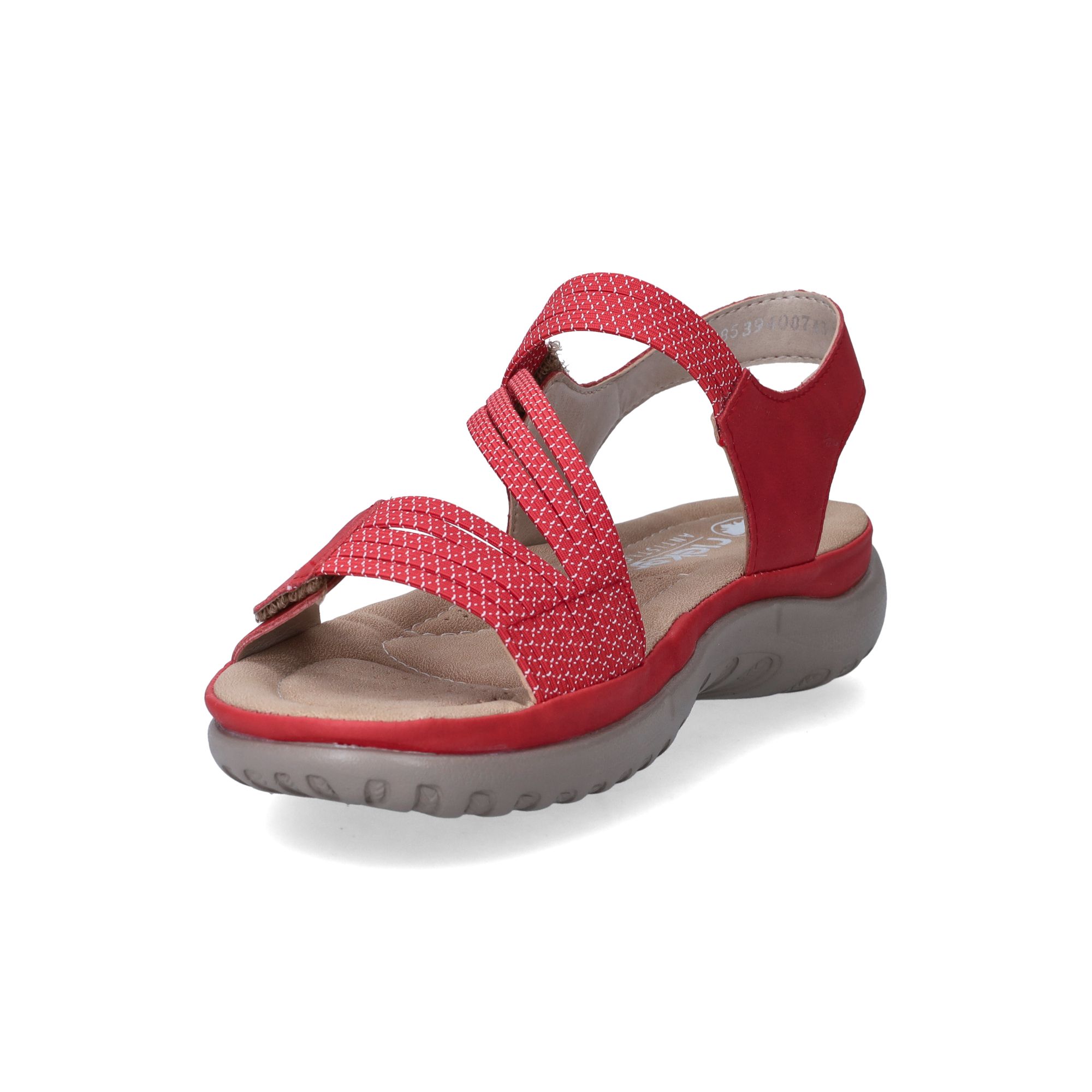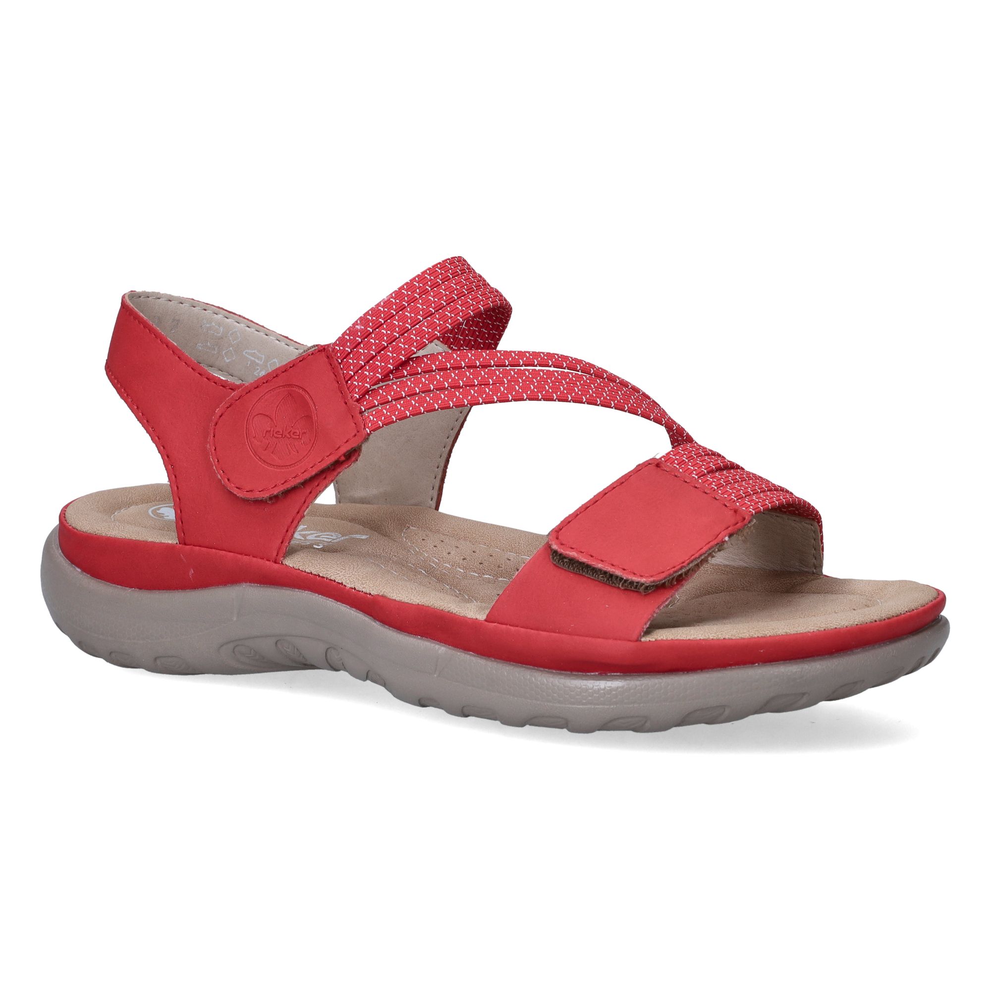 De dames sandalen van Rieker, uitgevoerd in een levendige rode kleur, zijn een prachtige aanvulling voor je zomergarderobe. Deze sandalen combineren een fris uiterlijk met een aangenaam draagcomfort. Het bovenwerk van kunstleer voelt zacht aan en de verschillende bandjes omsluiten de voet op een subtiele manier, waardoor je de hele dag door een stabiel en prettig loopgevoel ervaart. De lichte demping zorgt ervoor dat elke stap comfortabel is en de druk goed verdeeld wordt, ideaal voor een relaxte wandeling of een dagje winkelen.- Deze sandalen sluiten met klittenband, zodat je de pasvorm eenvoudig aanpast aan de breedte van je voet voor optimale ondersteuning.