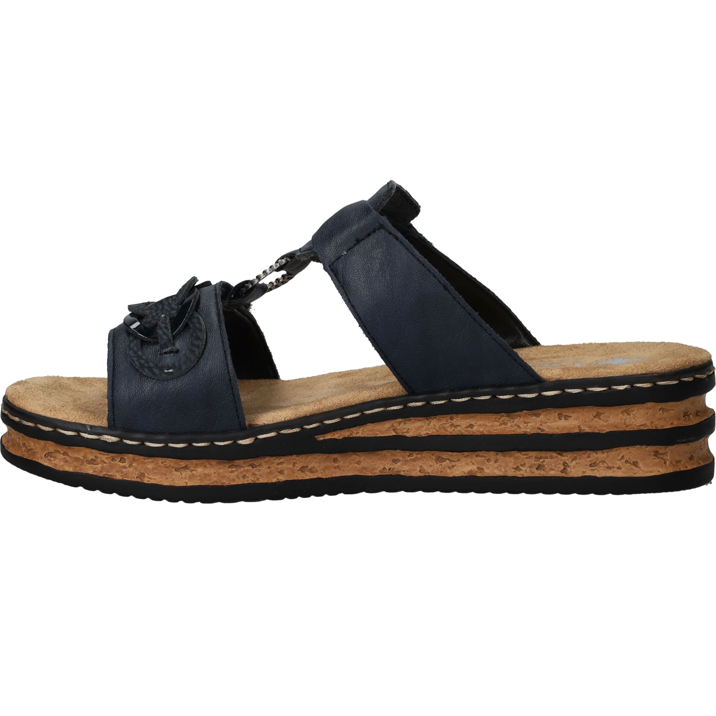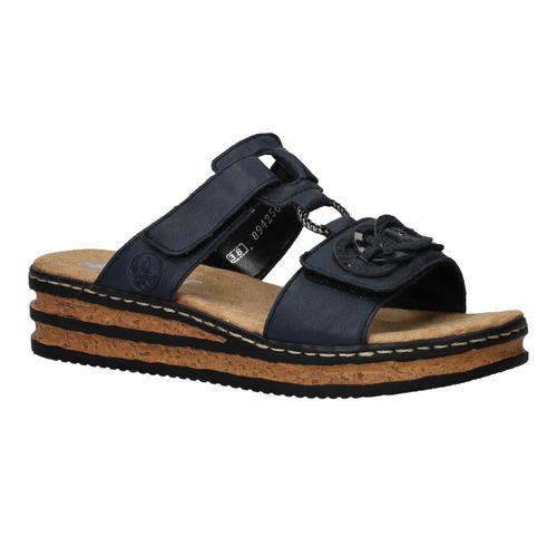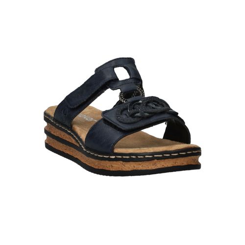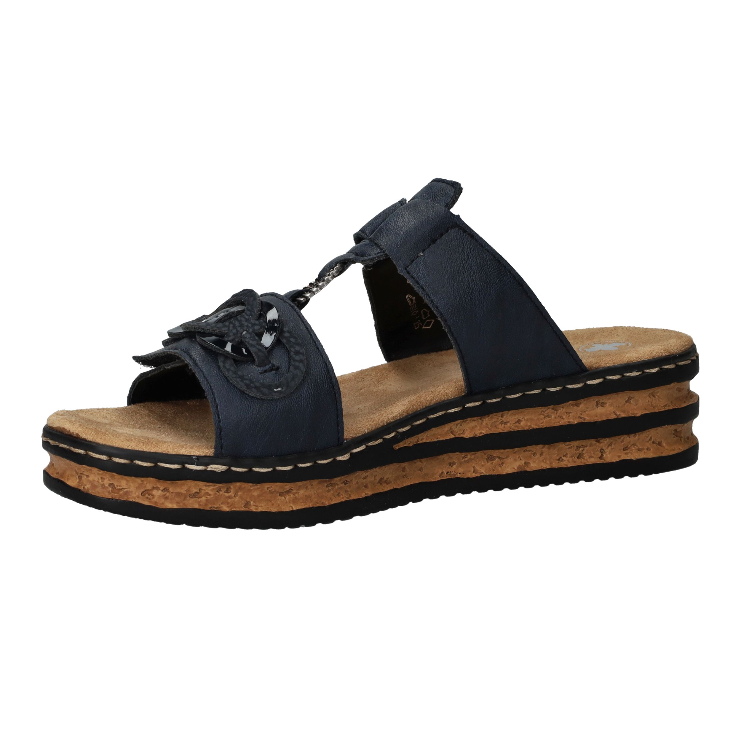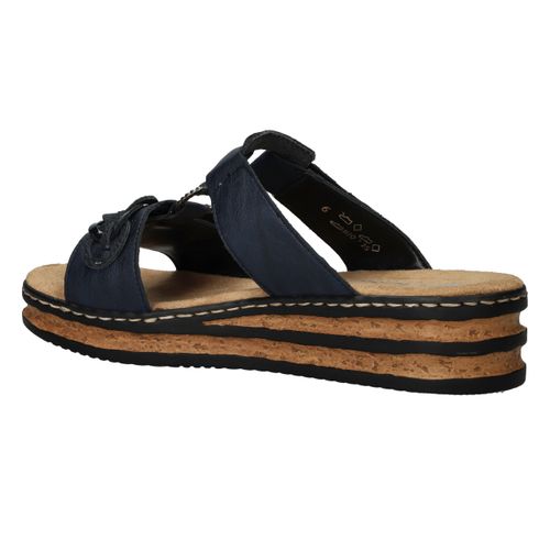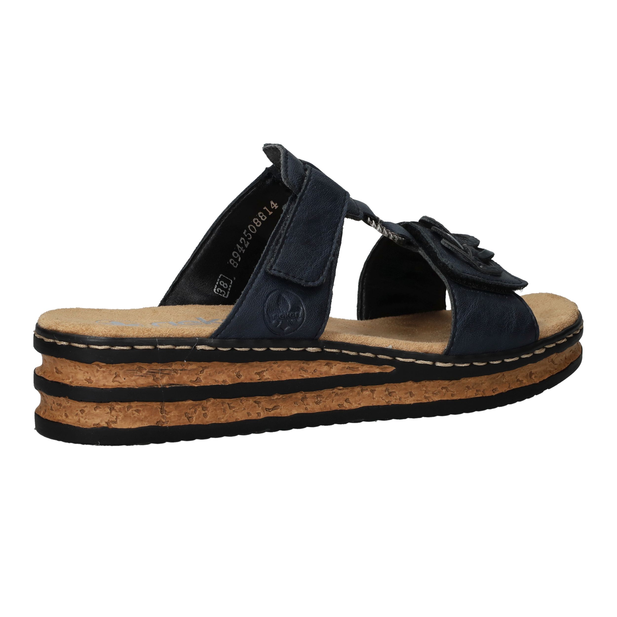 Comfortabele blauwe Rieker slipper voor dames met een speels motief van ringetjes.