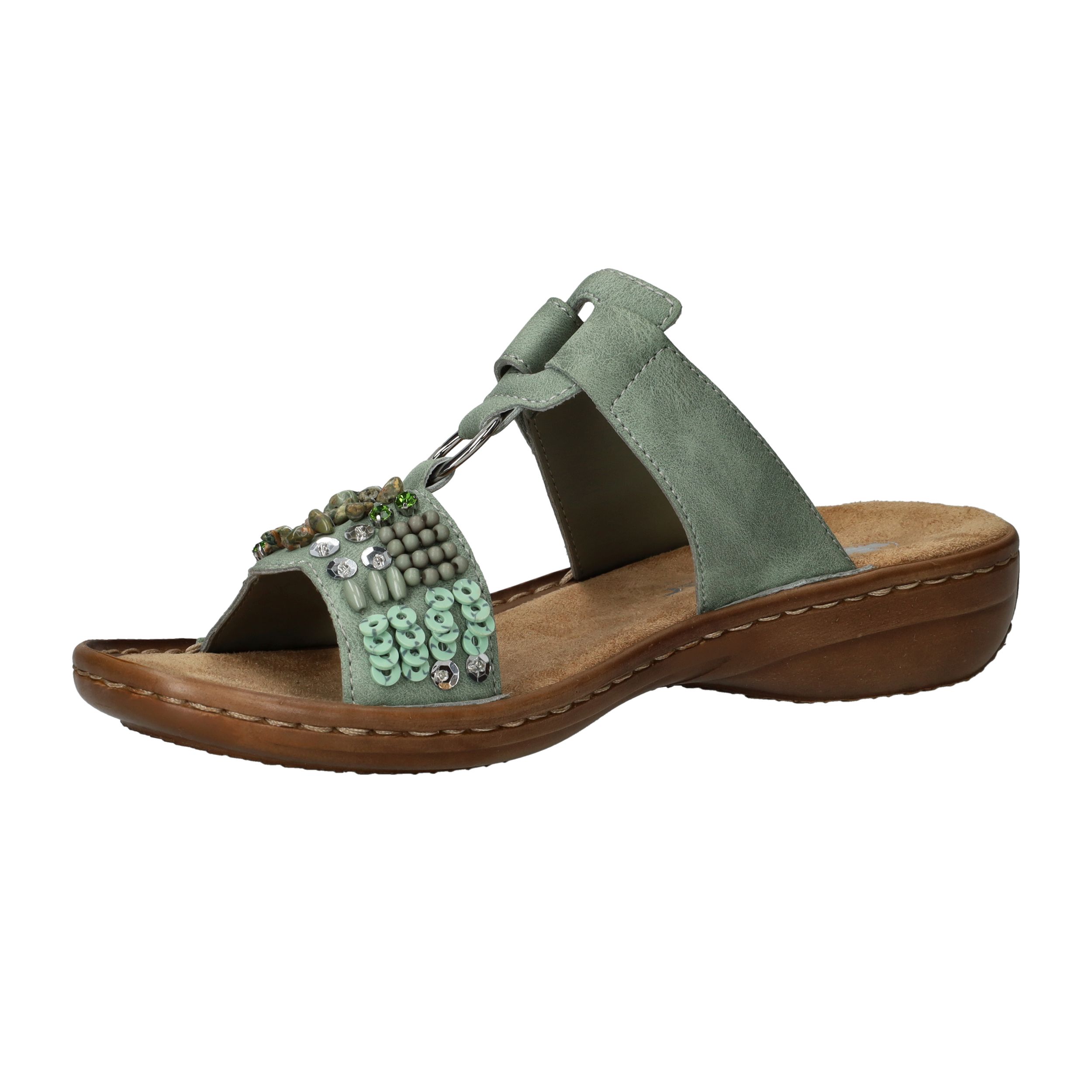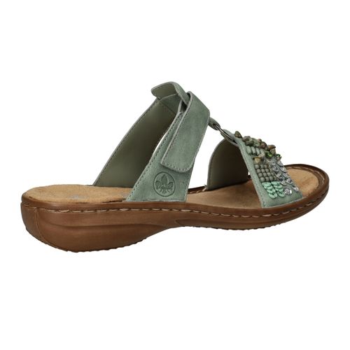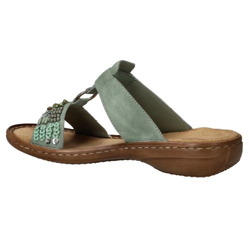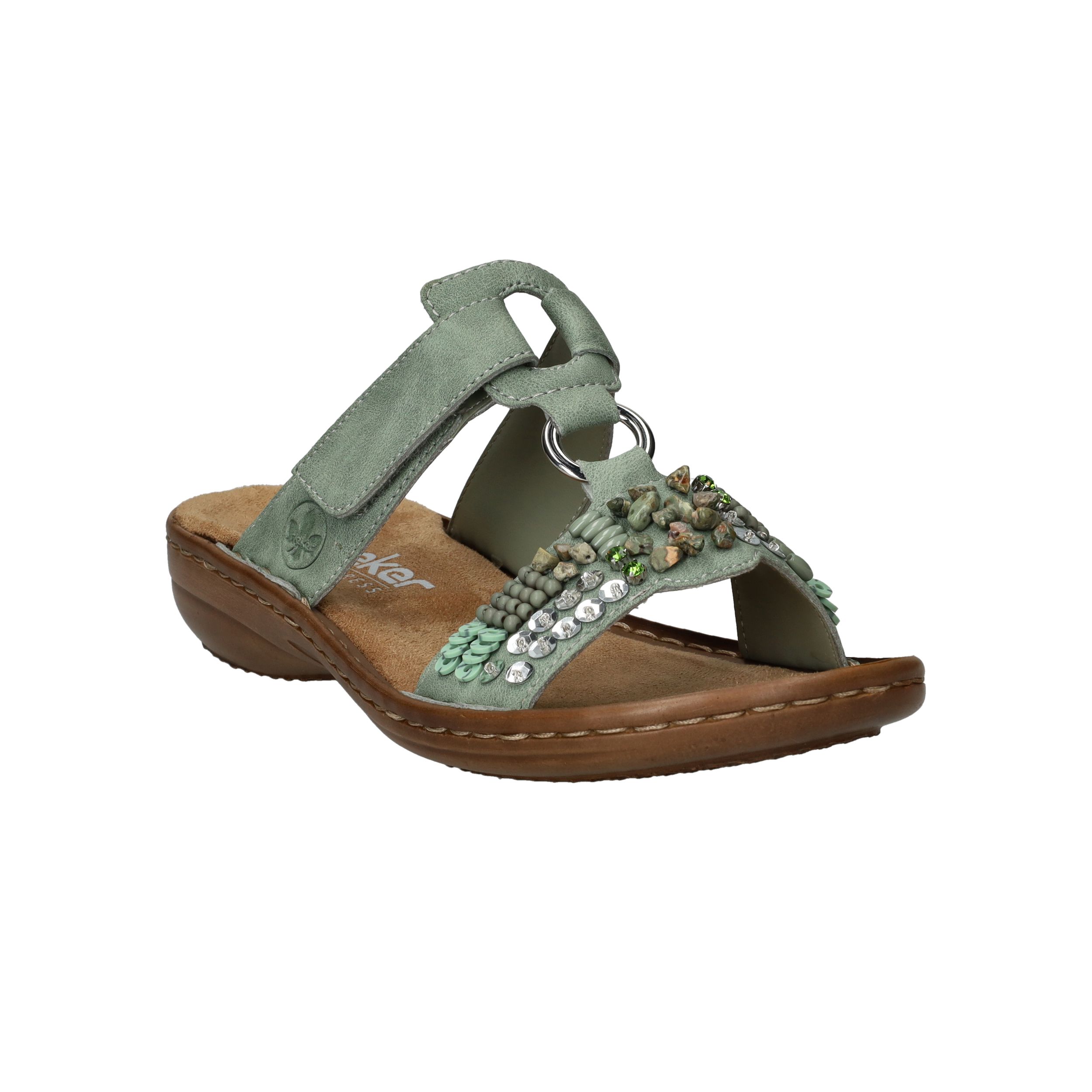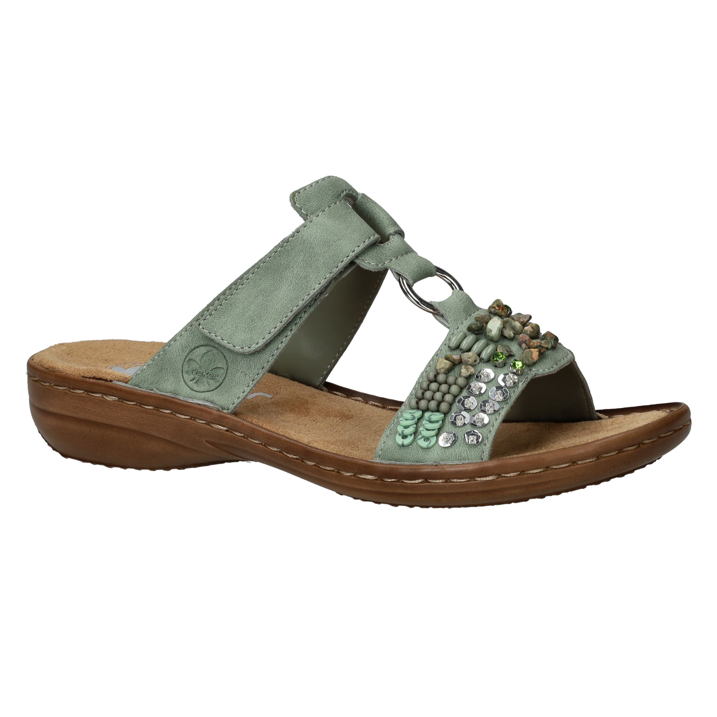 Comfortabele Rieker slipper in een mintgroene kleur. De steentjes geven deze damesslipper een zomerse uitstraling!