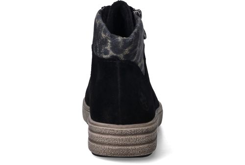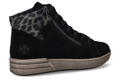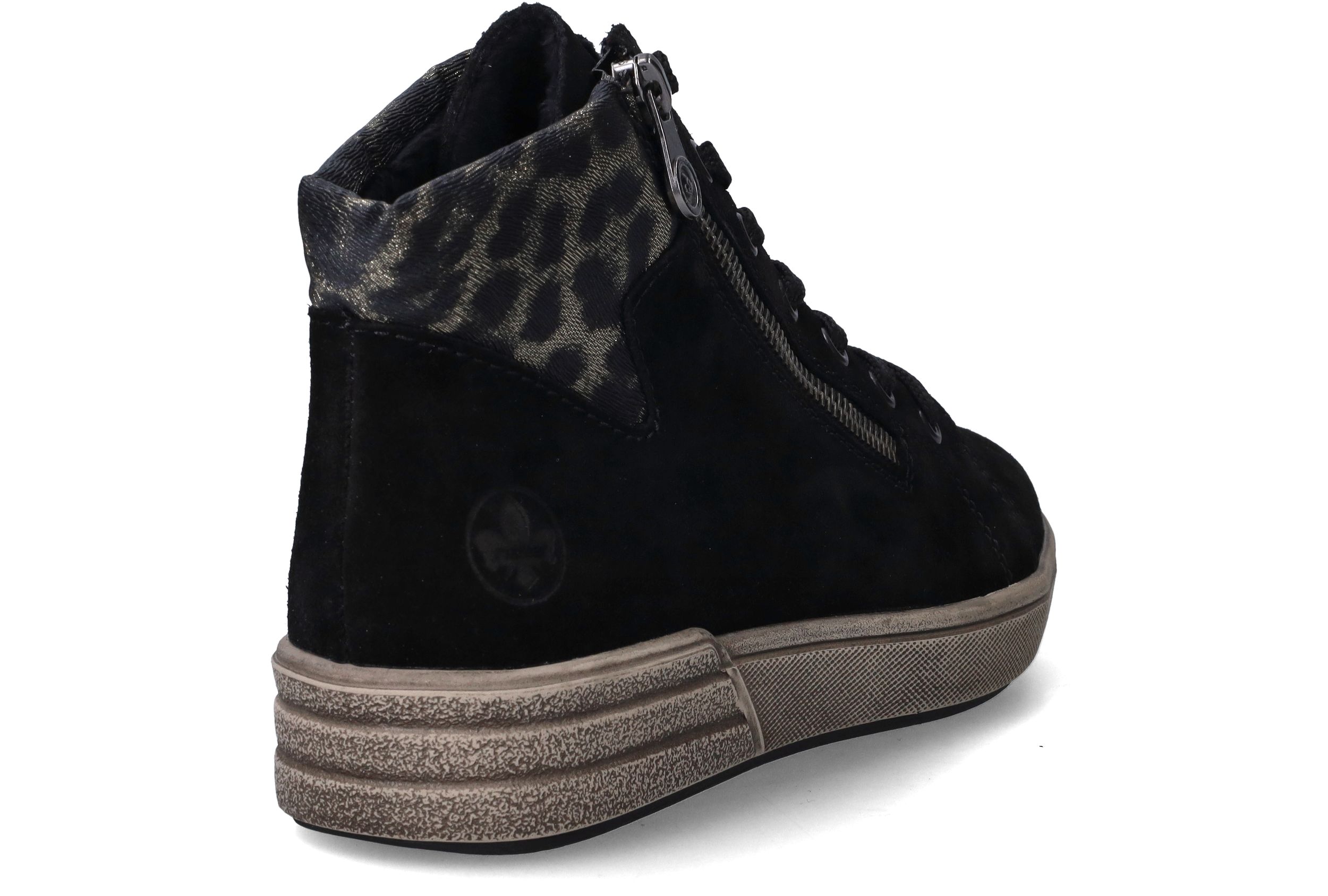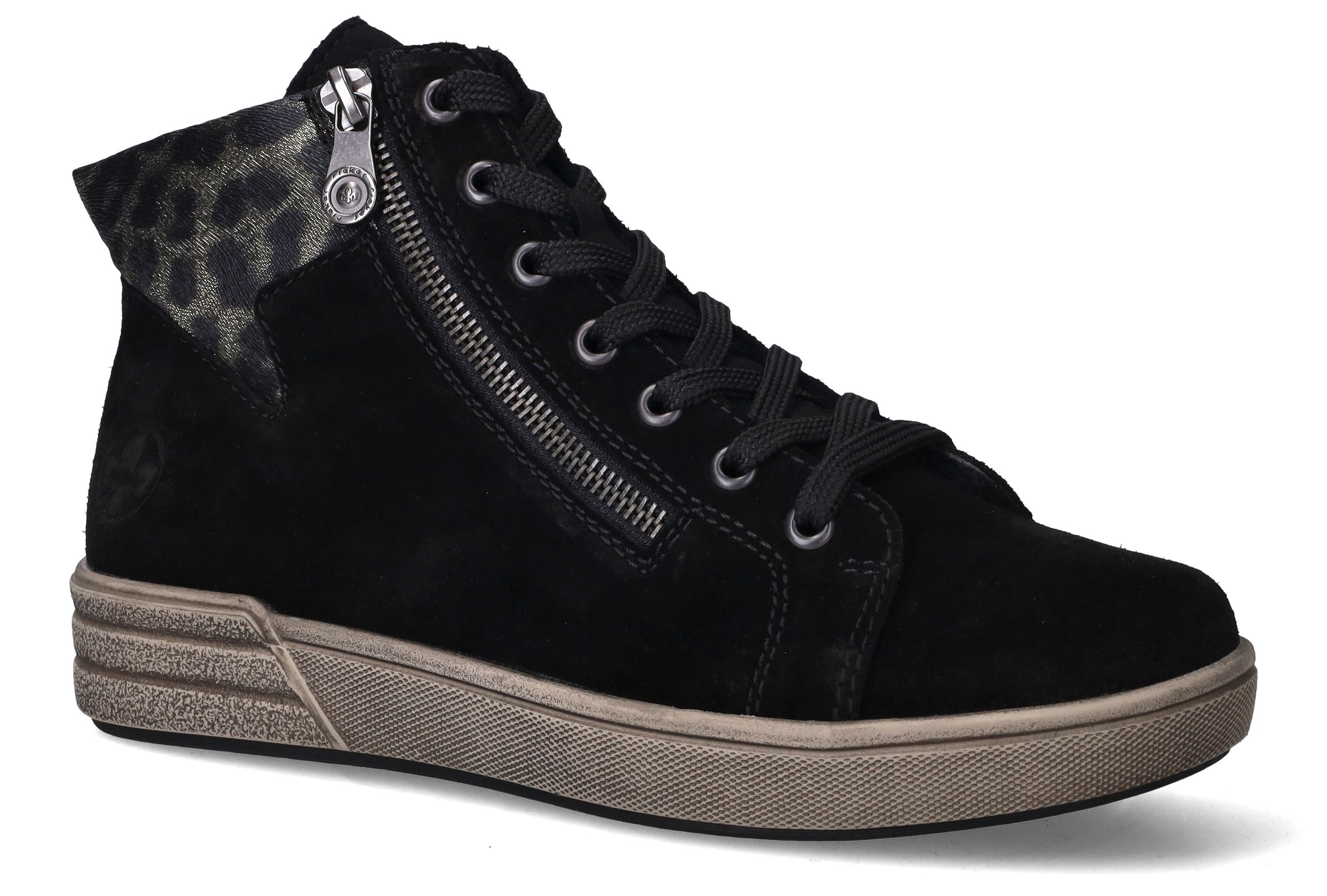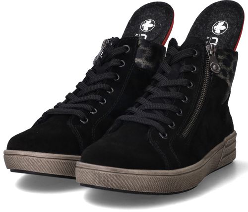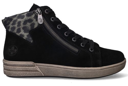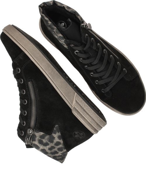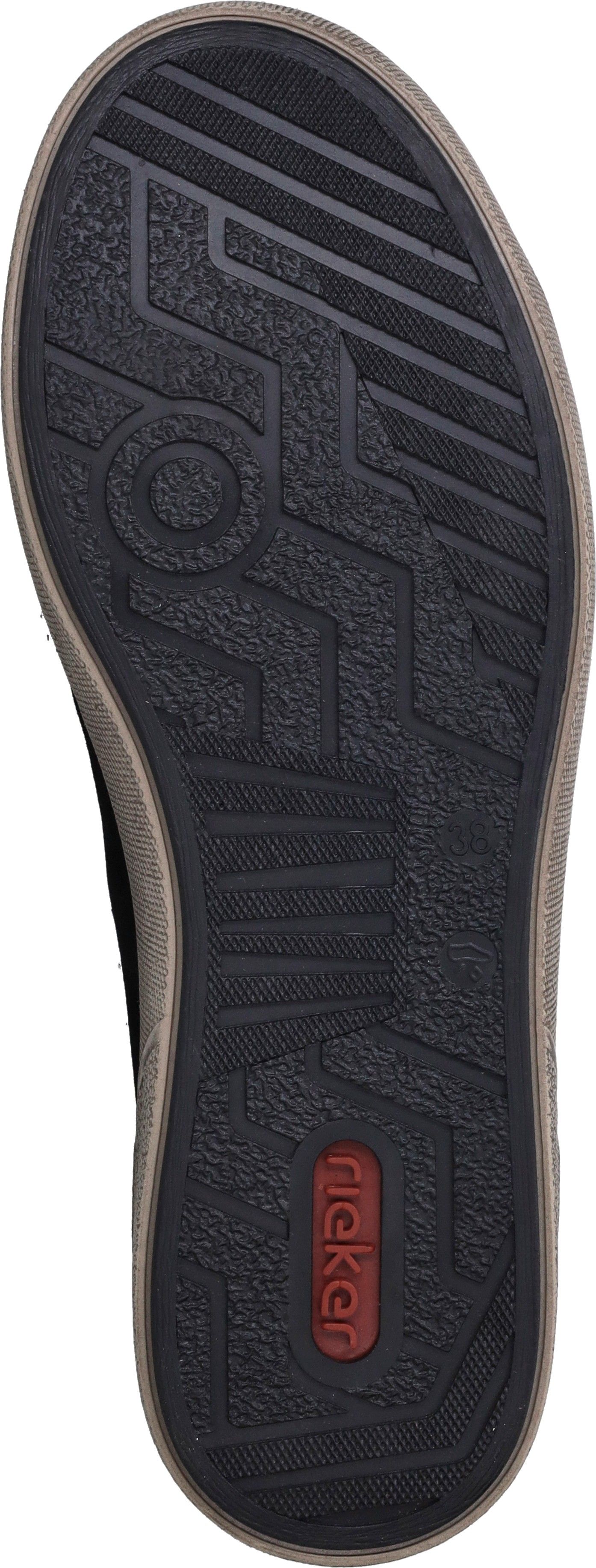 Deze zwarte sneakers van Rieker combineren moeiteloos stijl met comfort. Het suède met subtiele glansdetails en het synthetische materiaal zorgen voor een eigentijdse uitstraling. Dankzij de voetbreedte G sluiten ze mooi aan zonder te knellen. Perfect voor dames die er graag verzorgd uitzien én lekker willen lopen.