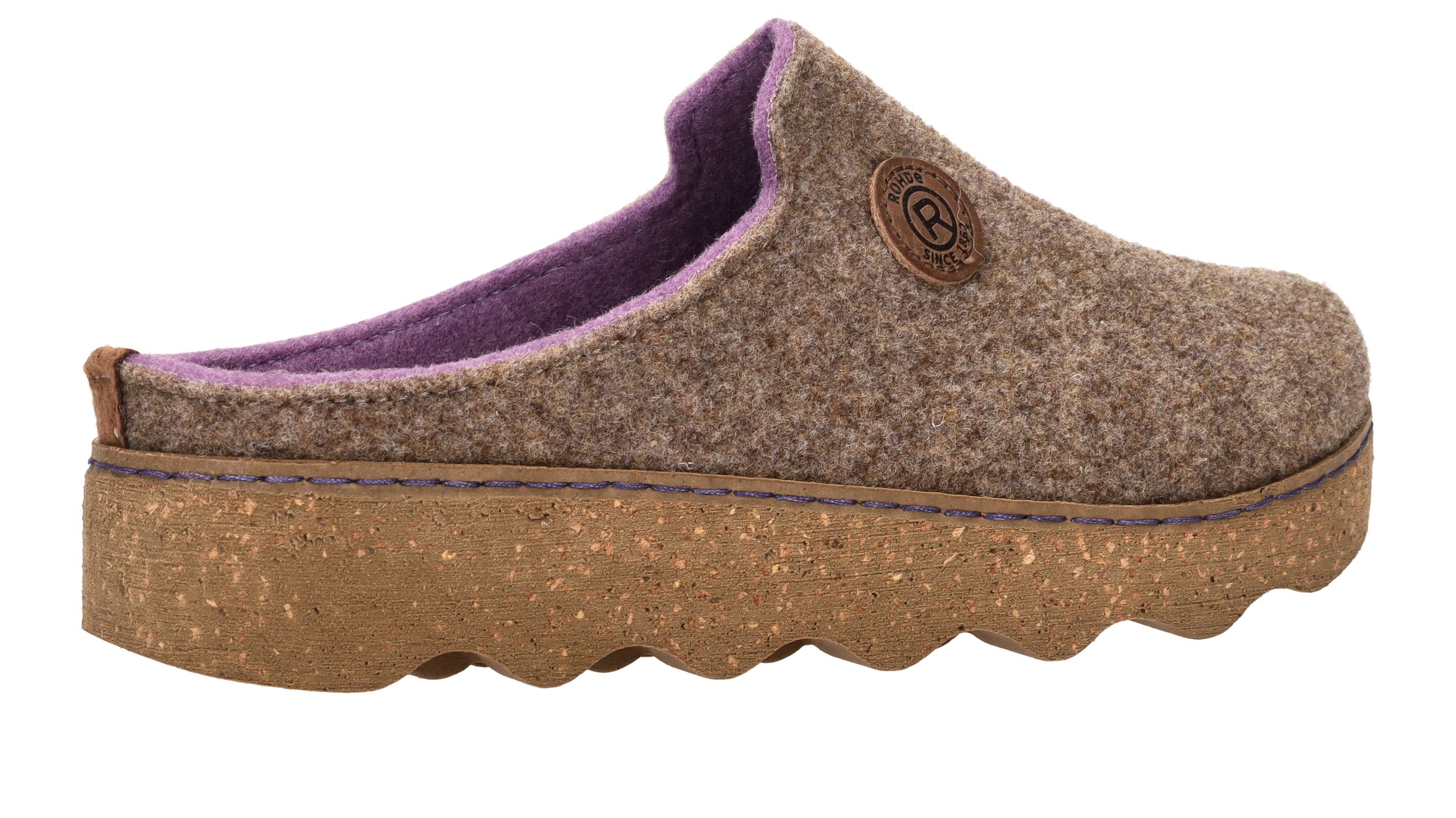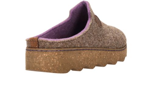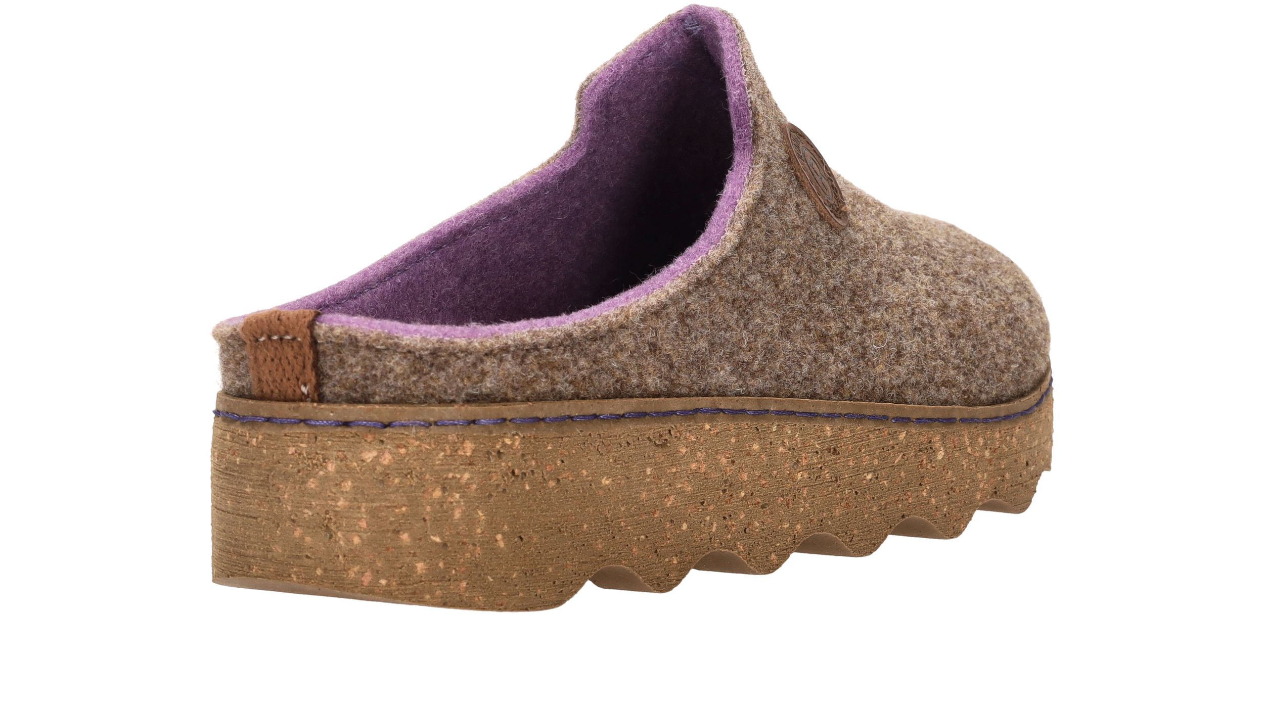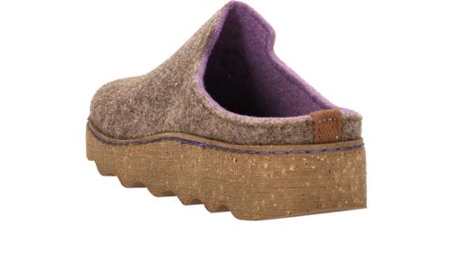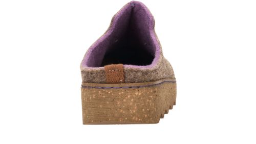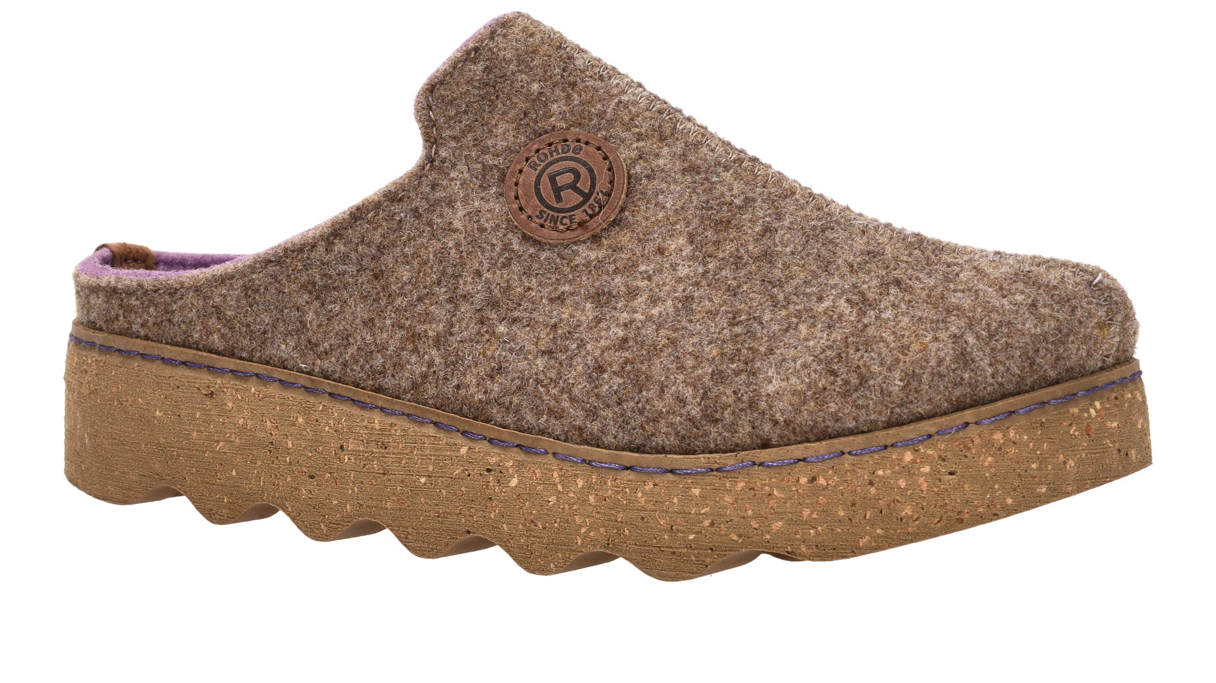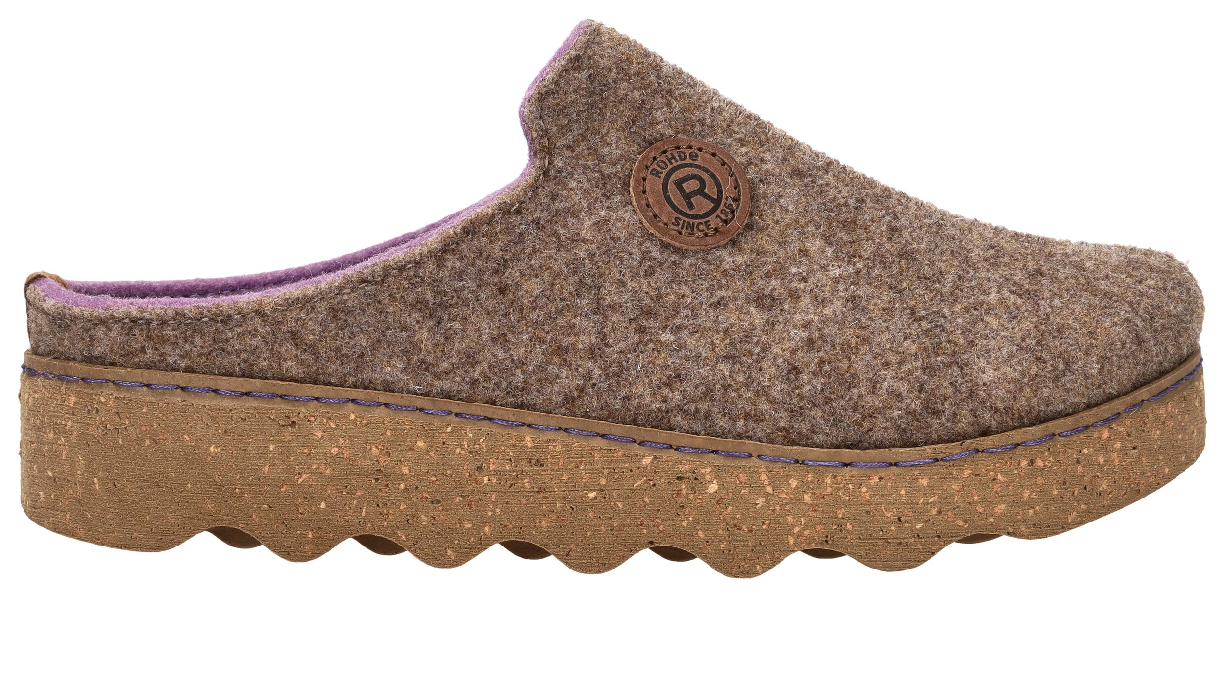 Van deze Rohde muil krijg je blije voeten! De beige pantoffel heeft een vrolijk paarse binnenkant en ook langs de zool zit een paars stiksel.