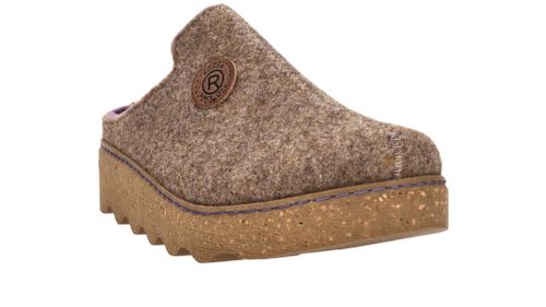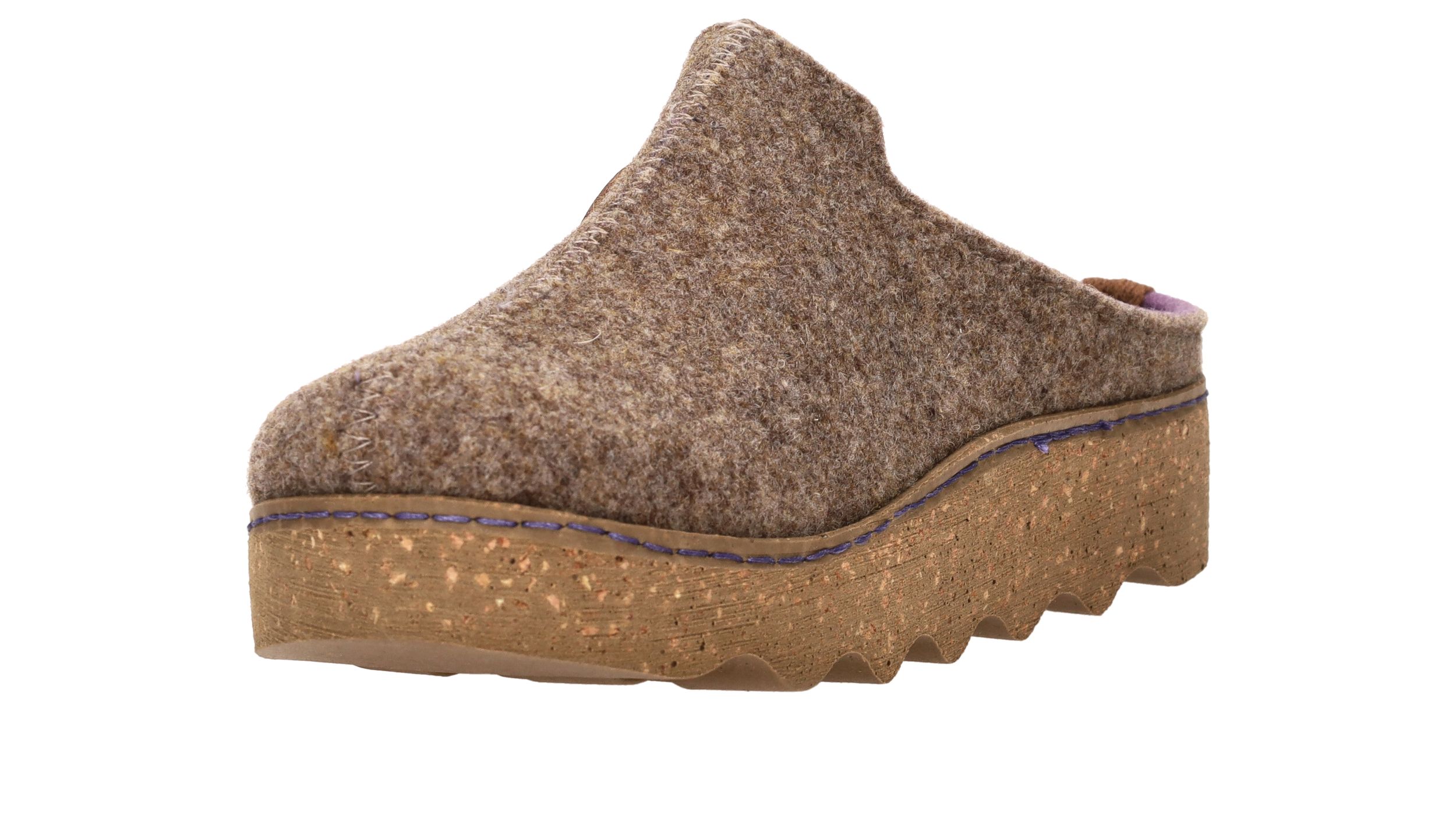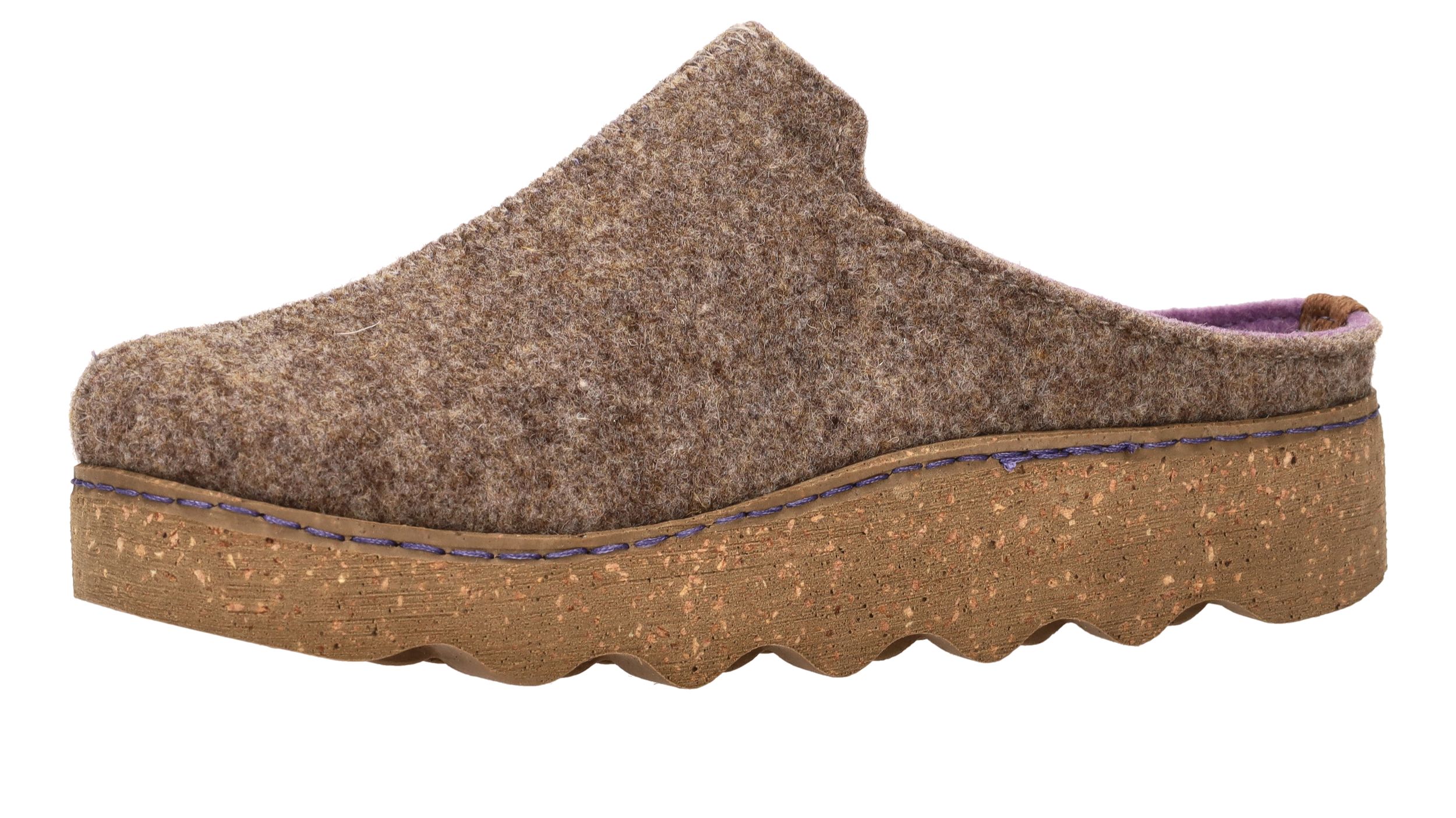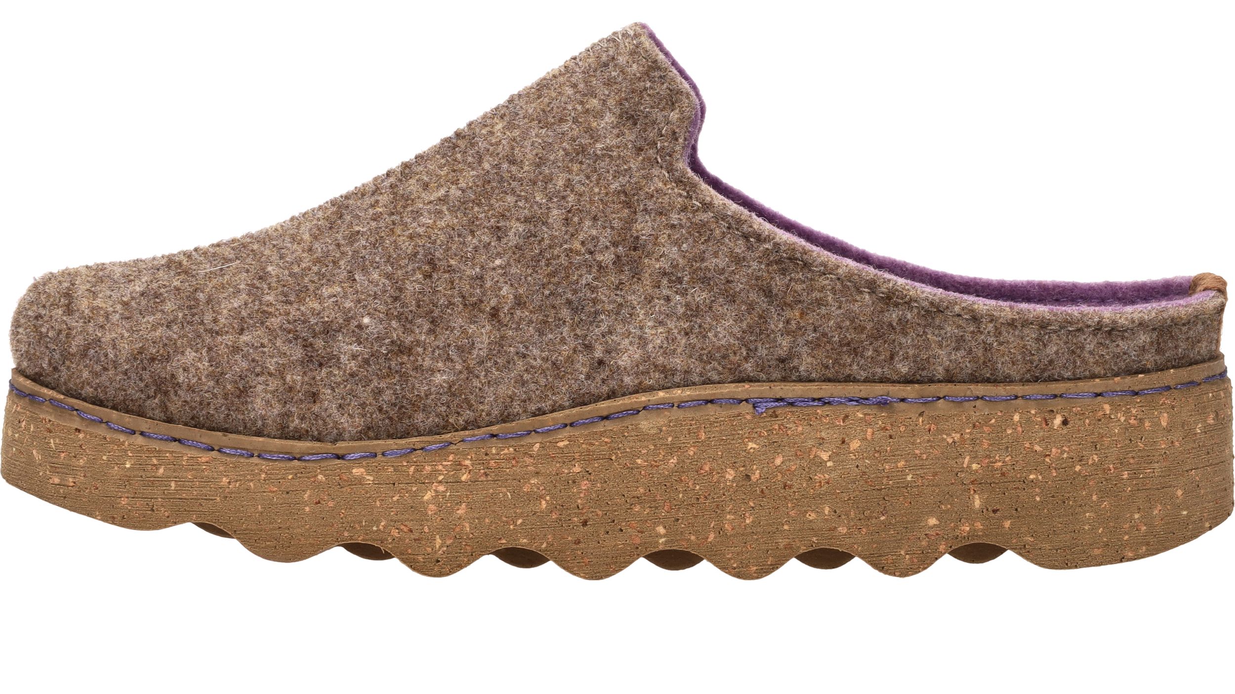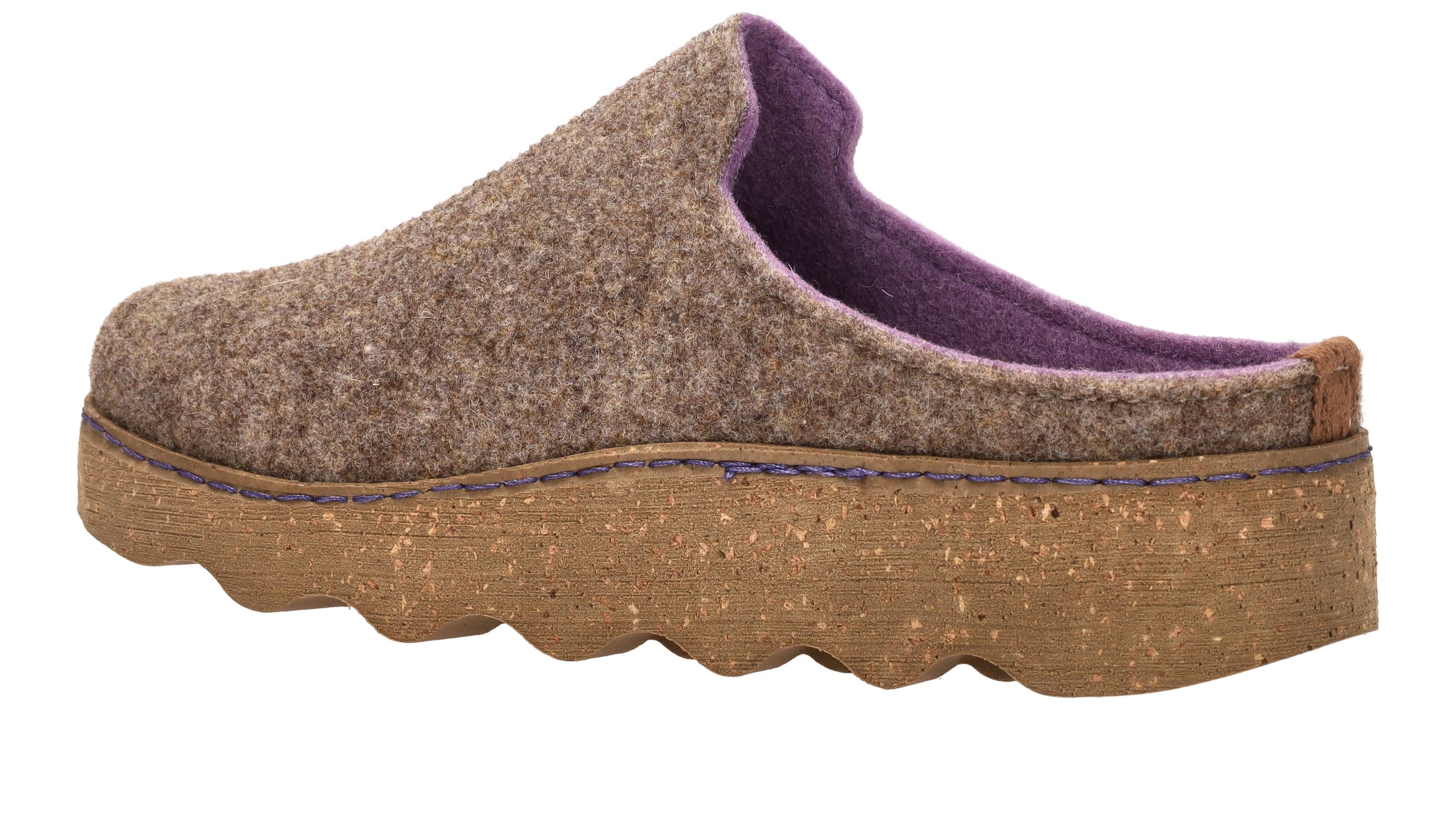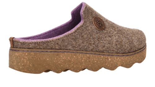 Van deze Rohde muil krijg je blije voeten! De beige pantoffel heeft een vrolijk paarse binnenkant en ook langs de zool zit een paars stiksel.