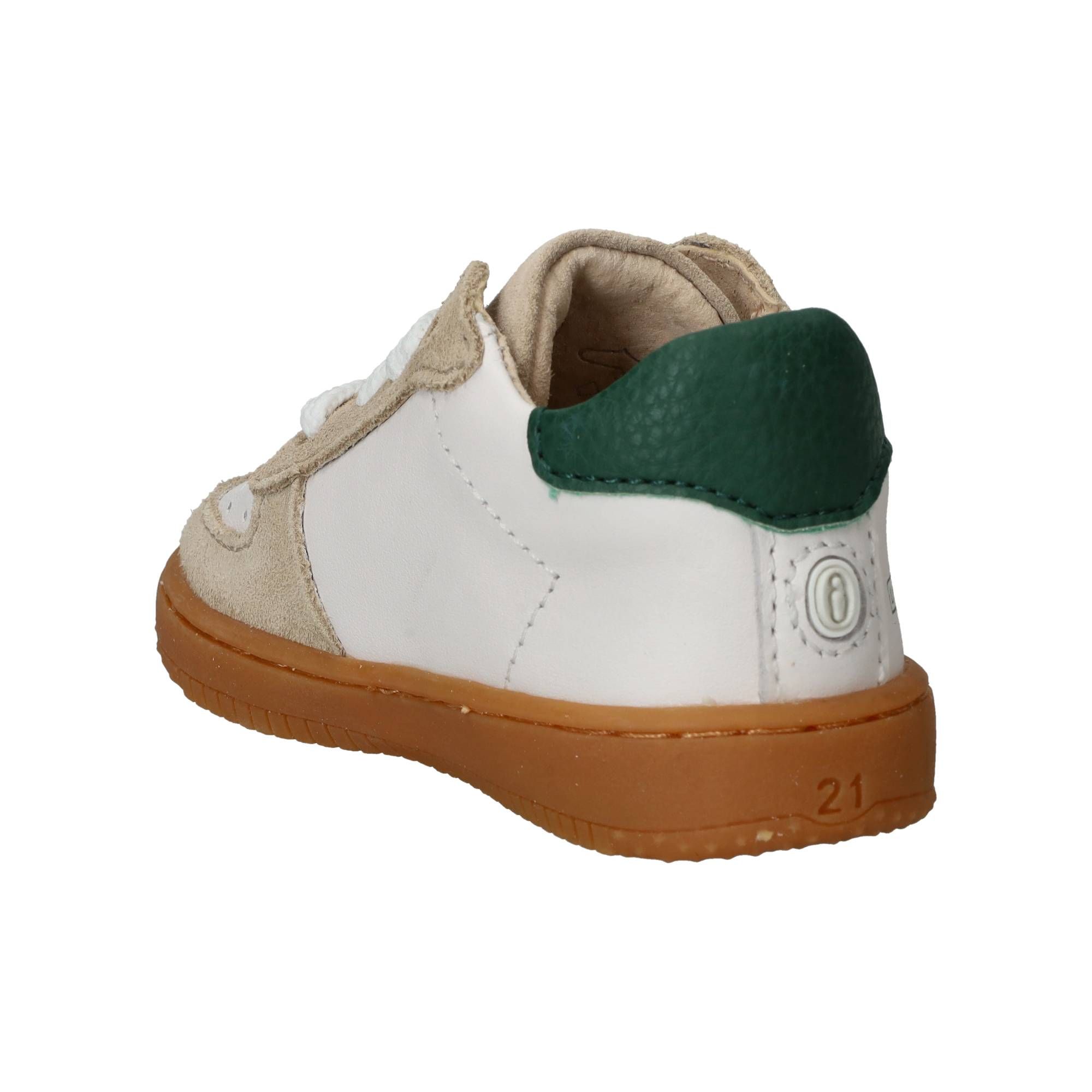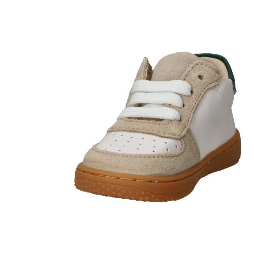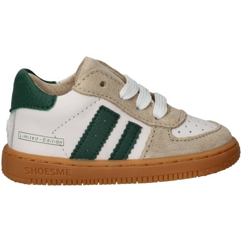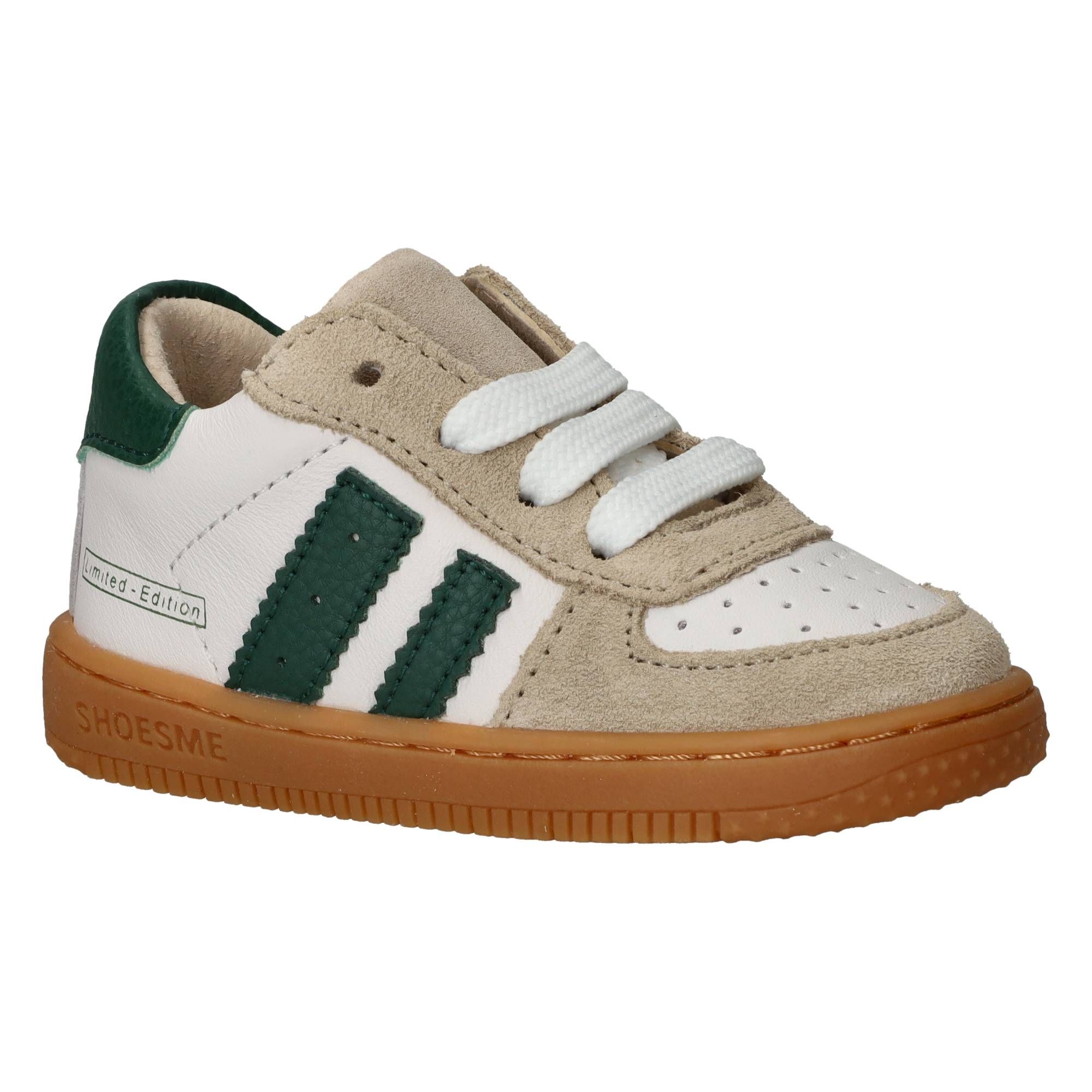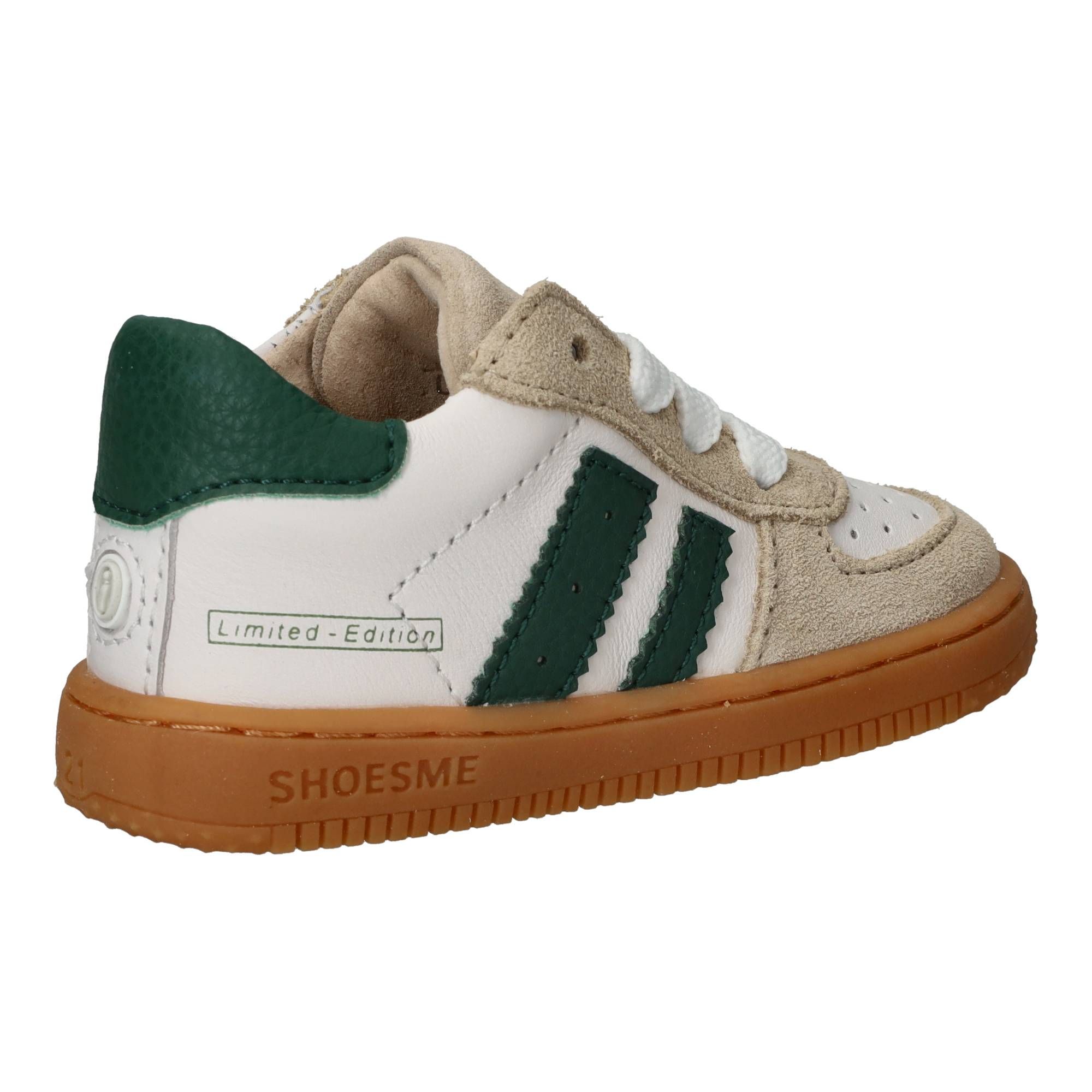 De jongens sneakers van Shoesme in een mooie beige kleur met subtiele groene accenten, zijn perfect voor avontuurlijke voeten. Deze stoere schoenen zijn gemaakt van een combinatie van leer en suède en geven een fijne, actieve uitstraling. Ze bieden een rustige afwikkeling van de voet, wat zorgt voor een prettig loopgevoel en minder vermoeide voeten, zelfs na een hele dag spelen. De stevige zool draagt bij aan een goede stabiliteit, zodat je kind zich vrij en zelfverzekerd kan bewegen.- De veters zorgen ervoor dat de schoen stevig om de voet zit, wat bijdraagt aan een stabiel en vertrouwd loopgevoel.