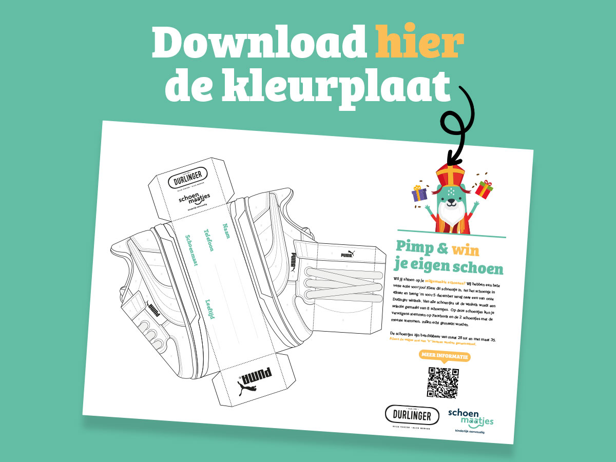 Knutsel jouw eigen schoentje met Durlinger! Wil jij kans maken op je eigen gemaakte schoentje? Kom dan vanaf 15 november naar een van onze winkels of download de kleurplaat online op deze pagina. Knutsel, kleur en knip jouw schoentje en breng hem naar een van onze Durlinger winkels vóór 5 december (of stuur een foto in, inclusief de onderkant naar winacties@durlinger.com).