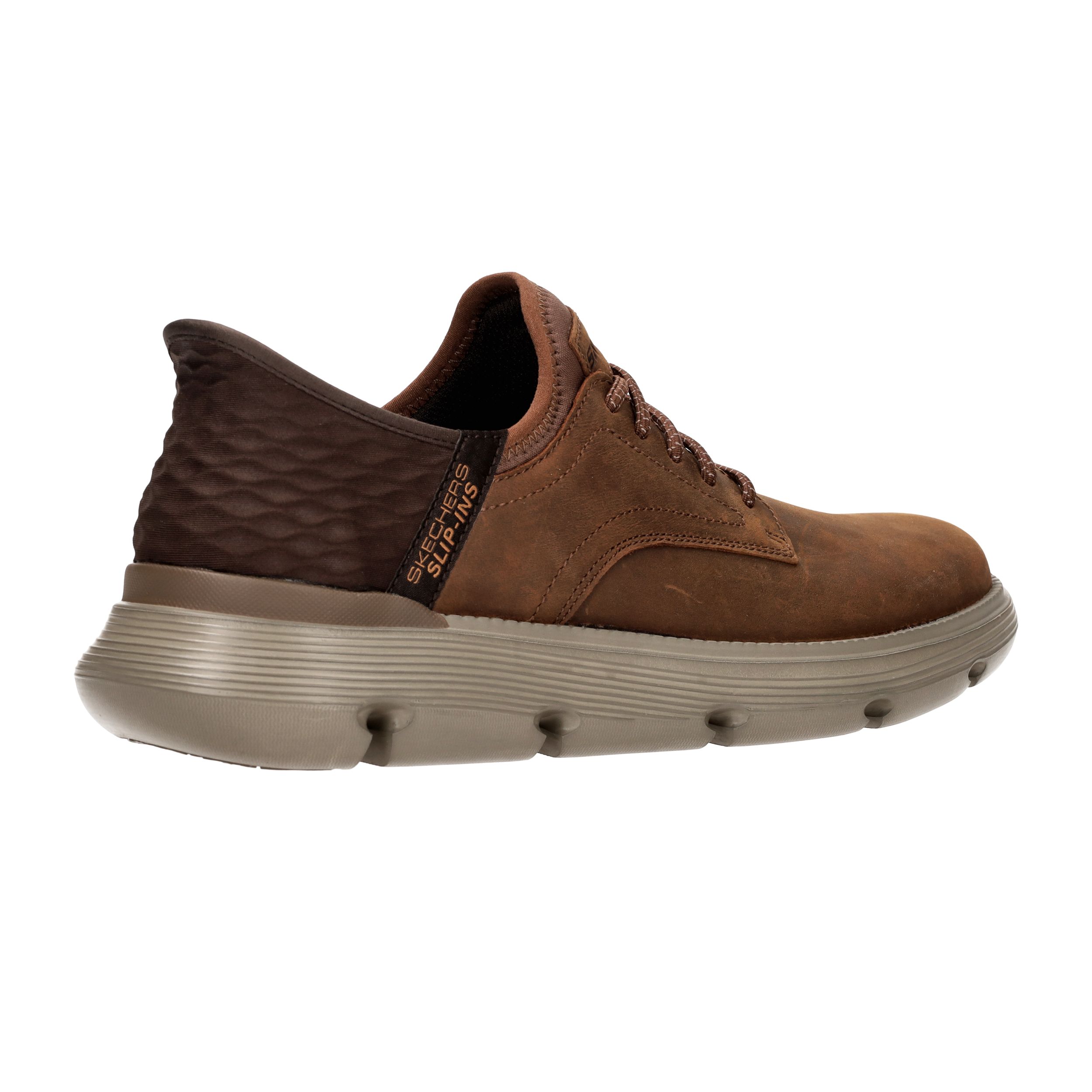Deze cognackleurige instappers van Skechers bieden ultiem gebruiksgemak voor heren die op zoek zijn naar comfort en gemak. Het Slip-Ins ontwerp met elastische sluiting zorgt ervoor dat je moeiteloos in deze schoenen stapt. De combinatie van glad leer en synthetisch materiaal maakt ze zowel stijlvol als onderhoudsvriendelijk. Deze Wide-fit variant biedt extra ruimte voor een ontspannen pasvorm.