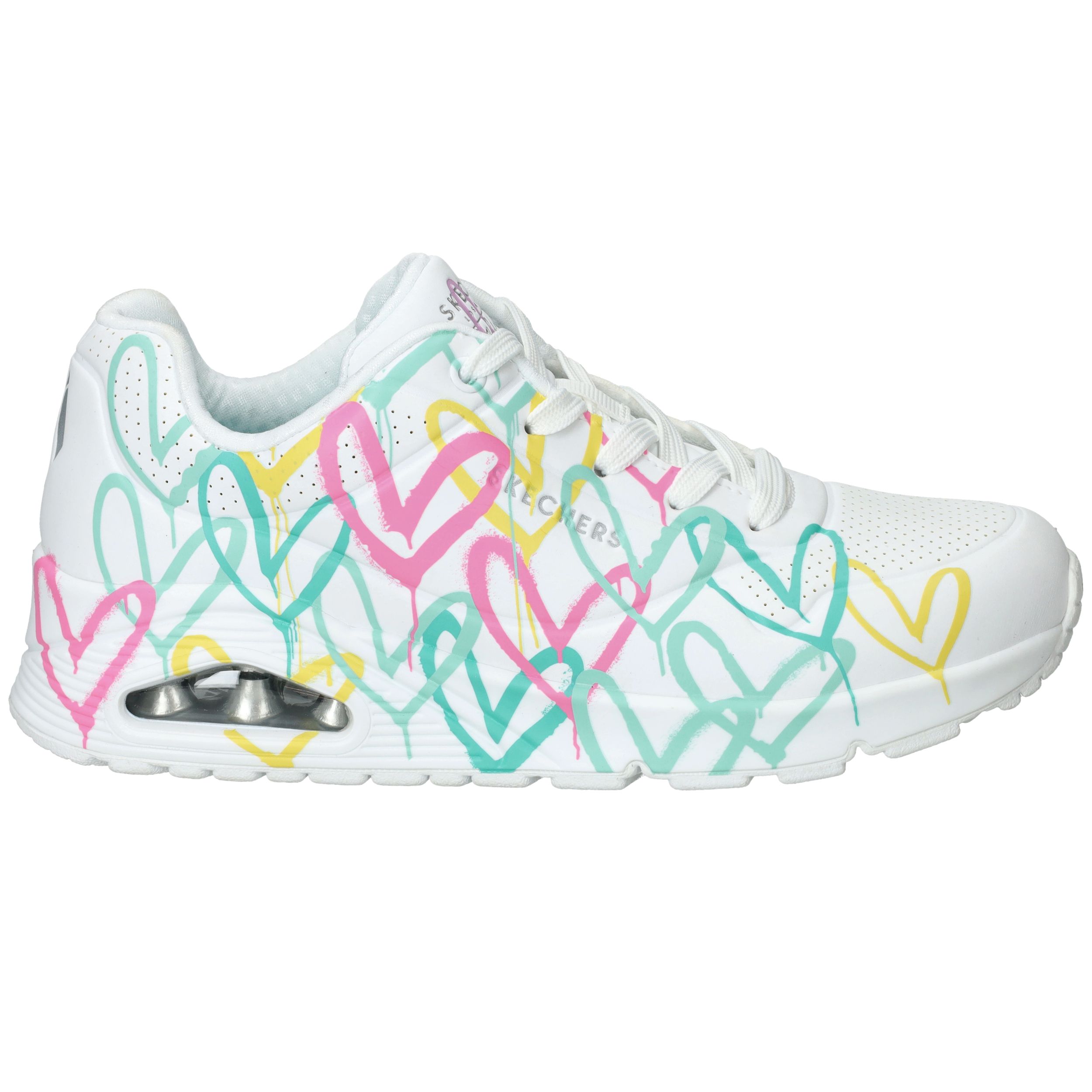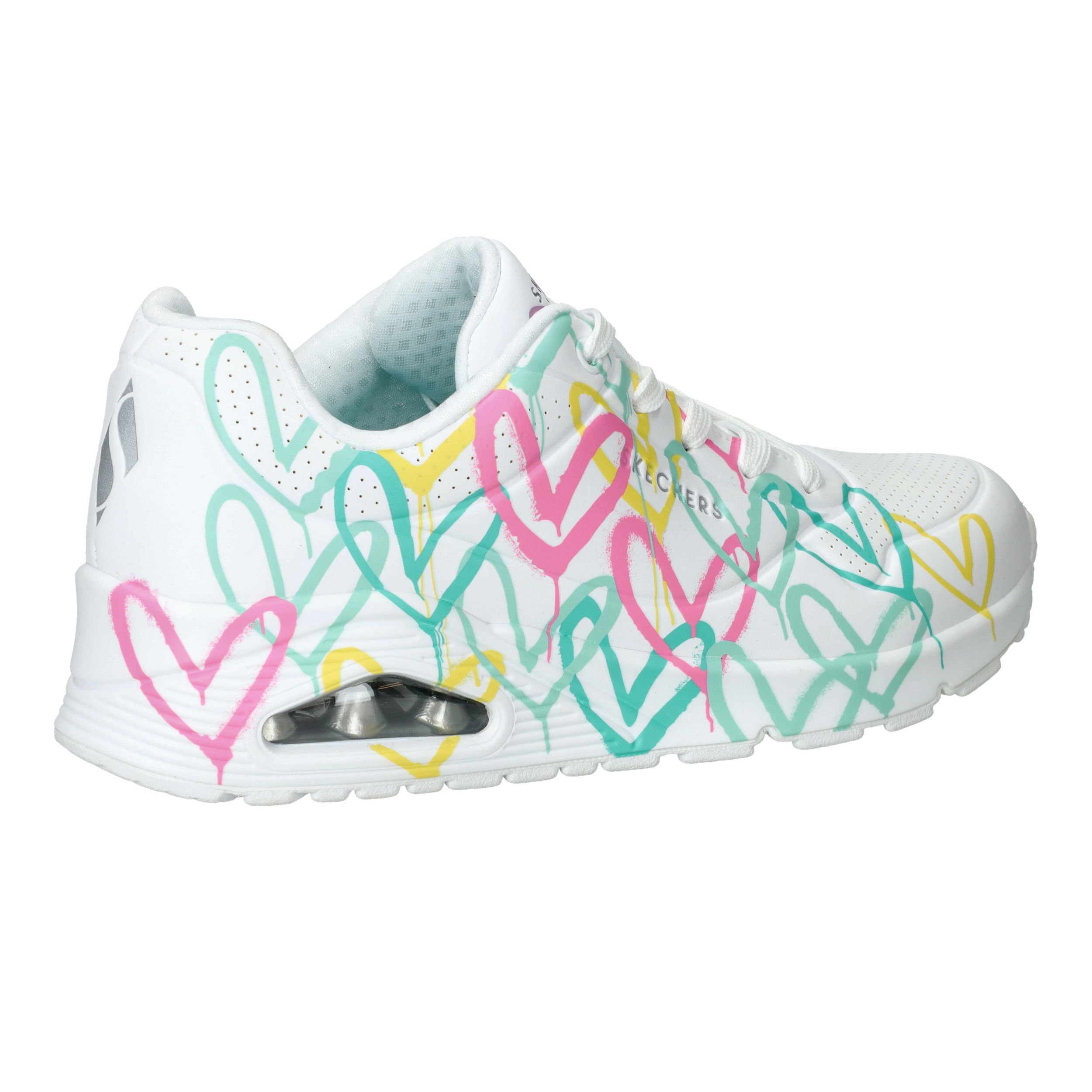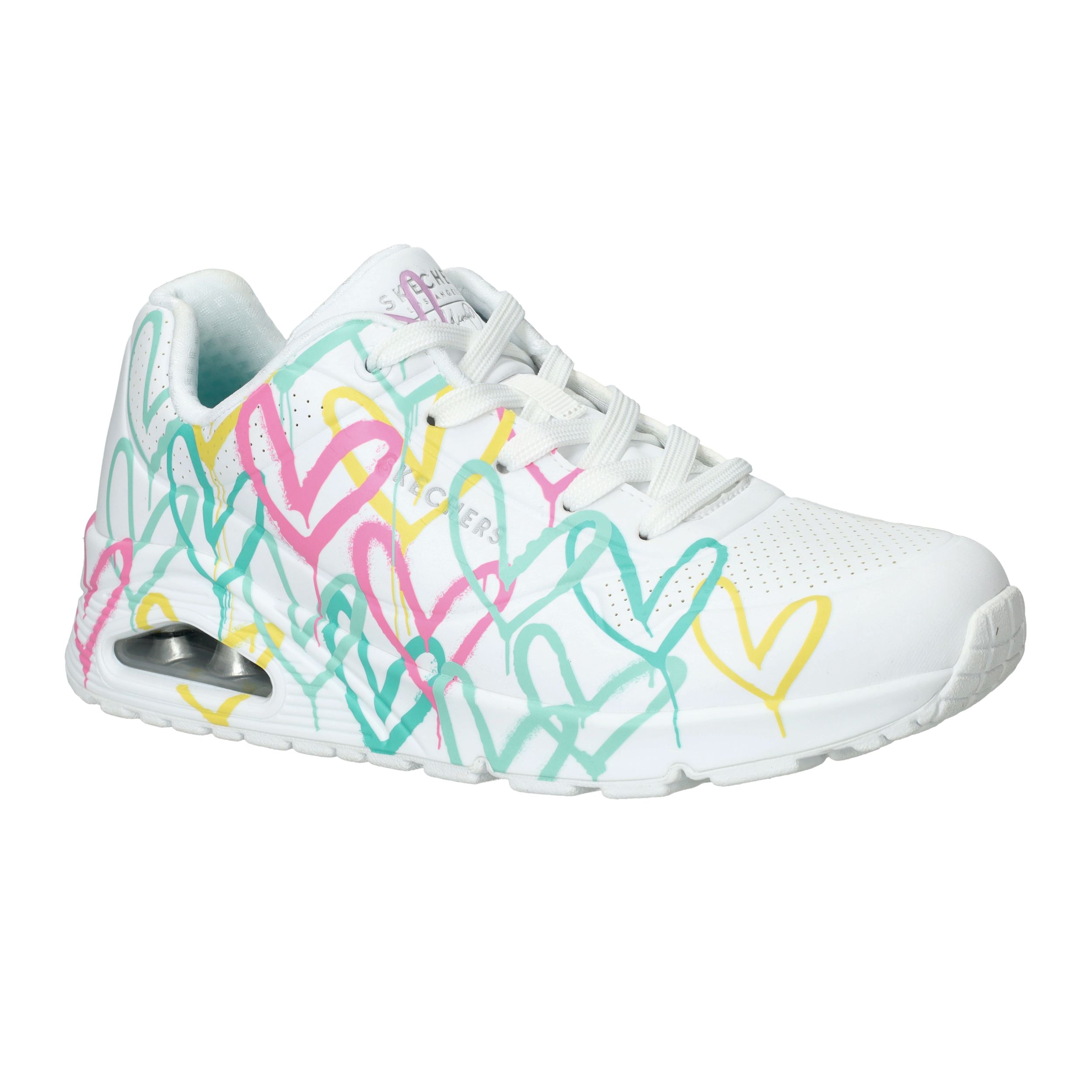 Deze witte Skechers JGoldcrown Uno Changed Love sneaker is echt een pareltje! De iconische Lovewall heart print van James Goldcrown maakt de sneaker helemaal af.