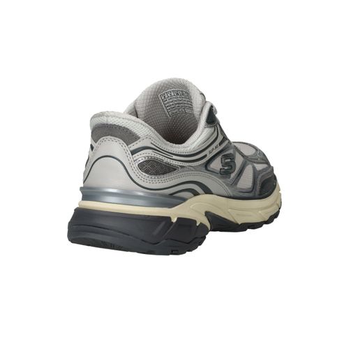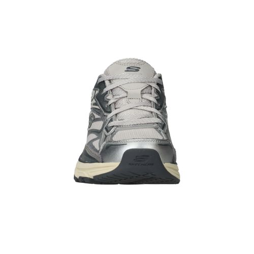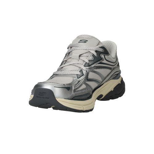 Deze zilverkleurige sneaker van Skechers is een sportieve topper met een moderne uitstraling. Dankzij de handige Slip-Ins constructie stap je er zó in, zonder te bukken. De combinatie van luchtig mesh en synthetisch materiaal maakt deze schoen perfect voor actieve dagen of casual outfits.