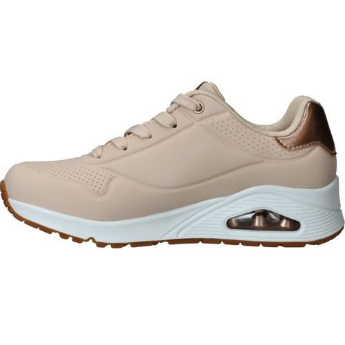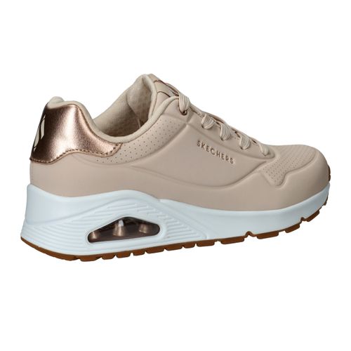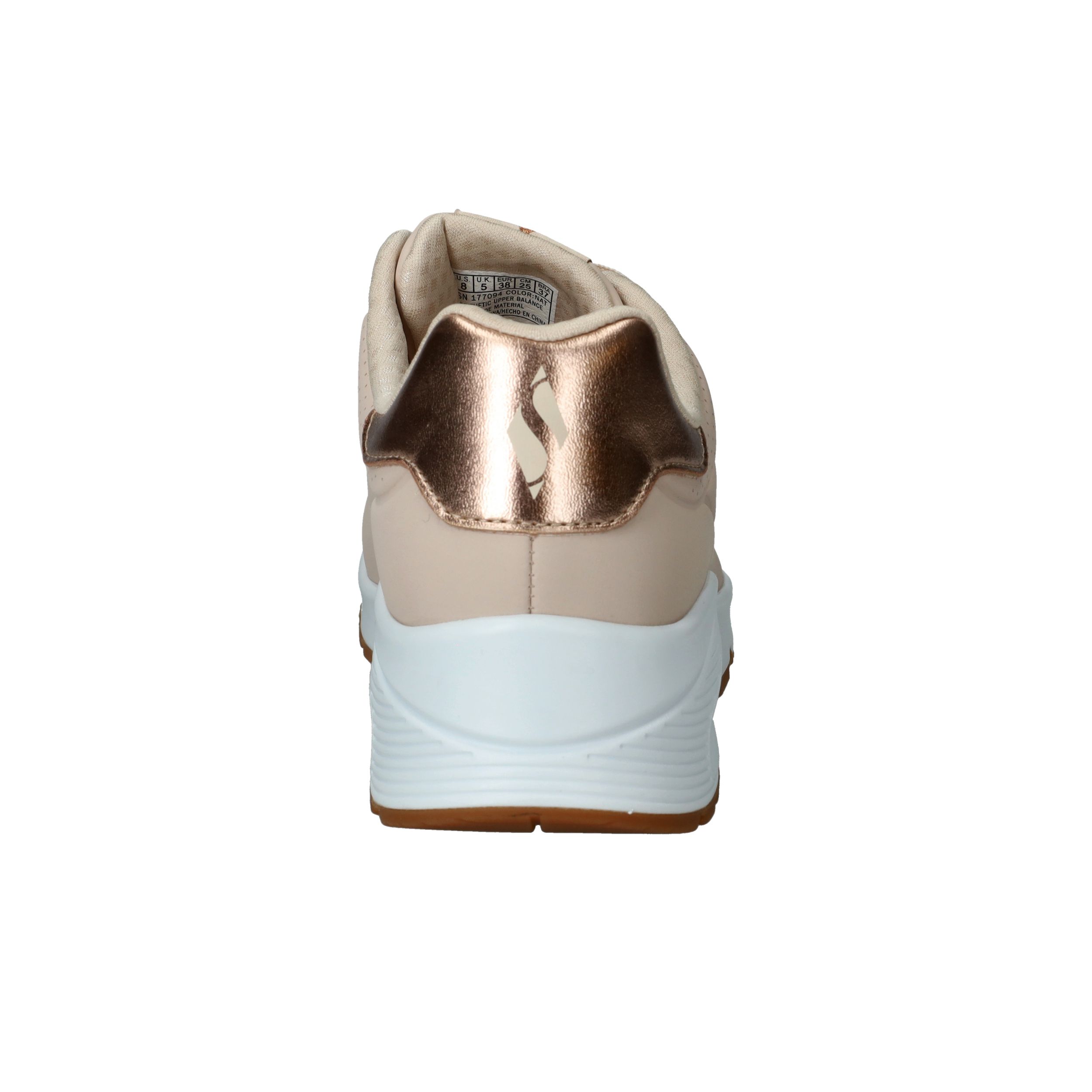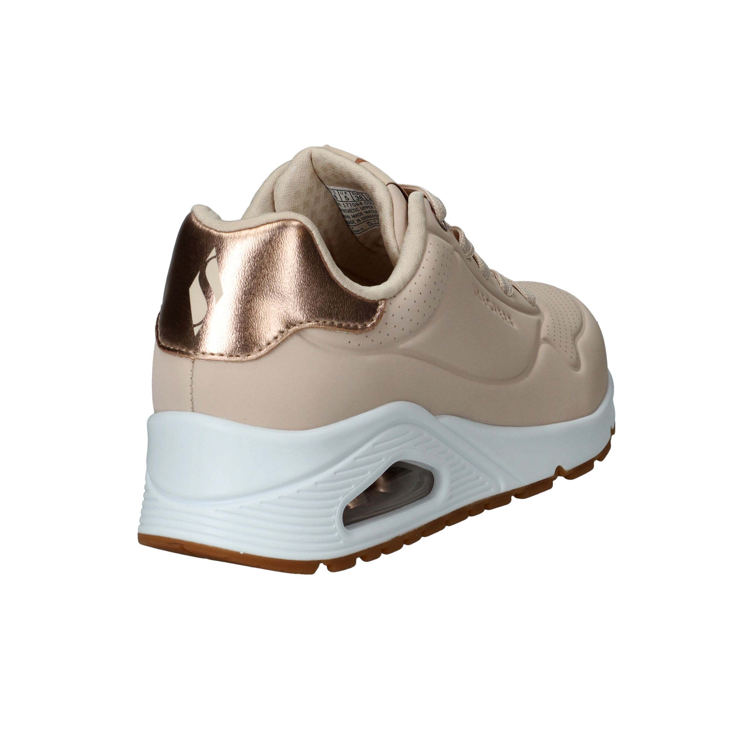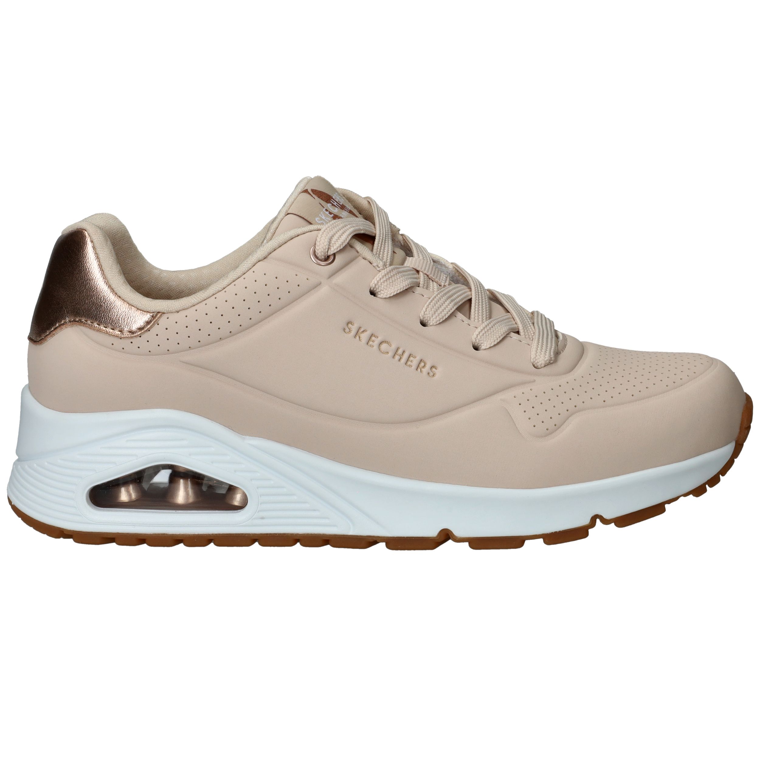 Sportieve Skechers Uno Golden Air sneaker voor dames in een warm beige kleur met rosé gouden accenten! De sneaker loopt extra lekker door het Air-Cooled Memoryfoam voetbed.