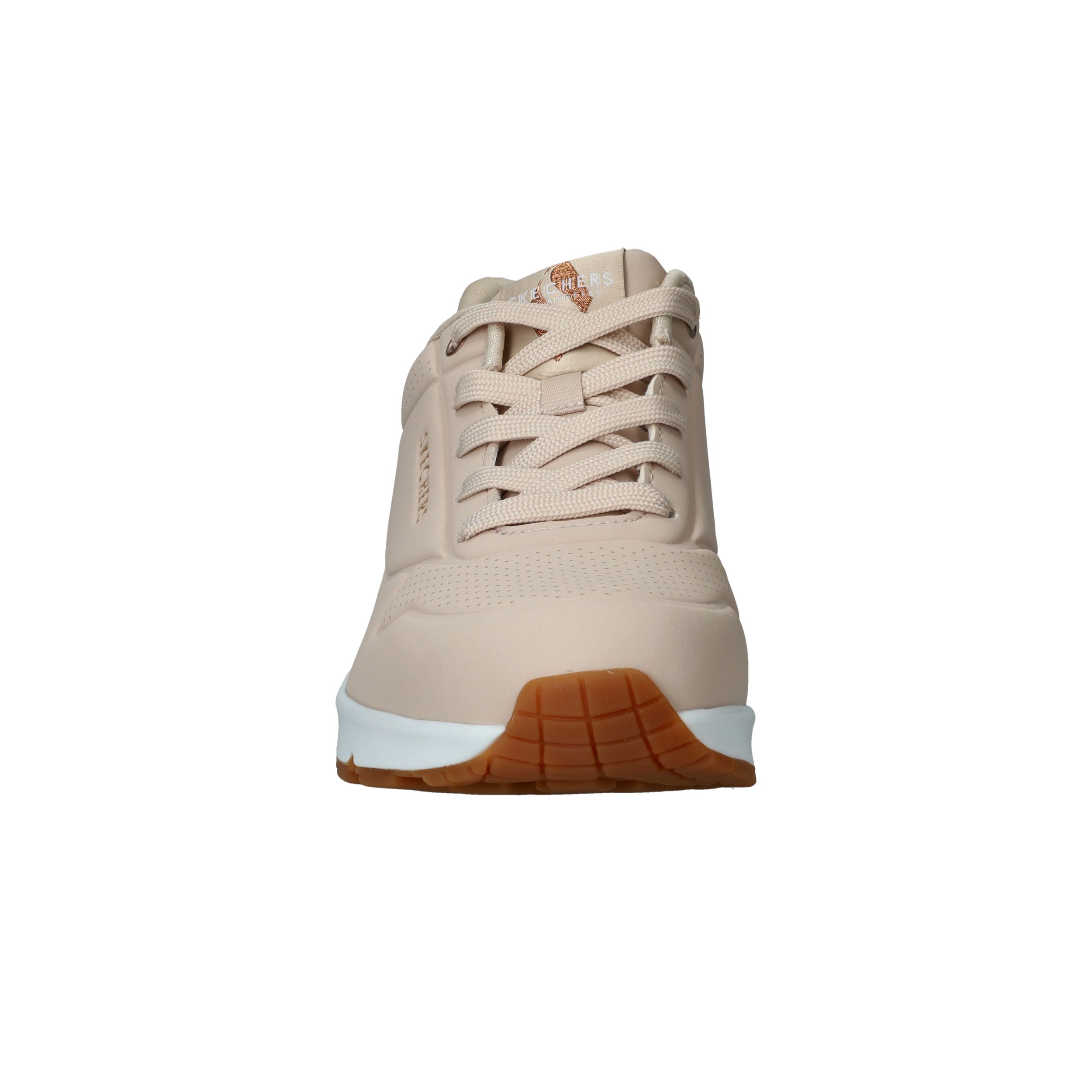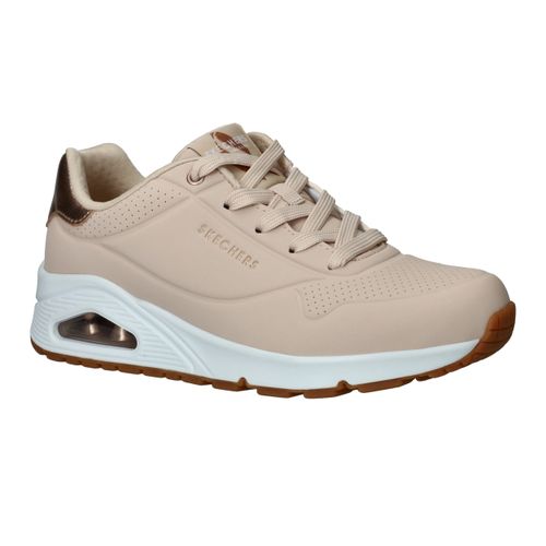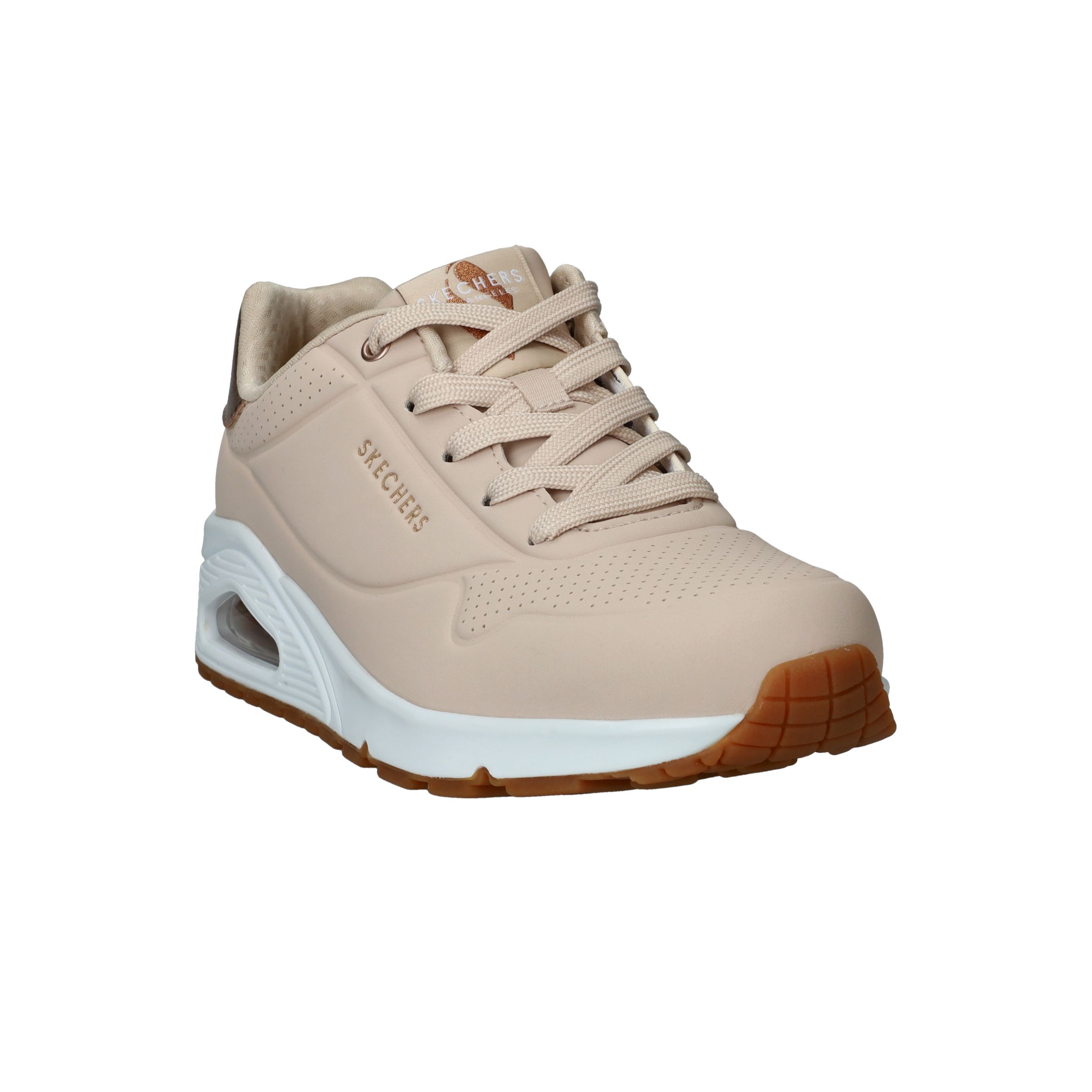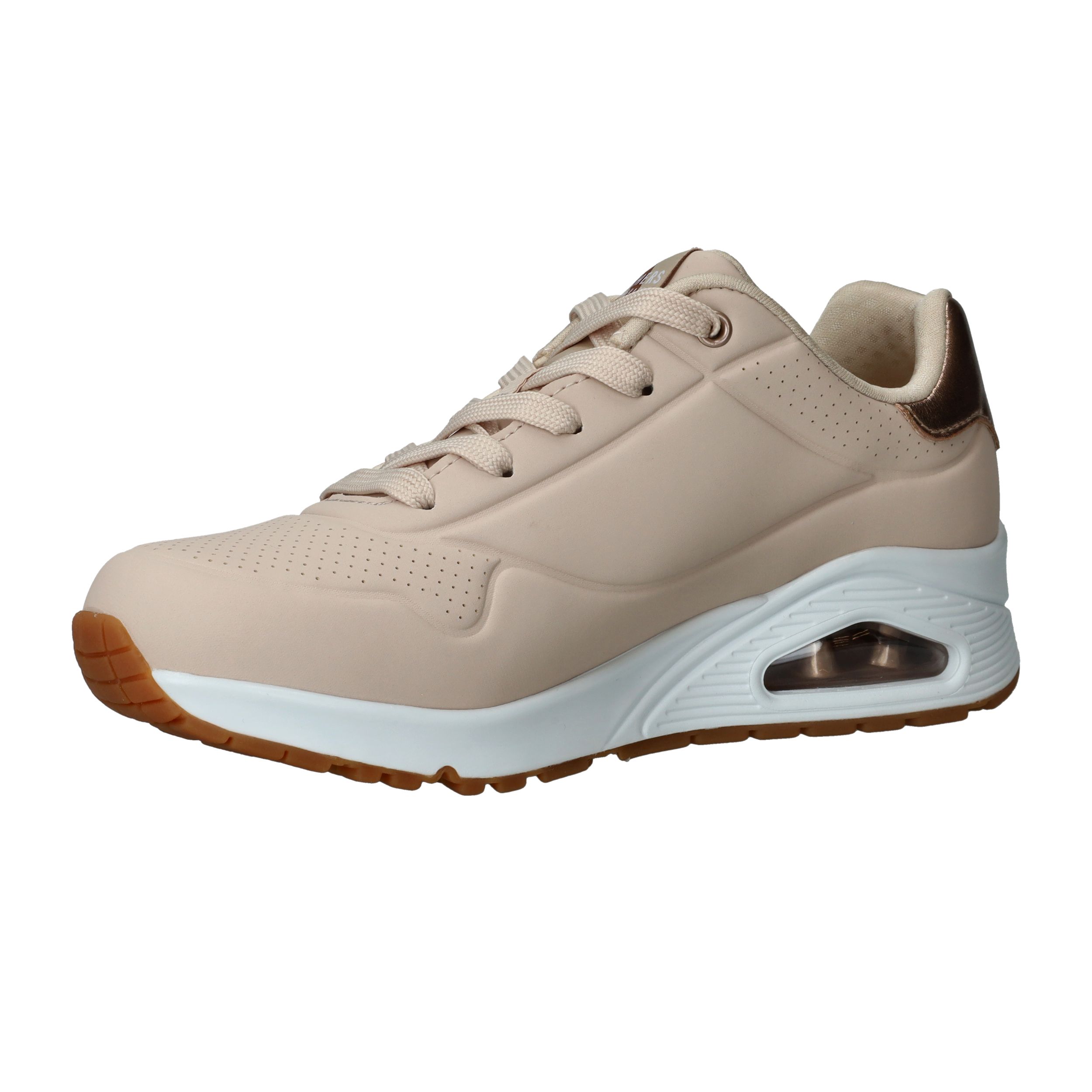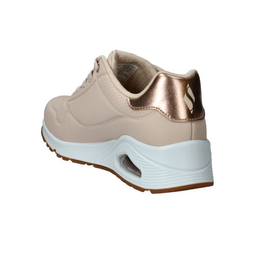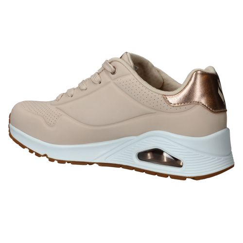 Sportieve Skechers Uno Golden Air sneaker voor dames in een warm beige kleur met rosé gouden accenten! De sneaker loopt extra lekker door het Air-Cooled Memoryfoam voetbed.