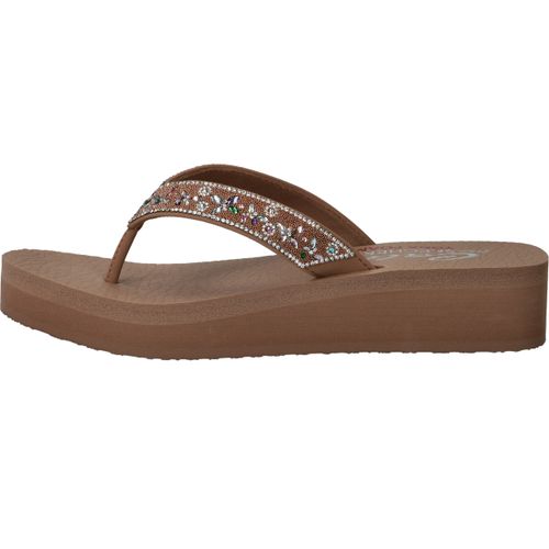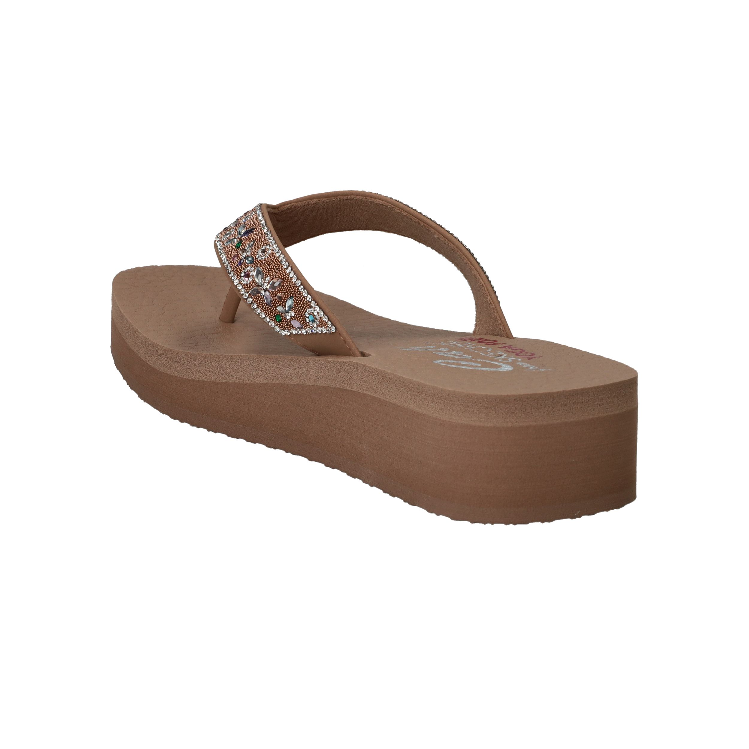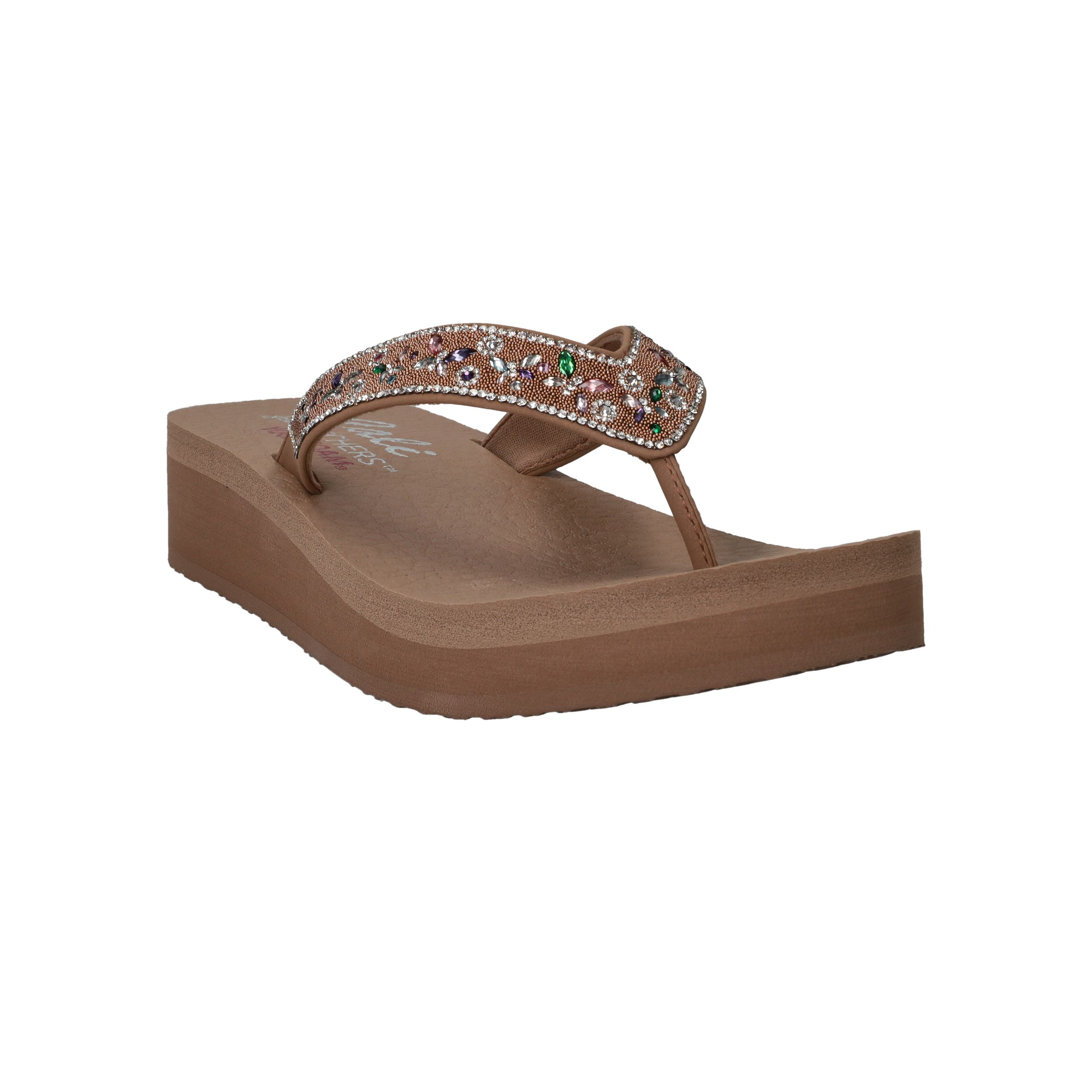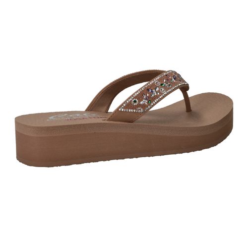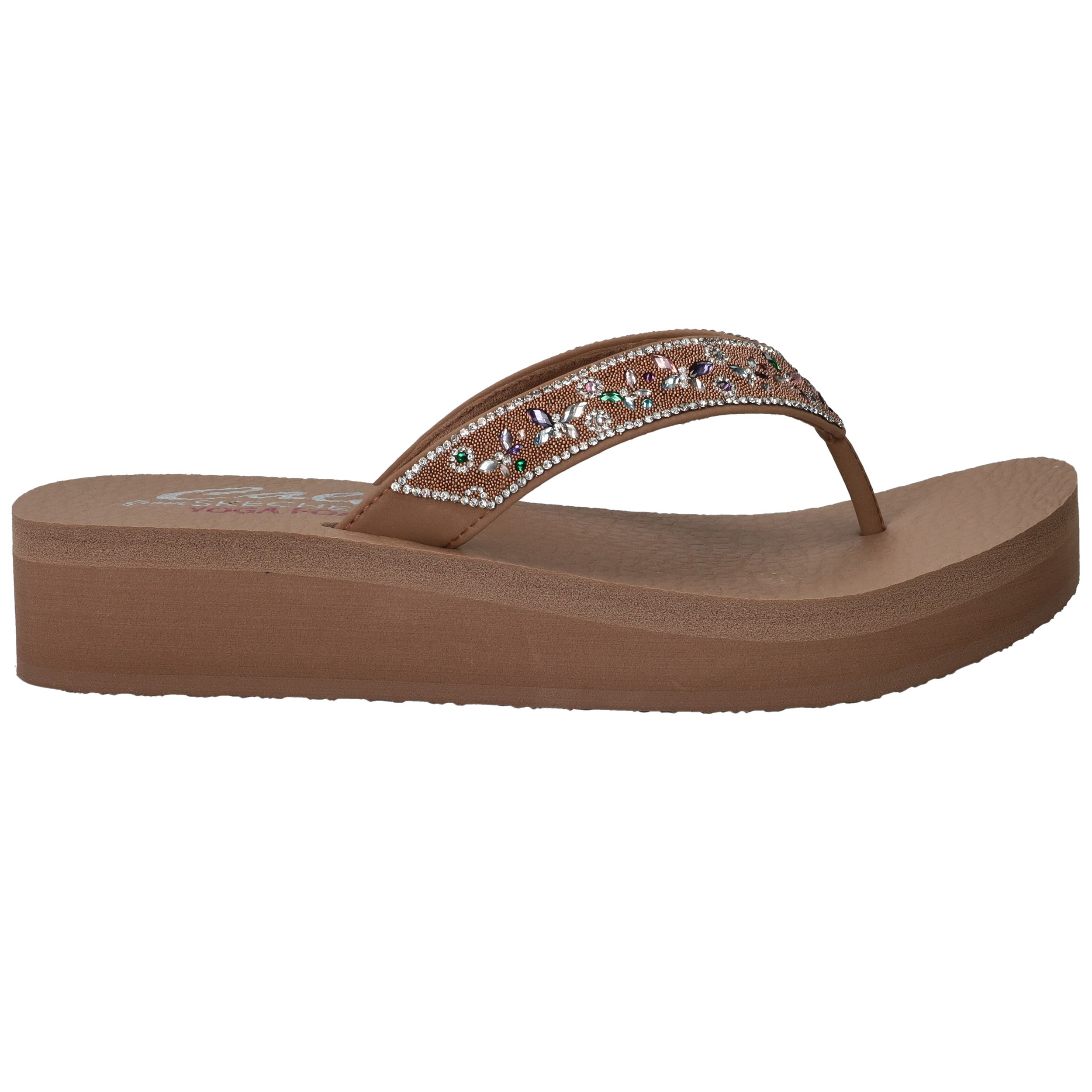 Voeg een vleugje glamour toe aan je zomerse look met de Skechers Vinyasa teenslippers. Deze damesslippers in een frisse bruine kleur zijn vervaardigd uit zacht textiel, wat zorgt voor een comfortabele pasvorm. De teenslippers zijn voorzien van een comfortabele zool en een zachte binnenzool, waardoor je de hele dag comfortabel kunt lopen. De band is versierd met glinsterende details, waardoor de slippers een unieke en elegante uitstraling hebben.