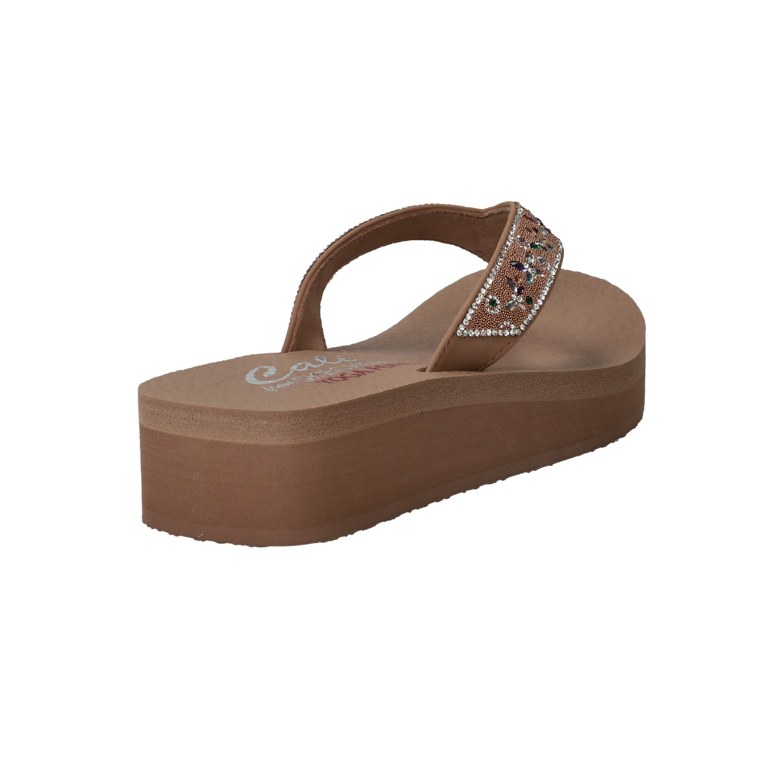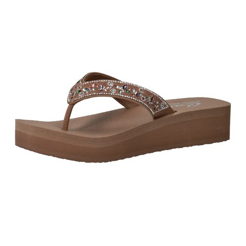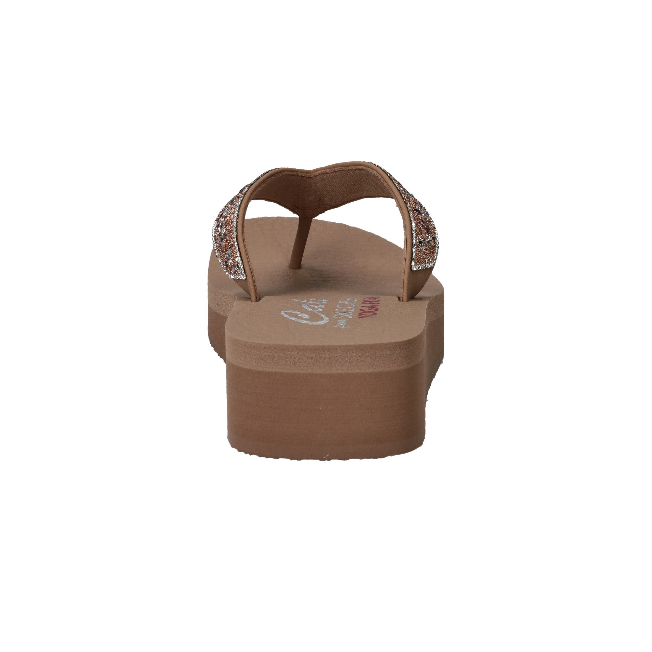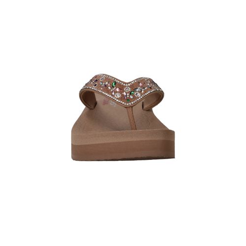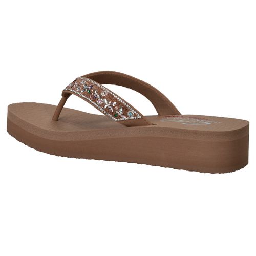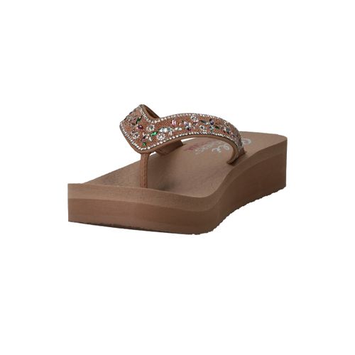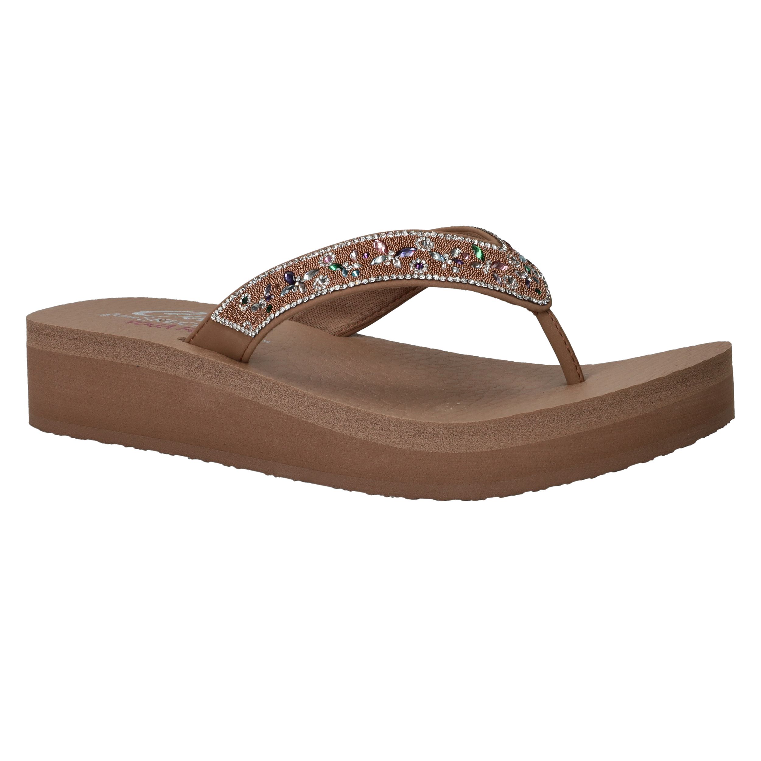 Voeg een vleugje glamour toe aan je zomerse look met de Skechers Vinyasa teenslippers. Deze damesslippers in een frisse bruine kleur zijn vervaardigd uit zacht textiel, wat zorgt voor een comfortabele pasvorm. De teenslippers zijn voorzien van een comfortabele zool en een zachte binnenzool, waardoor je de hele dag comfortabel kunt lopen. De band is versierd met glinsterende details, waardoor de slippers een unieke en elegante uitstraling hebben.