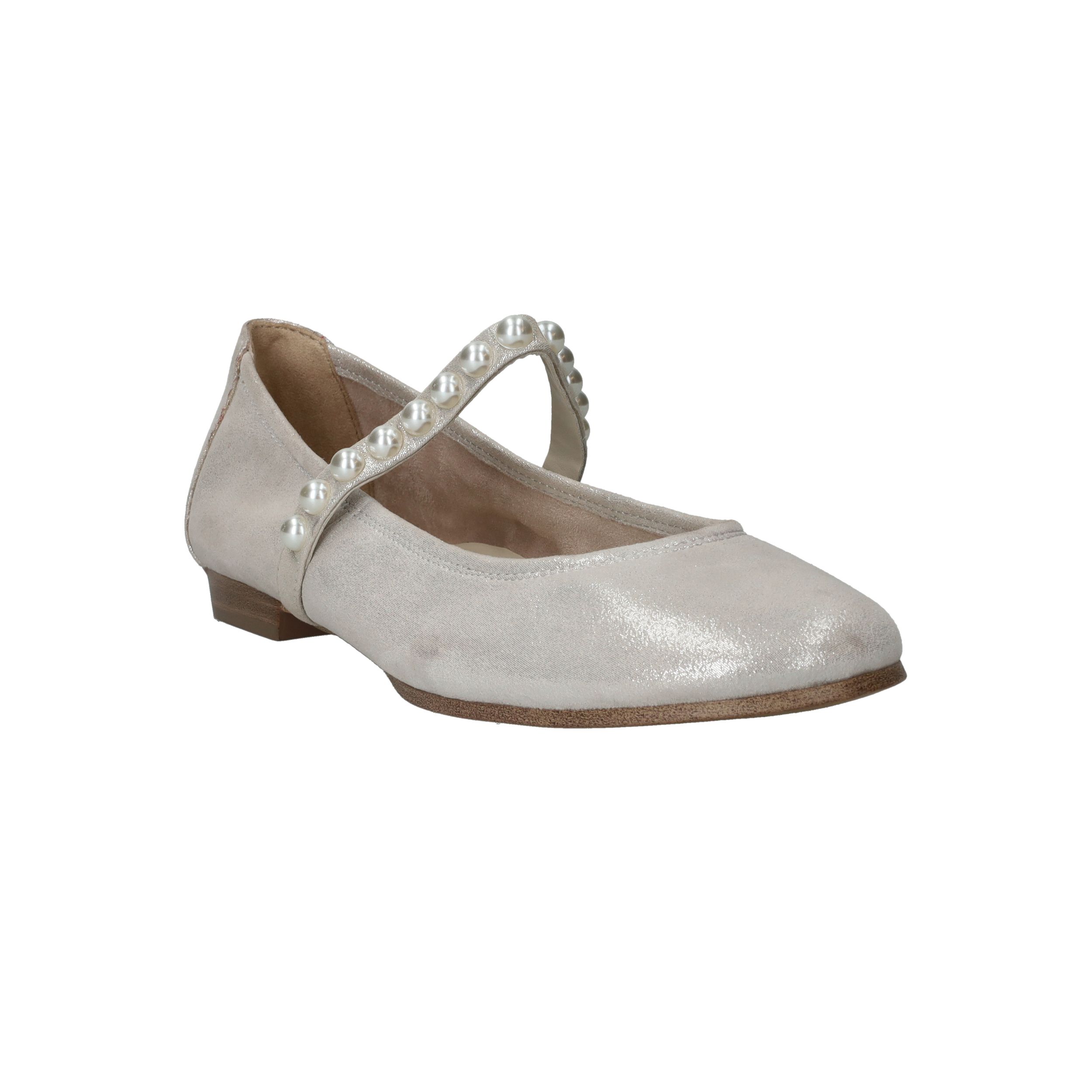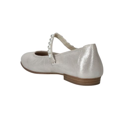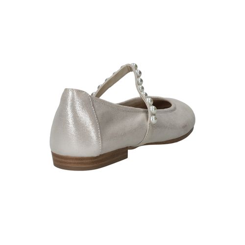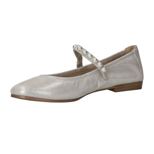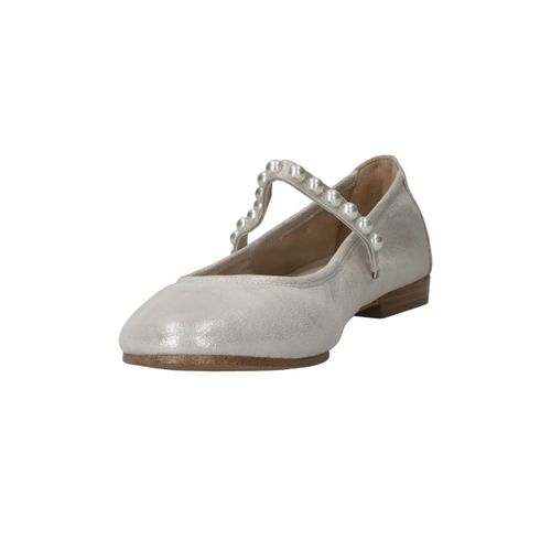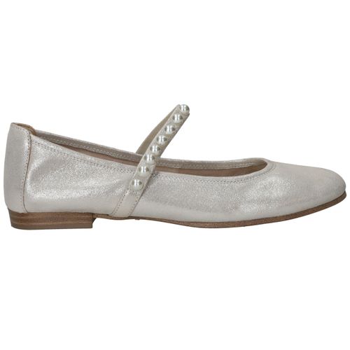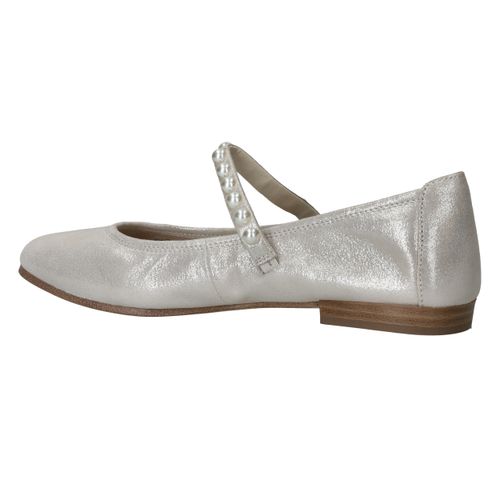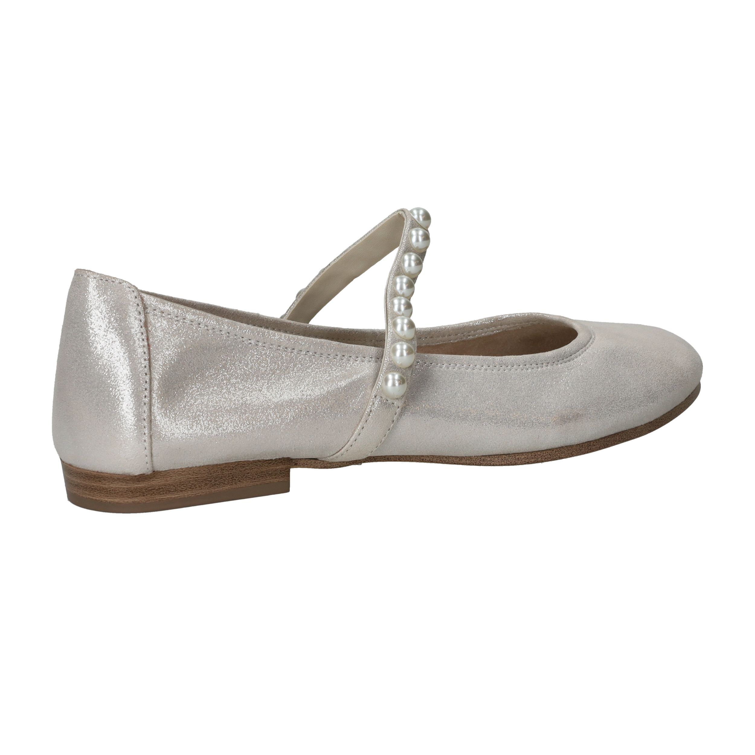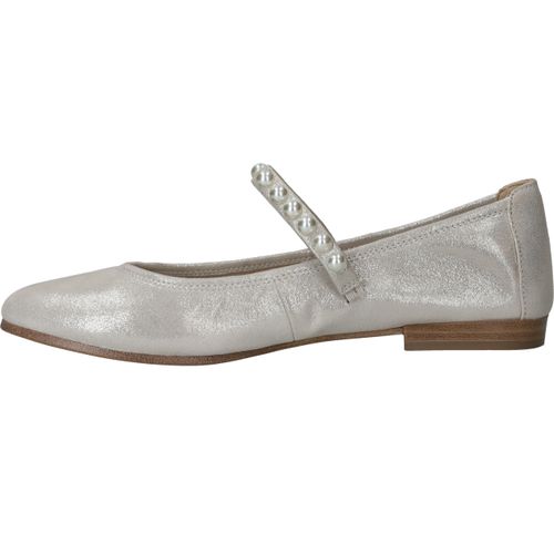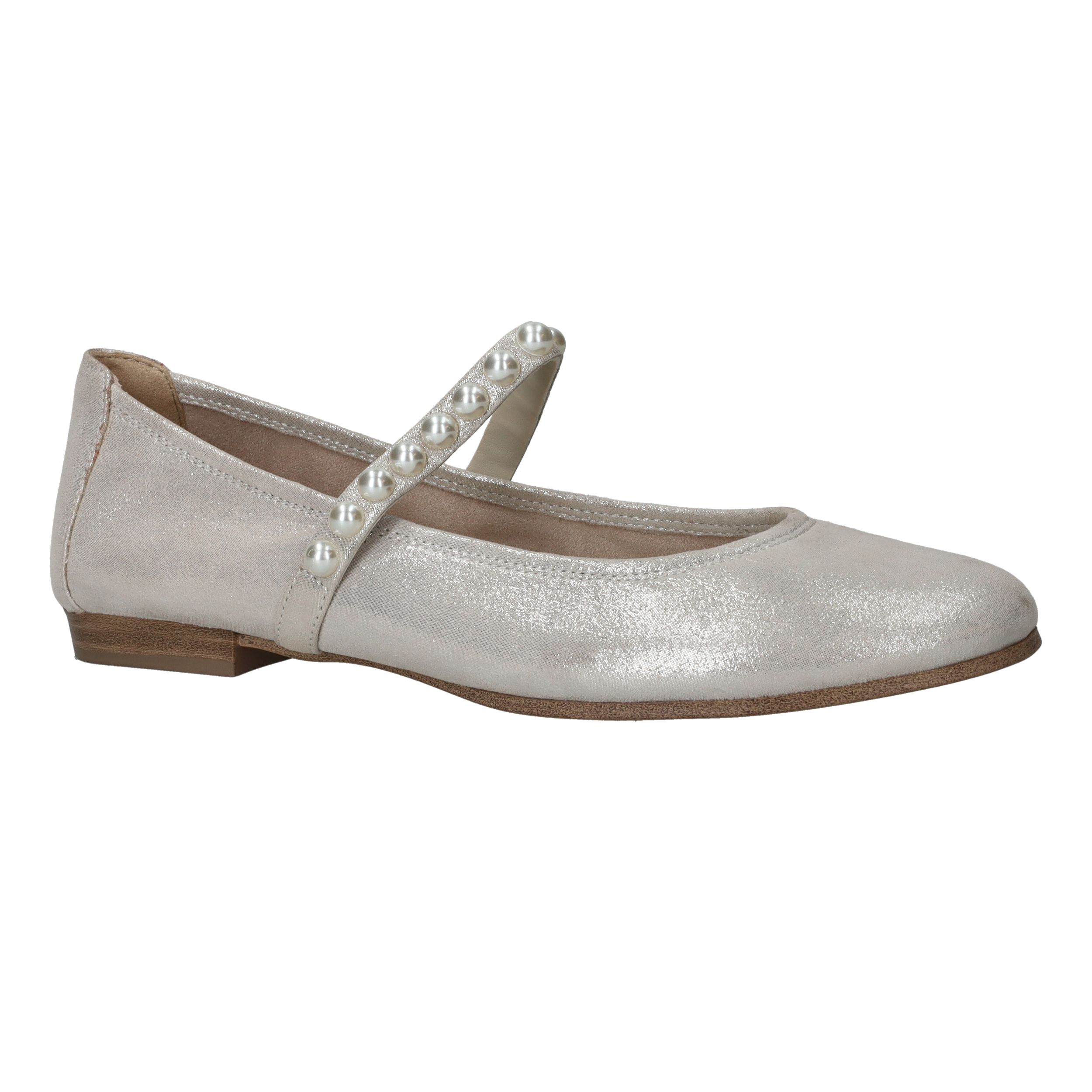 Feestelijke metallic zilveren Tamaris ballerina met parelriempje. De ballerina heeft een lage hak waardoor je tijdens een feestje geen last krijgt van pijnlijke voeten.