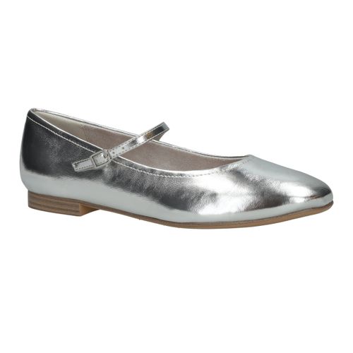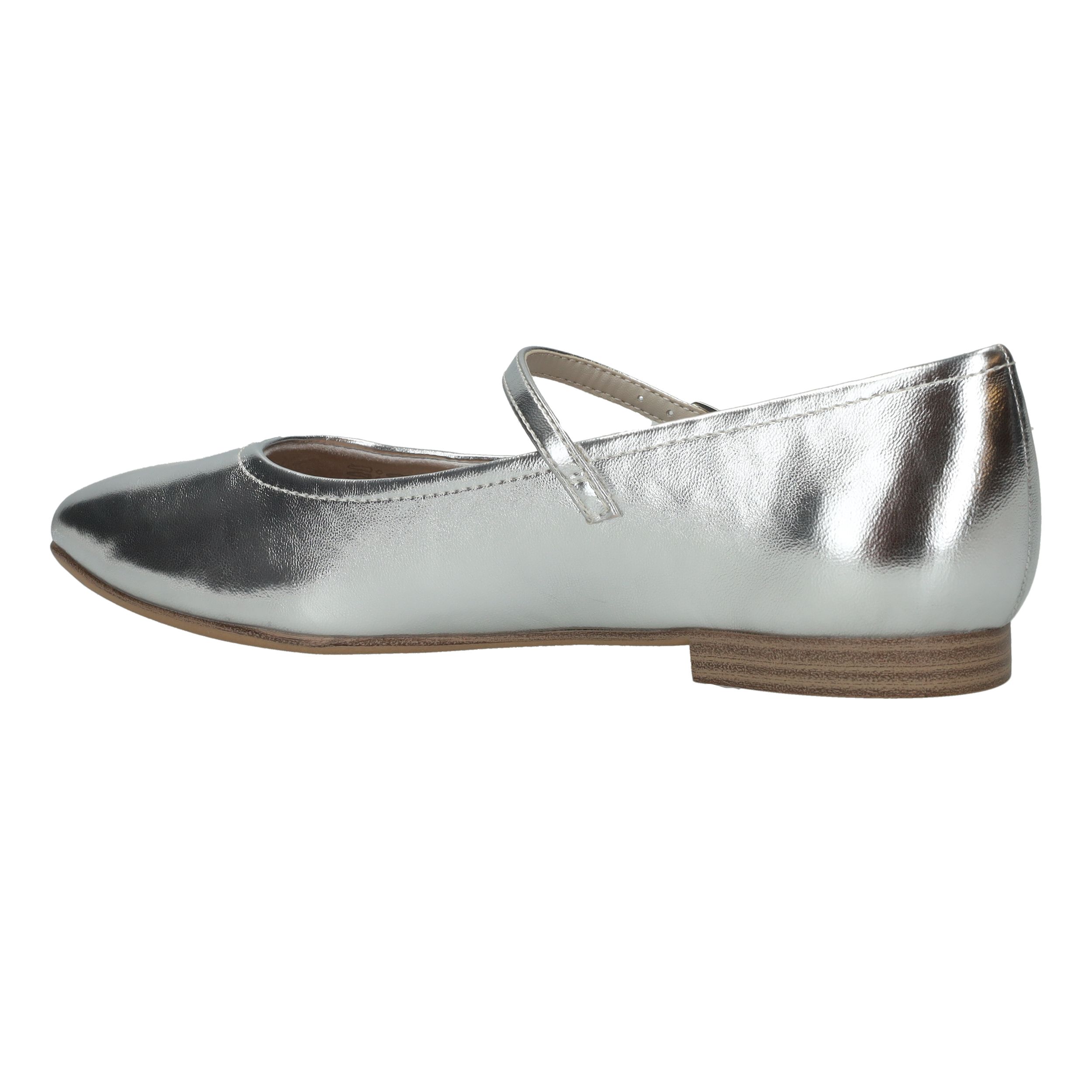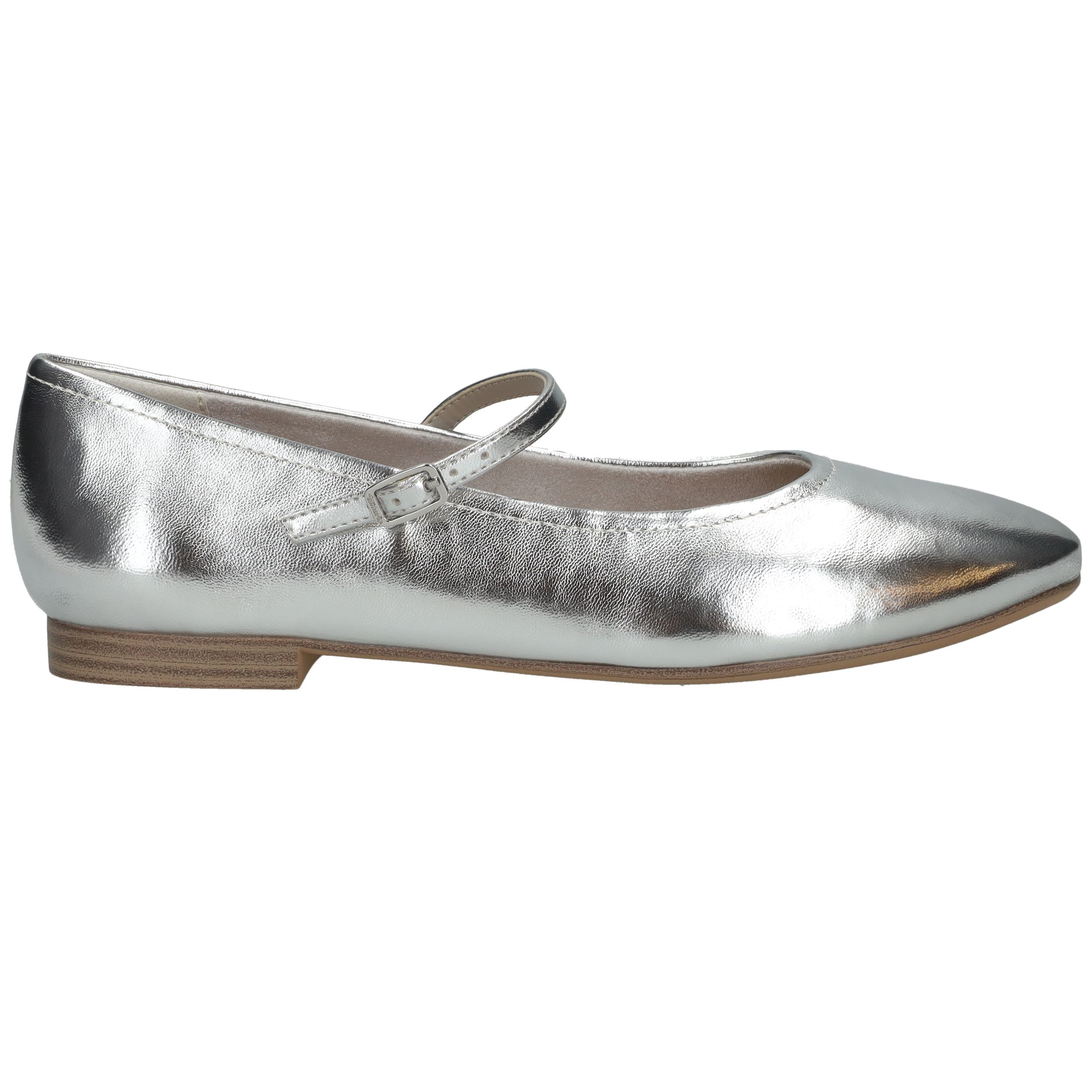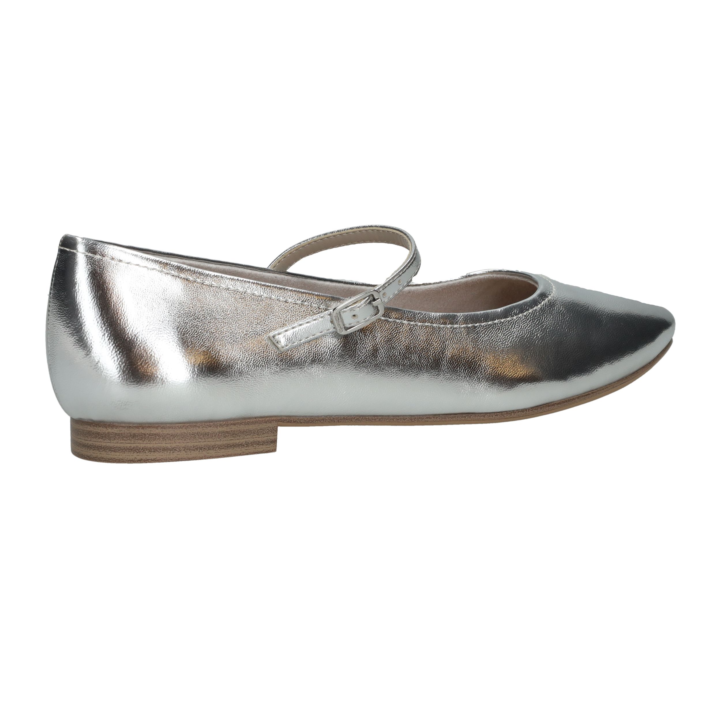 Geen pijnlijke voeten tijdens een feestje met deze Tamaris ballerina! De metallic zilveren ballerina heeft een laag hakje en draag je bij een feestelijke outfit of juist een casual look.