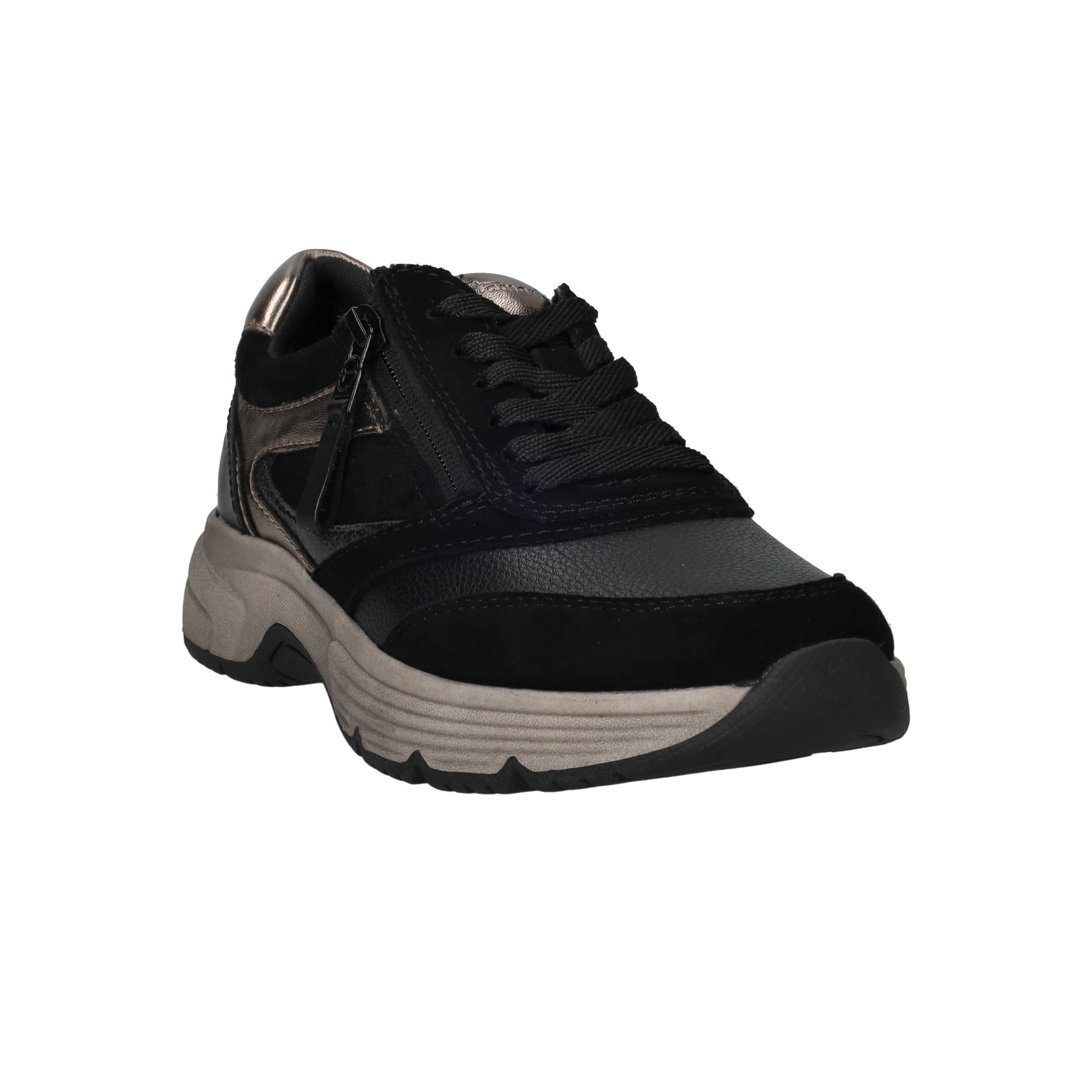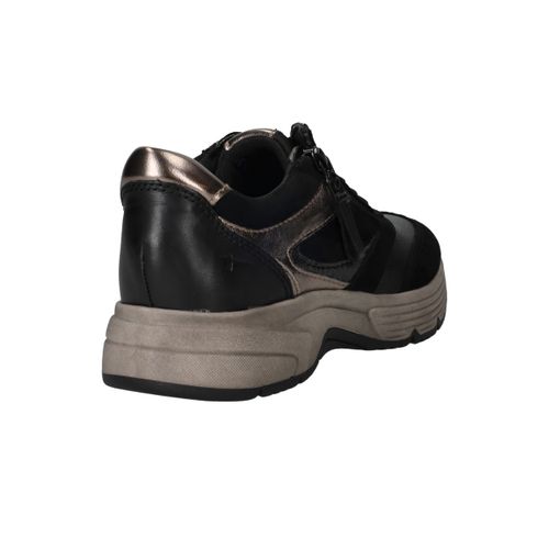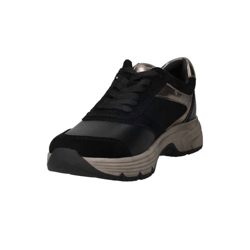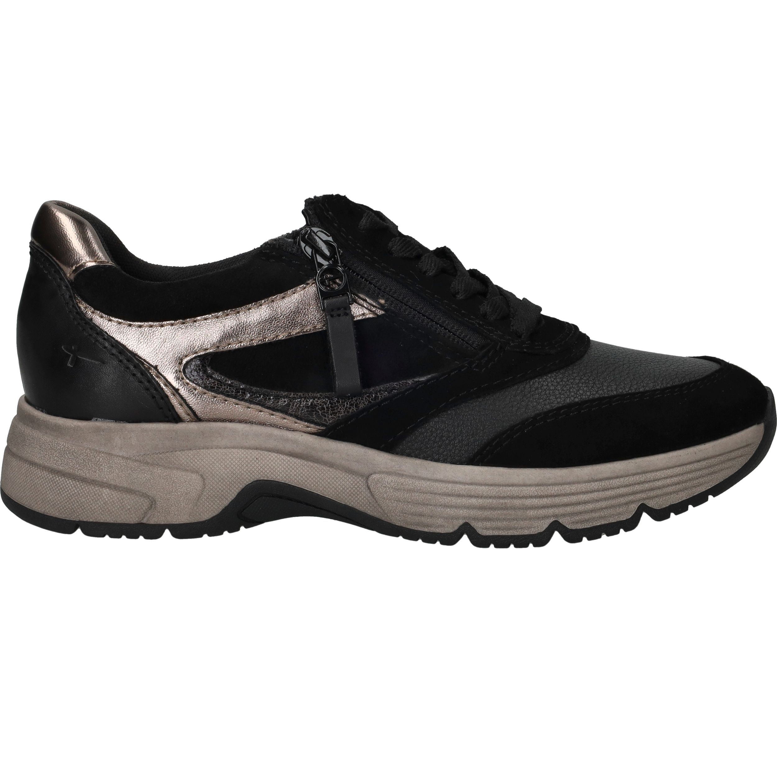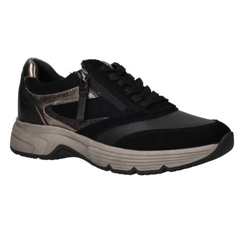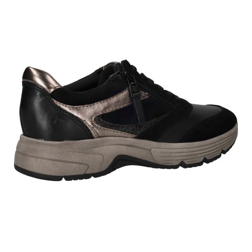 Deze zwarte/grijze Tamaris Comfort sneaker combineert een sportieve look met dagelijks draaggemak. Het bovenwerk is een mix van soepel leer en stevig textiel, terwijl de voering van textiel en synthetisch materiaal zorgt voor een prettig, onderhoudsvriendelijk binnenklimaat. Dankzij de combinatie van veters en een handige zijrits trek je deze sneaker snel aan en uit.
