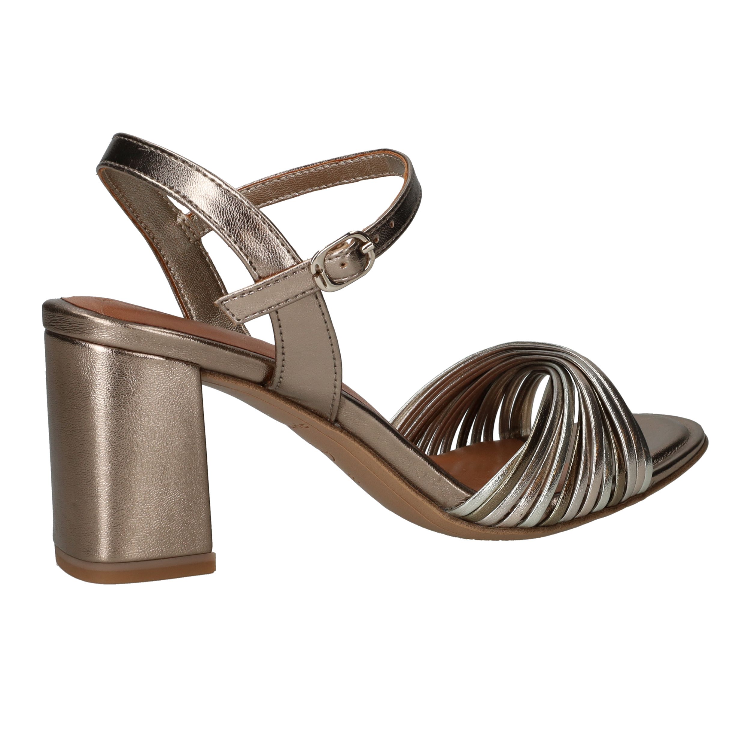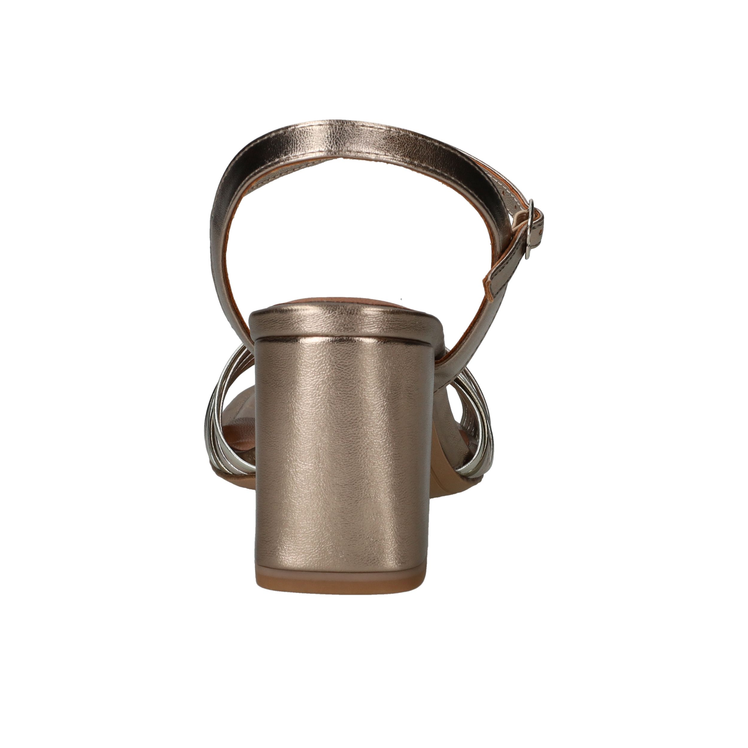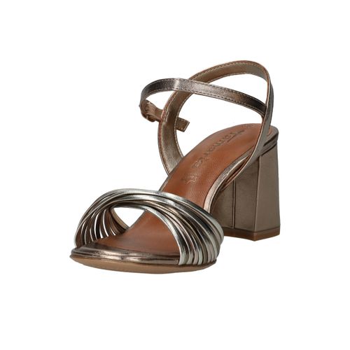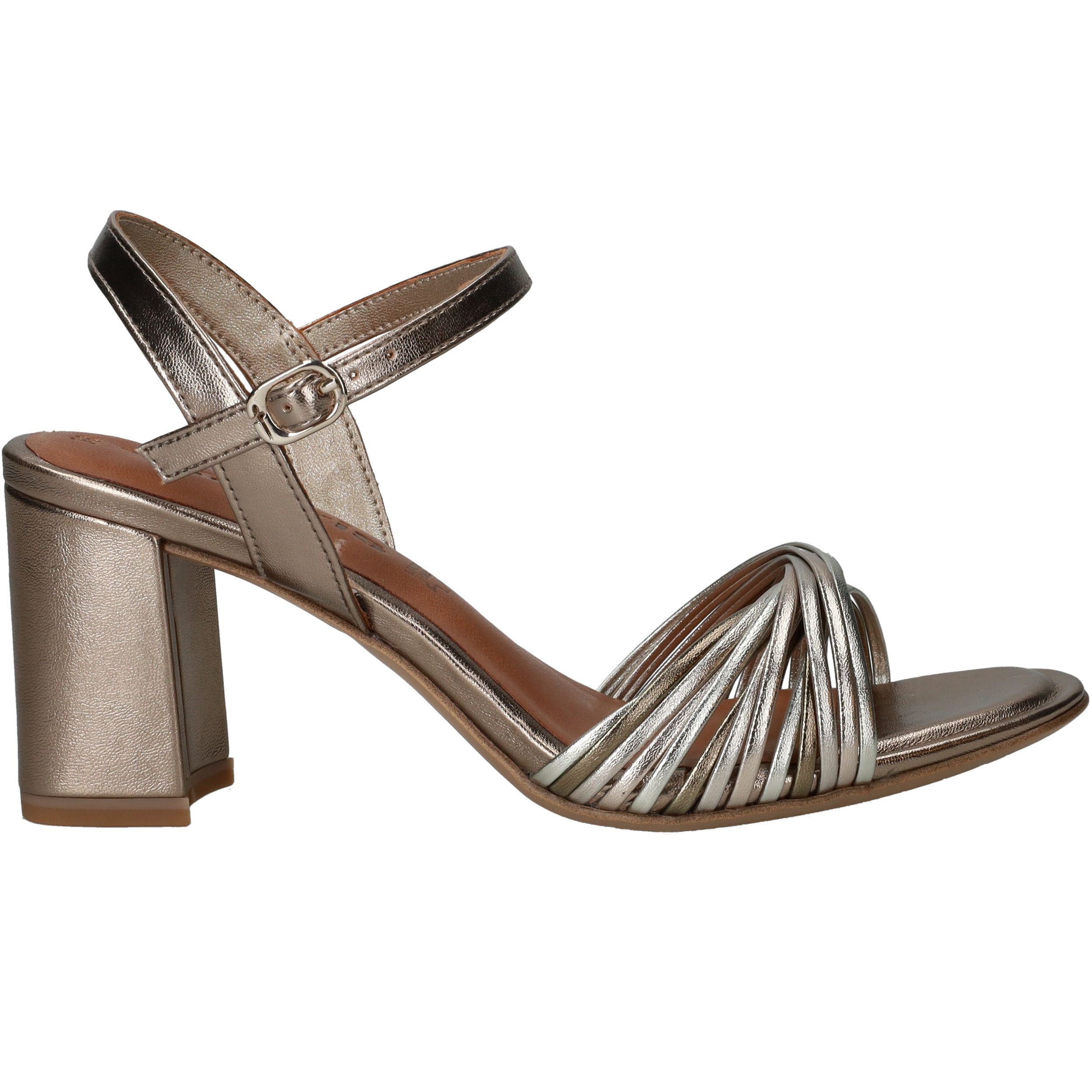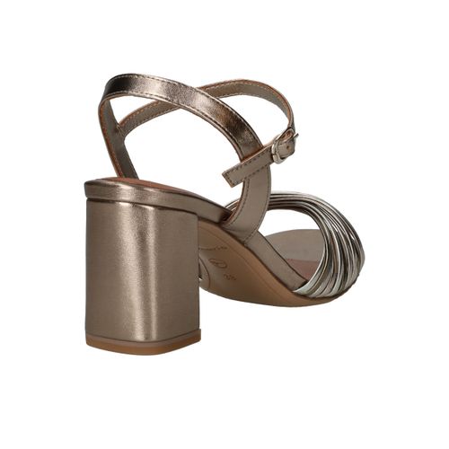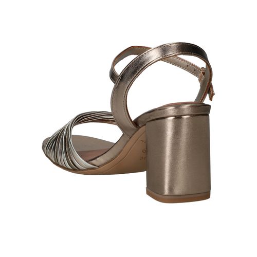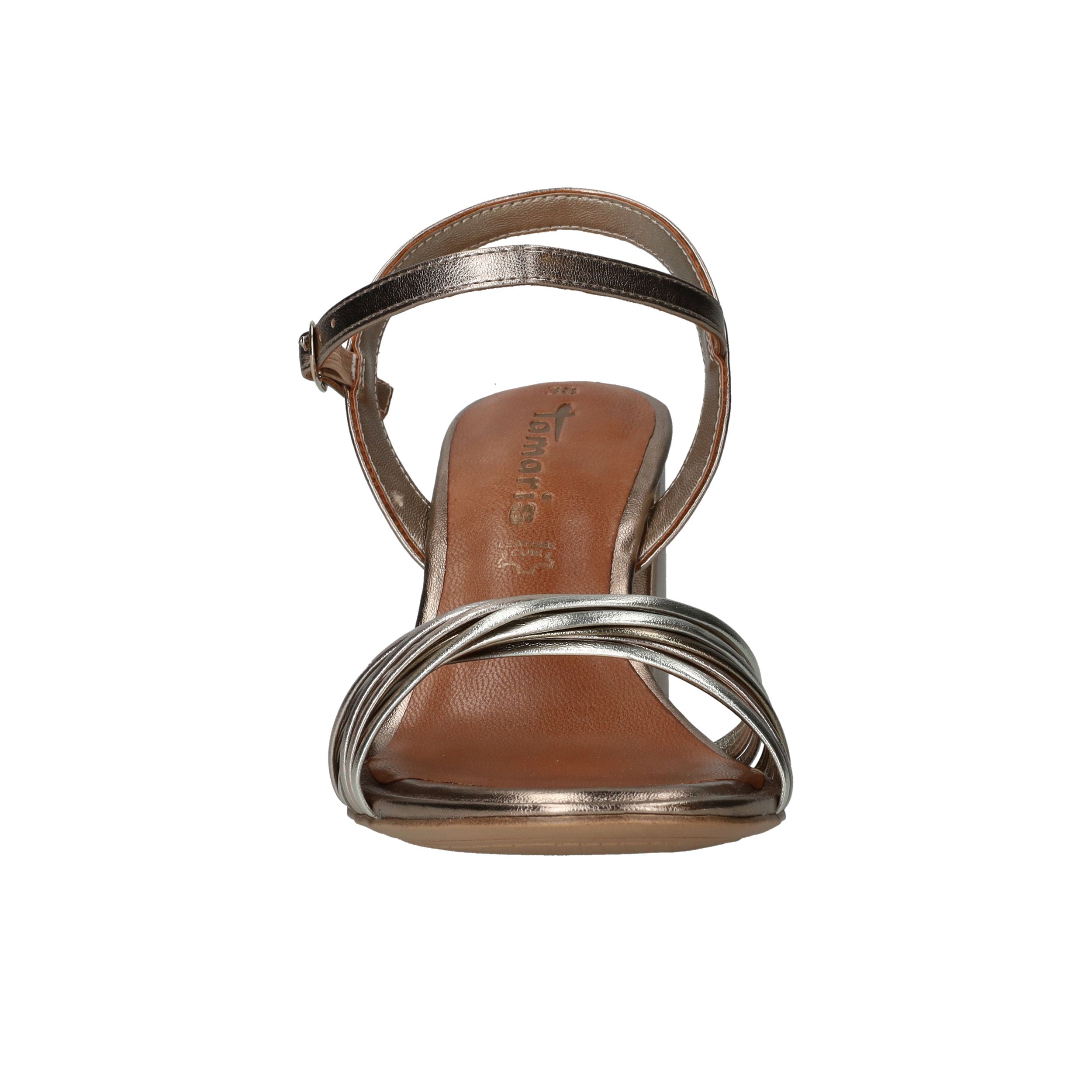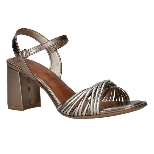 Deze Tamaris sandaal met hak heeft bandjes in verschillende metallic kleuren.