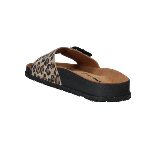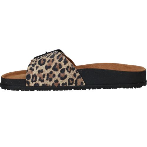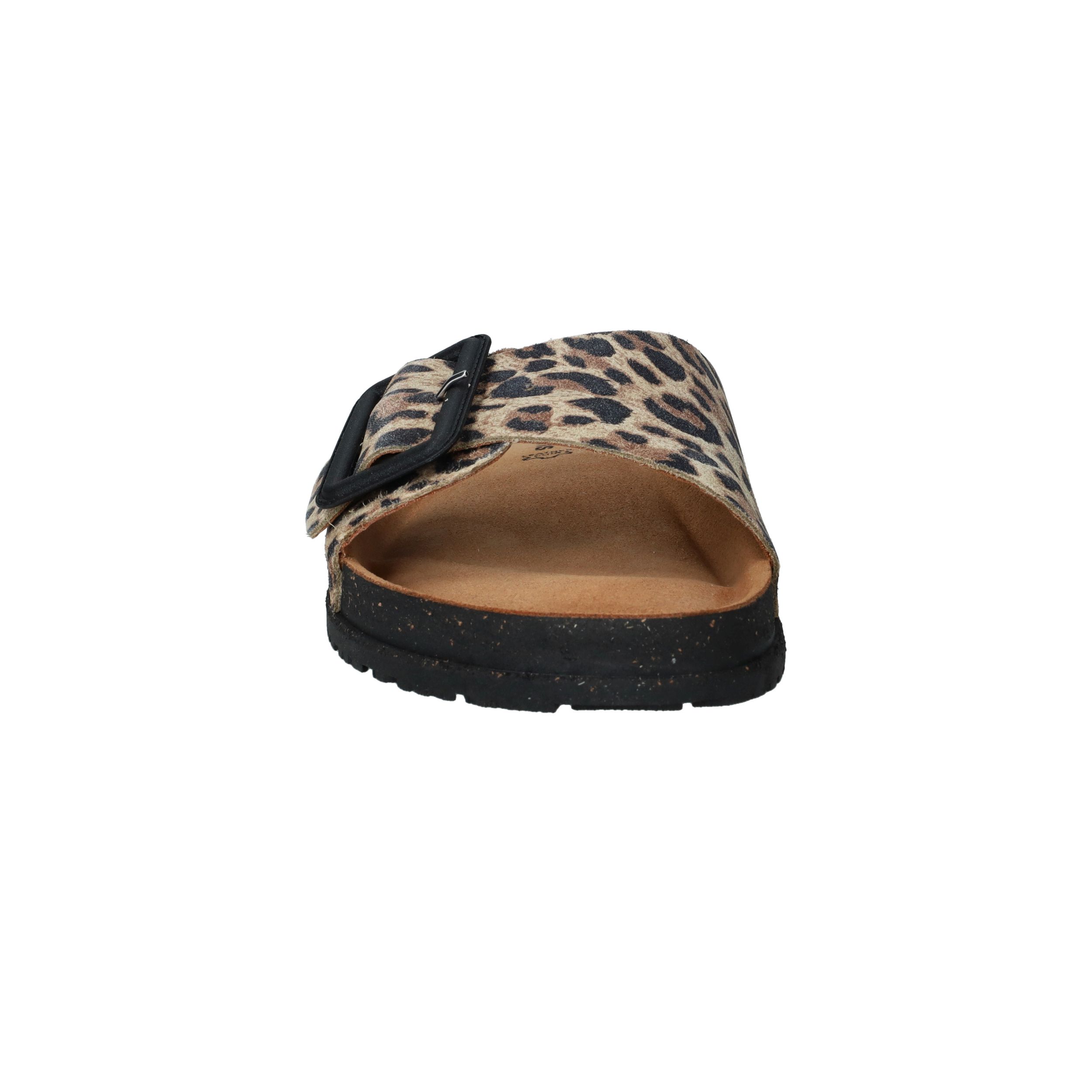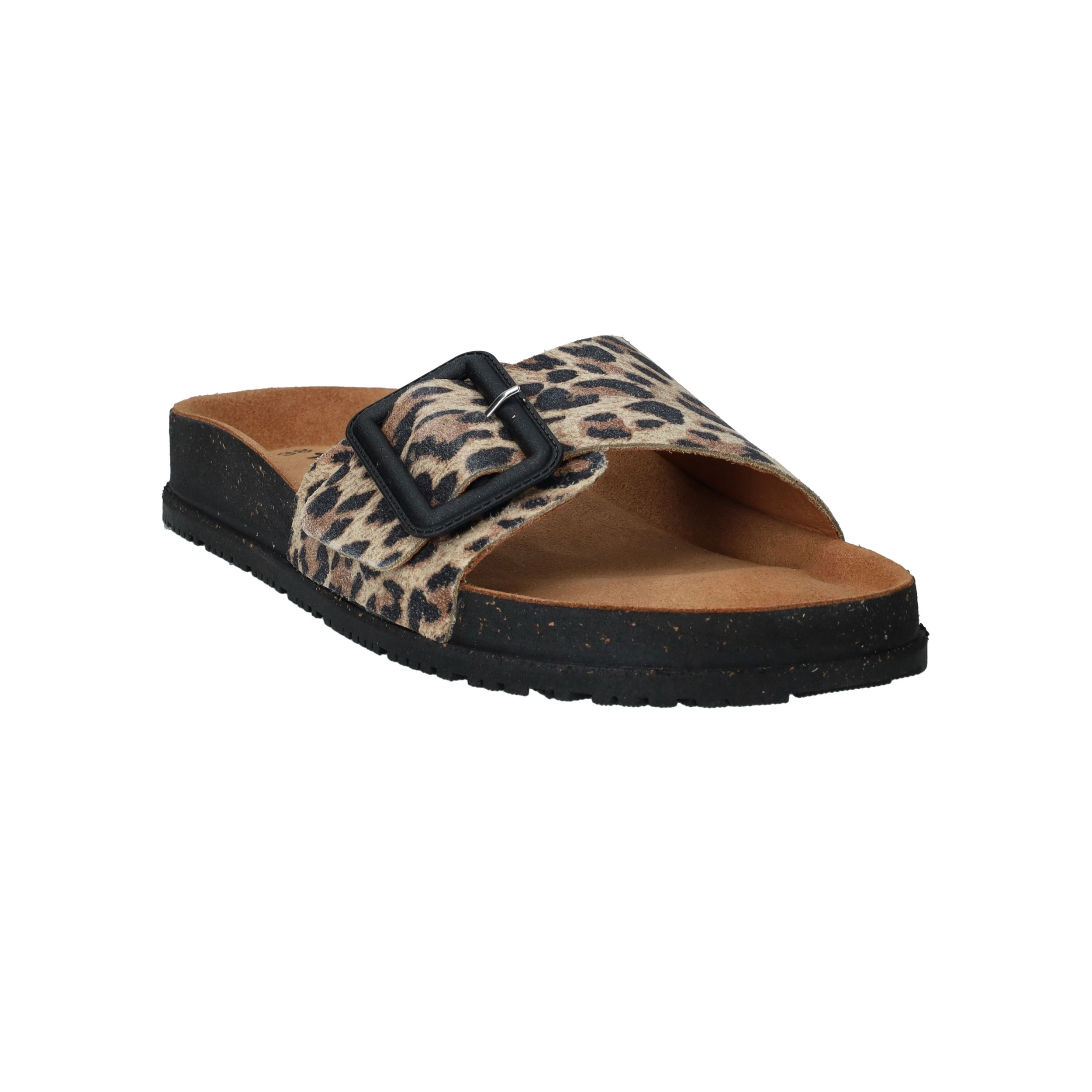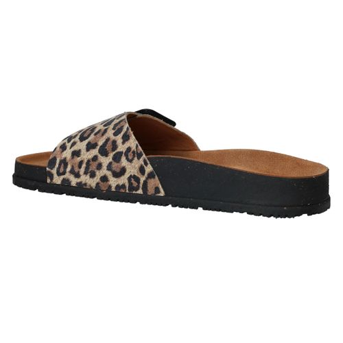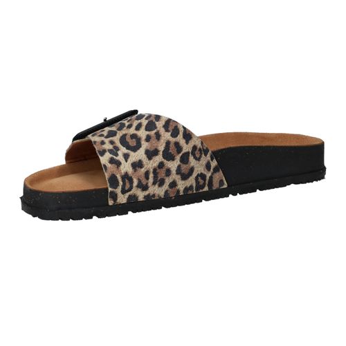 - Gemaakt van leer met luipaardprint en lichte kurk-look zool
