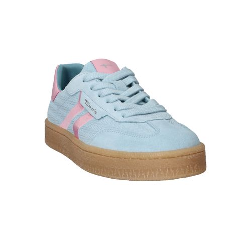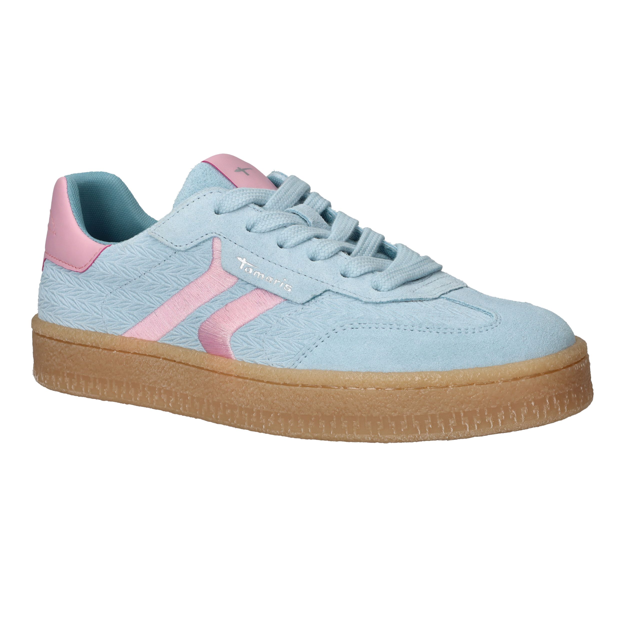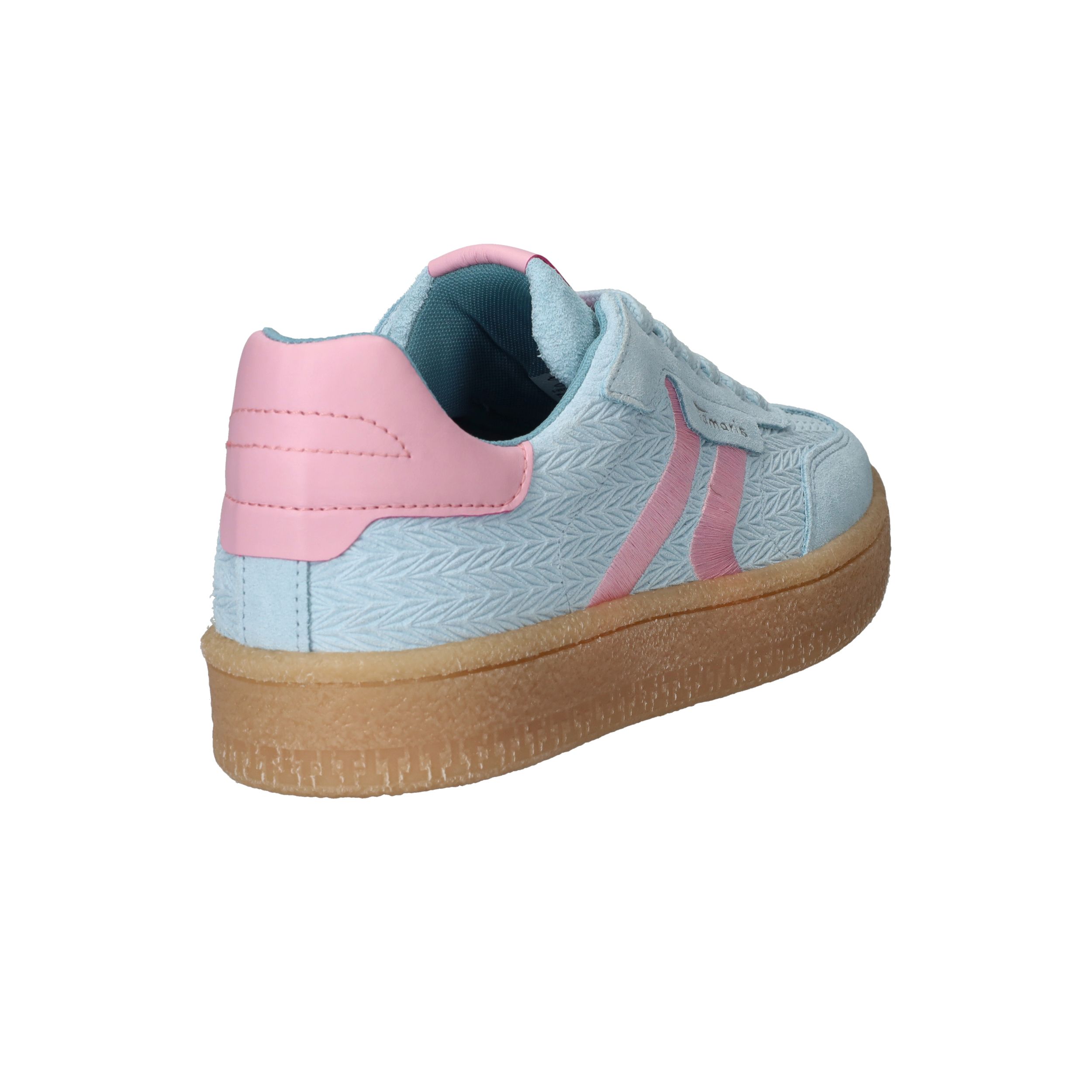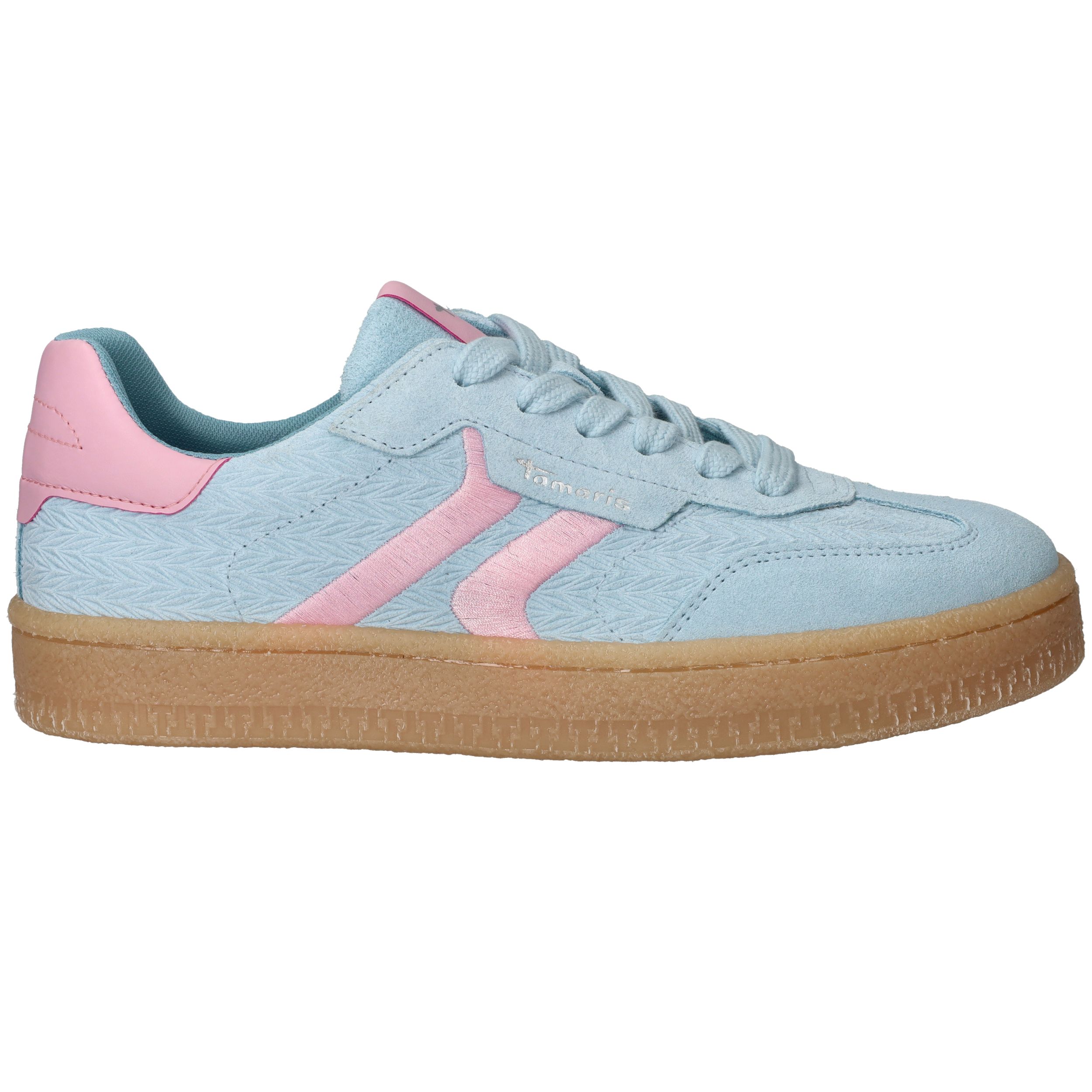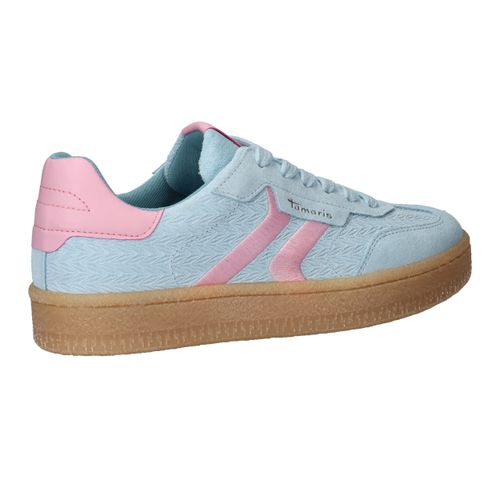 Deze Tamaris sneaker heeft echt een tof reliëf van suède! De damessneaker heeft een gave kleurencombi van lichtblauw en roze.