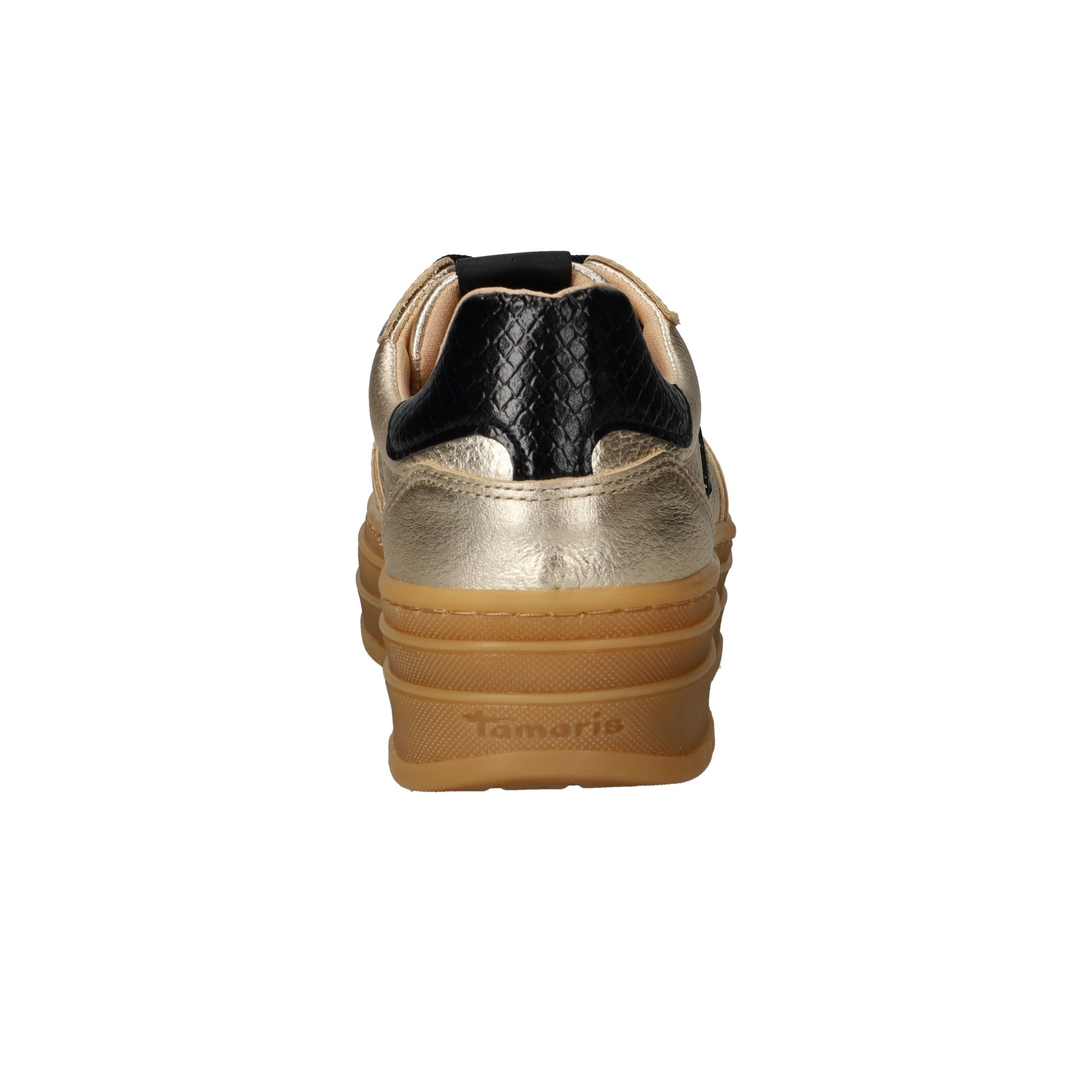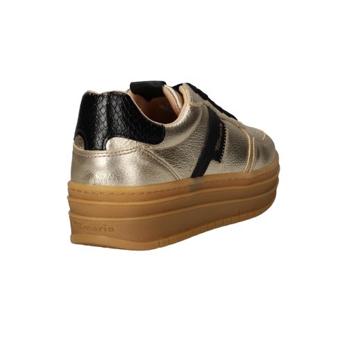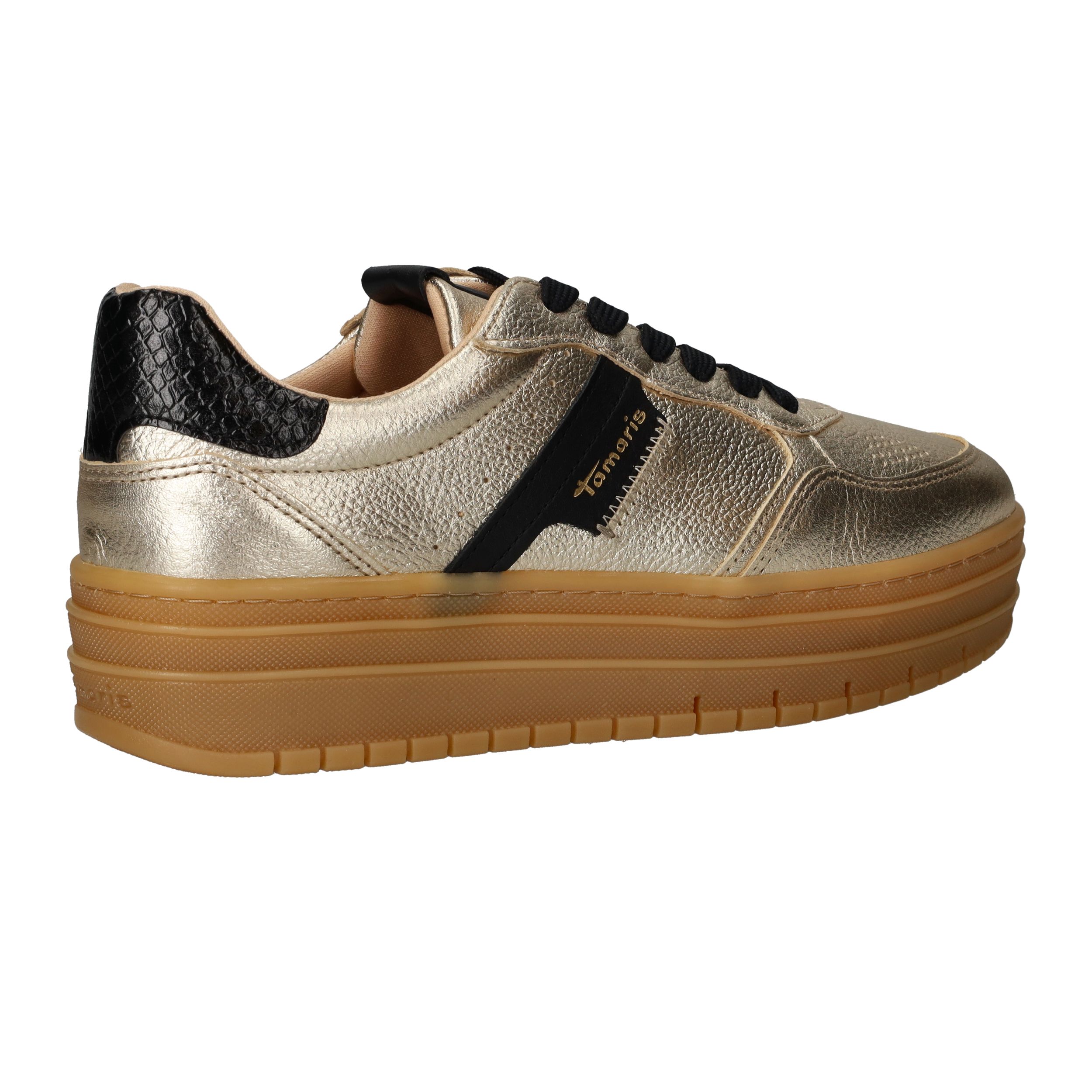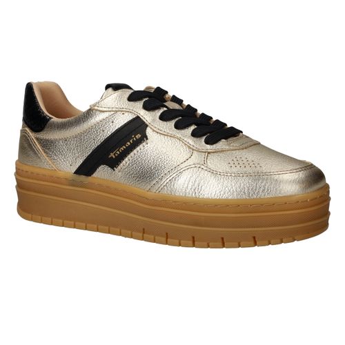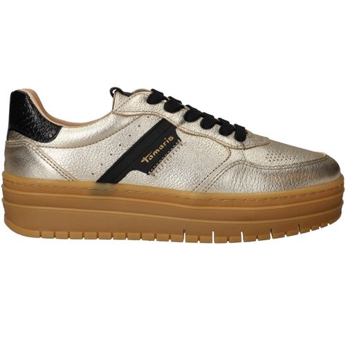 Met deze opvallende gouden sneakers van Tamaris maak je gegarandeerd een stijlstatement. Het glanzende metallic materiaal en de sportieve vorm geven deze sneaker een unieke en modieuze uitstraling. De comfortabele voering van textiel en stevige vetersluiting zorgen voor een fijne pasvorm. Perfect voor dames die houden van mode én gemak.