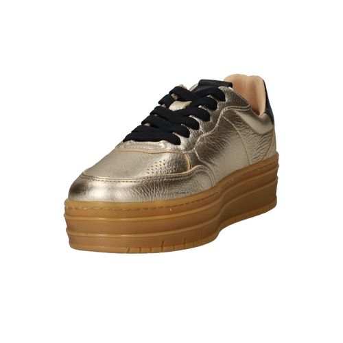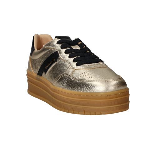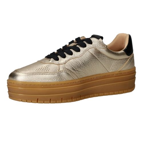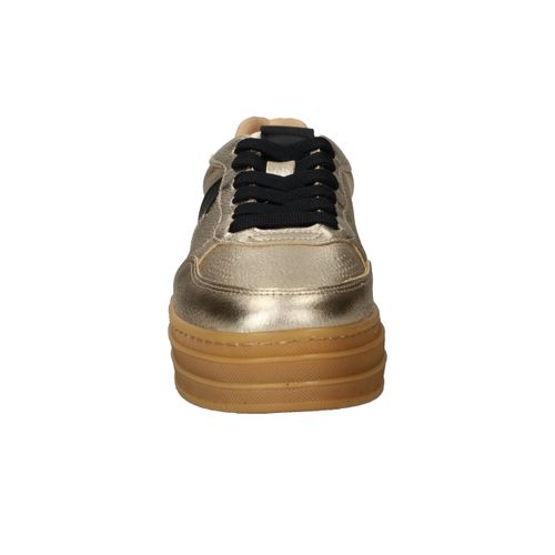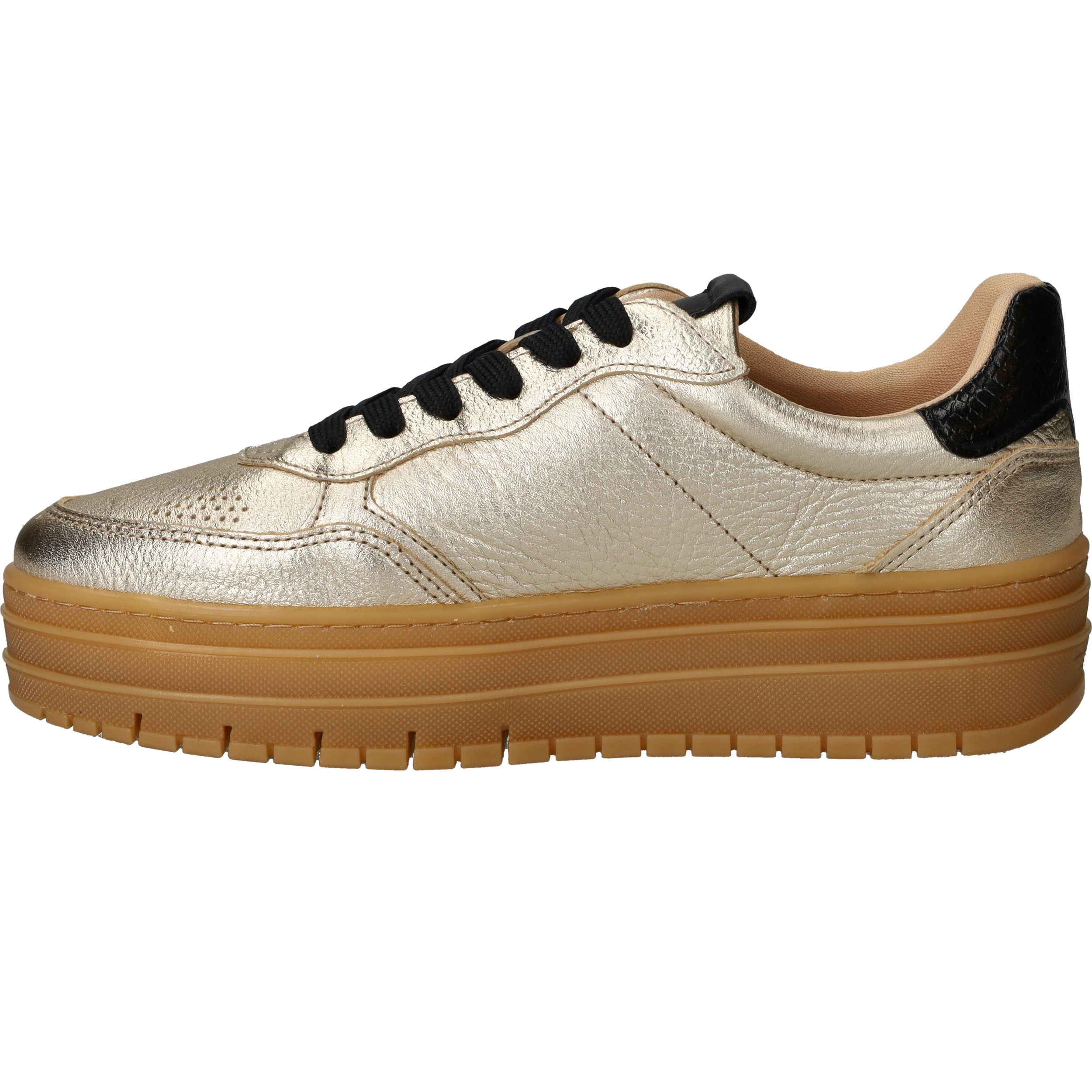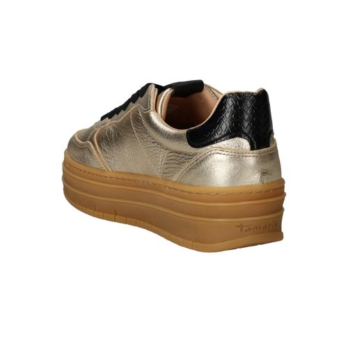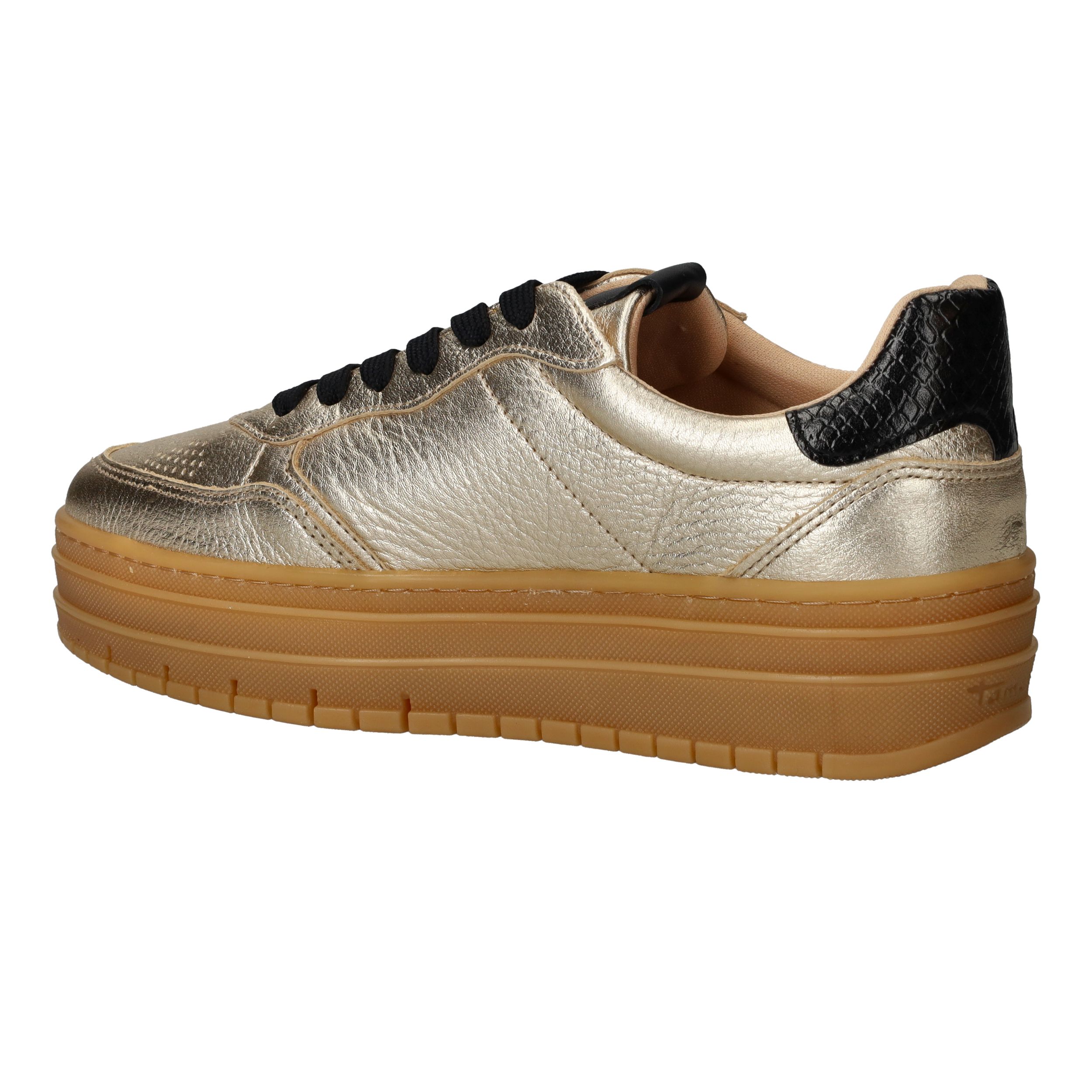 Met deze opvallende gouden sneakers van Tamaris maak je gegarandeerd een stijlstatement. Het glanzende metallic materiaal en de sportieve vorm geven deze sneaker een unieke en modieuze uitstraling. De comfortabele voering van textiel en stevige vetersluiting zorgen voor een fijne pasvorm. Perfect voor dames die houden van mode én gemak.
