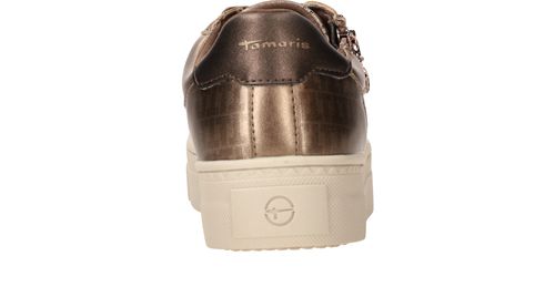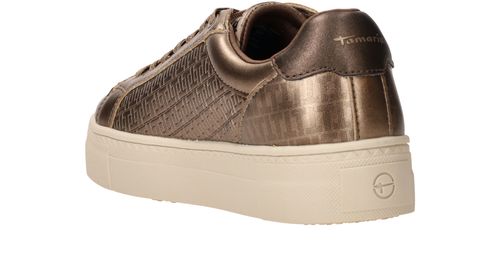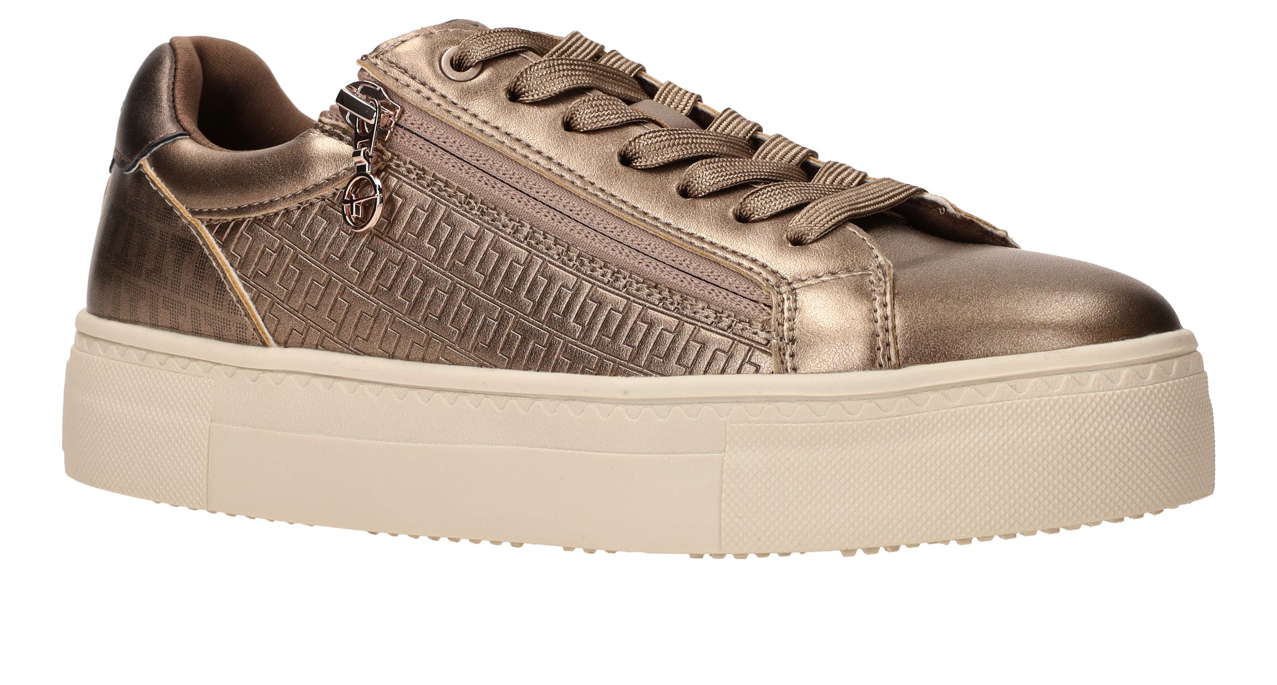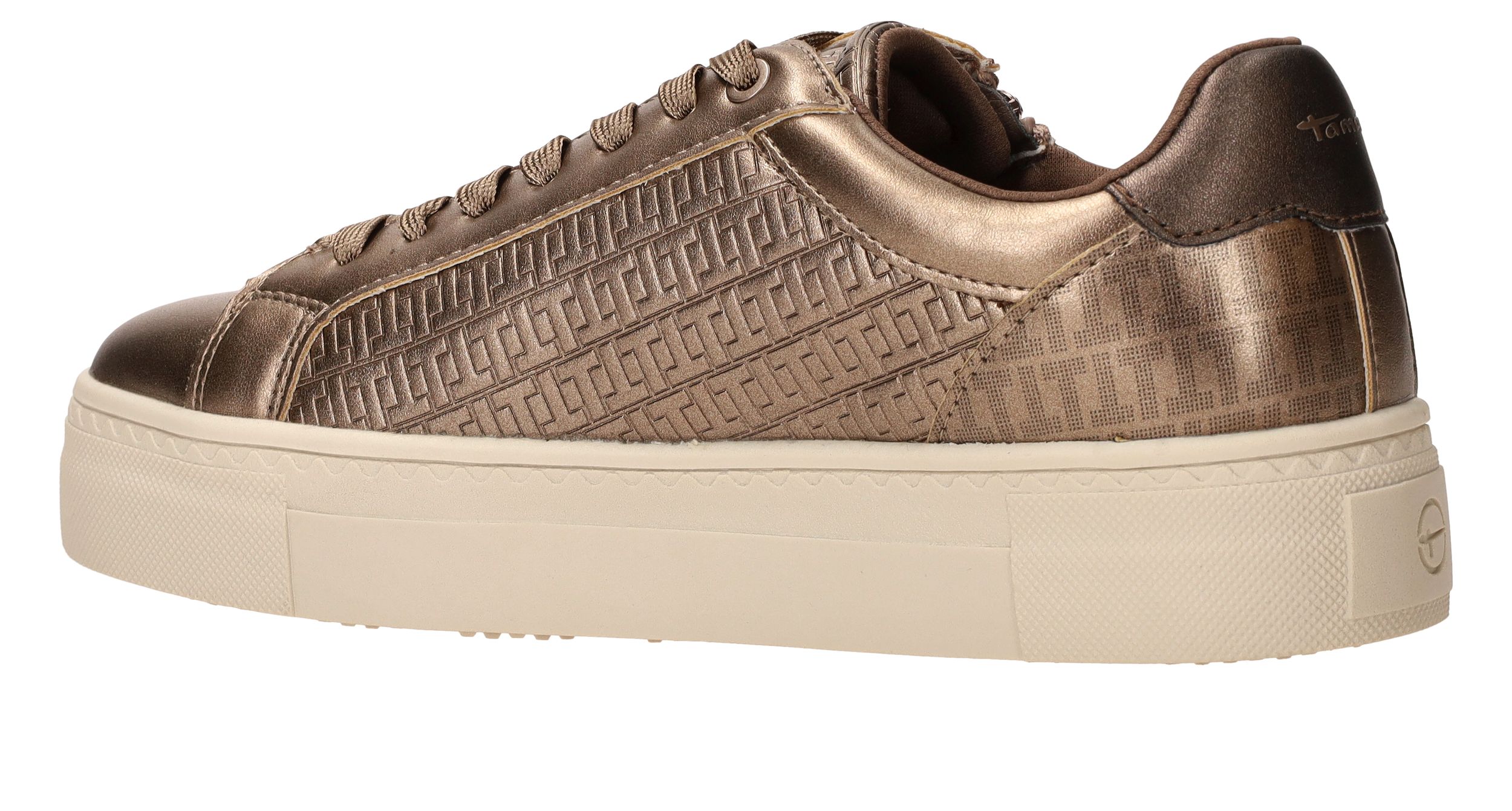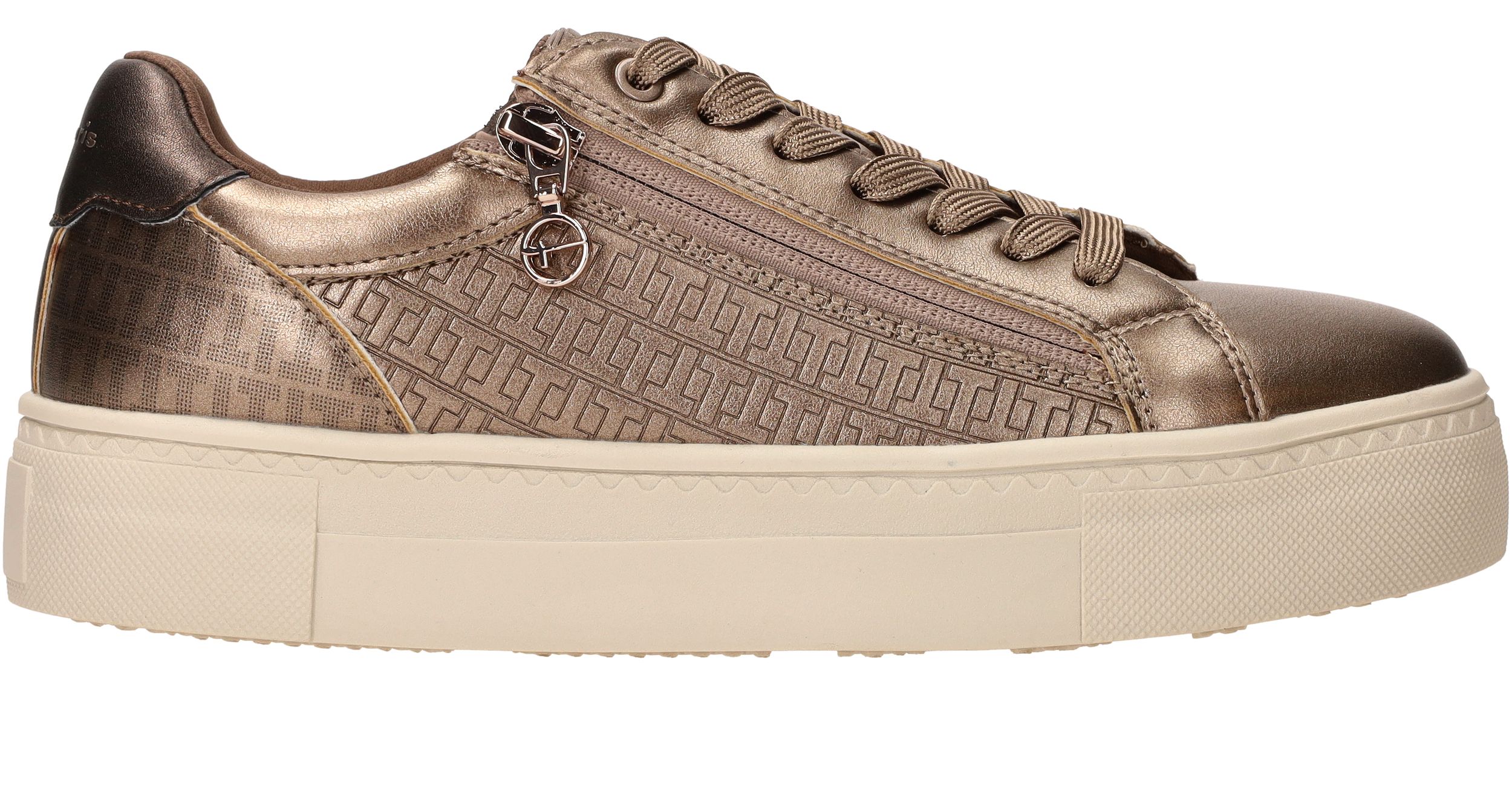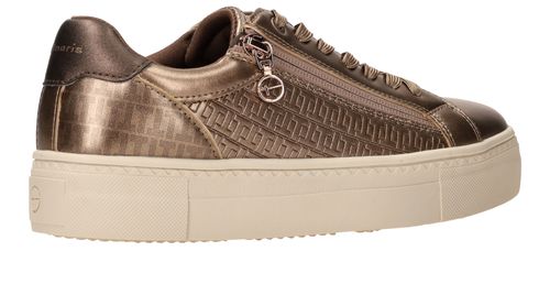 Trendy Tamaris platform sneaker in een gave metallic taupe kleur. Je stapt makkelijk in de schoen door de veter- en ritssluiting en de schoen is gemaakt van vegan materiaal.