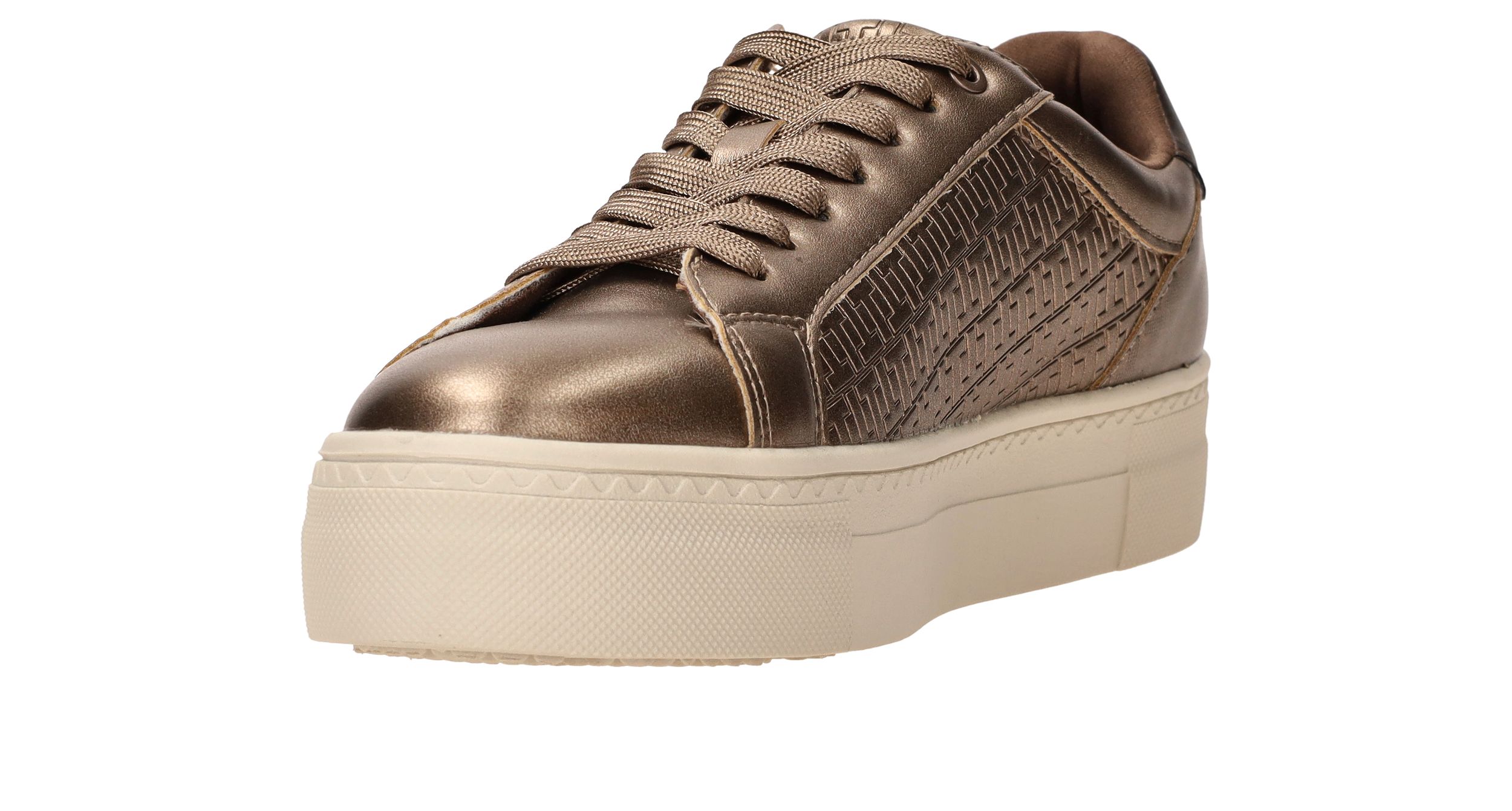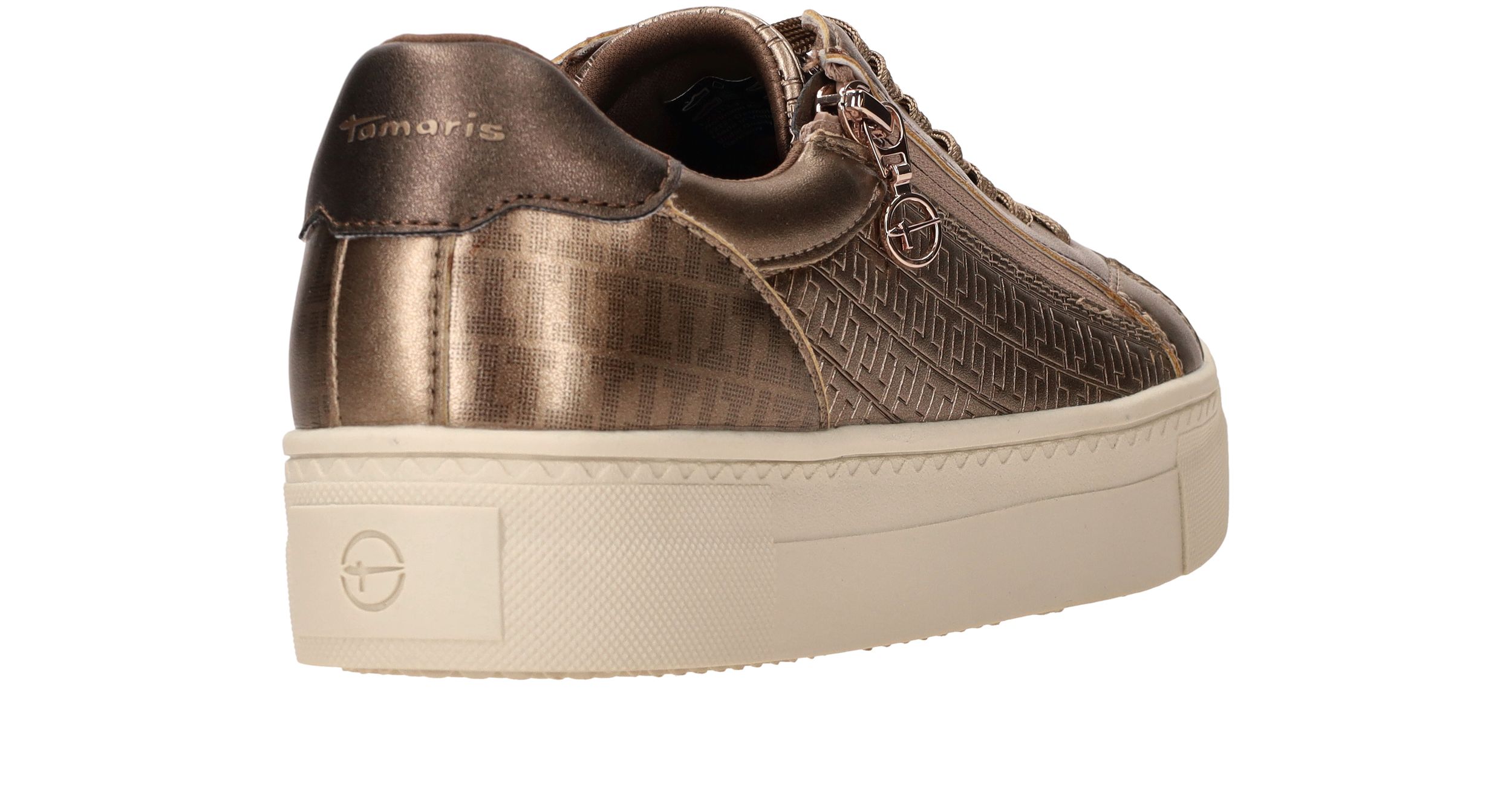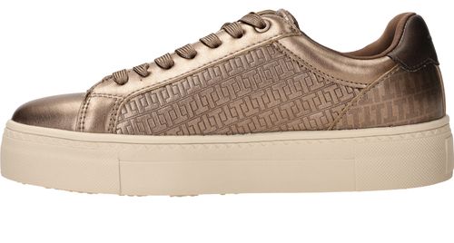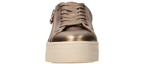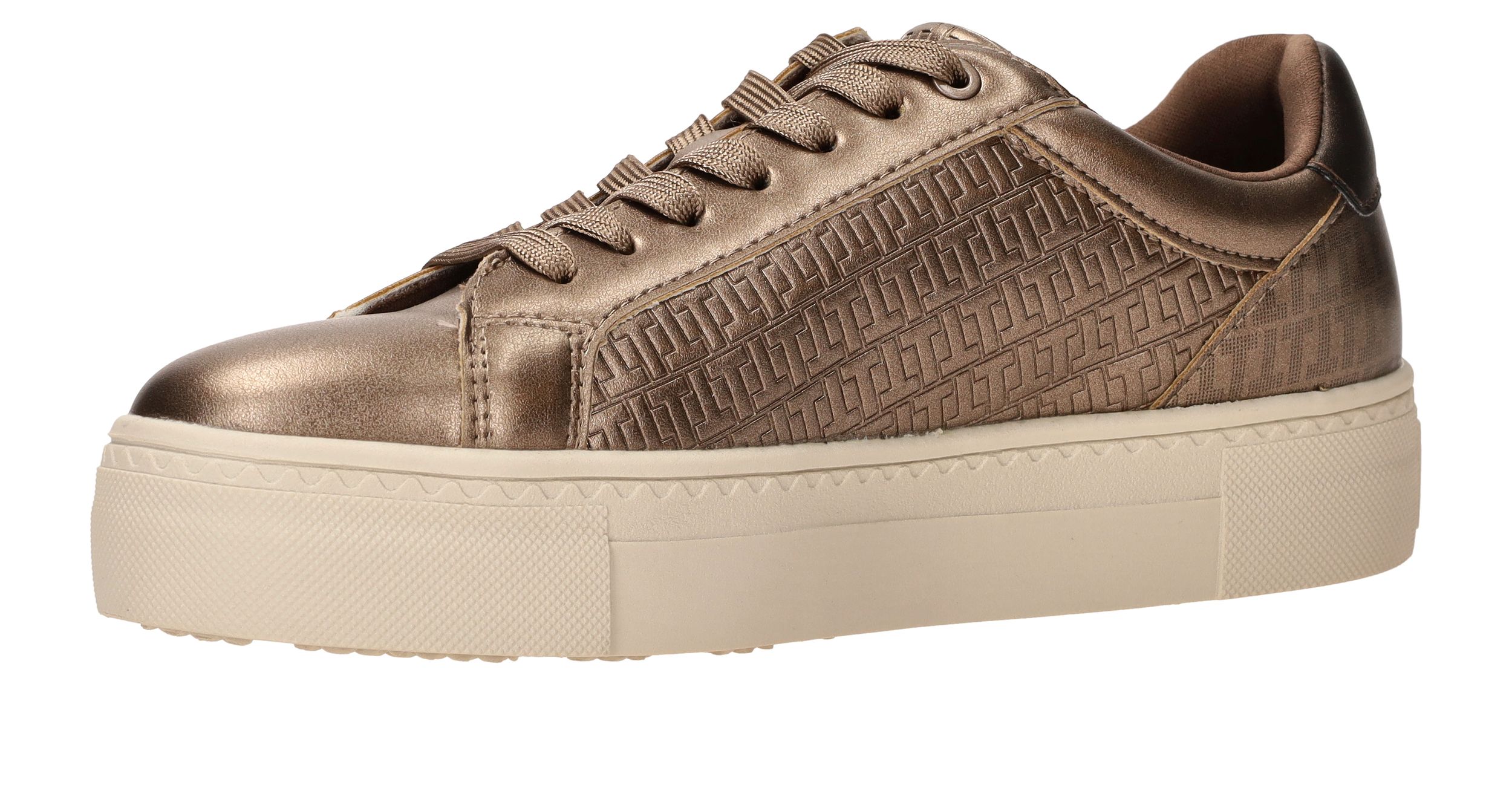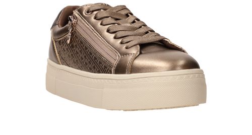 Trendy Tamaris platform sneaker in een gave metallic taupe kleur. Je stapt makkelijk in de schoen door de veter- en ritssluiting en de schoen is gemaakt van vegan materiaal.