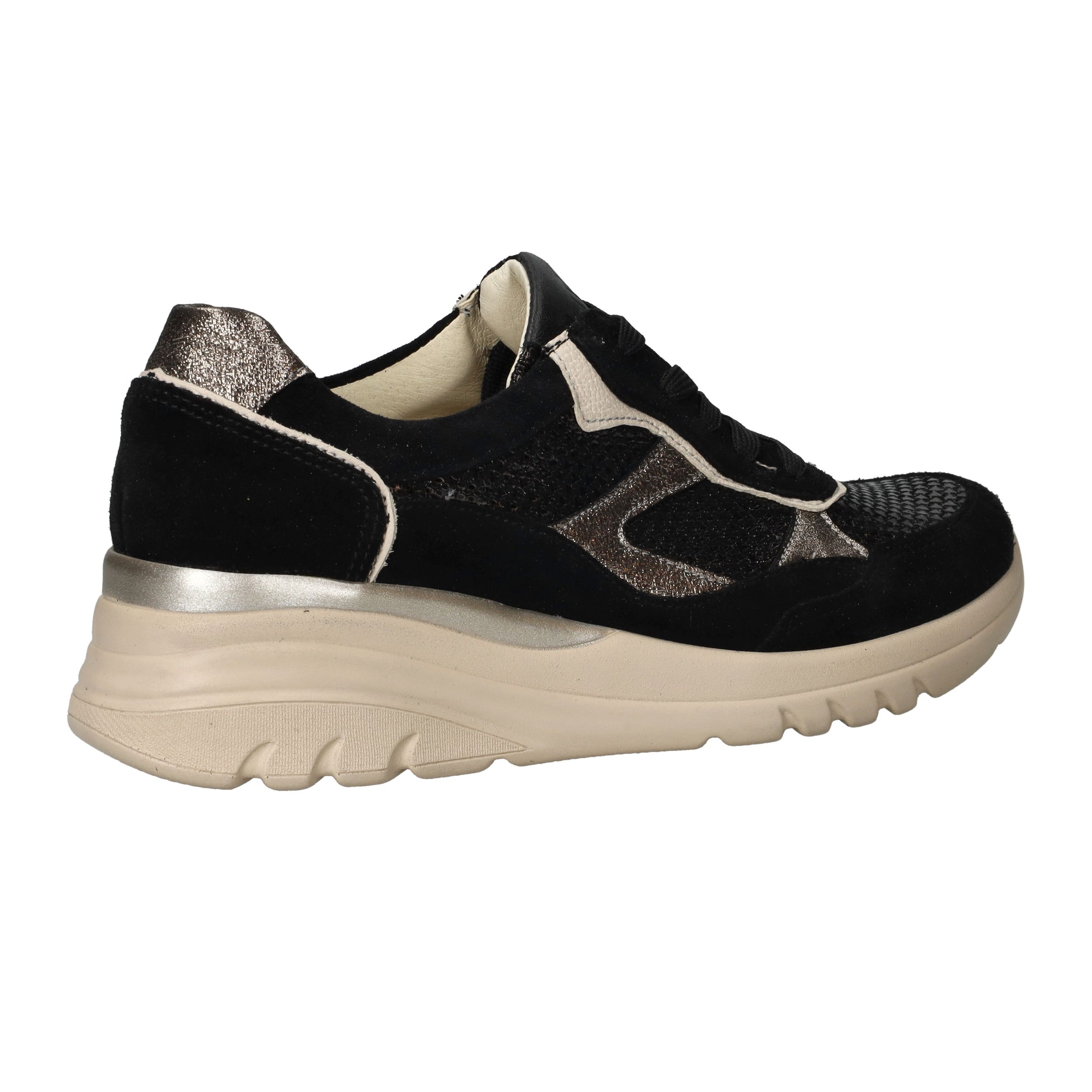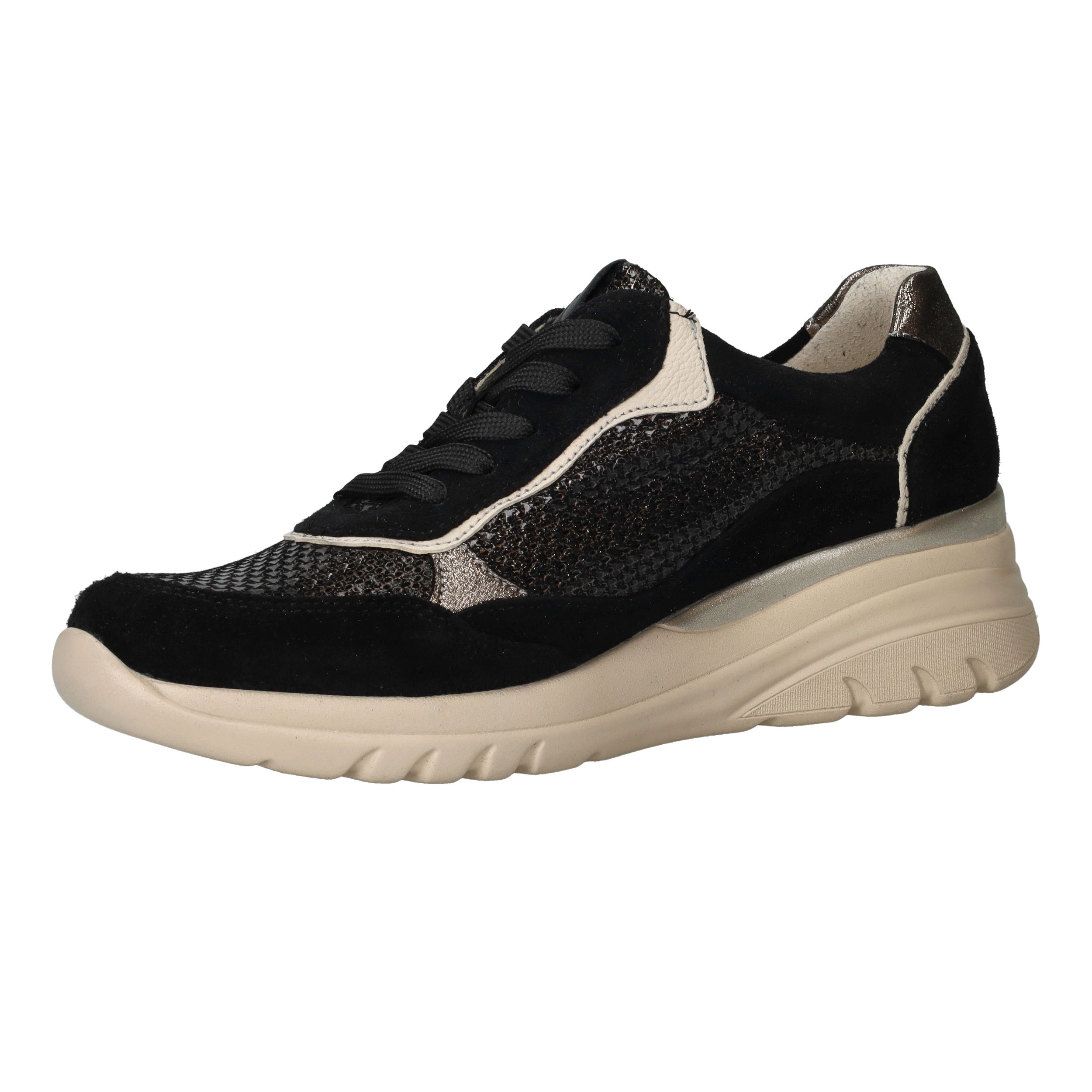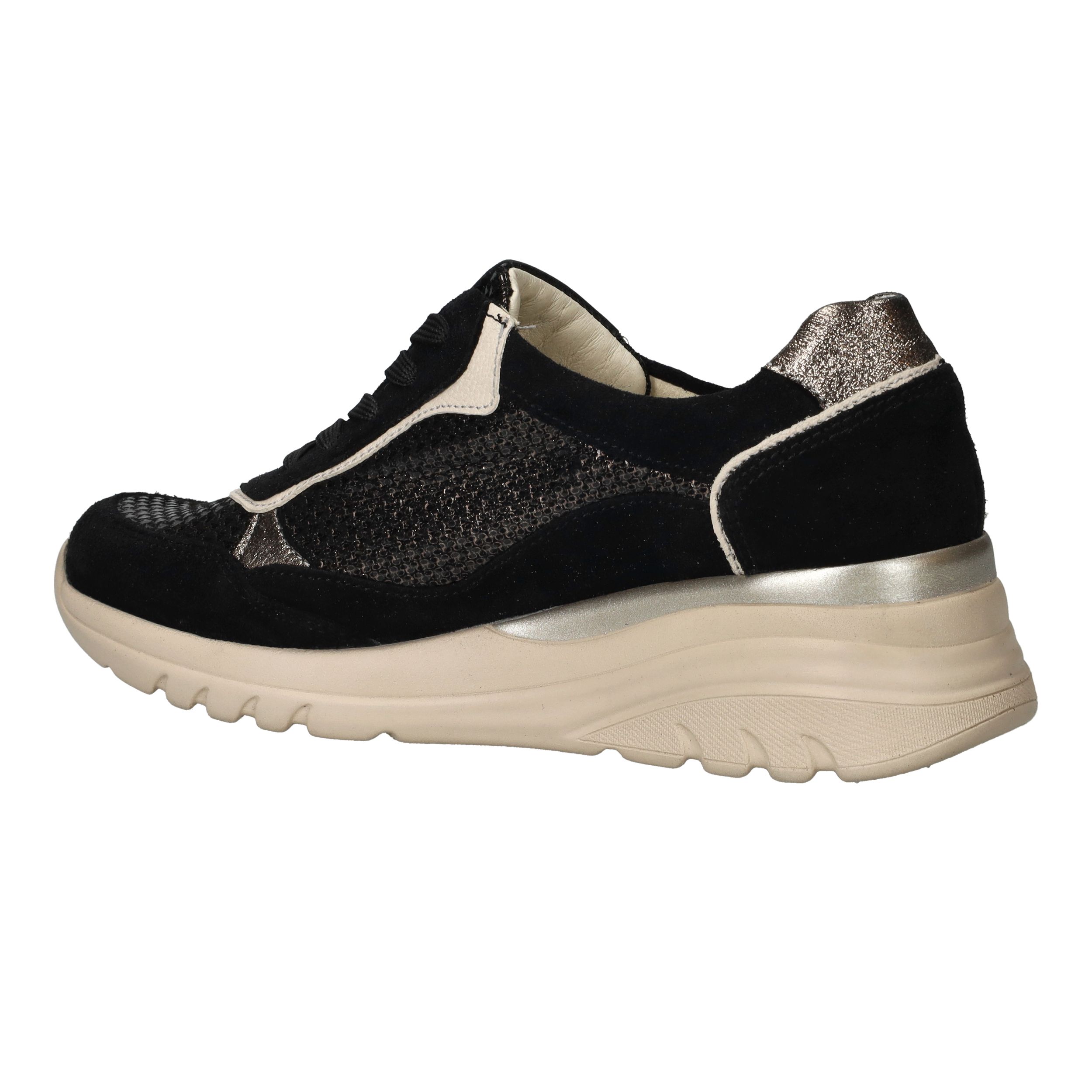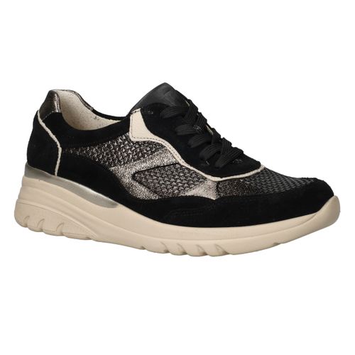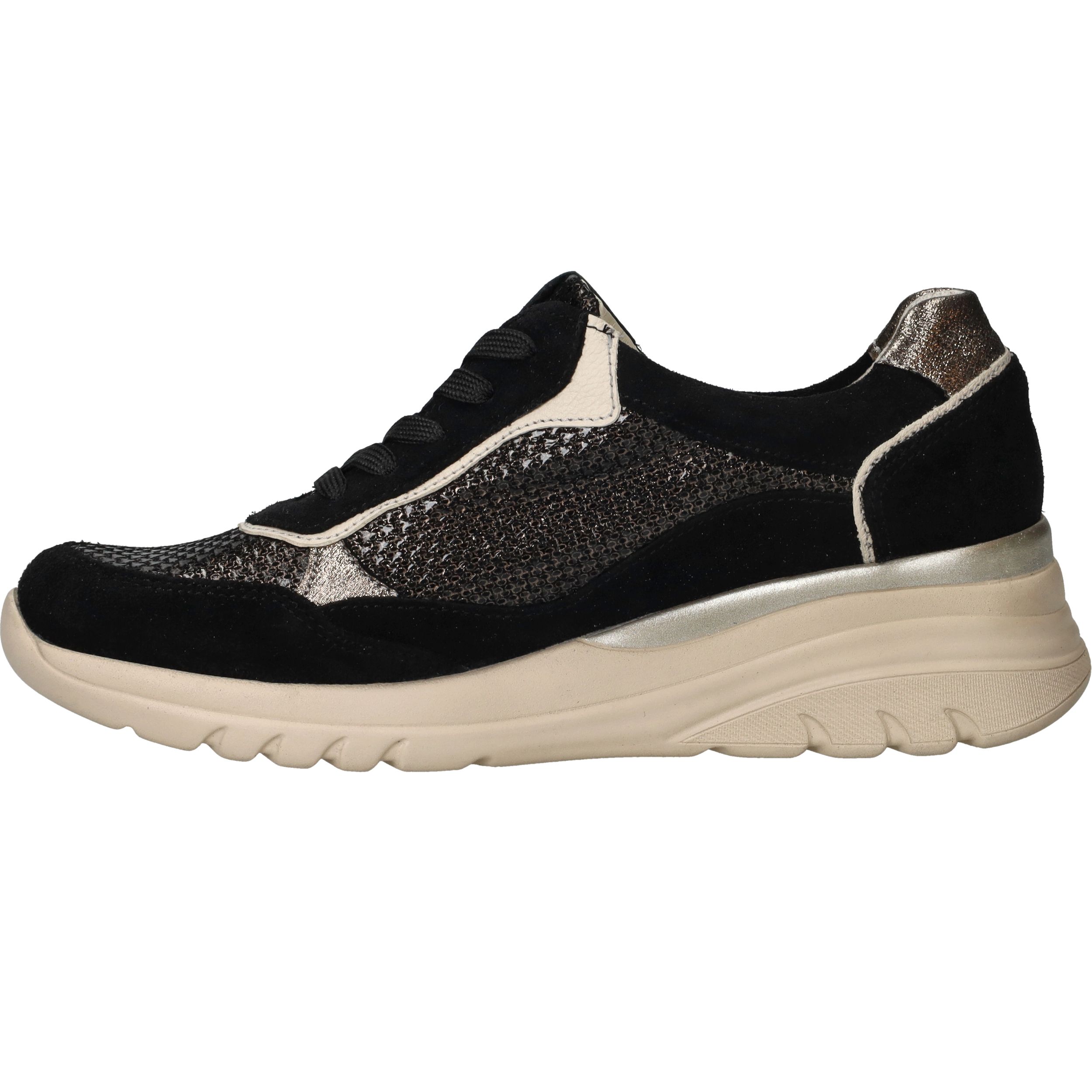 Deze zwarte Waldlaufer Carla sneakers met voetbreedte H zijn een stijlvolle mix van luxe materialen en optimaal comfort. Het bovenwerk combineert zacht suède met glanzend metallic leer voor een moderne, chique uitstraling. Dankzij de voering van leer en textiel geniet je van een ademend en zacht binnenklimaat, waardoor deze sneaker perfect is voor dagelijks gebruik.