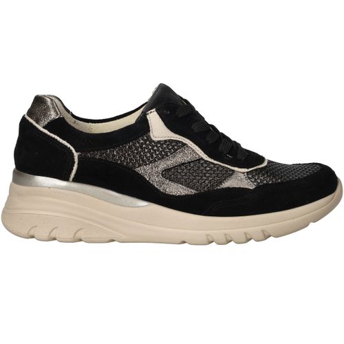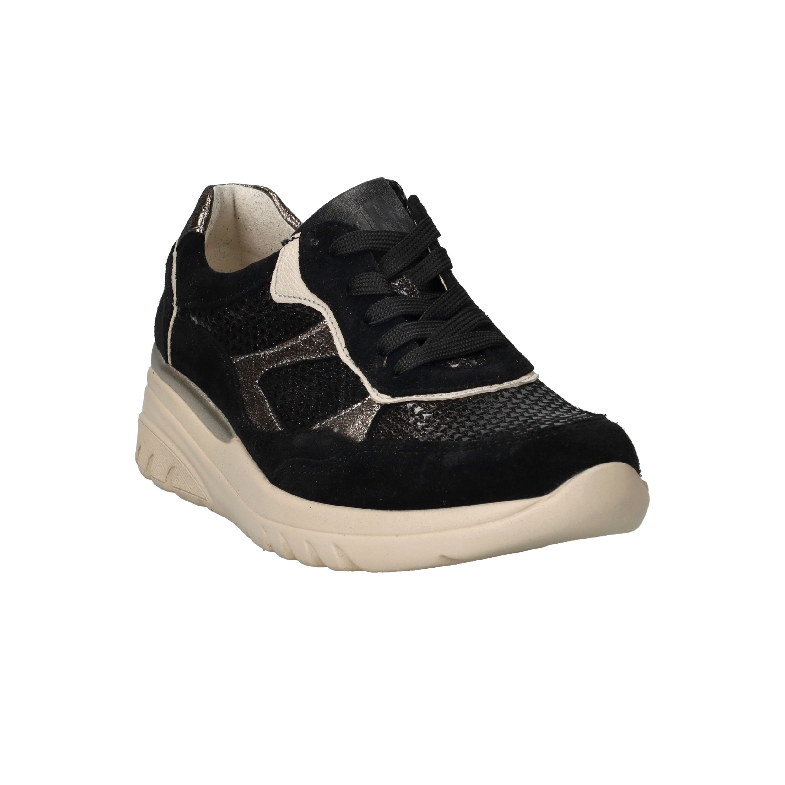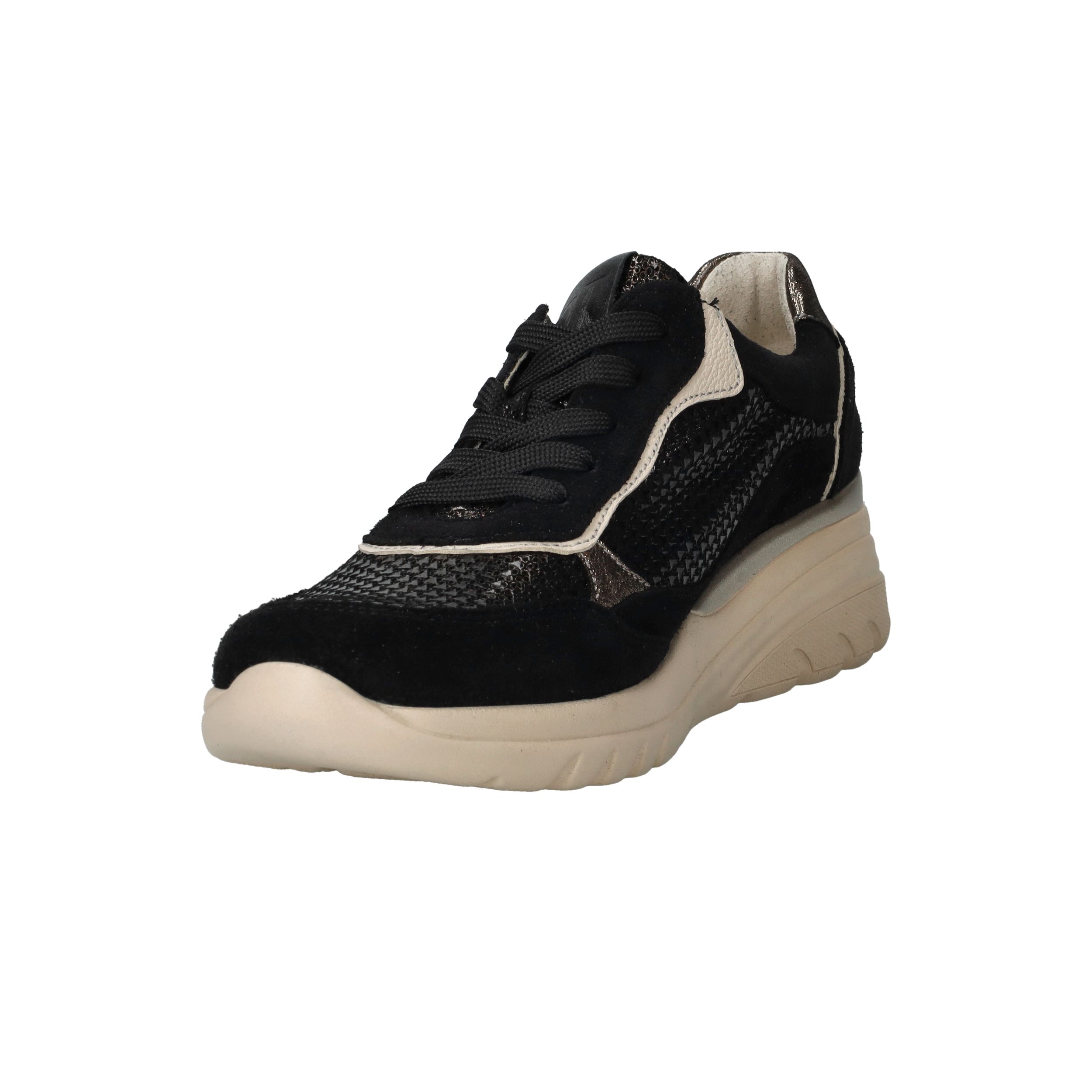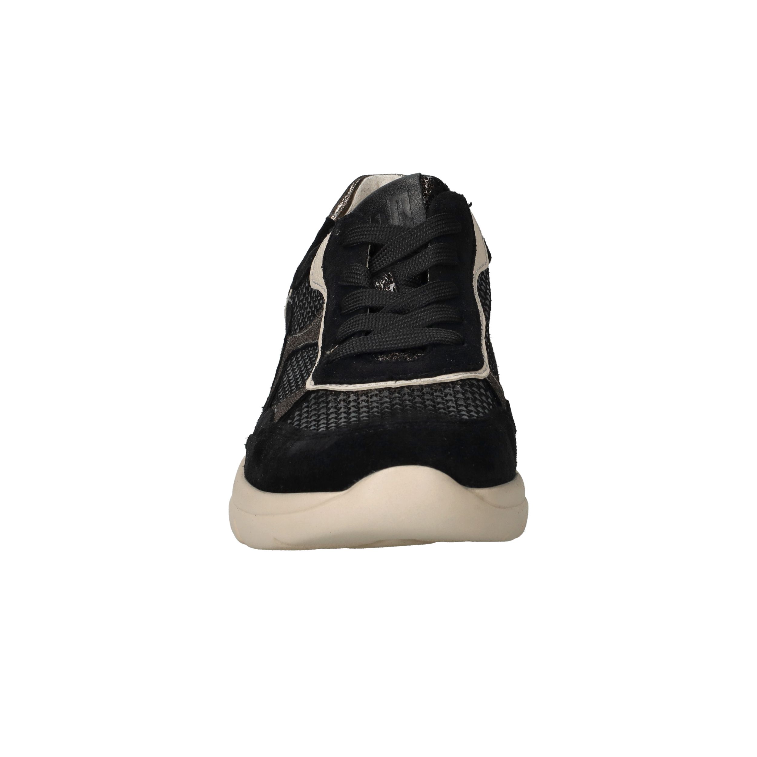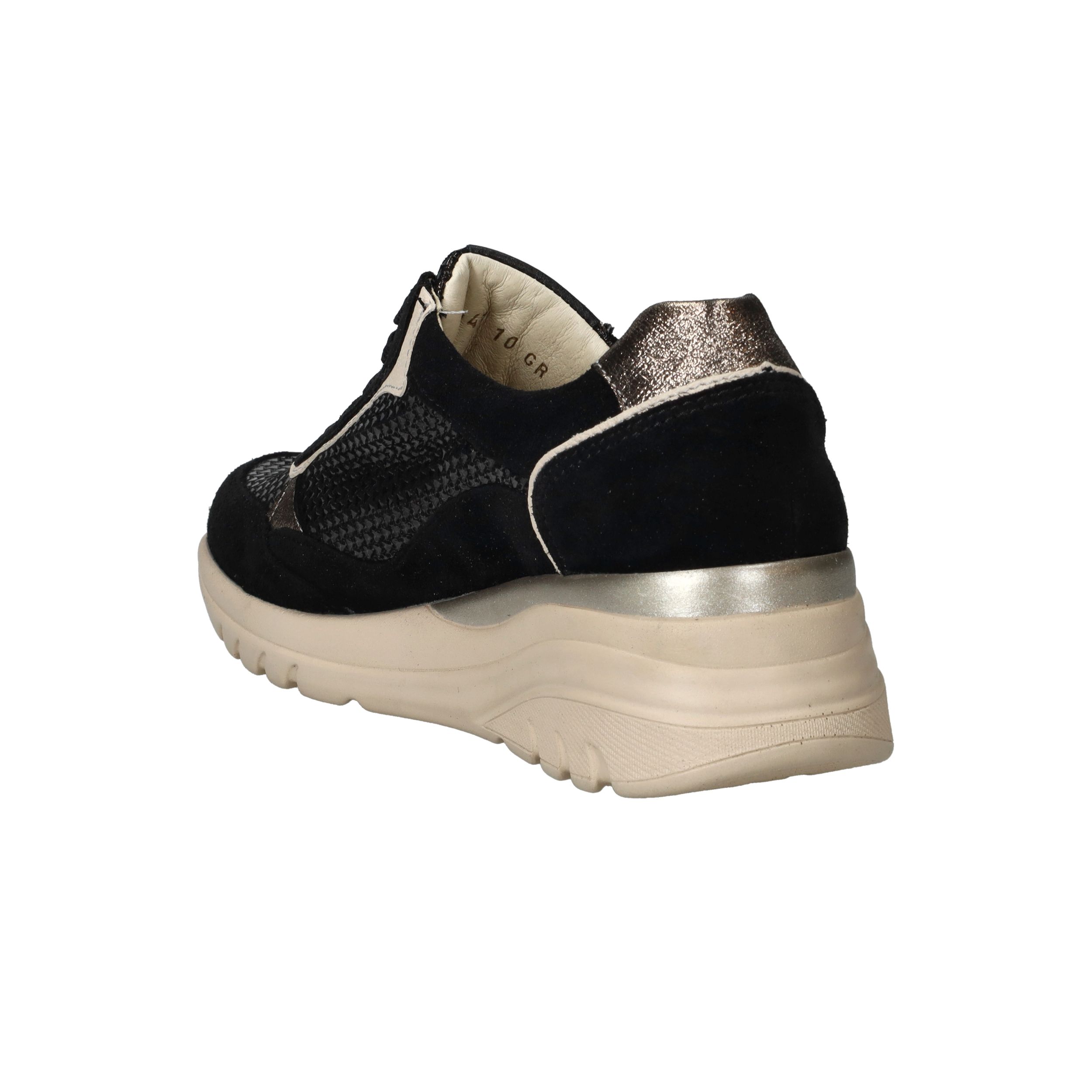 Deze zwarte Waldlaufer Carla sneakers met voetbreedte H zijn een stijlvolle mix van luxe materialen en optimaal comfort. Het bovenwerk combineert zacht suède met glanzend metallic leer voor een moderne, chique uitstraling. Dankzij de voering van leer en textiel geniet je van een ademend en zacht binnenklimaat, waardoor deze sneaker perfect is voor dagelijks gebruik.