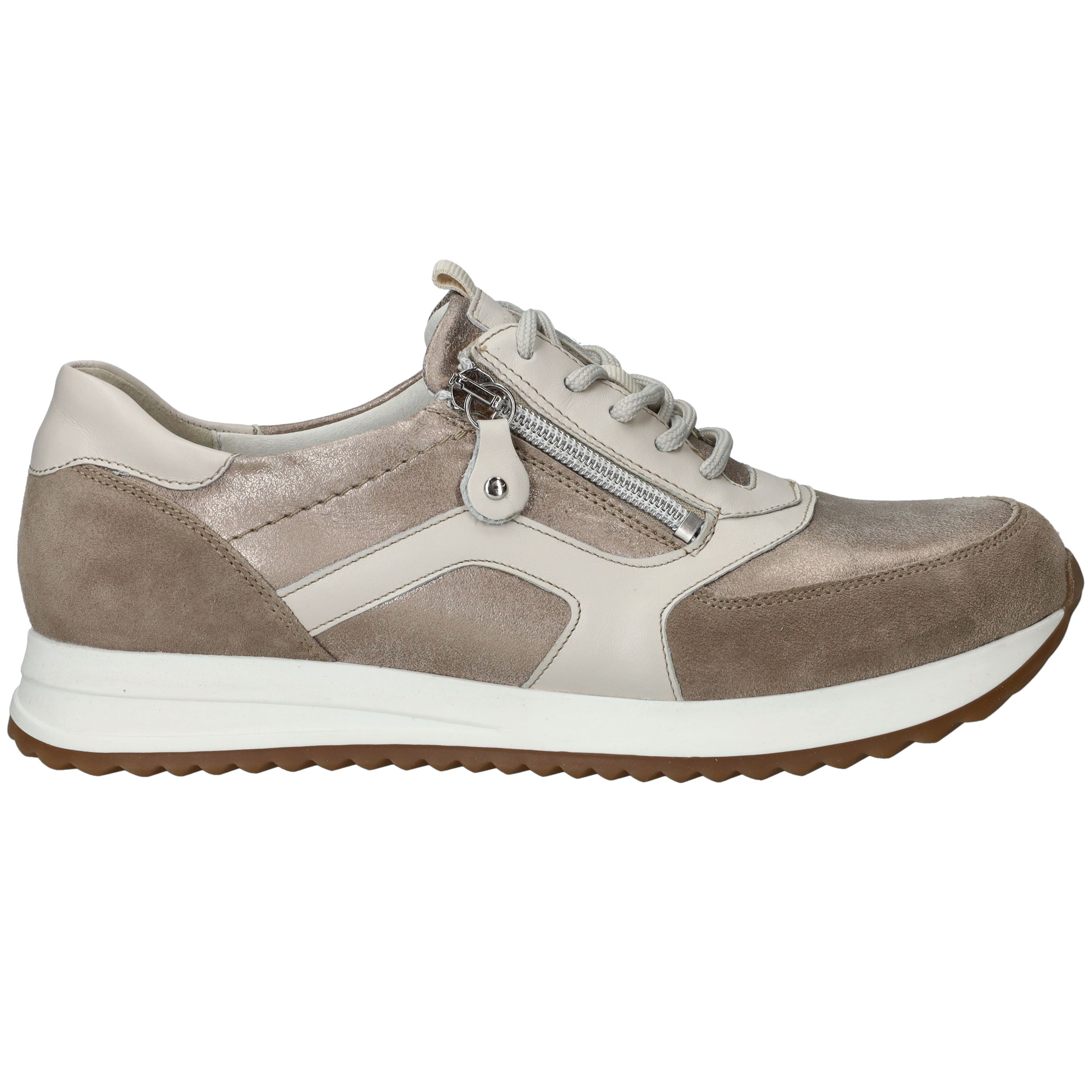 Met deze Waldlaufer Vicky sneaker maak je iedere outfit af! De beige damessneaker is gemaakt van suede en metallic leer.