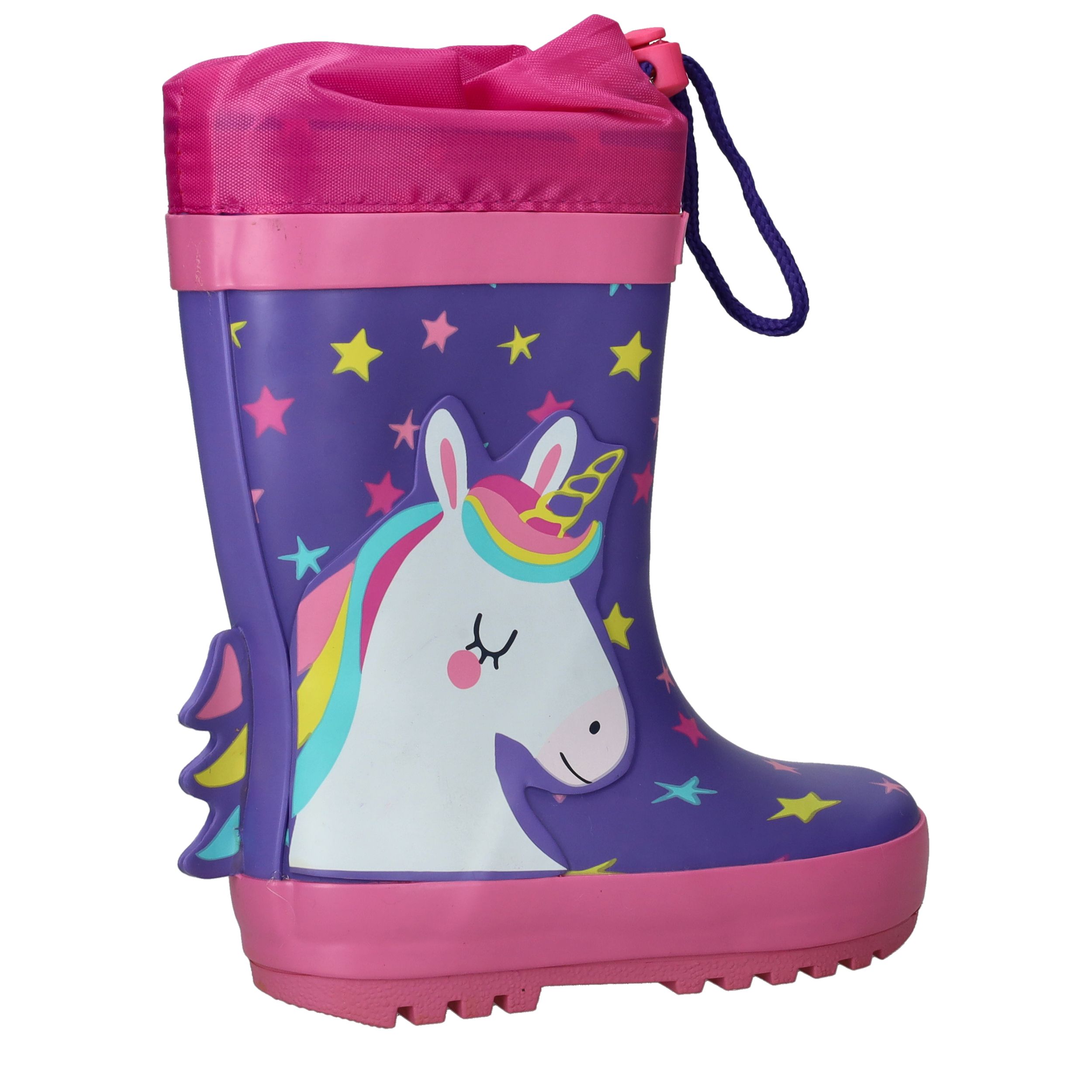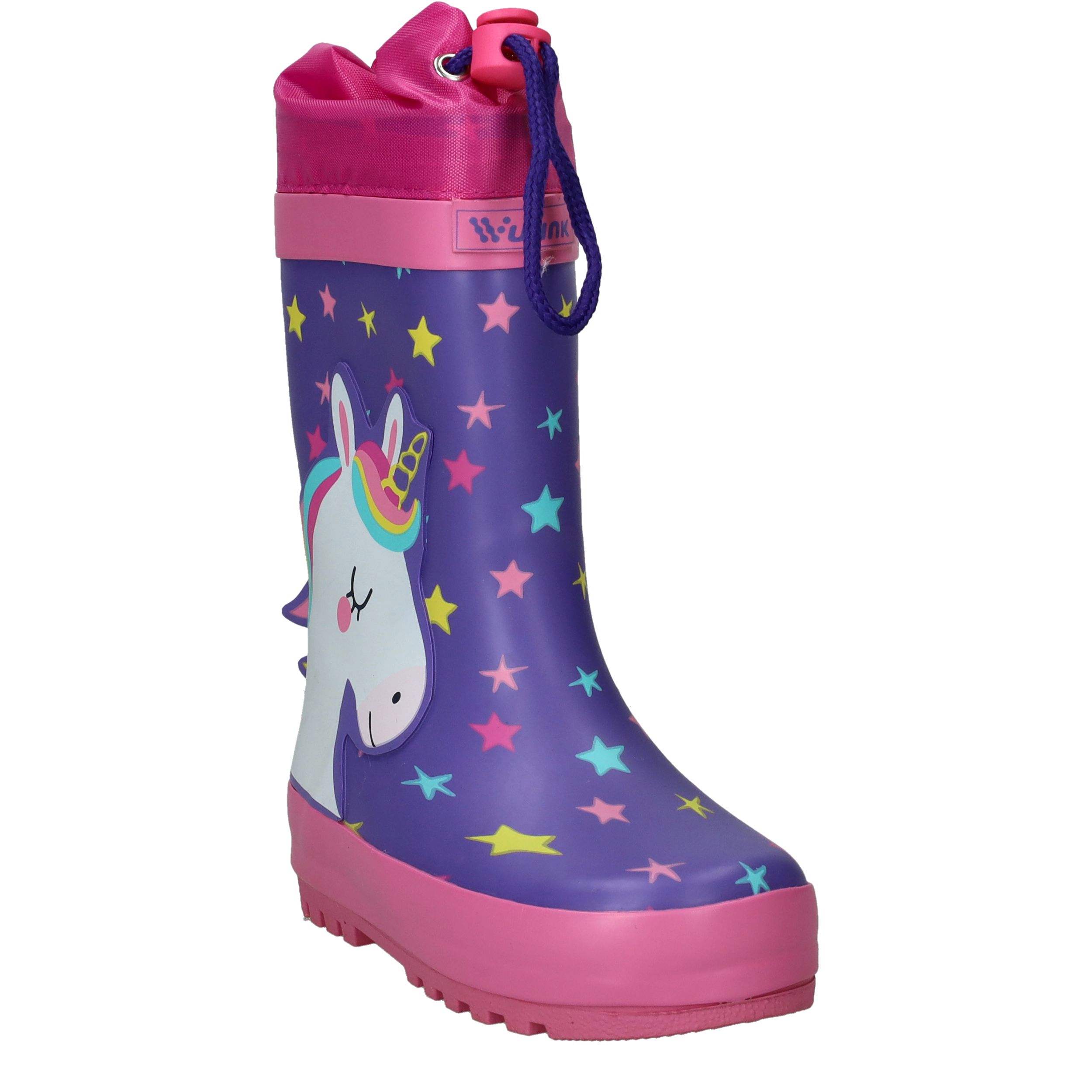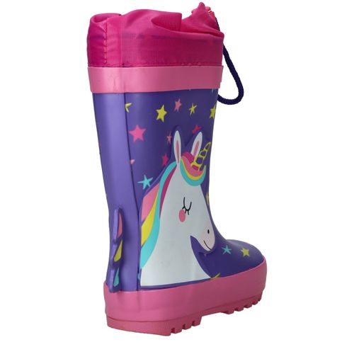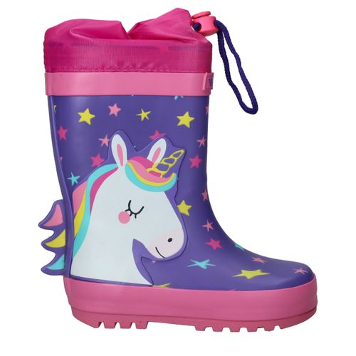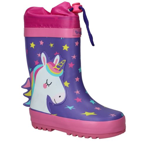 Dit paar paarse WINK regenlaarsjes voor meiden is heerlijk warm gevoerd en voorzien van een schattige unicornprint. Het laarsje heeft een stevige zool en een trekkoord aan de bovenkant zodat er geen regen of kou naar binnen komt.